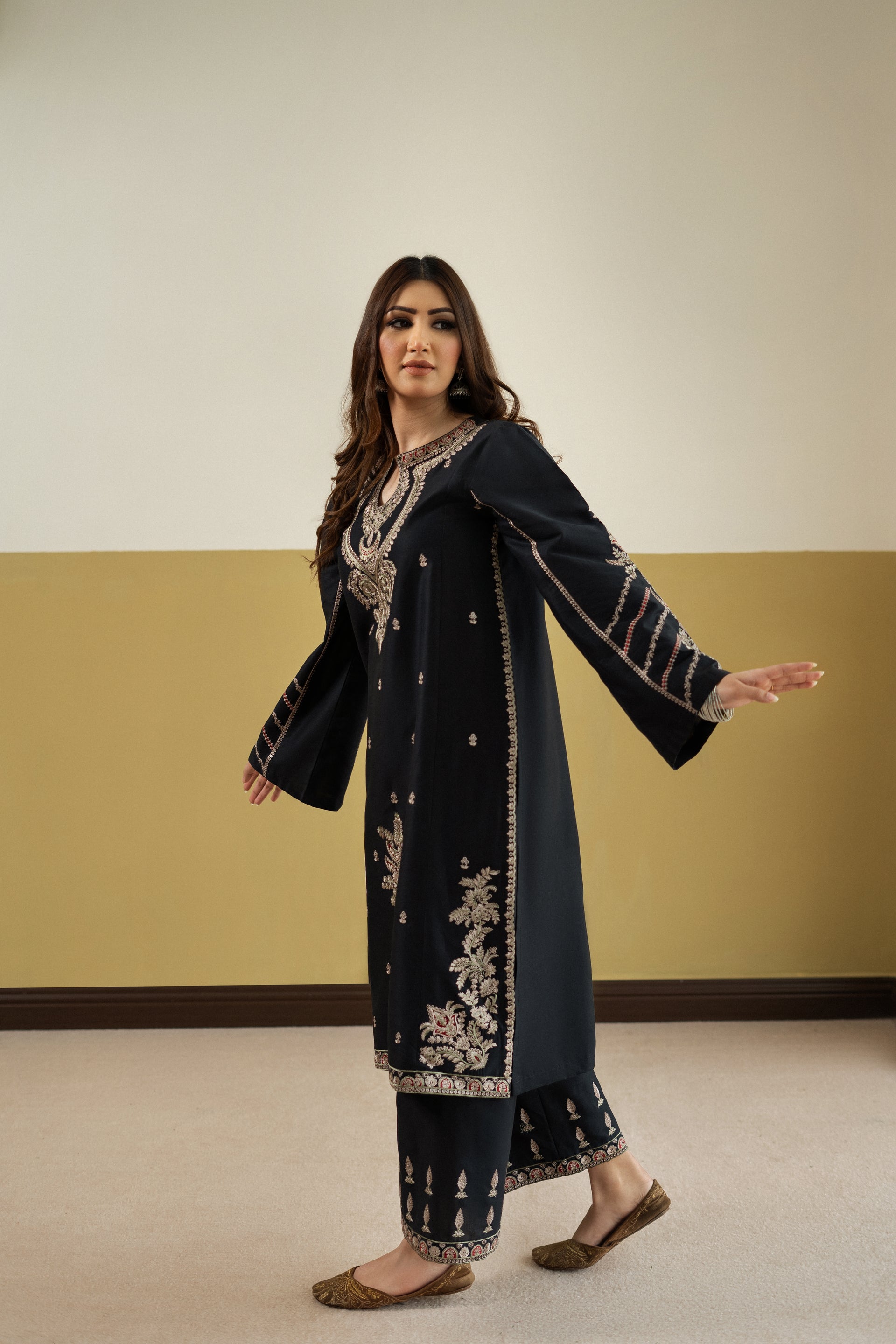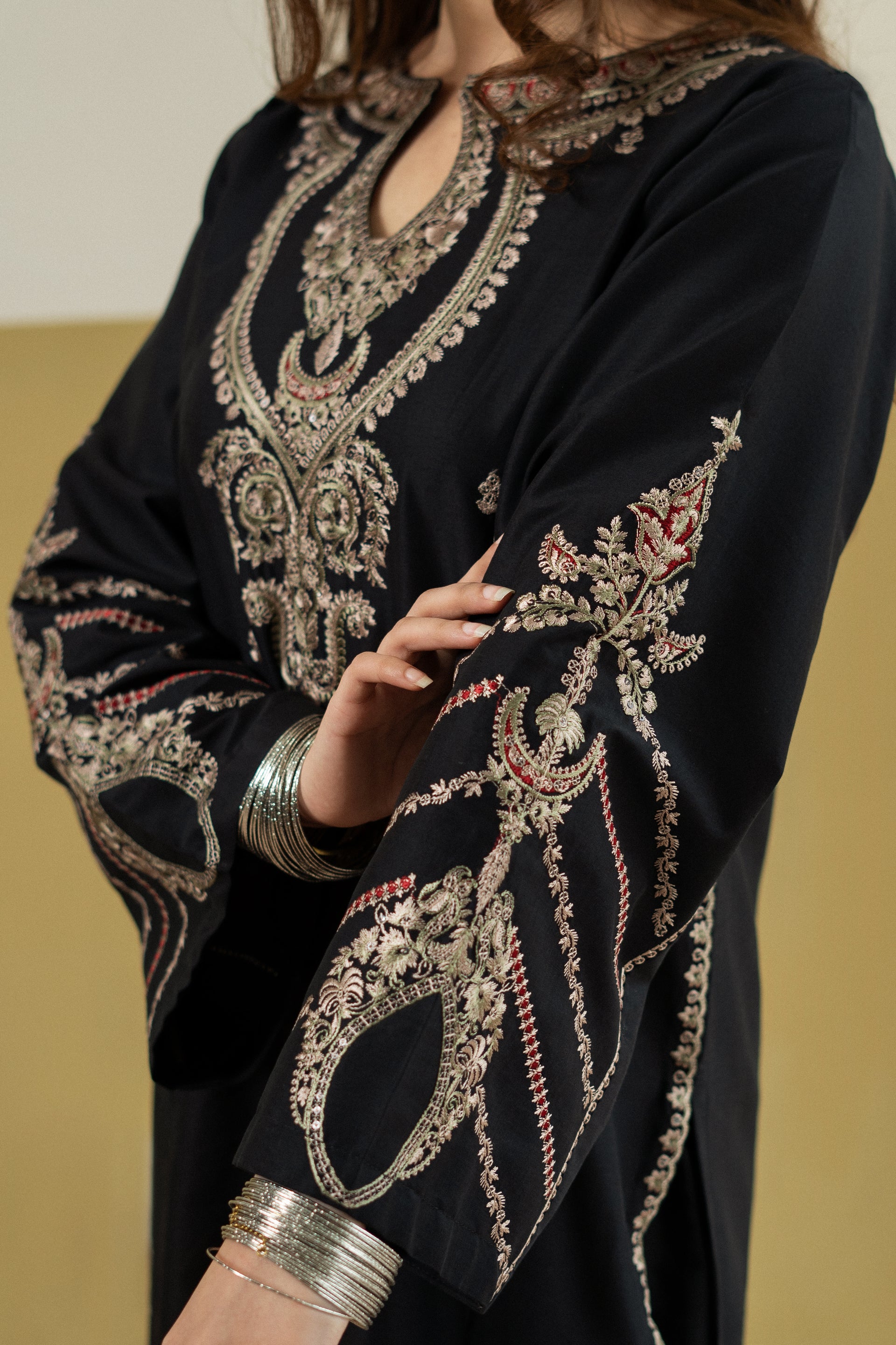 Introducing ASH NOOR, a sophisticated ready-to-wear 2-piece lawn suit designed for effortless elegance. The long shirt features intricate embroidery detailing along the neckline and front, complemented by beautifully embroiderd loose sleeves that add movement and grace. Paired with matching loose embroidered trousers.