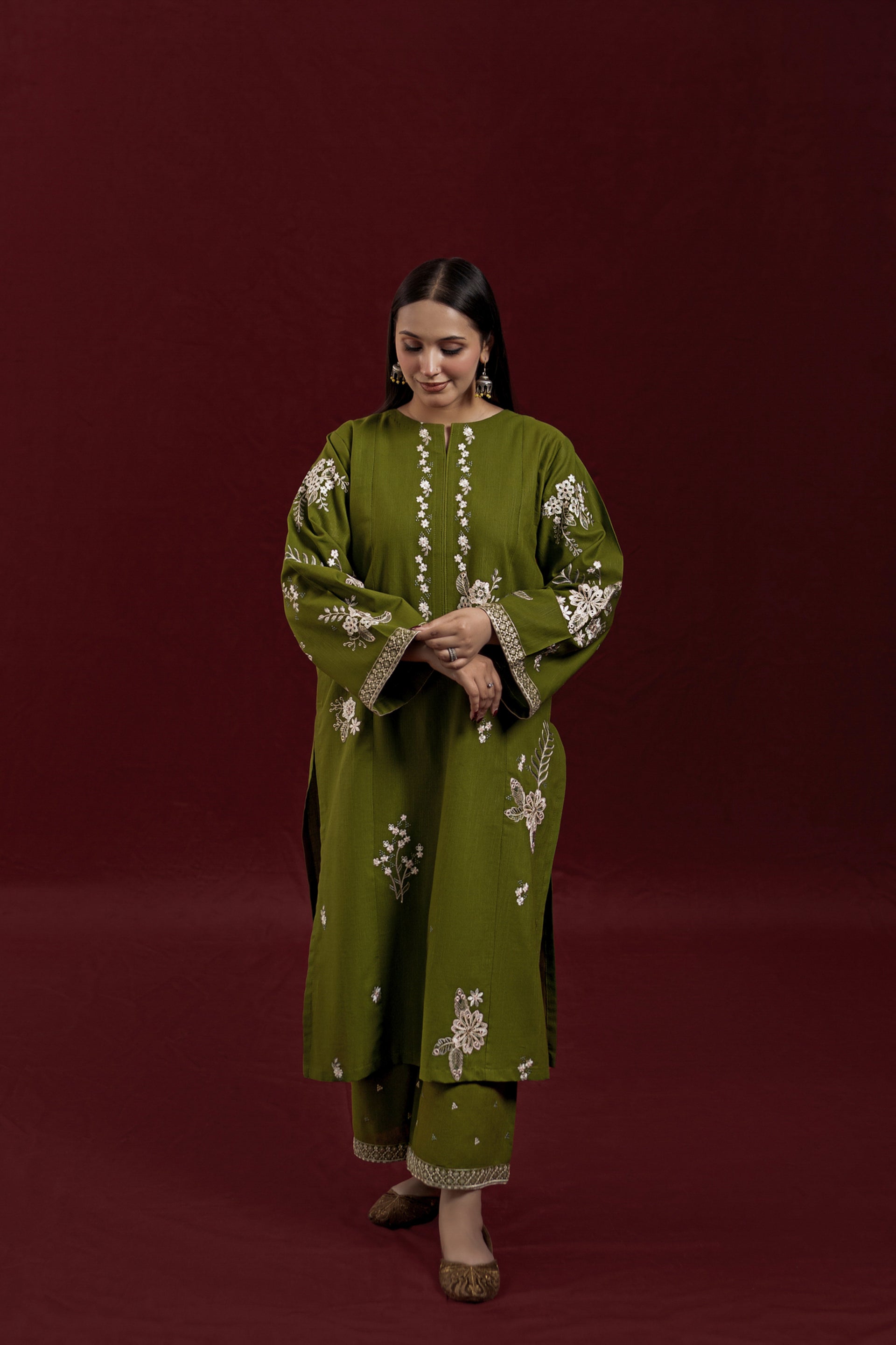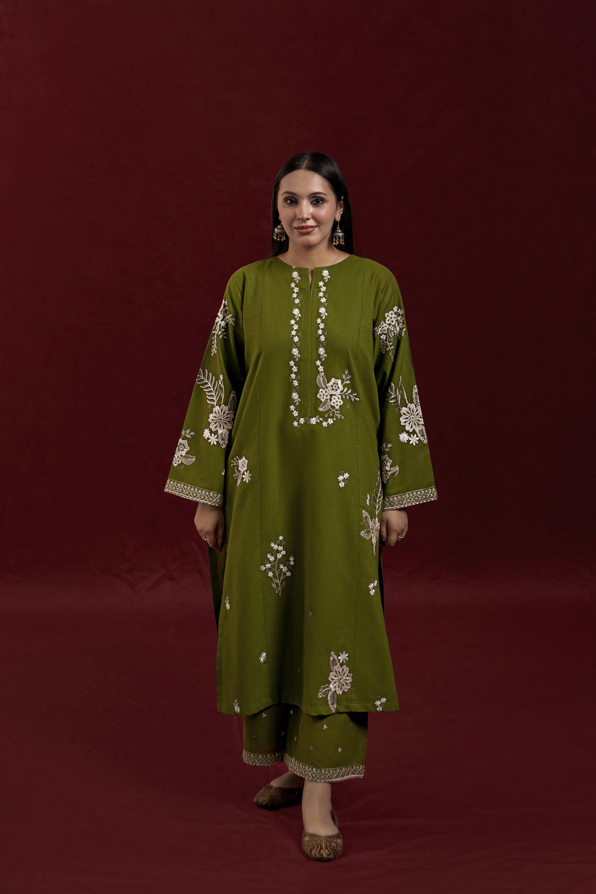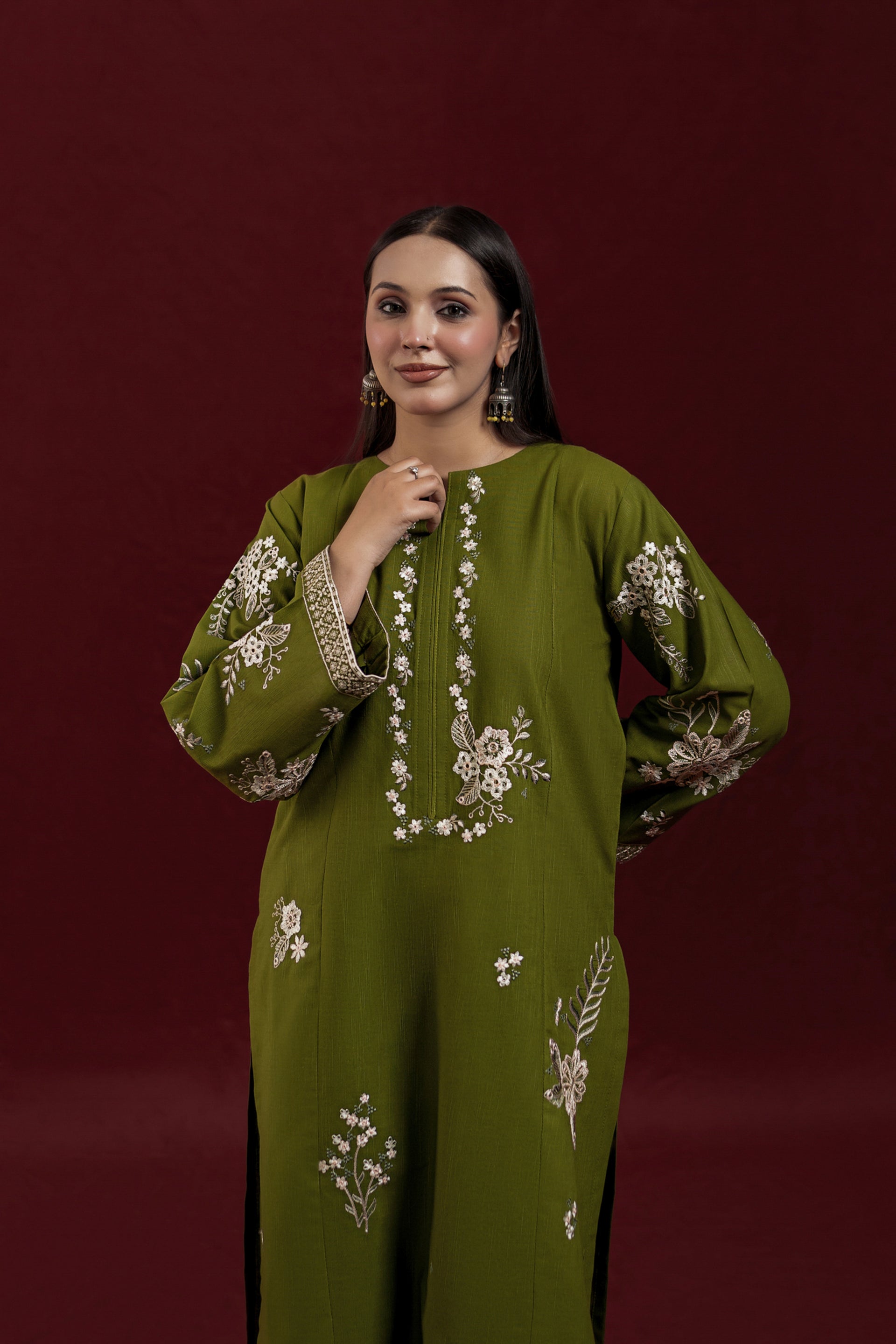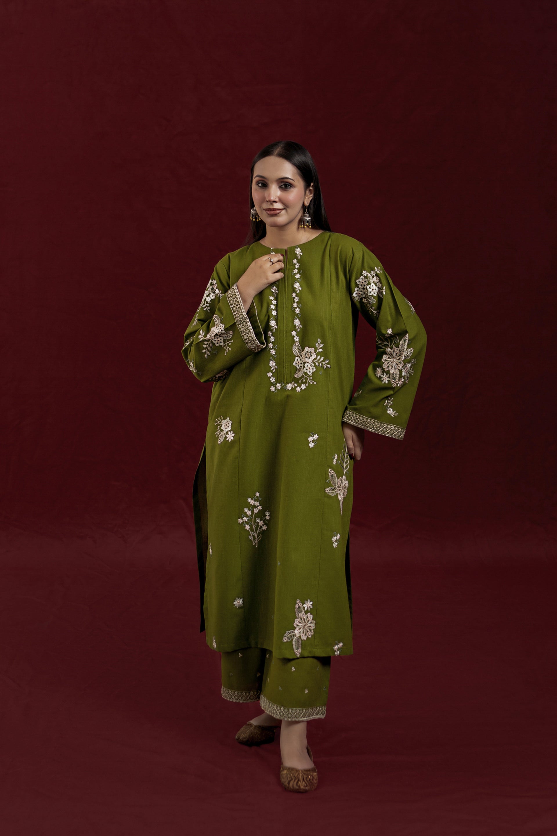 Elevate your wardrobe with AVIRA, a sophisticated 2-piece ready-to-wear khaddar suit designed for effortless elegance. The long shirt features intricate embroidery detailing across the front and sleeves, while the loose-fitting embroidered trousers complete the refined silhouette. Crafted from premium khaddar fabric, this ensemble strikes the perfect balance between traditional craftsmanship and contemporary comfort, ideal for both casual gatherings and special occasions.