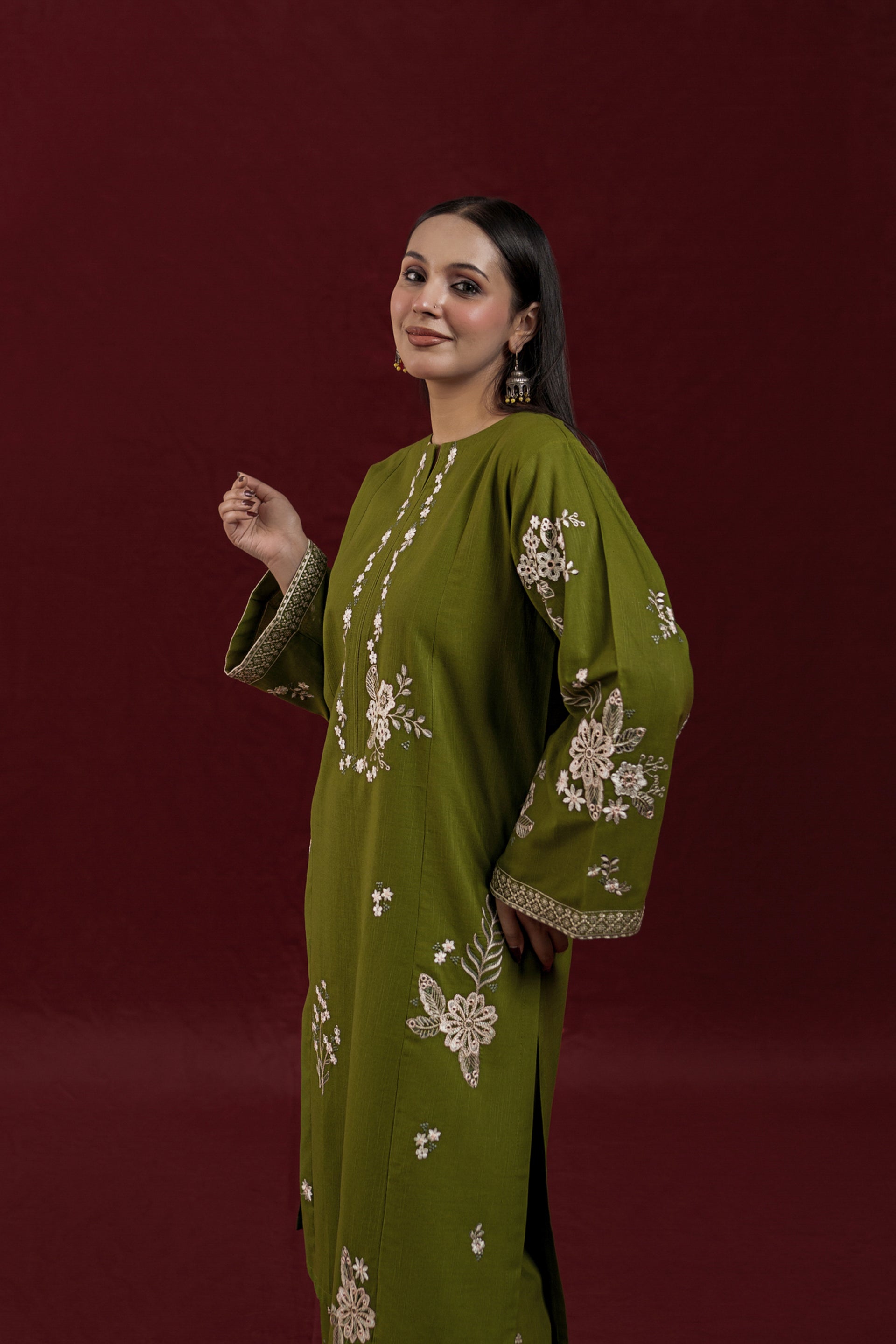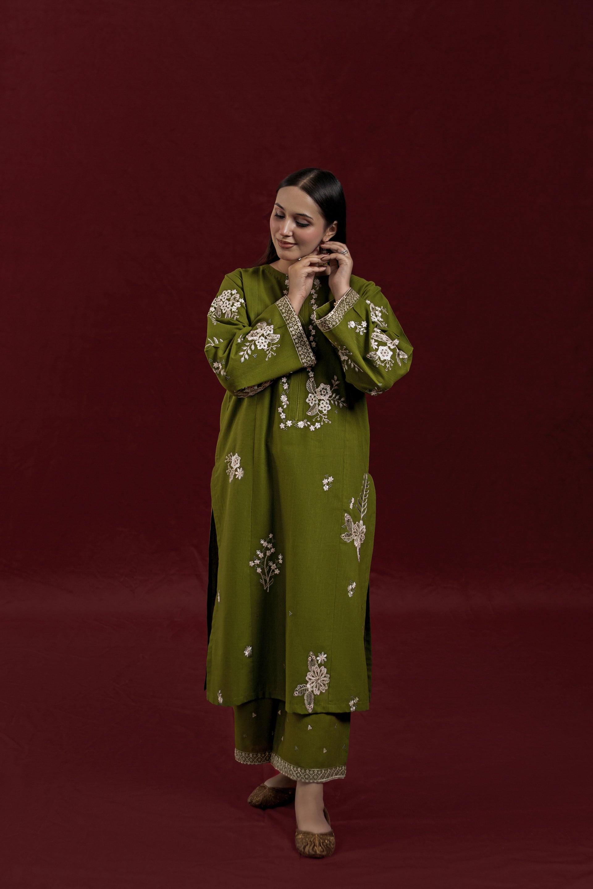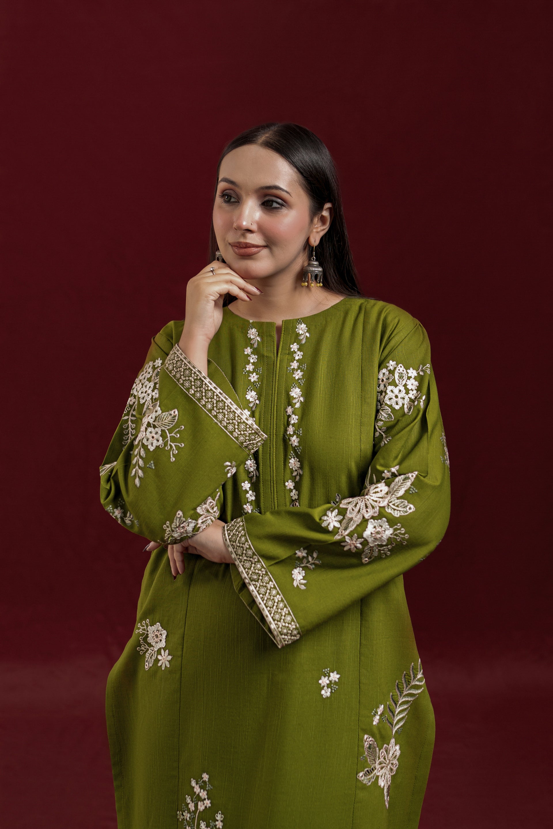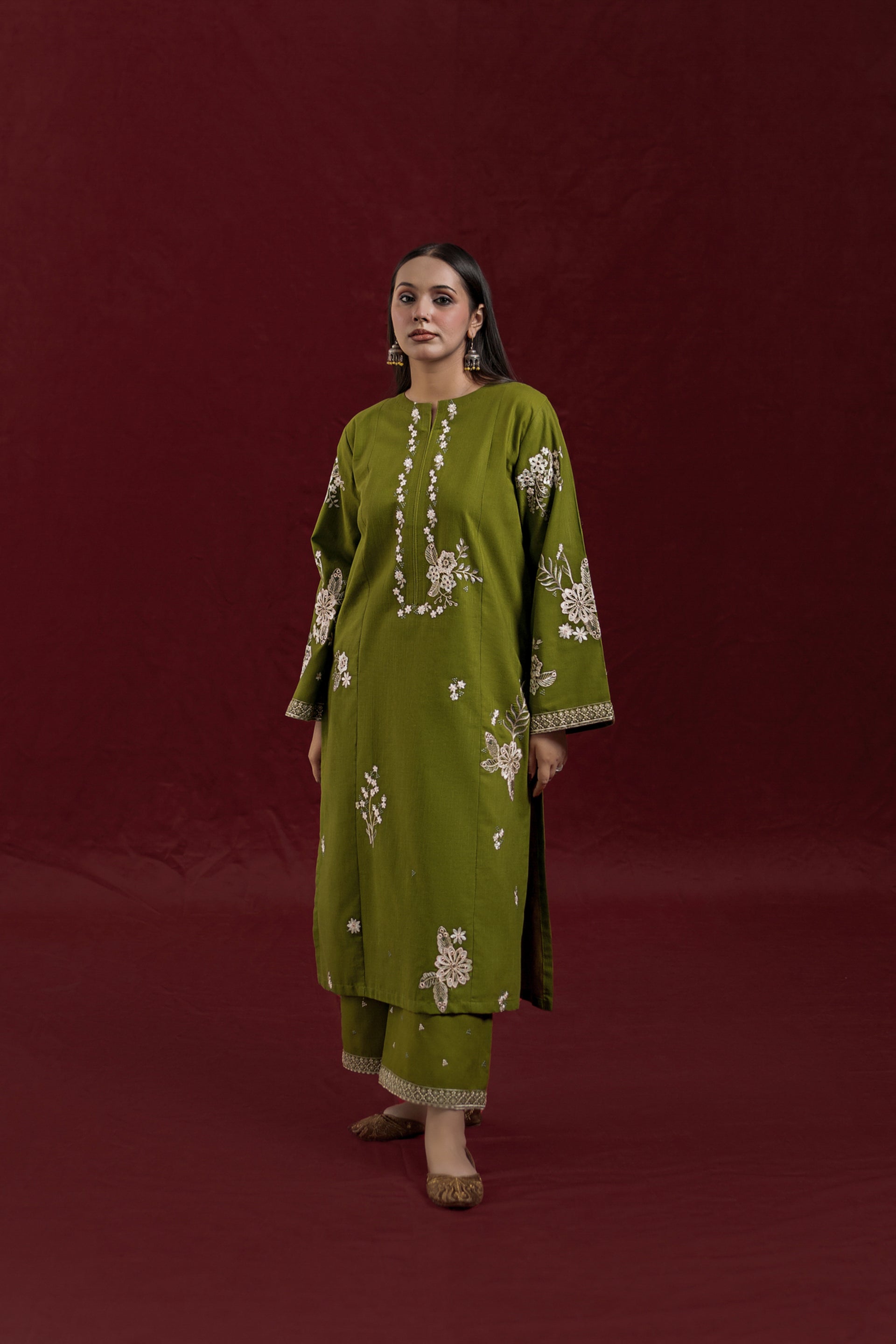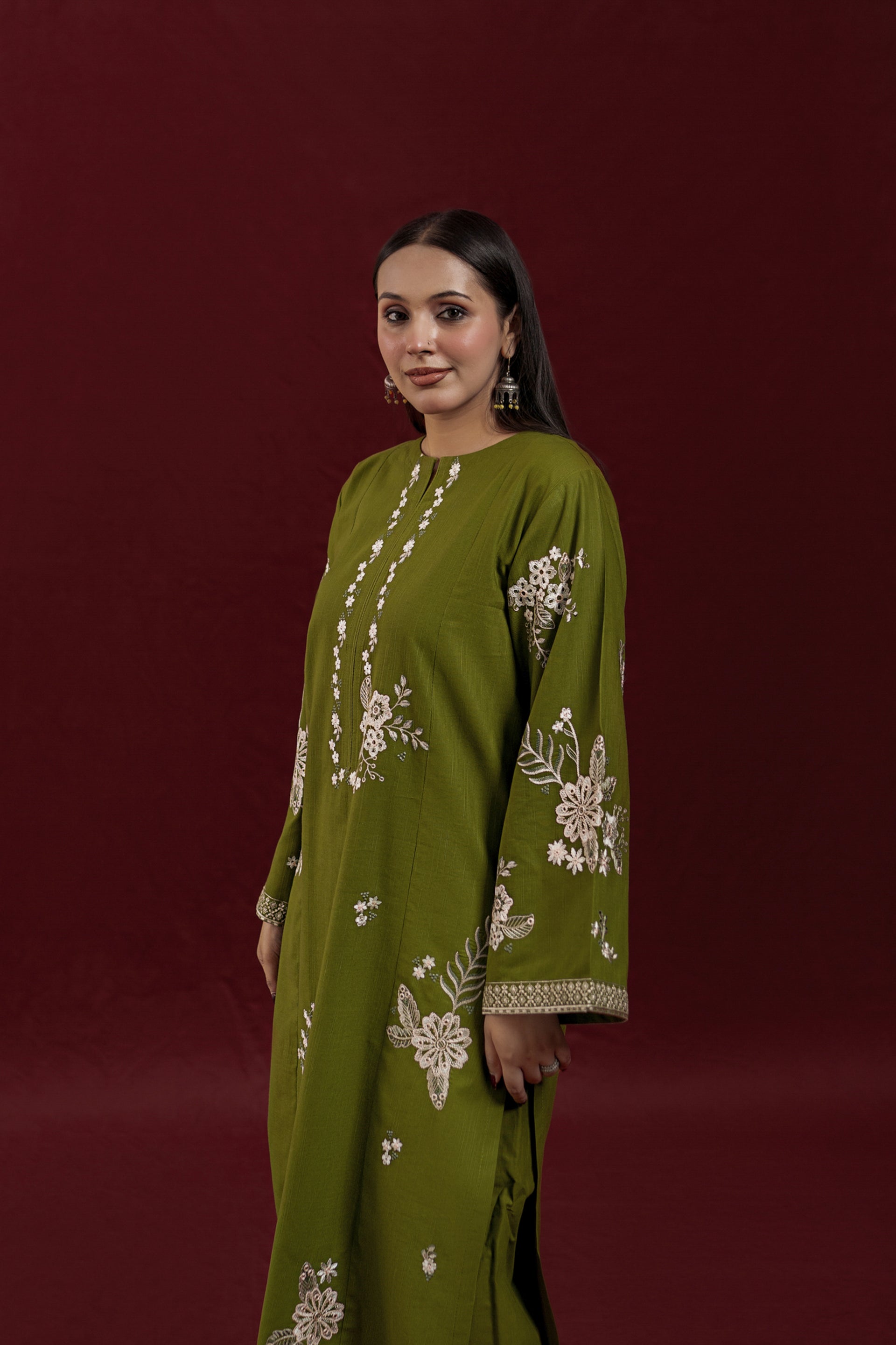 Elevate your wardrobe with AVIRA, a sophisticated 2-piece ready-to-wear khaddar suit designed for effortless elegance. The long shirt features intricate embroidery detailing across the front and sleeves, while the loose-fitting embroidered trousers complete the refined silhouette. Crafted from premium khaddar fabric, this ensemble strikes the perfect balance between traditional craftsmanship and contemporary comfort, ideal for both casual gatherings and special occasions.