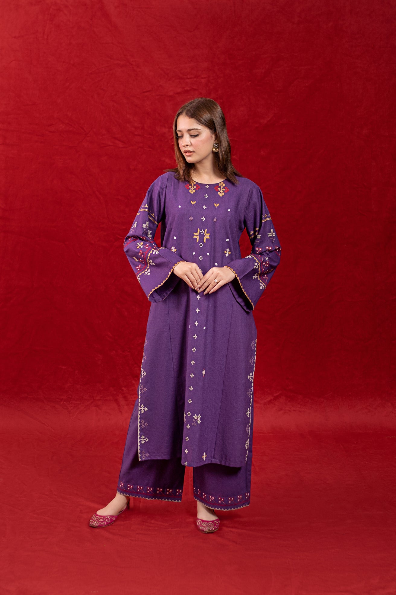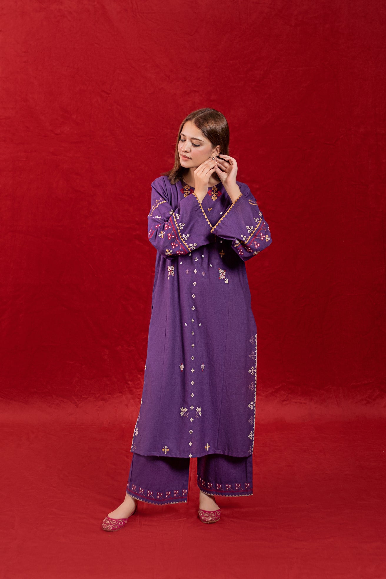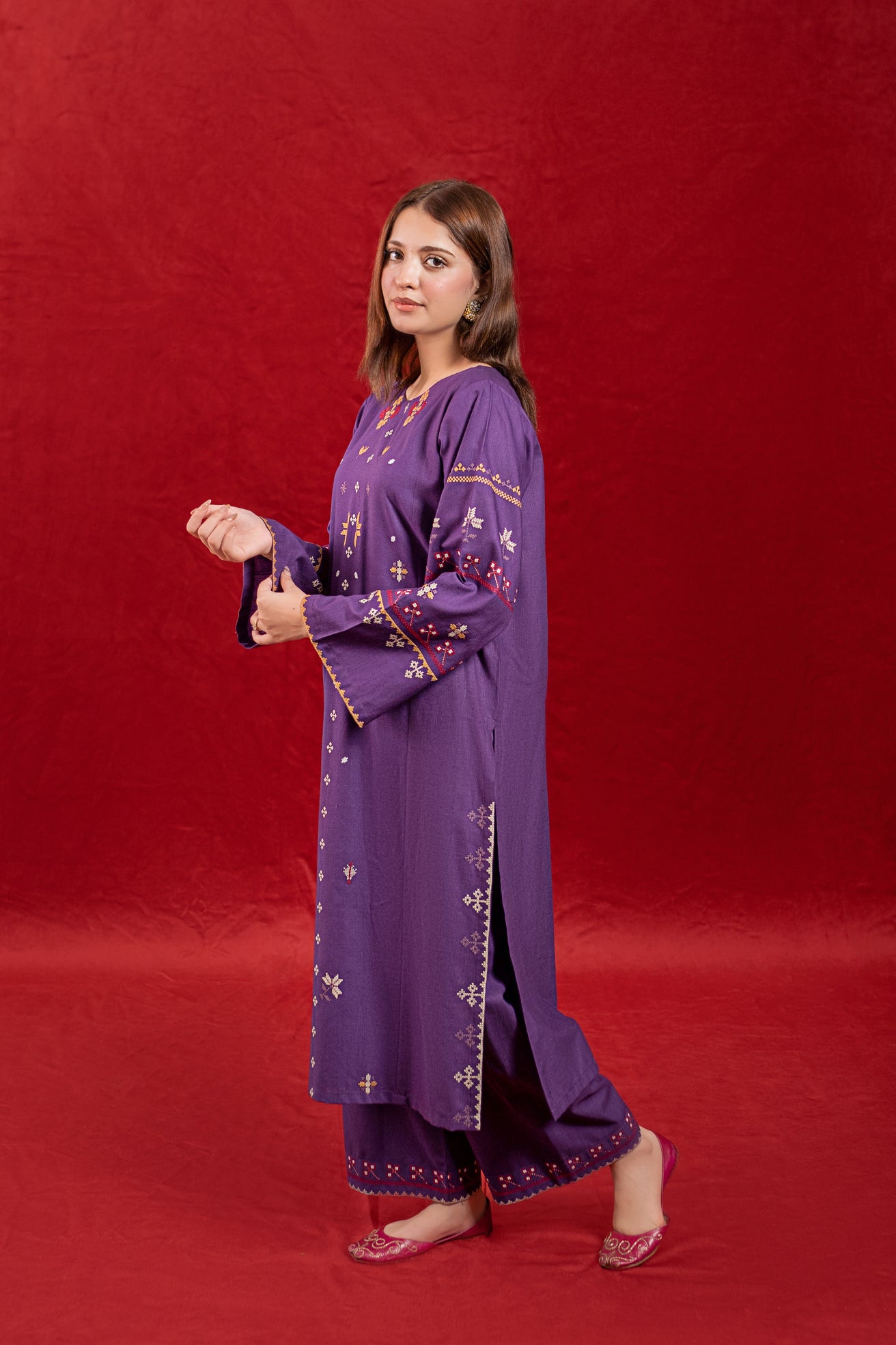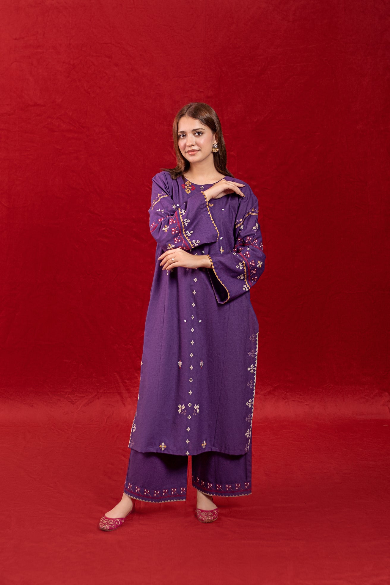 This ready-to-wear 2-piece Khaddar suit features a long shirt adorned with intricate embroidery motifs on the front and sleeves, showcasing skilled craftsmanship. The ensemble is completed with loose embroidered trousers, providing both comfort and elegance. Crafted from warm Khaddar fabric, it is ideal for cooler seasons while reflecting traditional design with a contemporary touch.