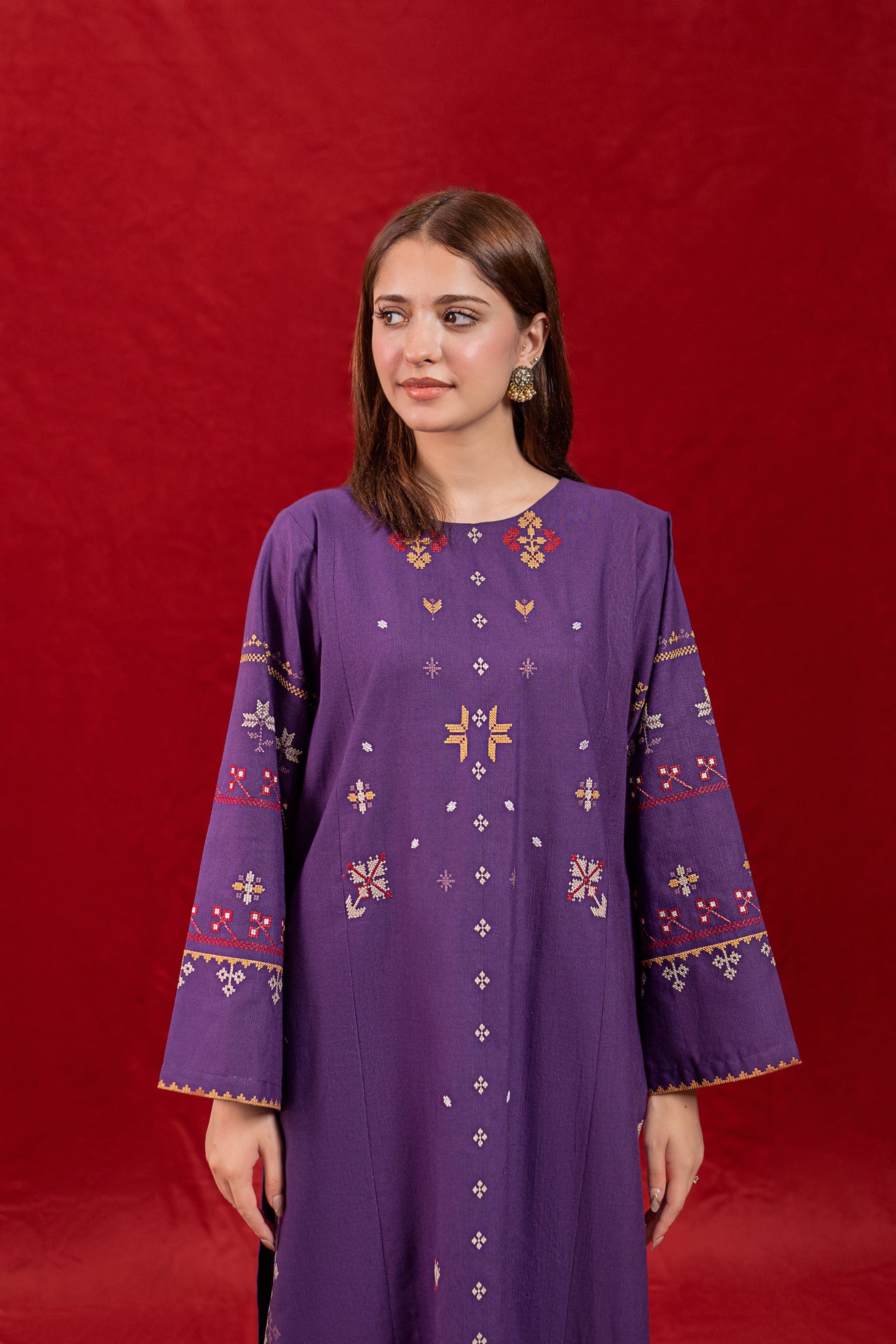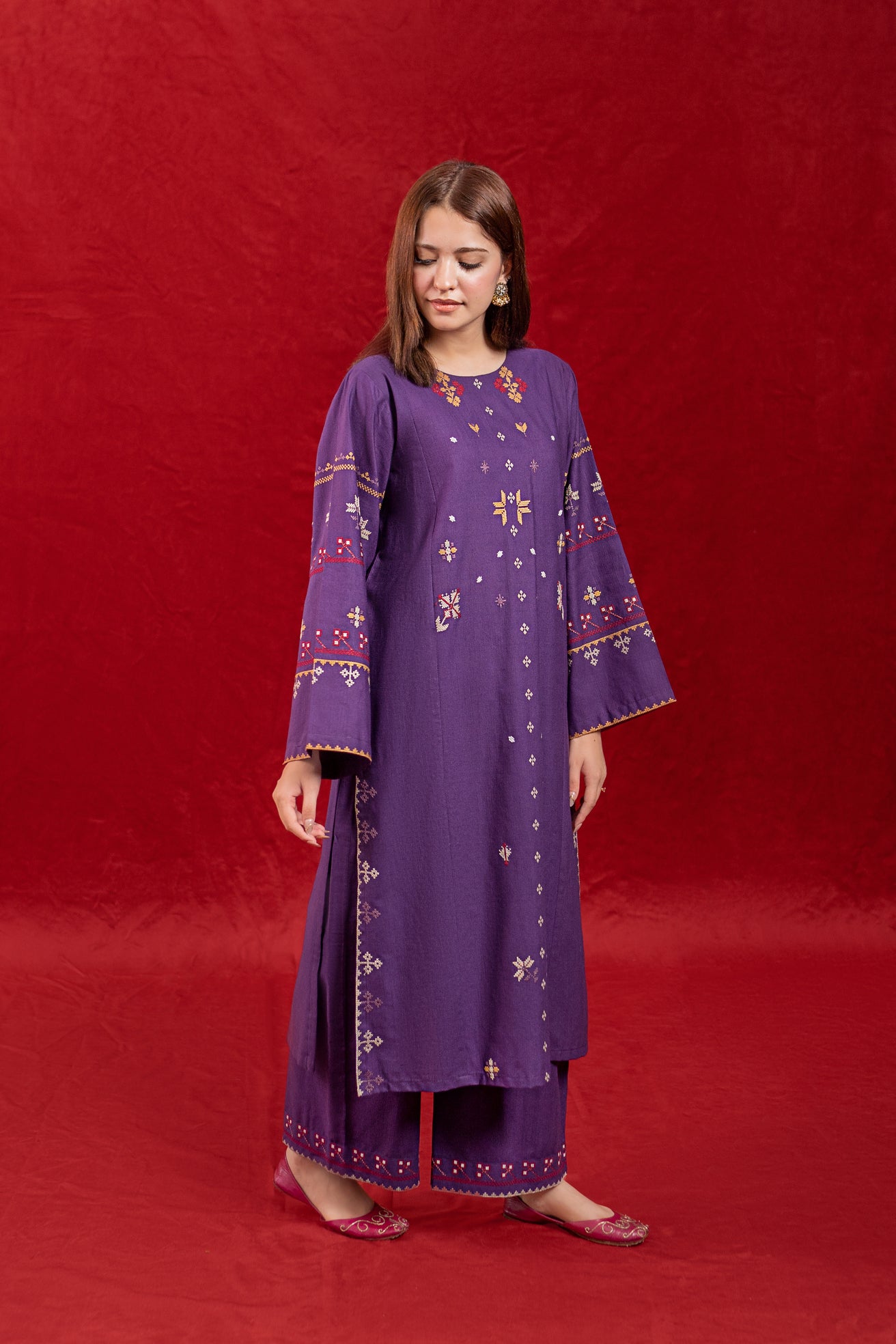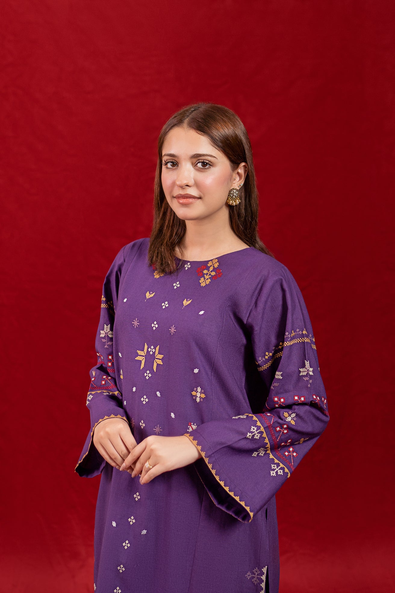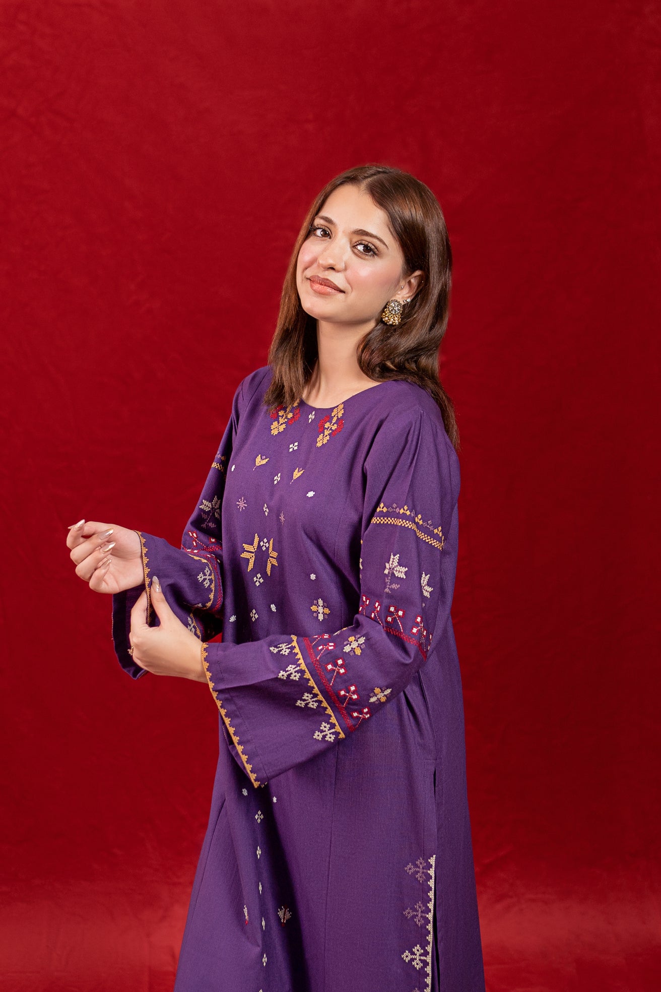 This ready-to-wear 2-piece Khaddar suit features a long shirt adorned with intricate embroidery motifs on the front and sleeves, showcasing skilled craftsmanship. The ensemble is completed with loose embroidered trousers, providing both comfort and elegance. Crafted from warm Khaddar fabric, it is ideal for cooler seasons while reflecting traditional design with a contemporary touch.