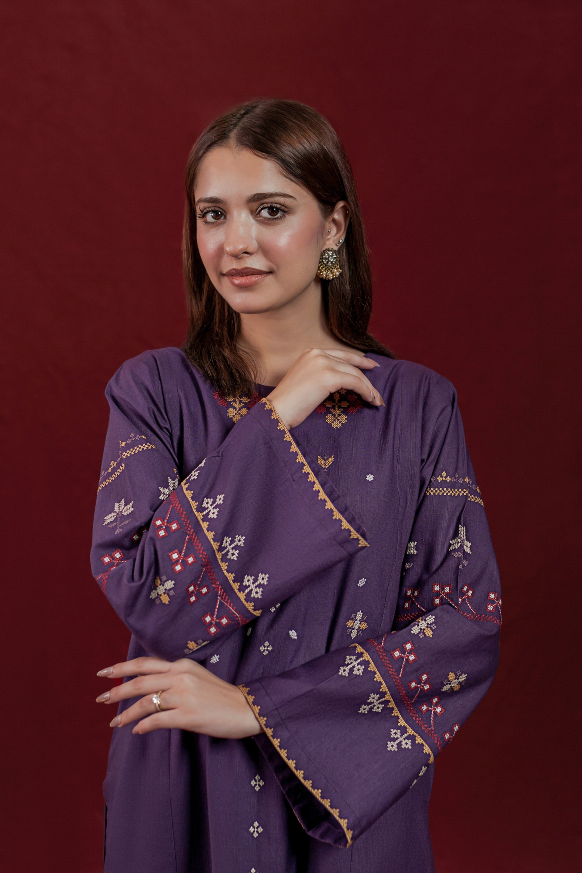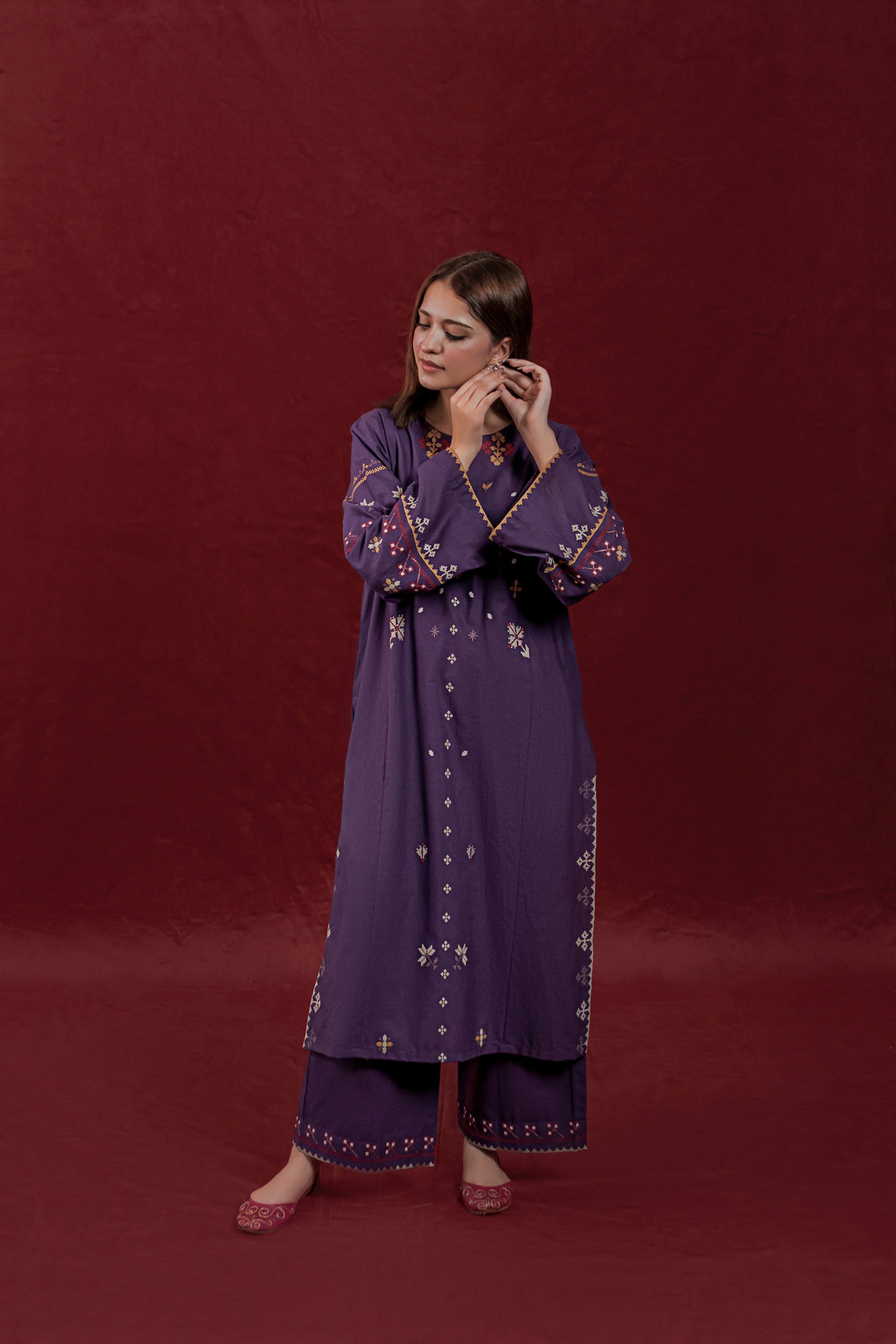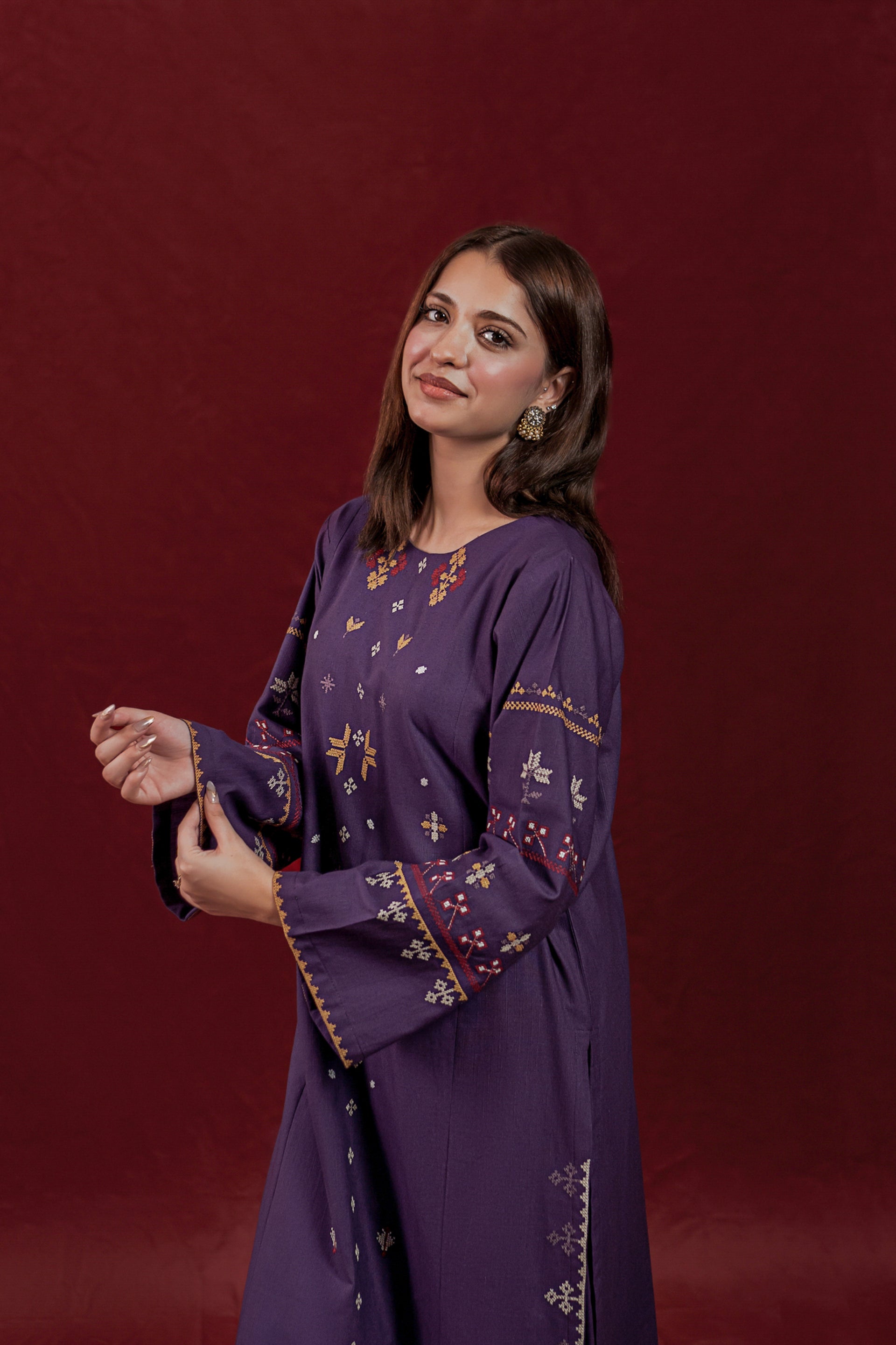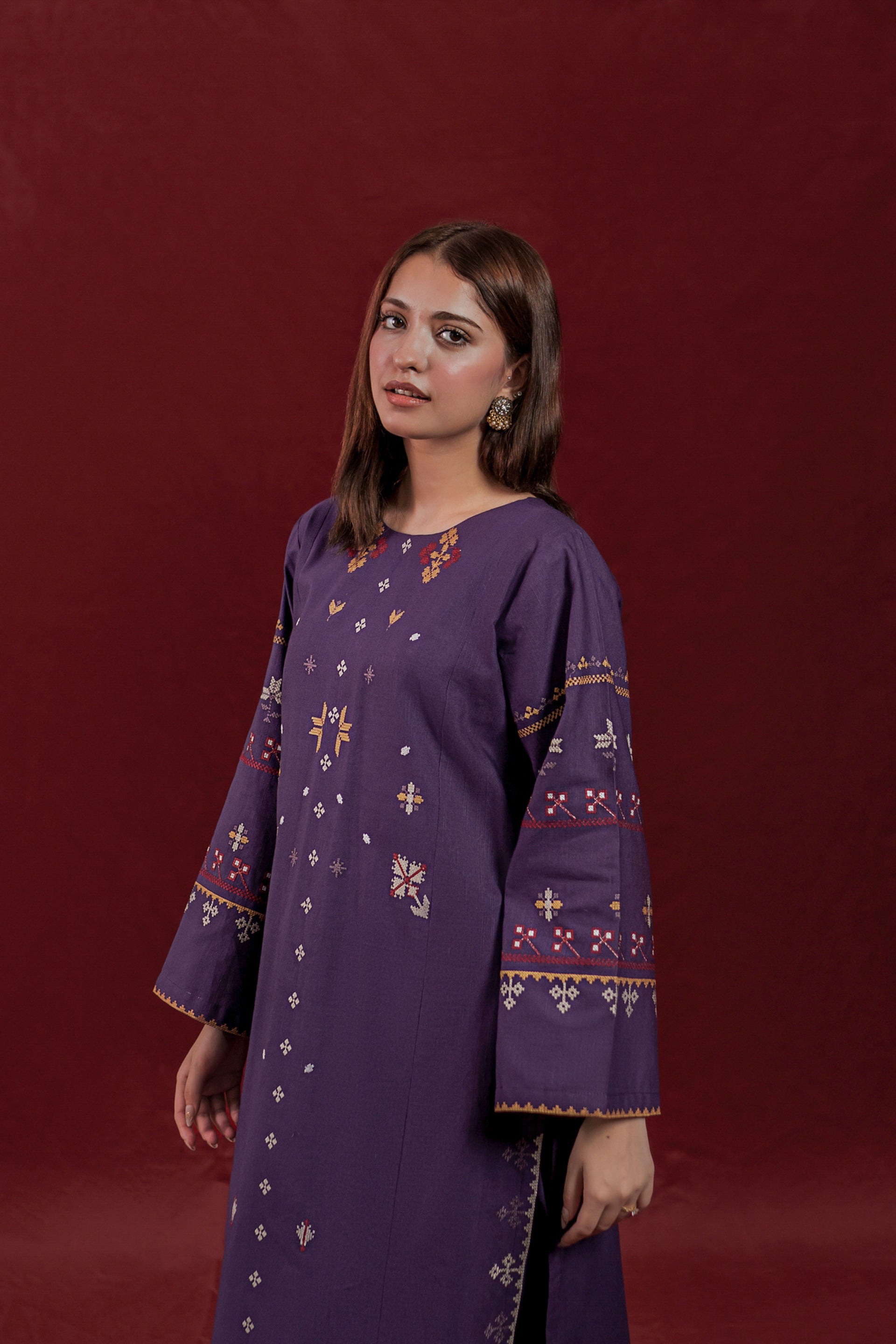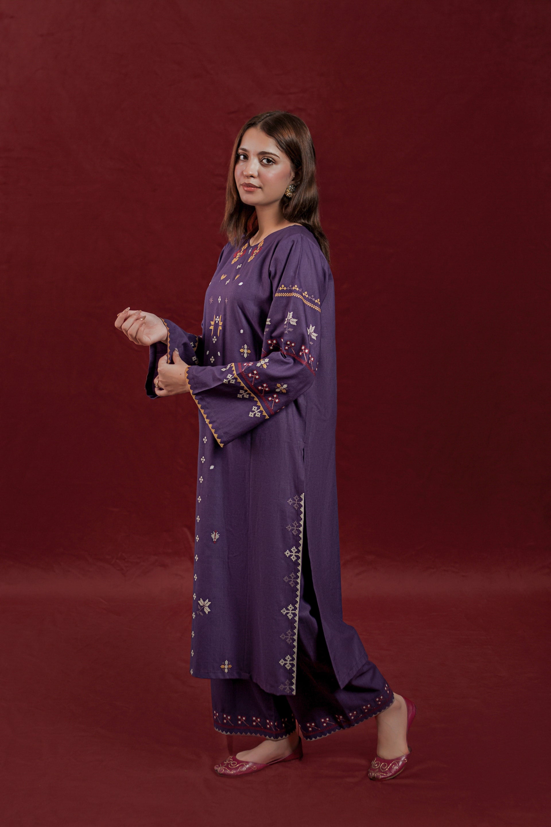 This ready-to-wear 2-piece Khaddar suit features a long shirt adorned with intricate embroidery motifs on the front and sleeves, showcasing skilled craftsmanship. The ensemble is completed with loose embroidered trousers, providing both comfort and elegance. Crafted from warm Khaddar fabric, it is ideal for cooler seasons while reflecting traditional design with a contemporary touch.