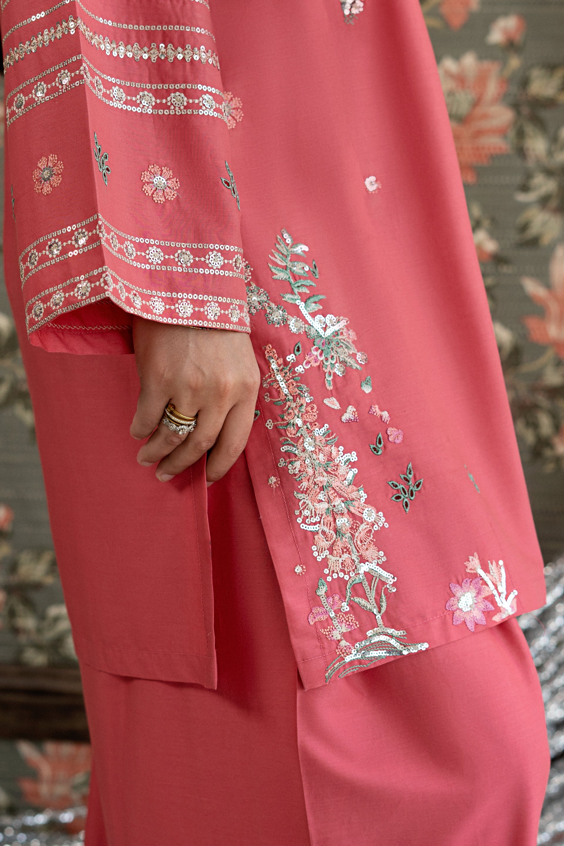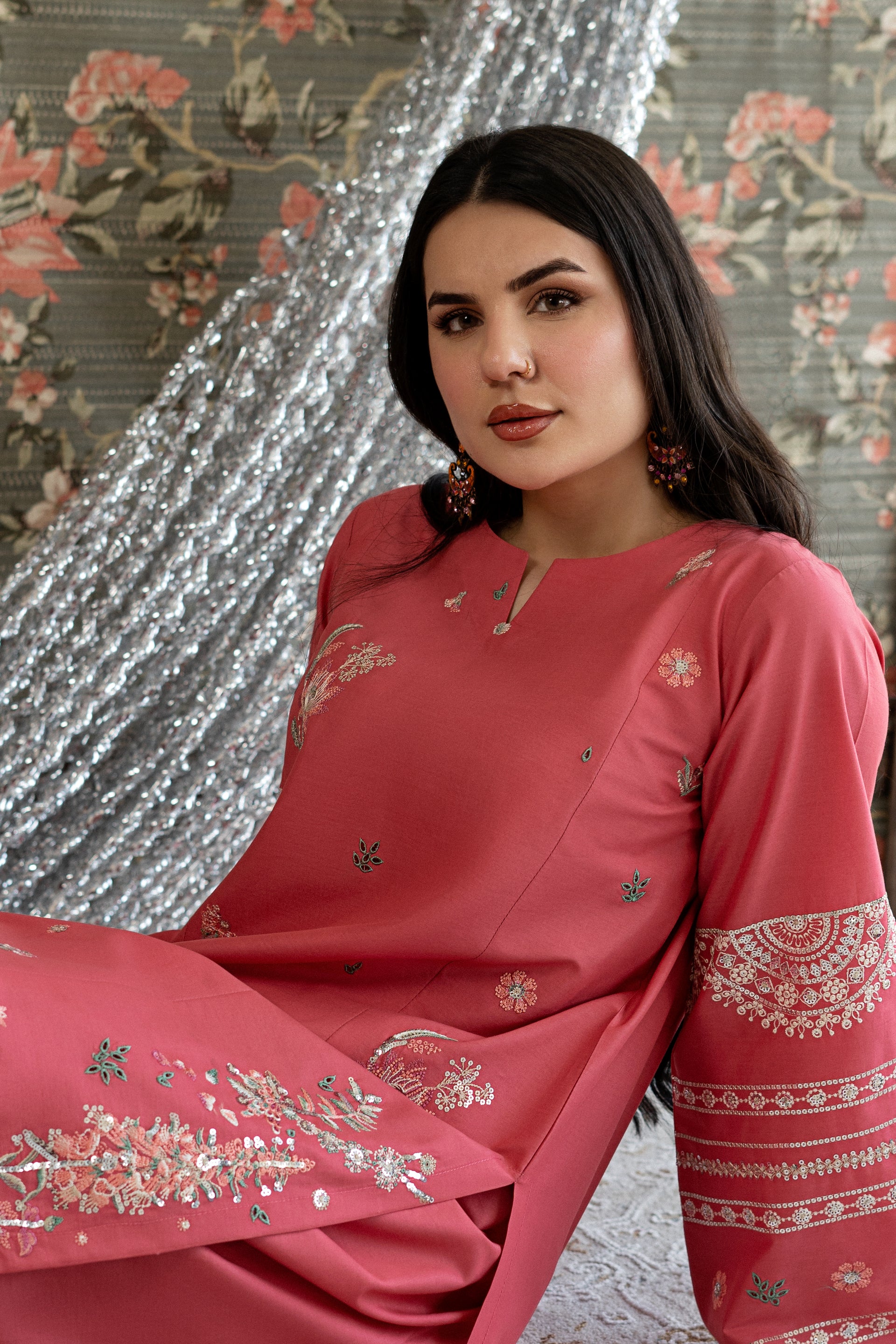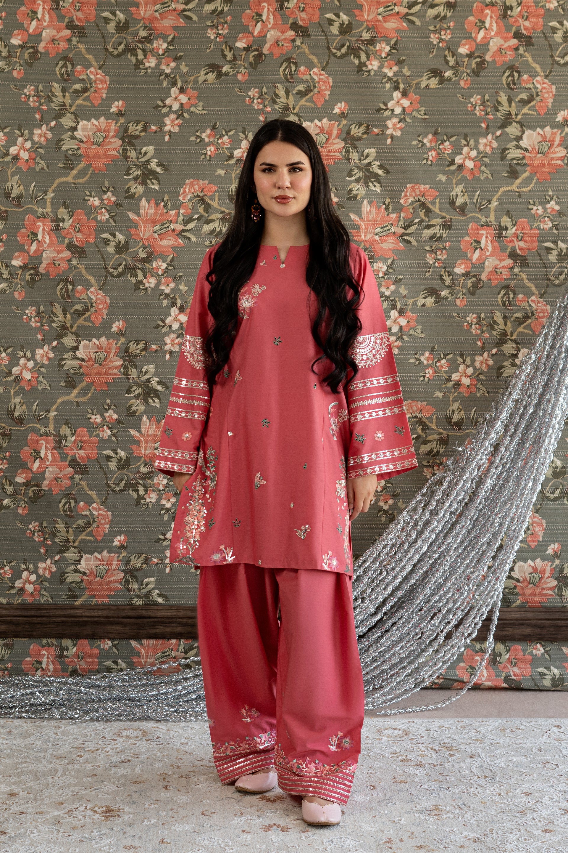 Elevate your event look with this stunning ready-to-wear 2-piece embroidered lawn suit. The short shirt features intricate embroidery work adorning the side panels and sleeves, complemented by delicate thread and subtle sequin detailing. The centerpiece showcases exquisite chikankari craftsmanship that adds timeless elegance. Paired with a loose, embroidered farshi shalwar finished with sequin work on the paincha, this ensemble delivers sophisticated style for any special occasion.
