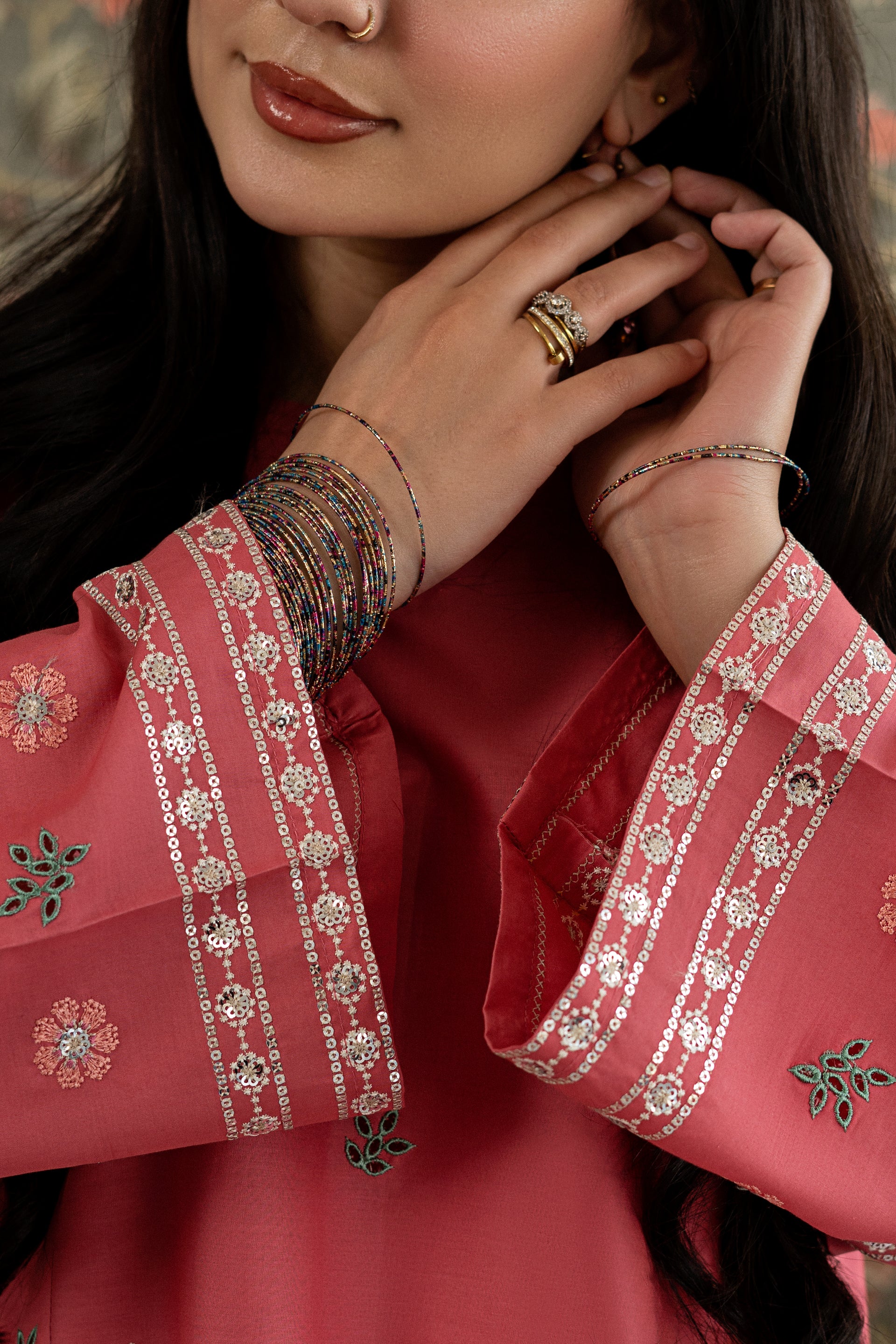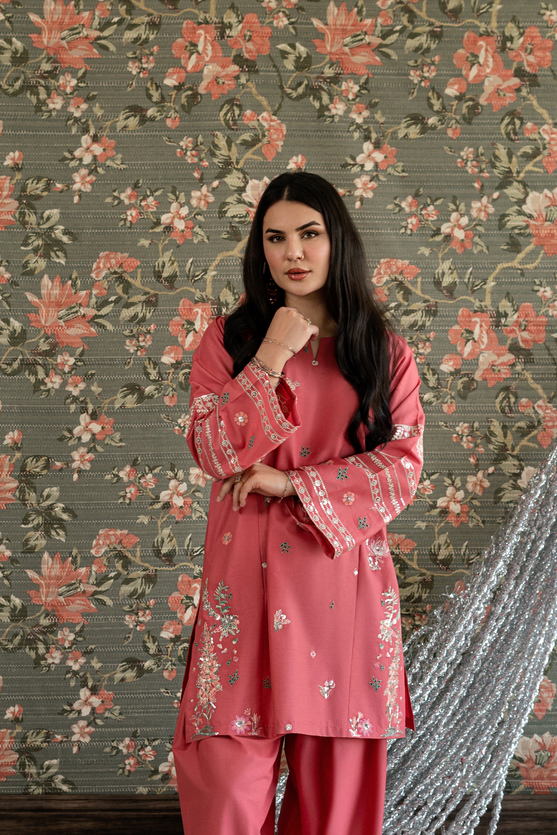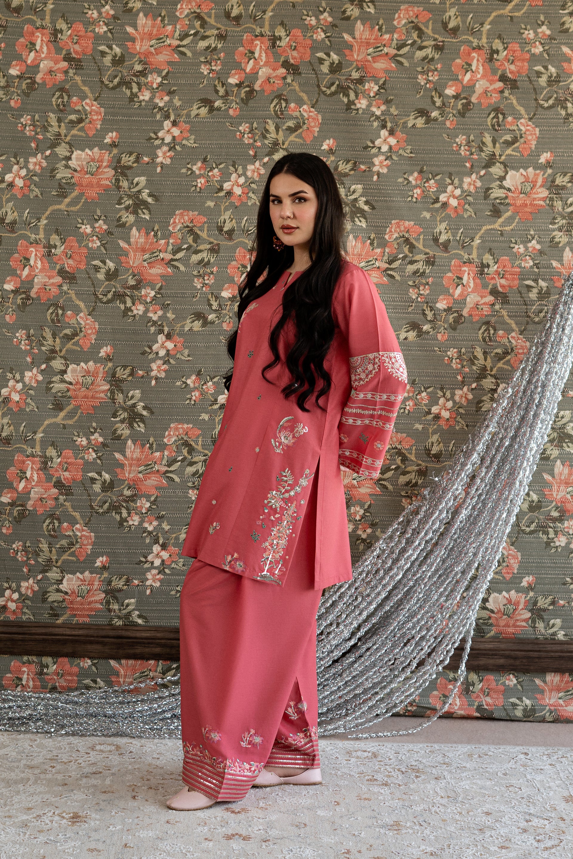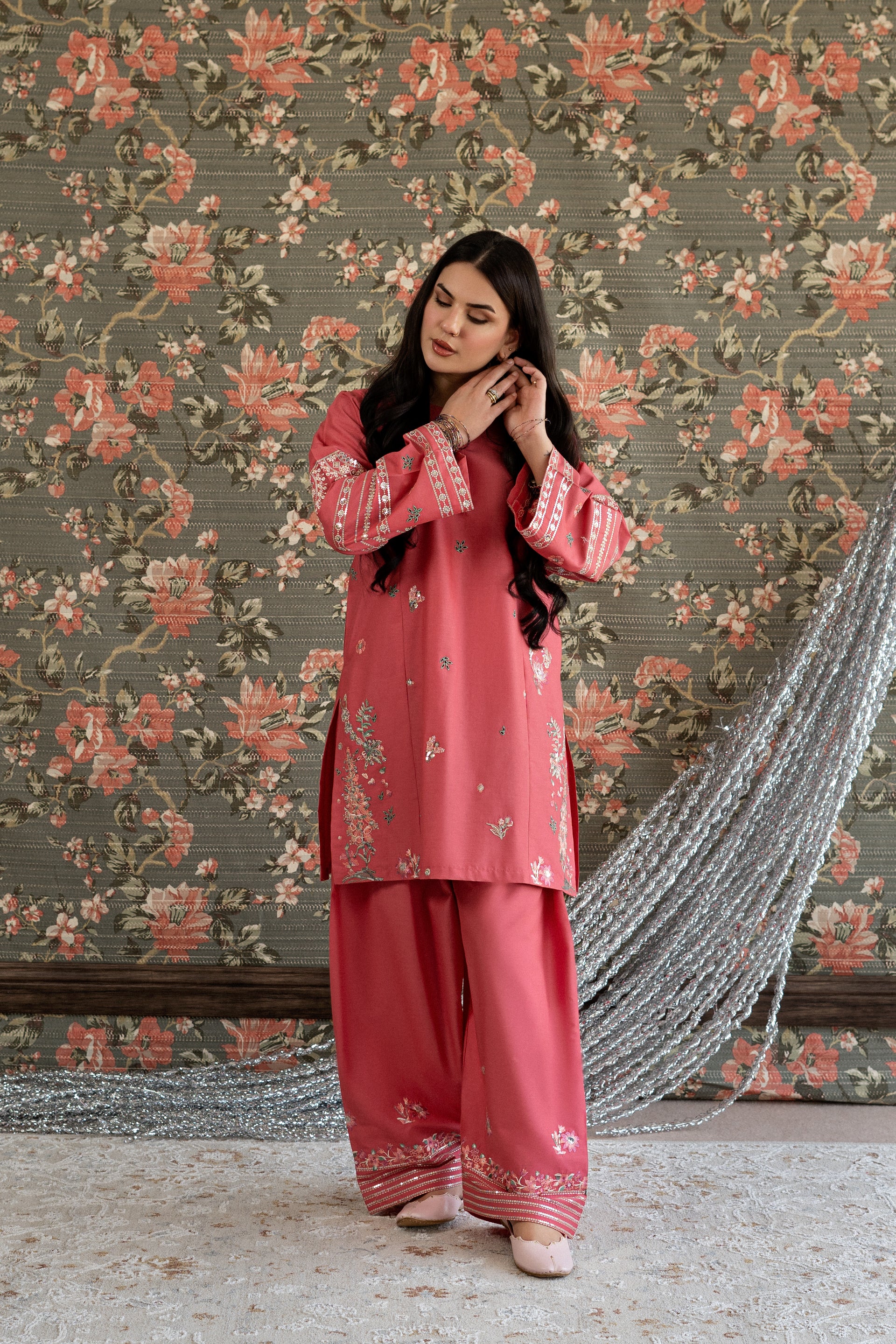 Elevate your event look with this stunning ready-to-wear 2-piece embroidered lawn suit. The short shirt features intricate embroidery work adorning the side panels and sleeves, complemented by delicate thread and subtle sequin detailing. The centerpiece showcases exquisite chikankari craftsmanship that adds timeless elegance. Paired with a loose, embroidered farshi shalwar finished with sequin work on the paincha, this ensemble delivers sophisticated style for any special occasion.