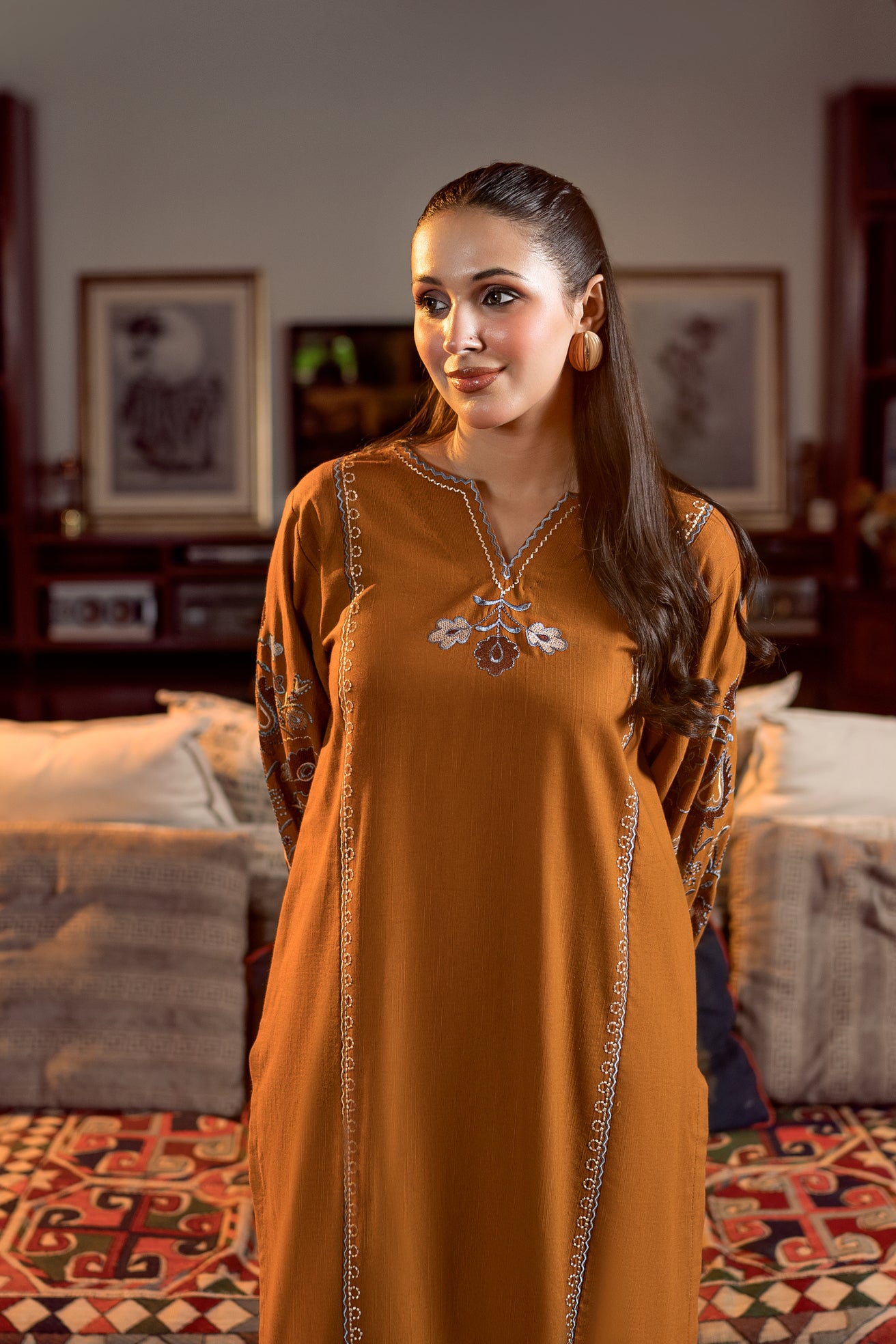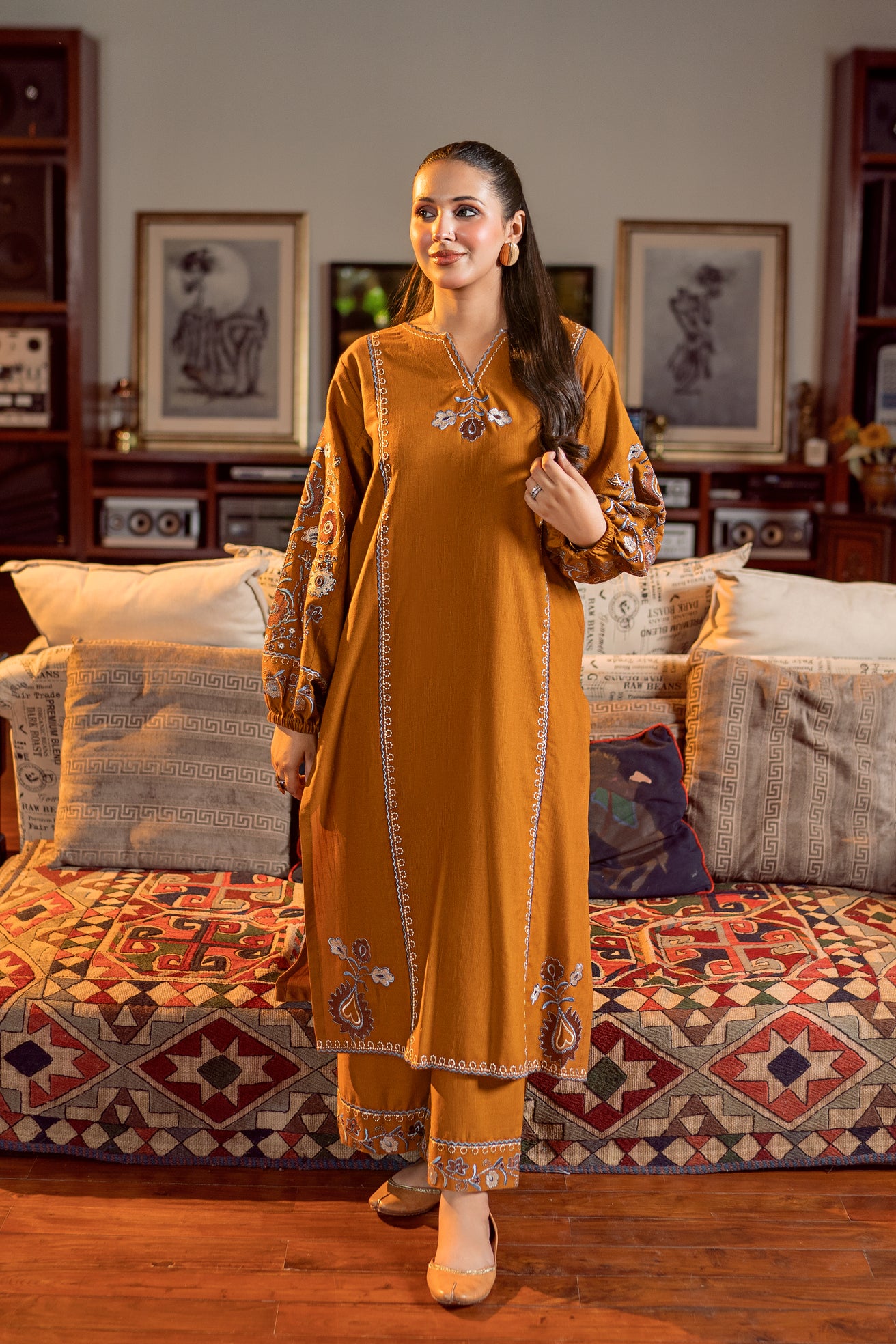 This ready-to-wear 2-piece khaddar suit, titled COCOON, features intricate embroidery along the shirt neckline and hemline, enhancing its refined aesthetic. The design includes loose, puffy sleeves with detailed embroidery, paired seamlessly with loose embroidered trousers. Crafted for both comfort and elegance, this ensemble balances traditional craftsmanship with a contemporary silhouette.