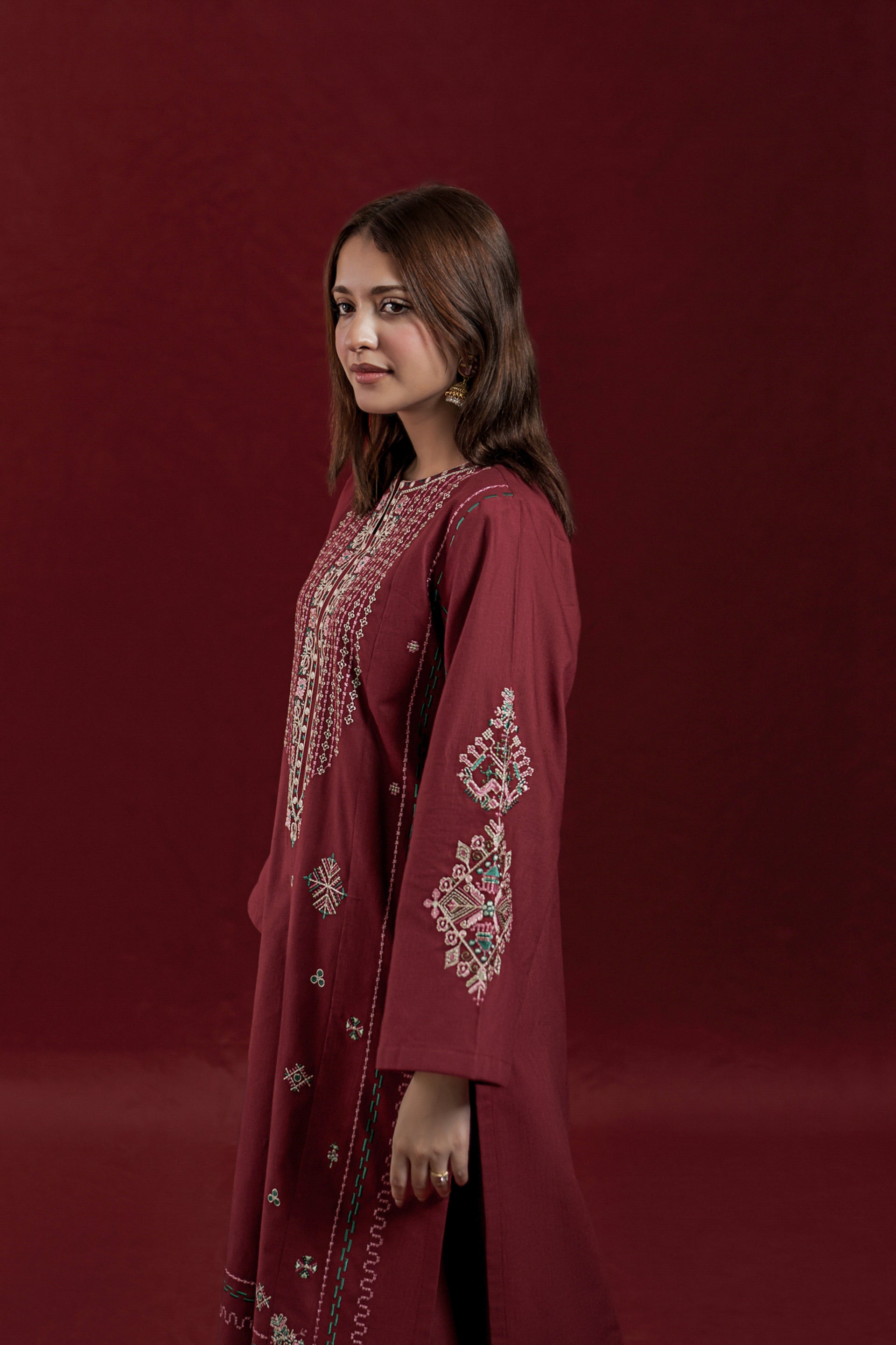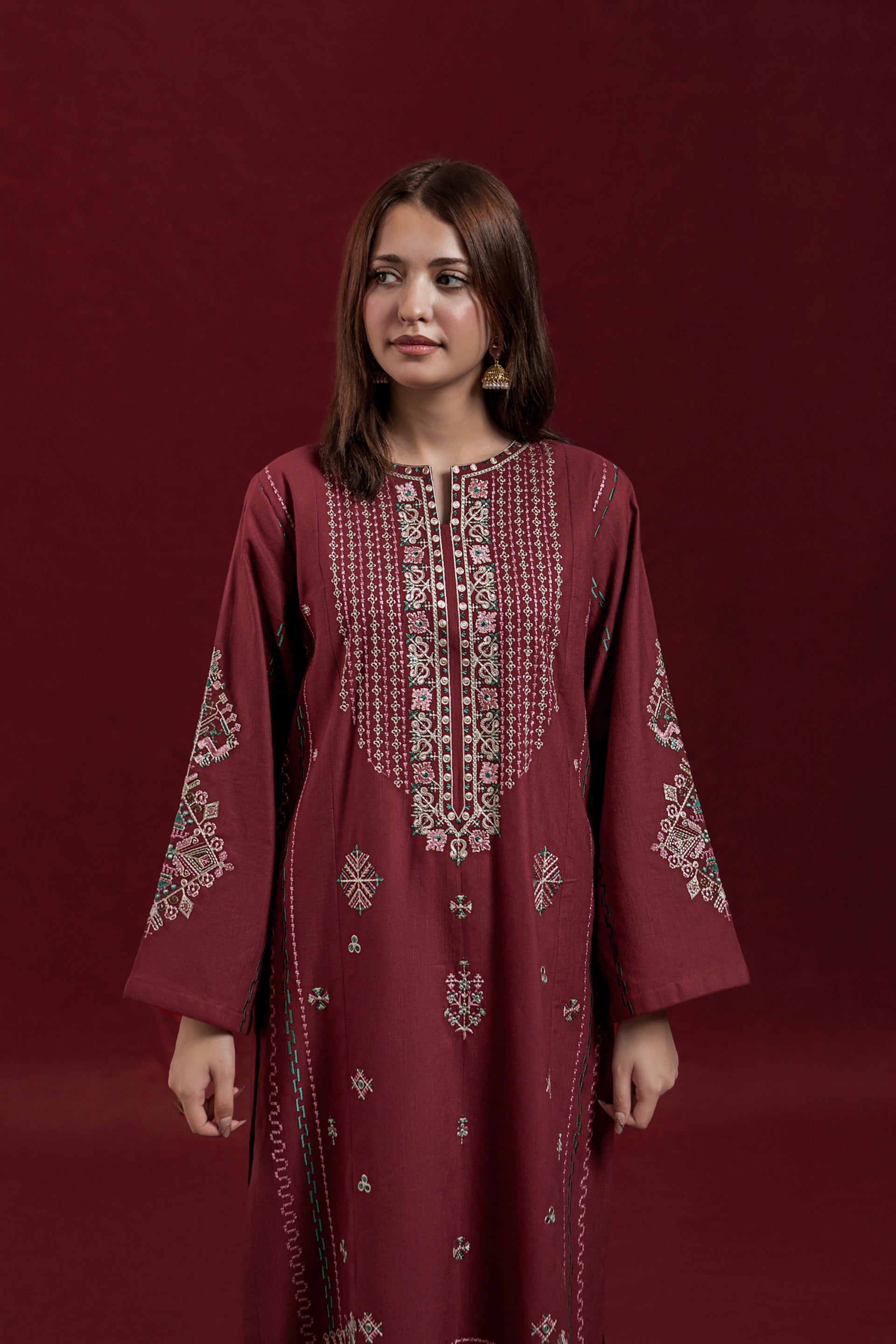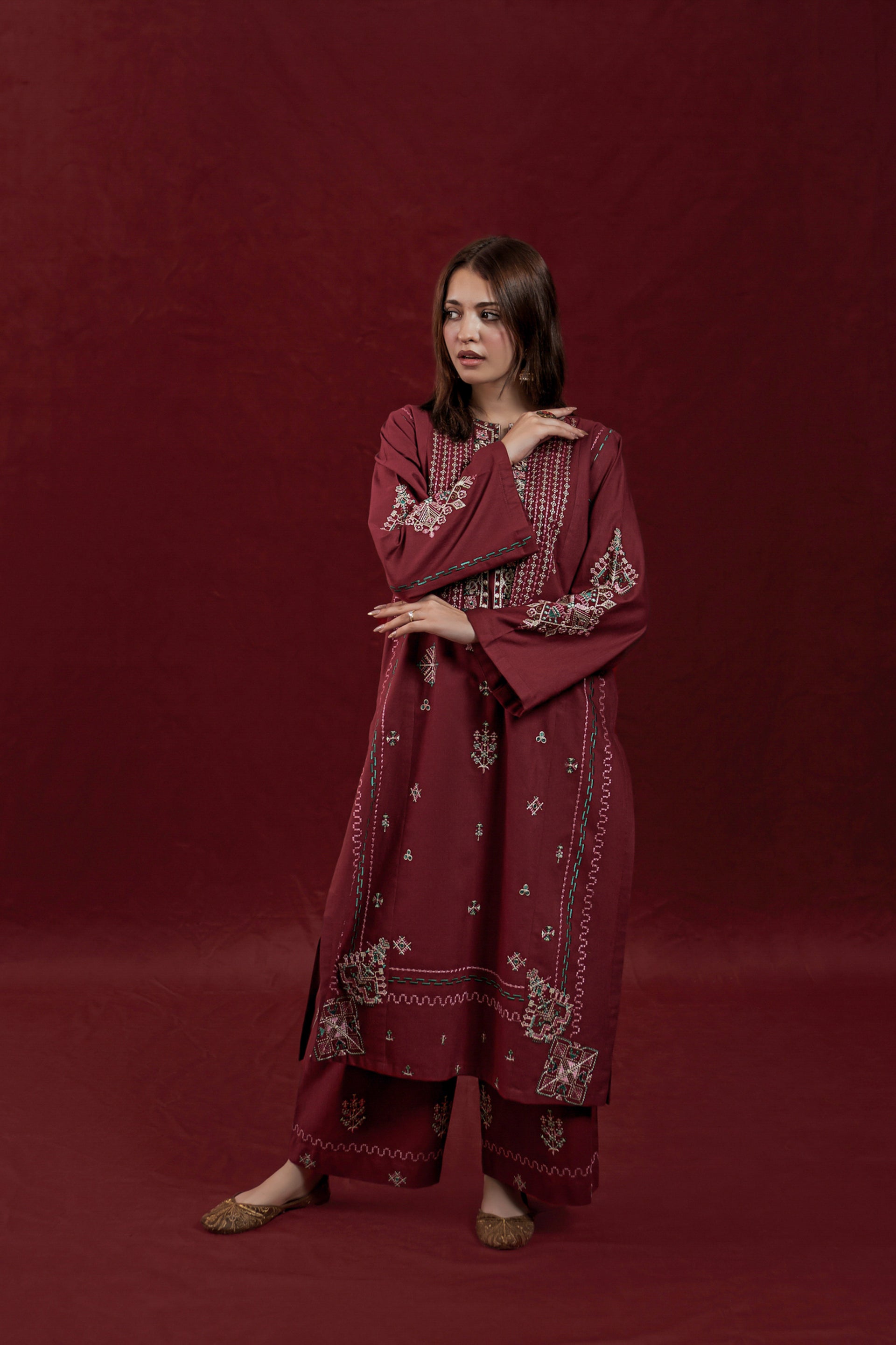 The CURVE ready-to-wear 2-piece khaddar suit combines traditional craftsmanship with elegant design. The long shirt features intricate embroidery along the neckline and front, enhancing its refined appeal. Loose sleeves adorned with delicate embroidered motifs add a graceful touch, while the matching loose embroidered trousers ensure comfort and style. Crafted from warm khaddar fabric, this suit is ideal for cooler seasons, offering both sophistication and cozy wearability.