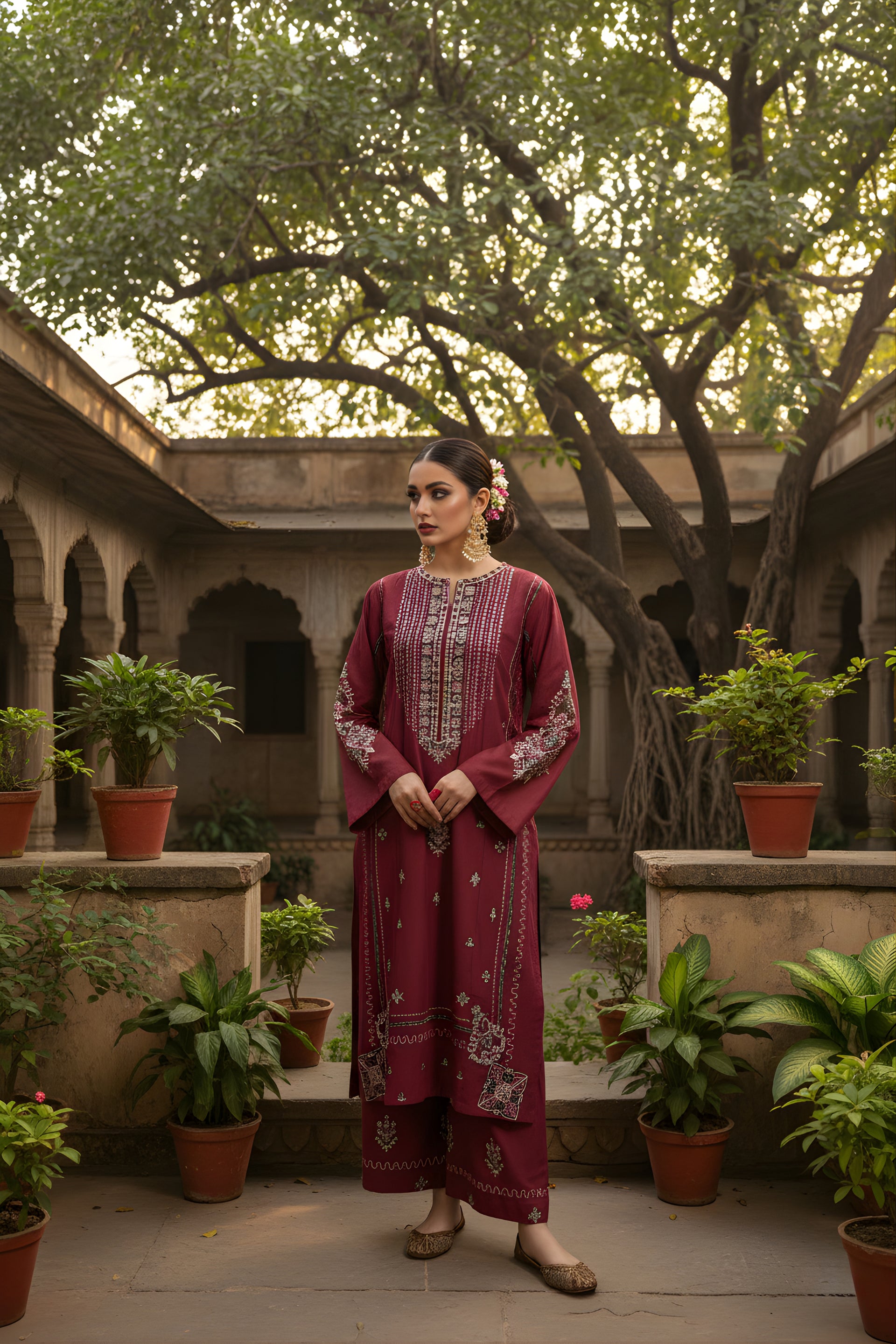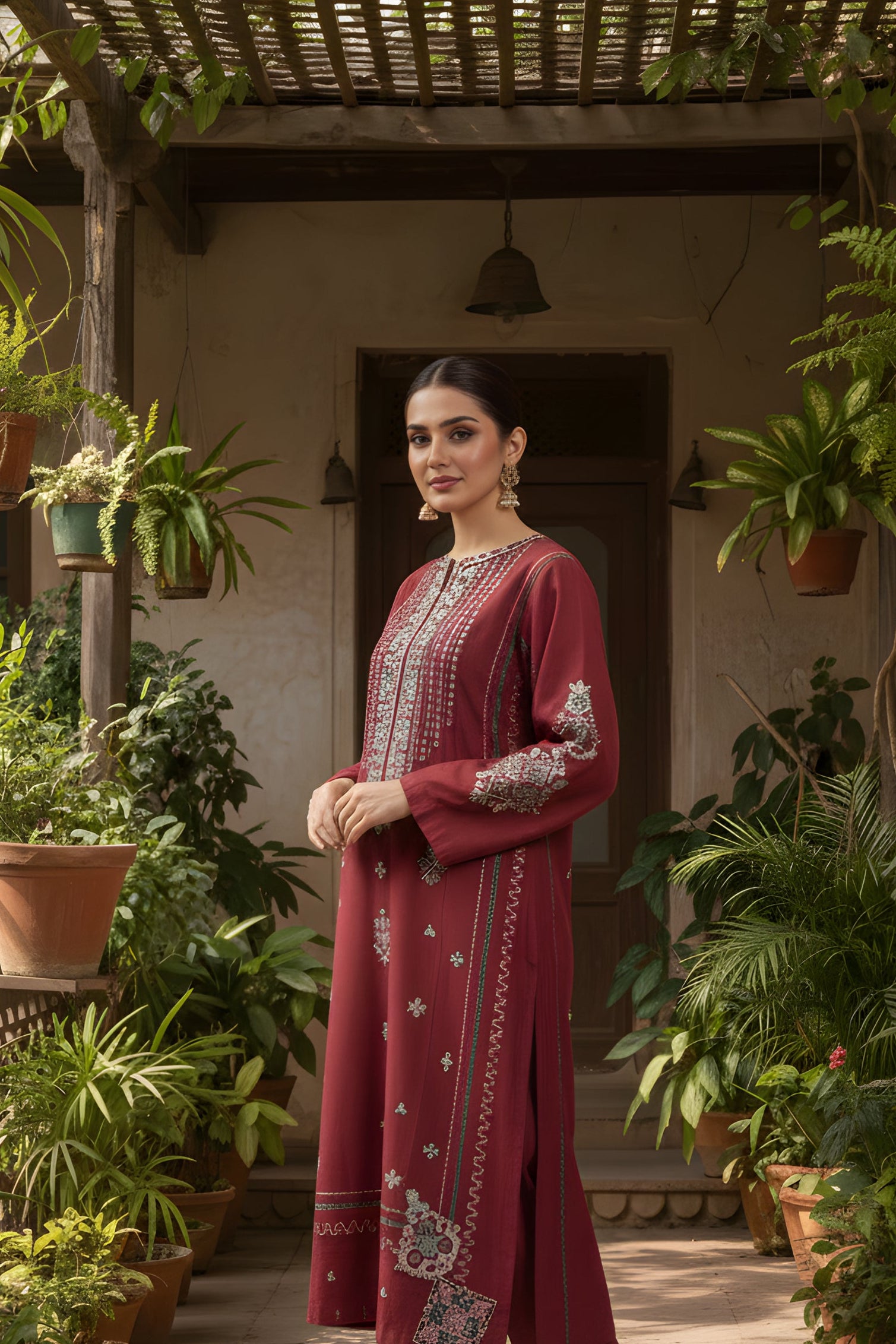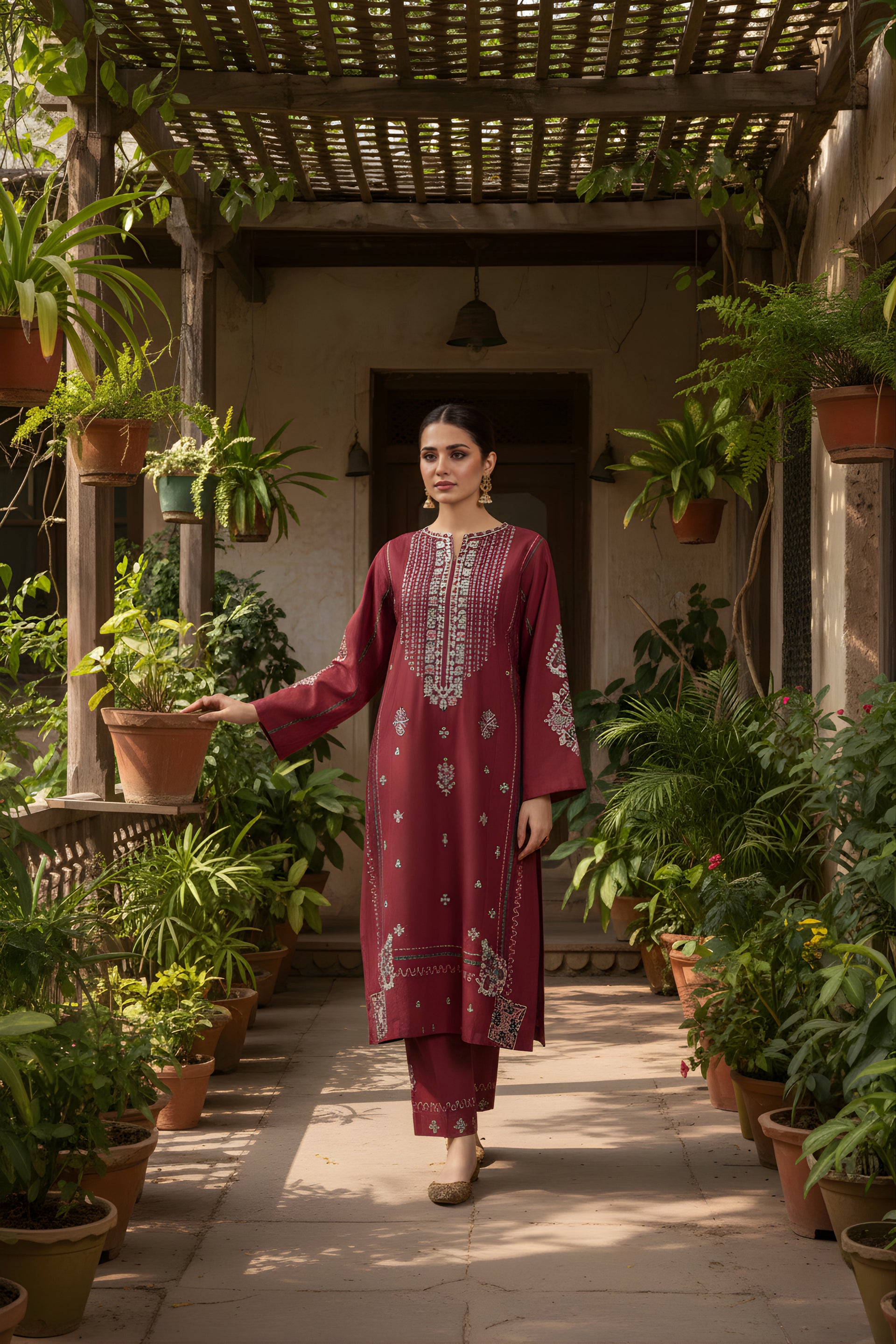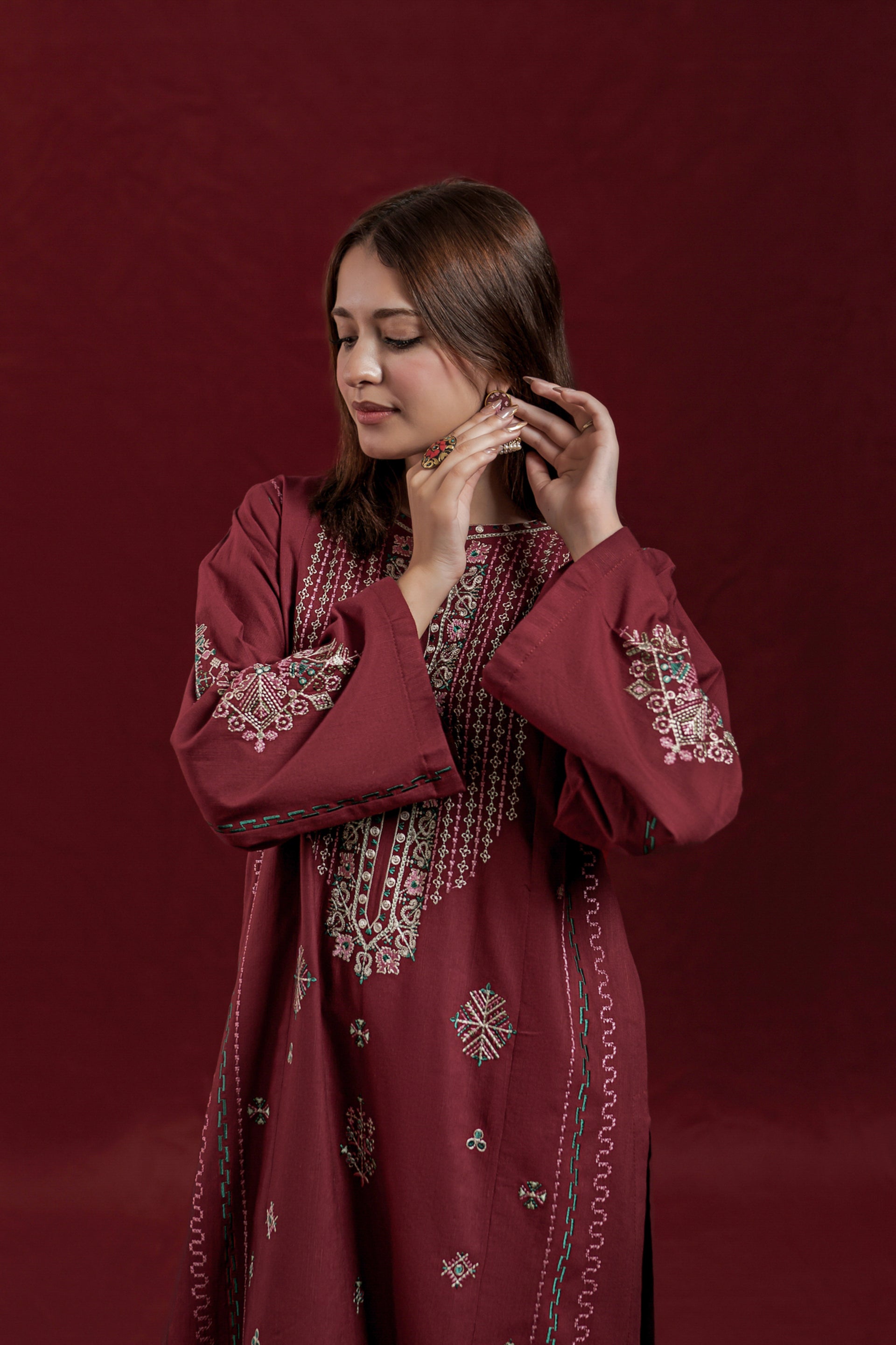 The CURVE ready-to-wear 2-piece khaddar suit combines traditional craftsmanship with elegant design. The long shirt features intricate embroidery along the neckline and front, enhancing its refined appeal. Loose sleeves adorned with delicate embroidered motifs add a graceful touch, while the matching loose embroidered trousers ensure comfort and style. Crafted from warm khaddar fabric, this suit is ideal for cooler seasons, offering both sophistication and cozy wearability.