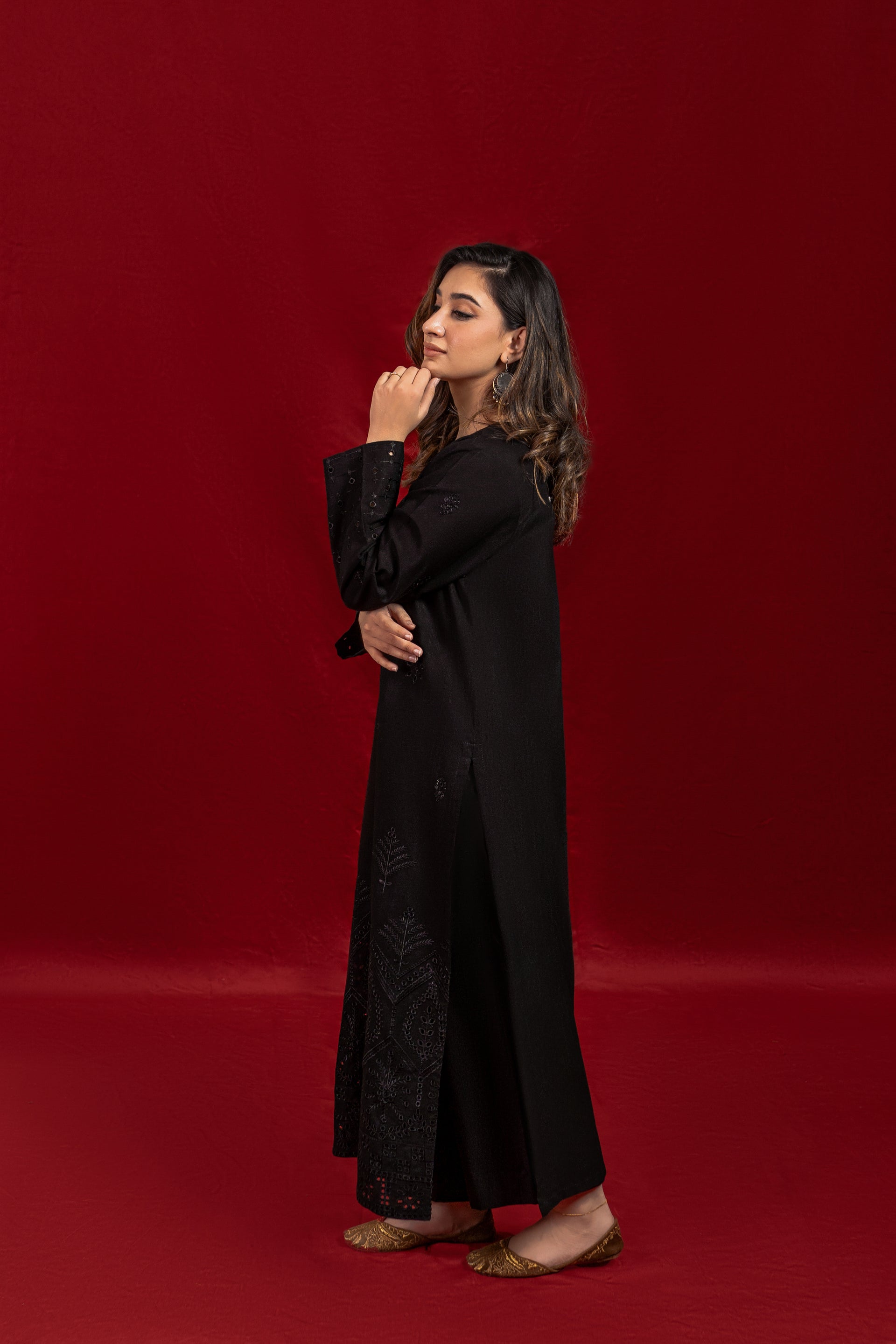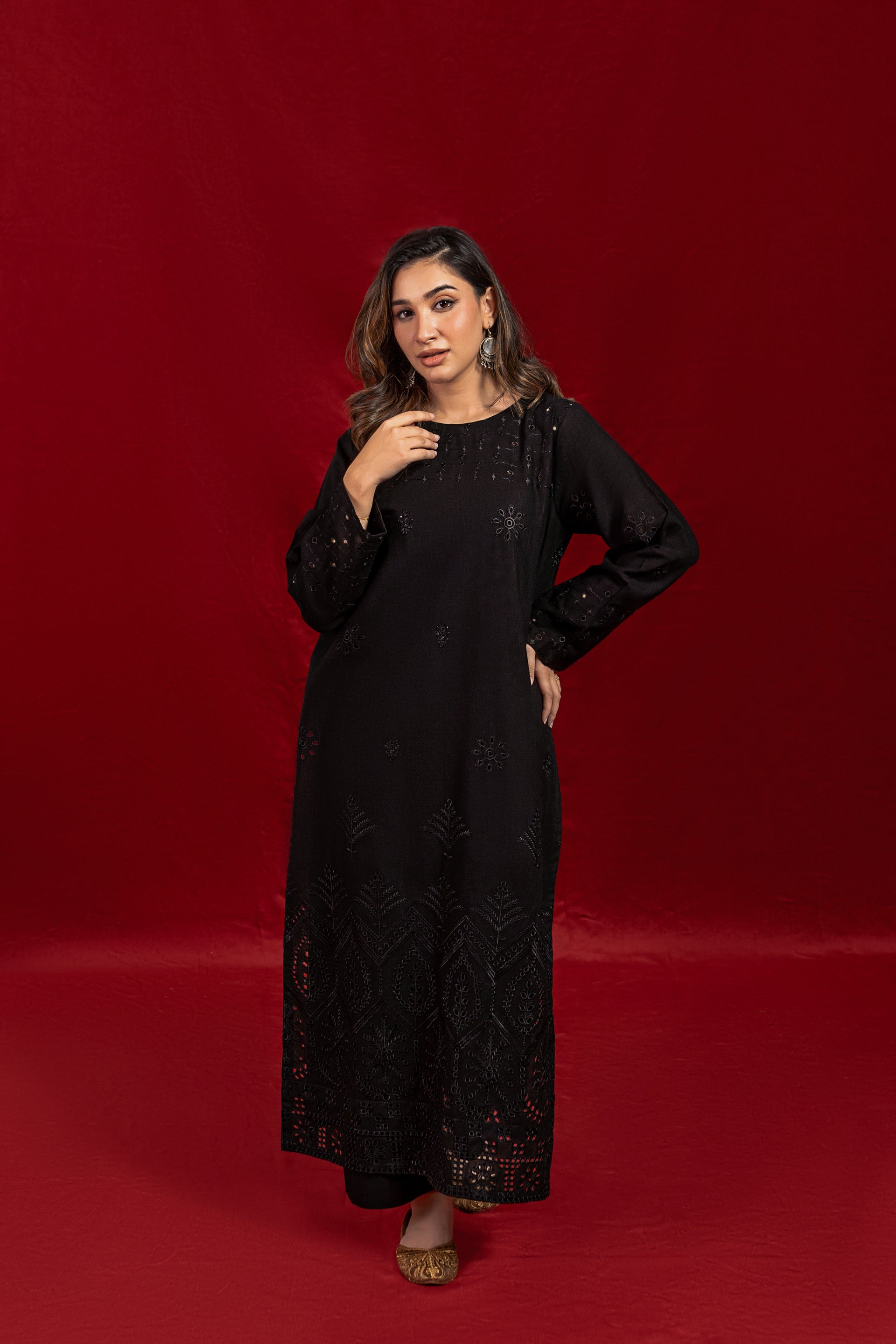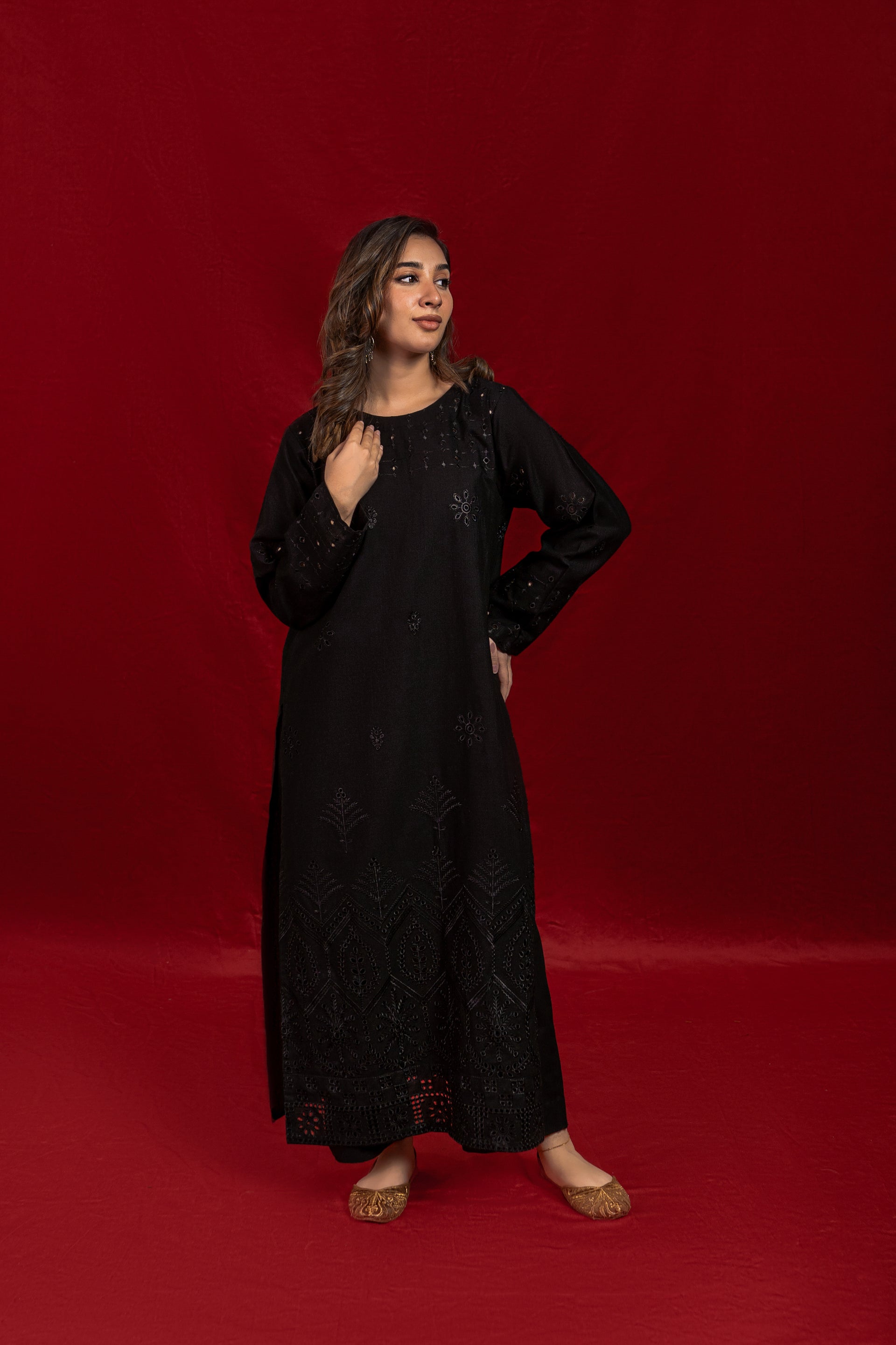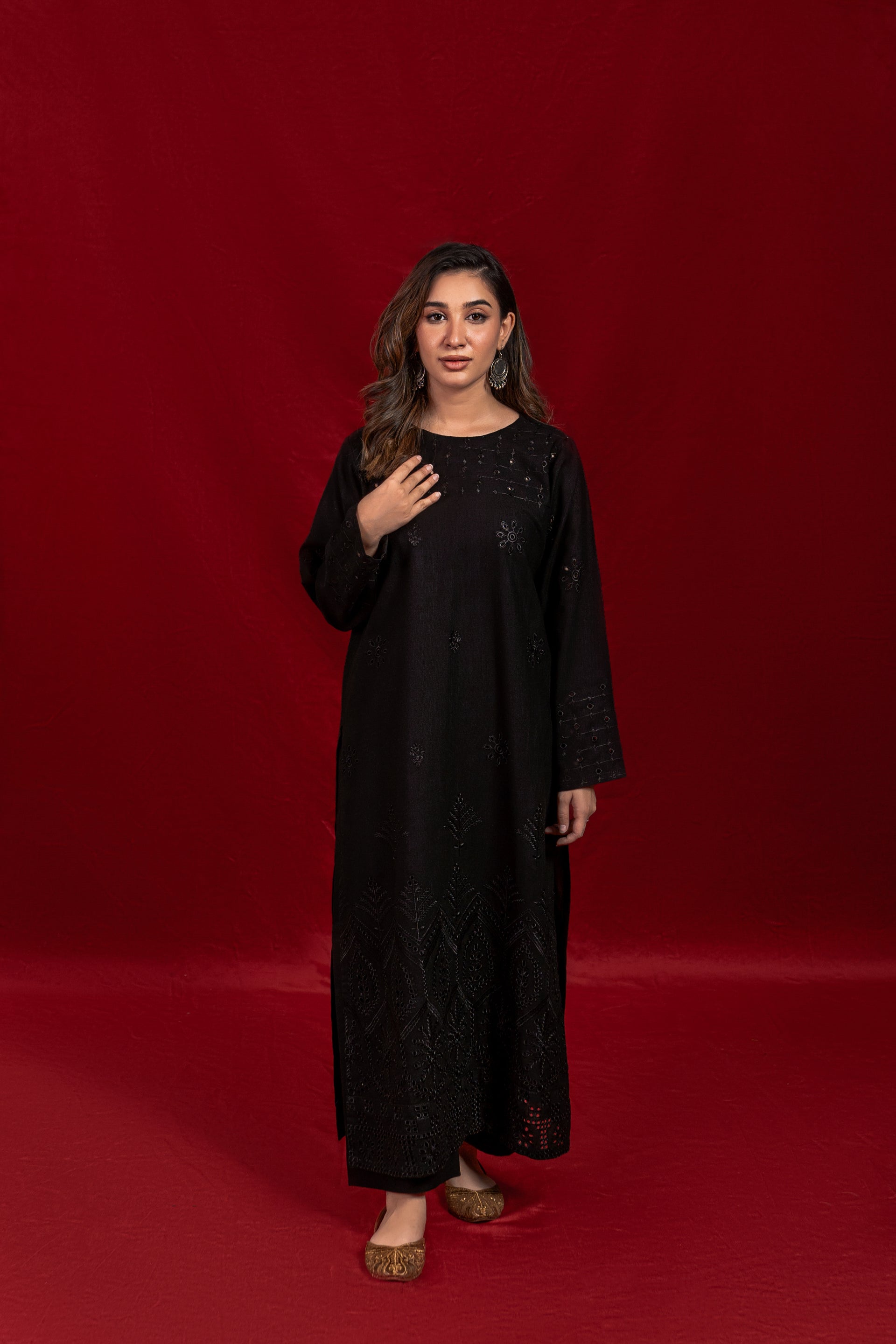 This Dananeer 2-piece Khaddar suit combines traditional craftsmanship with contemporary style. The long shirt features detailed thread embroidery and delicate Chikankari work on the front and sleeves, offering timeless elegance. Paired with loose, plain trousers, this ensemble balances intricate design with comfortable wearability, perfect for both casual and formal occasions.