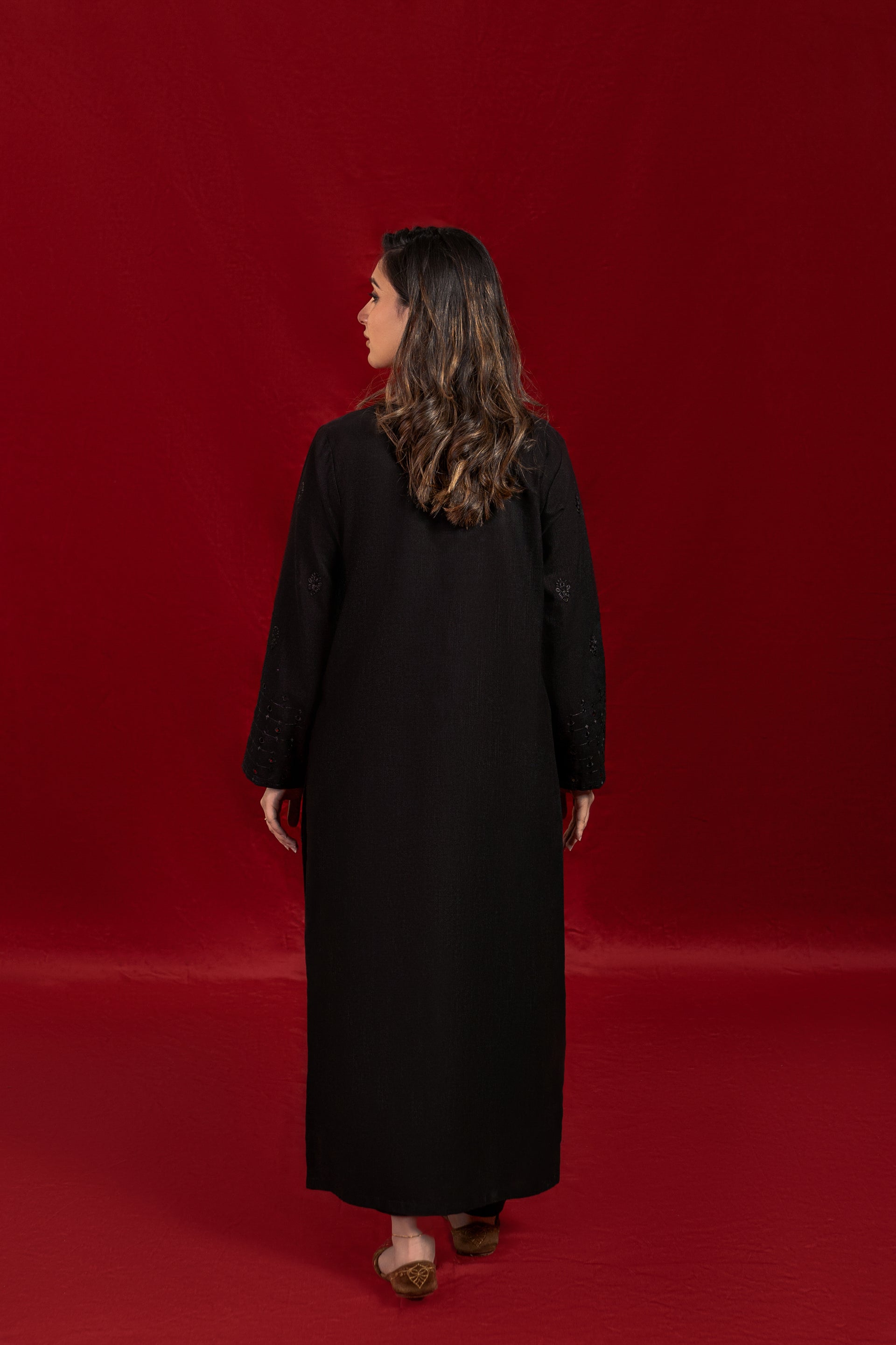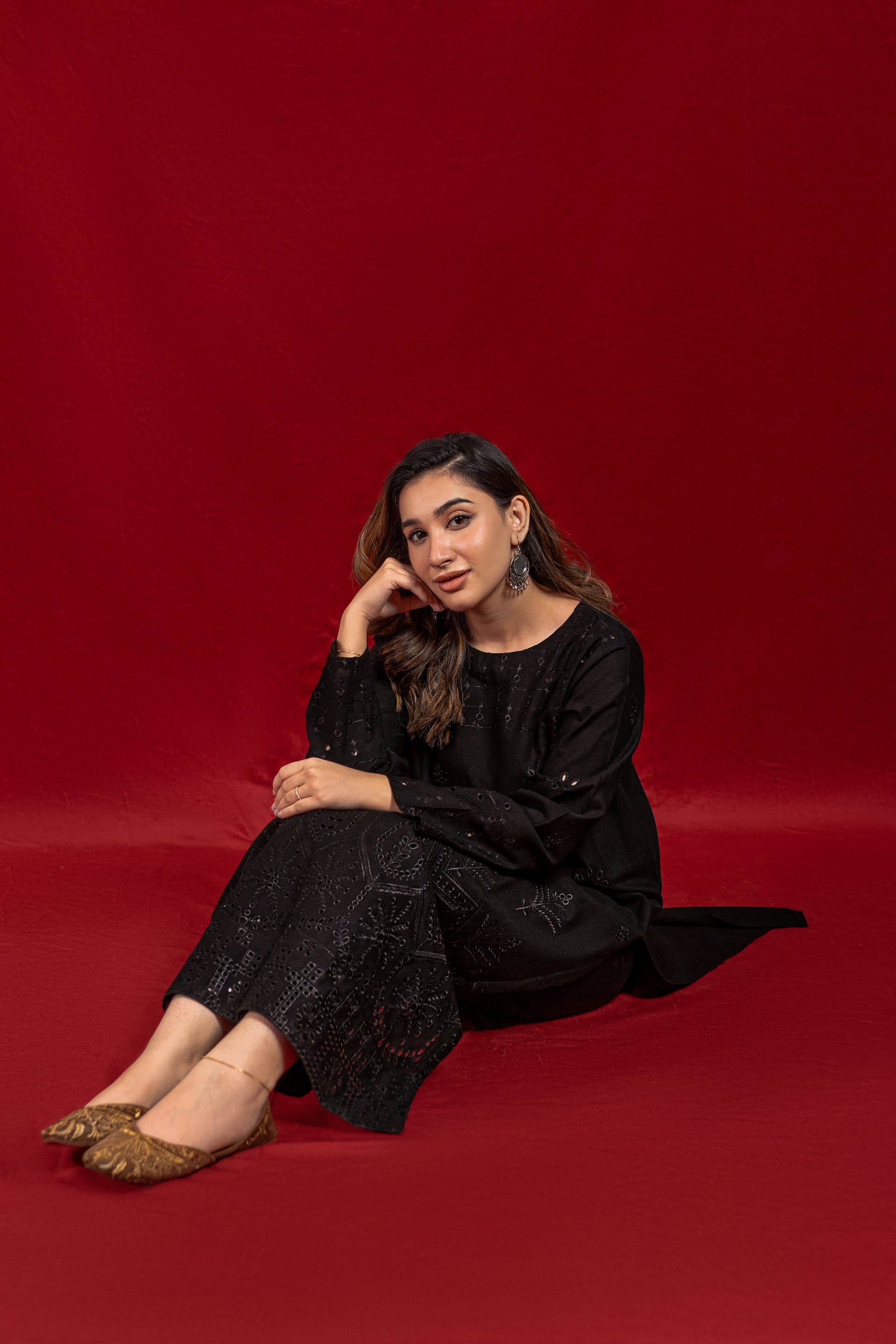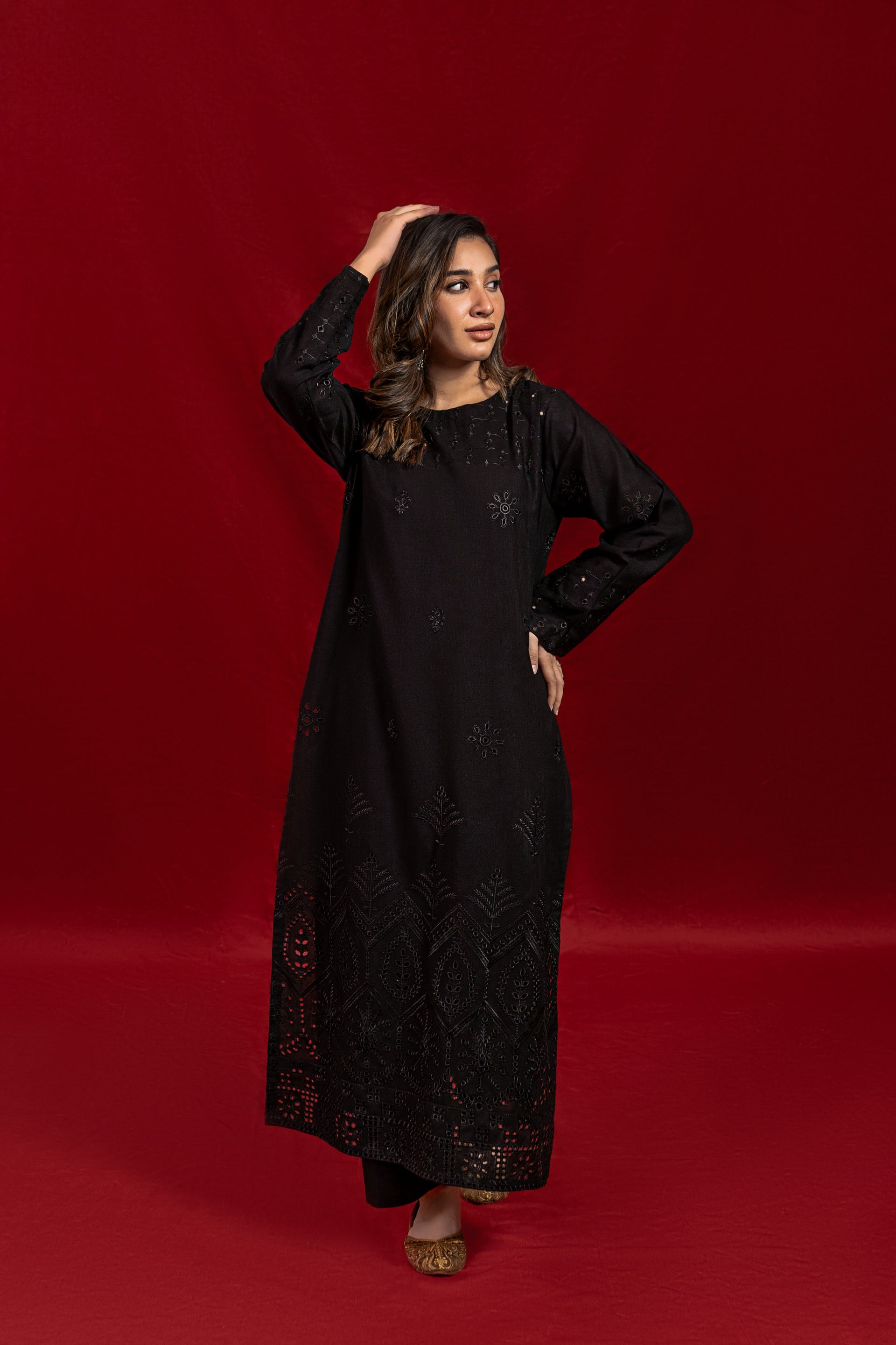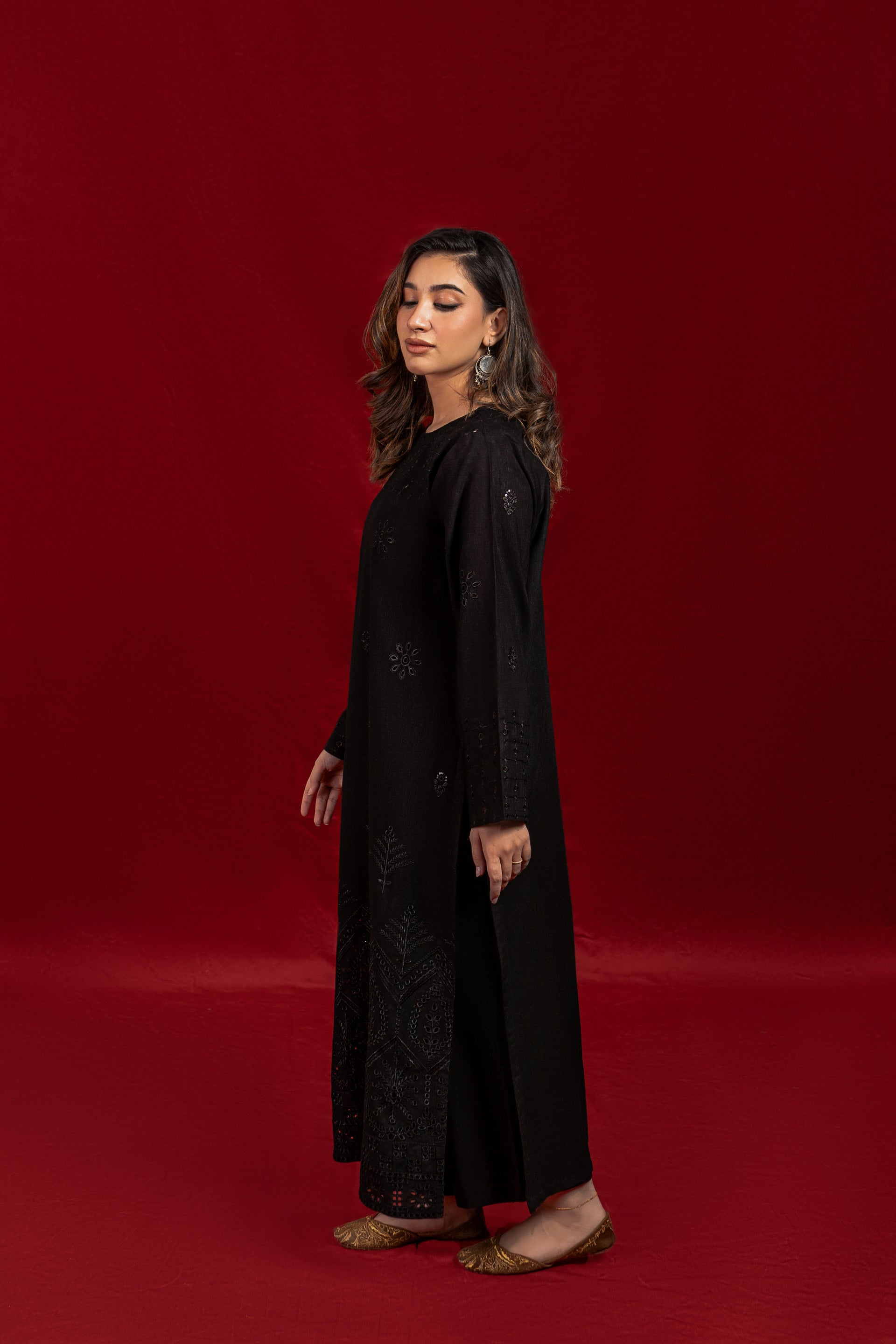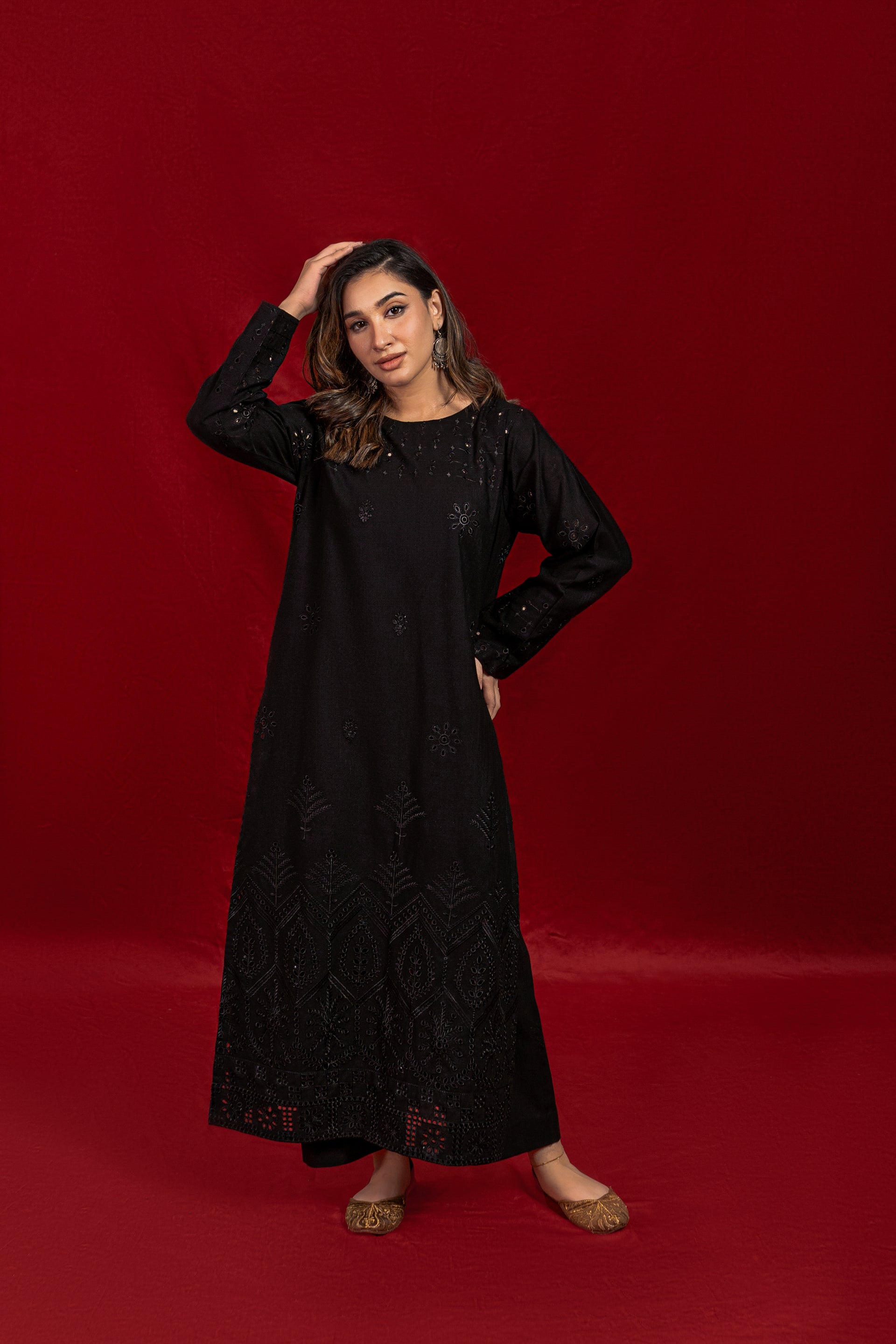 This Dananeer 2-piece Khaddar suit combines traditional craftsmanship with contemporary style. The long shirt features detailed thread embroidery and delicate Chikankari work on the front and sleeves, offering timeless elegance. Paired with loose, plain trousers, this ensemble balances intricate design with comfortable wearability, perfect for both casual and formal occasions.