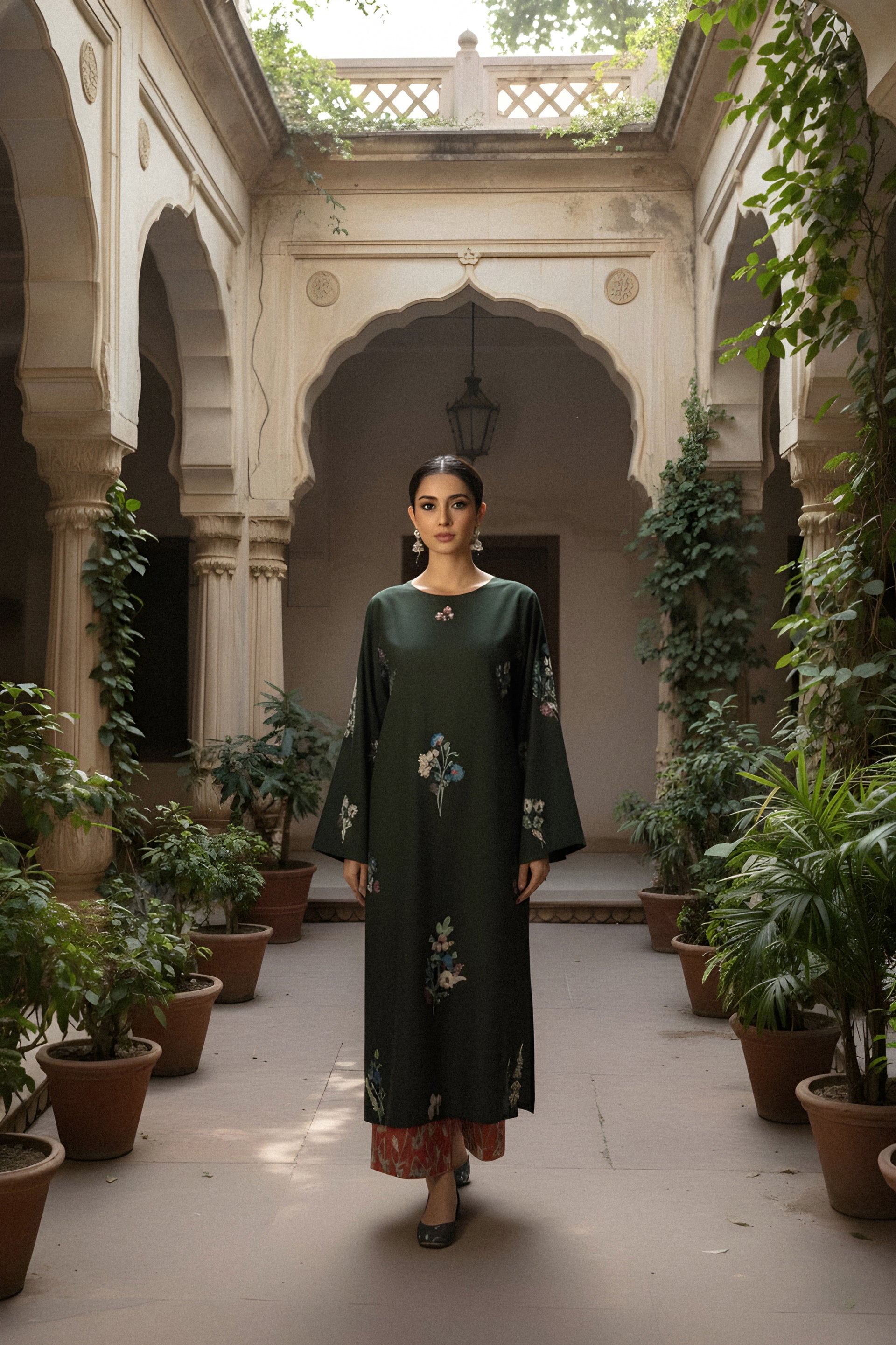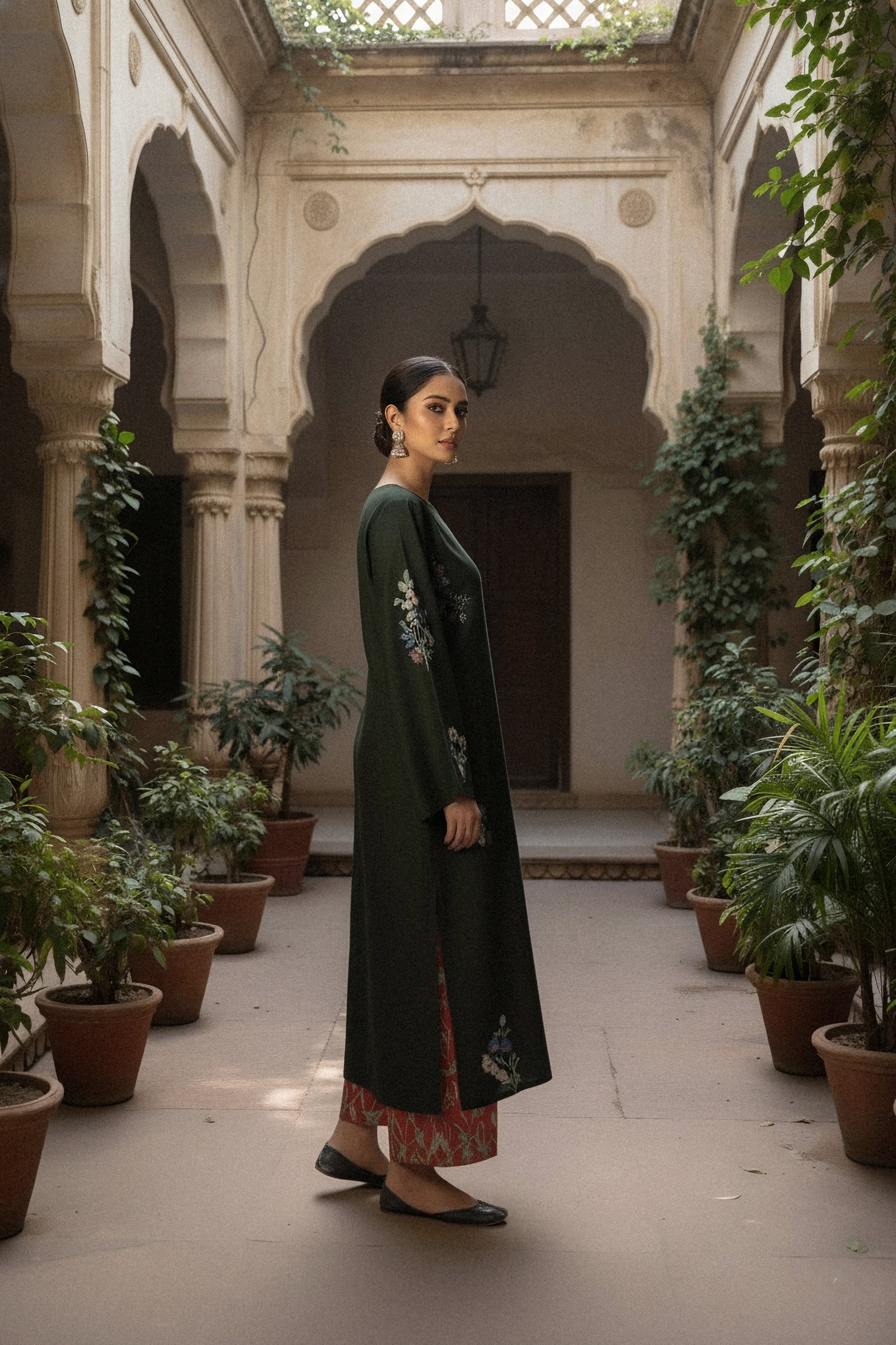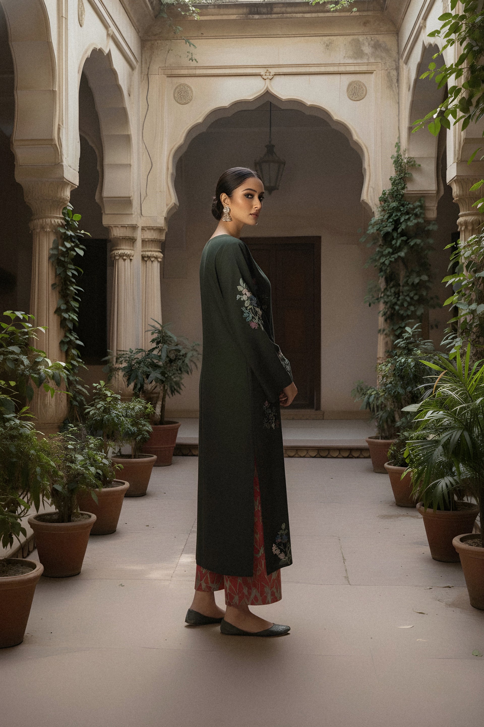 This Delida 2-piece Khaddar suit combines warmth and style with expertly embroidered motifs on the front and sleeves of the long shirt. Paired with loose, contrasting embroidered trousers, it offers both comfort and elegance, making it perfect for cool weather while maintaining a refined, traditional aesthetic.