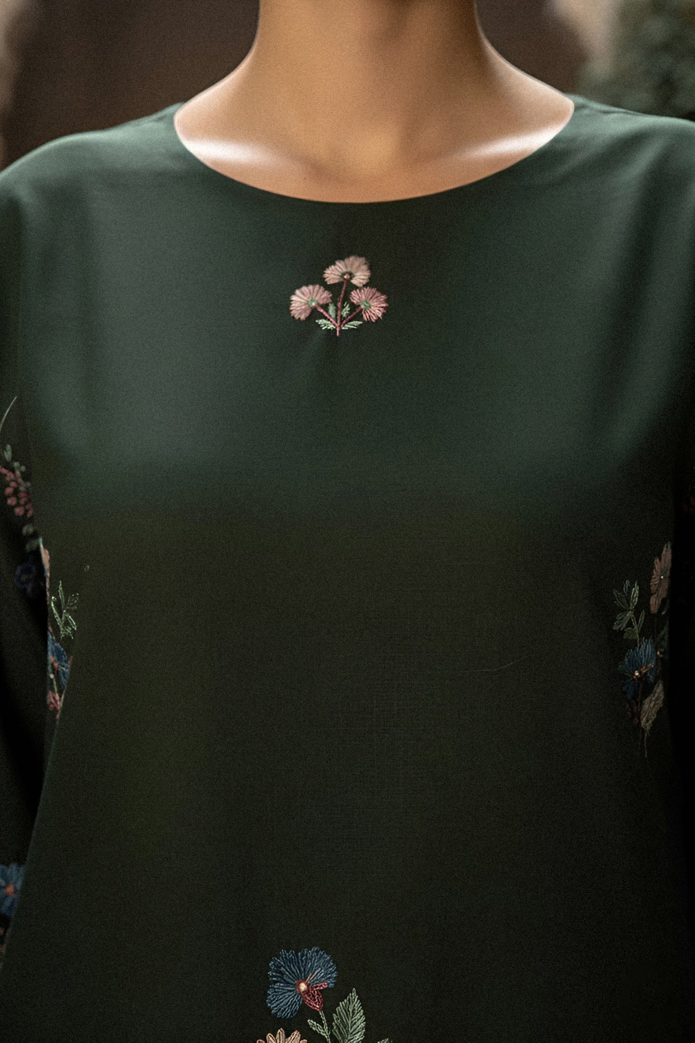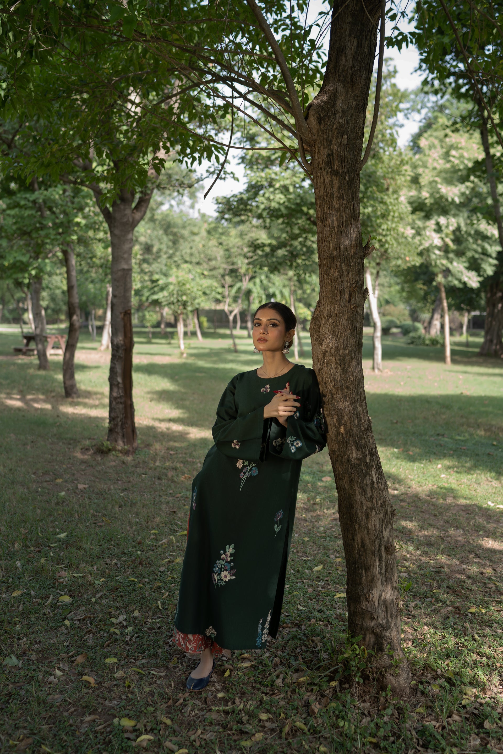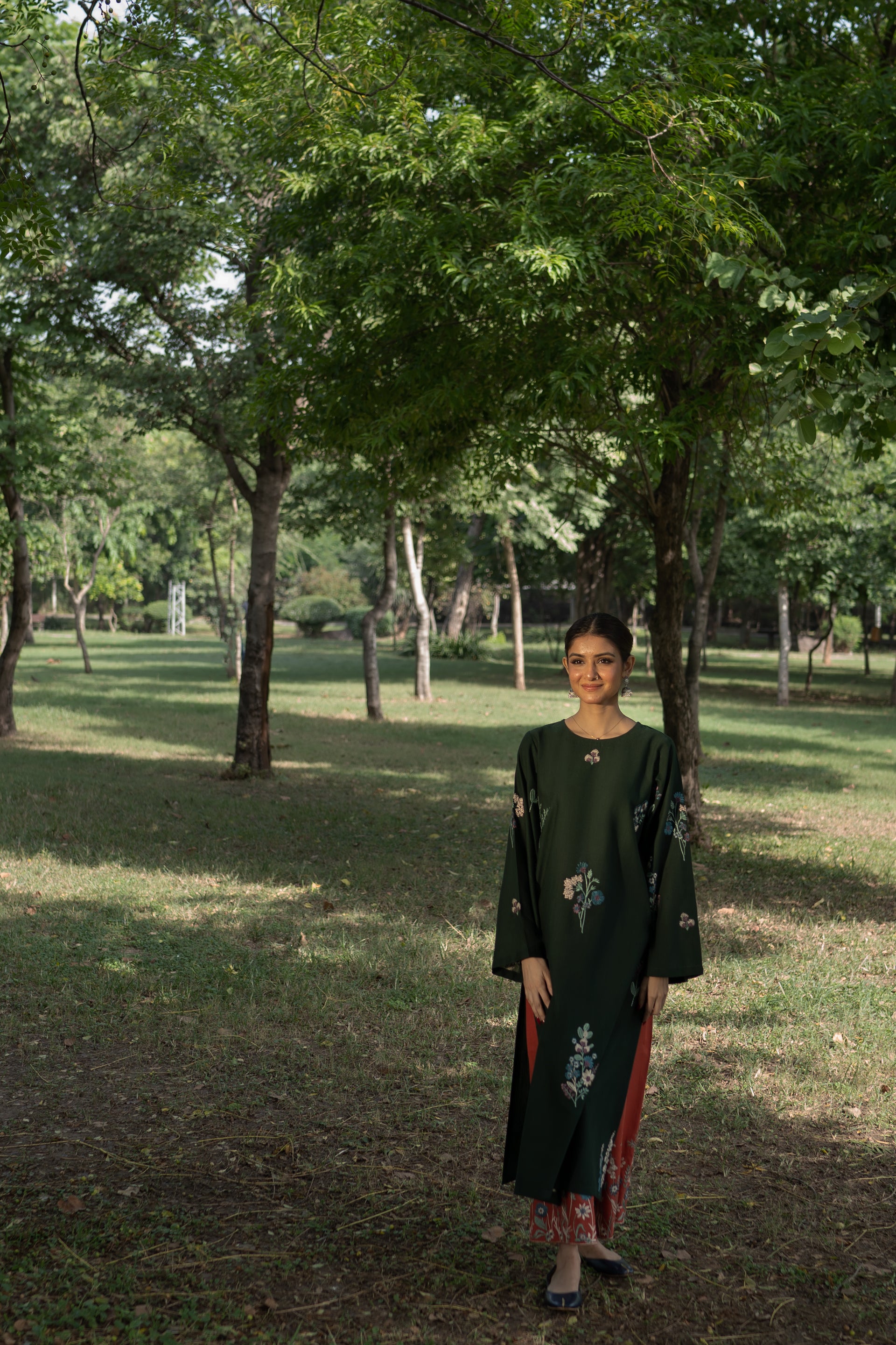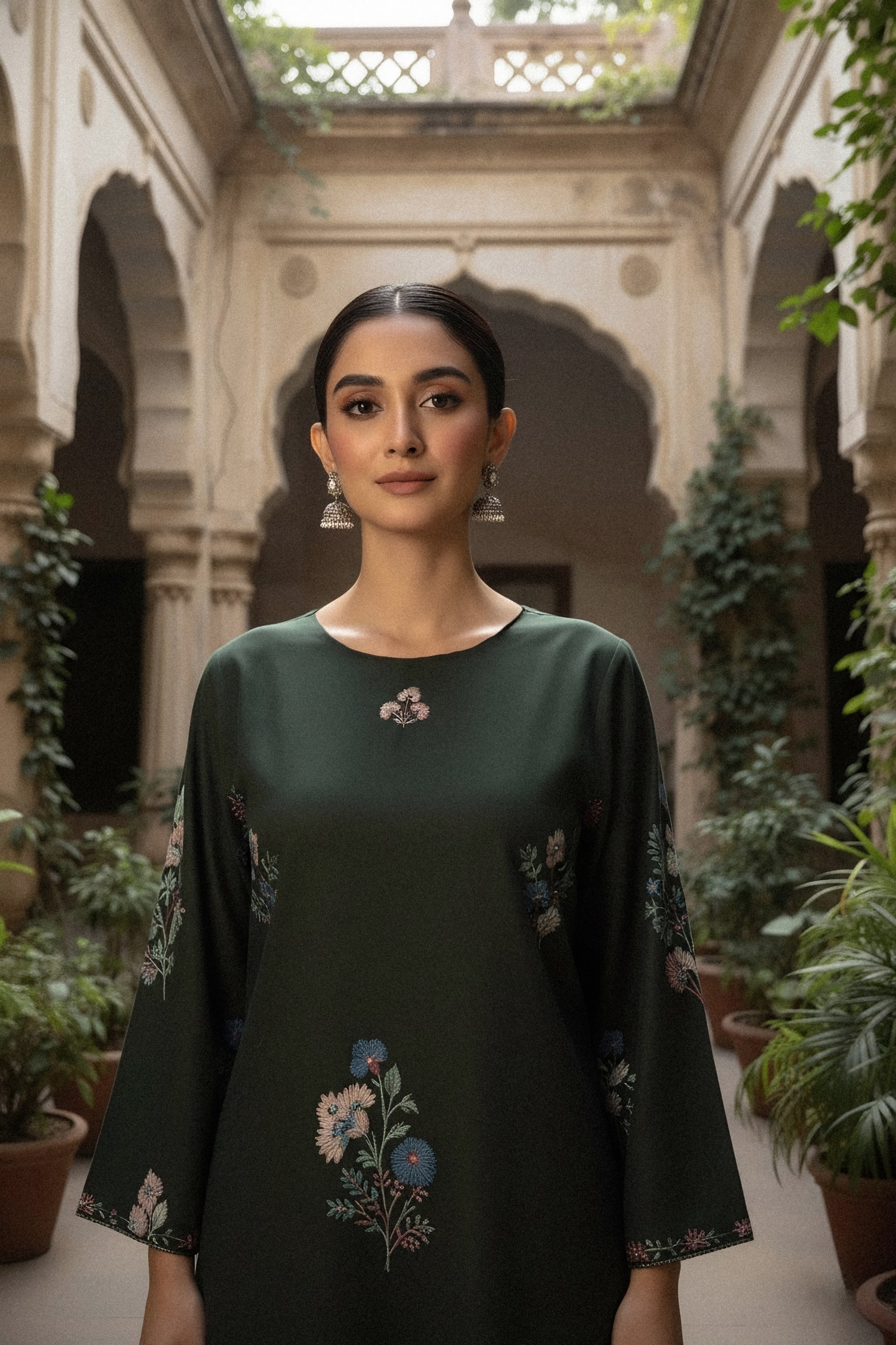 This Delida 2-piece Khaddar suit combines warmth and style with expertly embroidered motifs on the front and sleeves of the long shirt. Paired with loose, contrasting embroidered trousers, it offers both comfort and elegance, making it perfect for cool weather while maintaining a refined, traditional aesthetic.