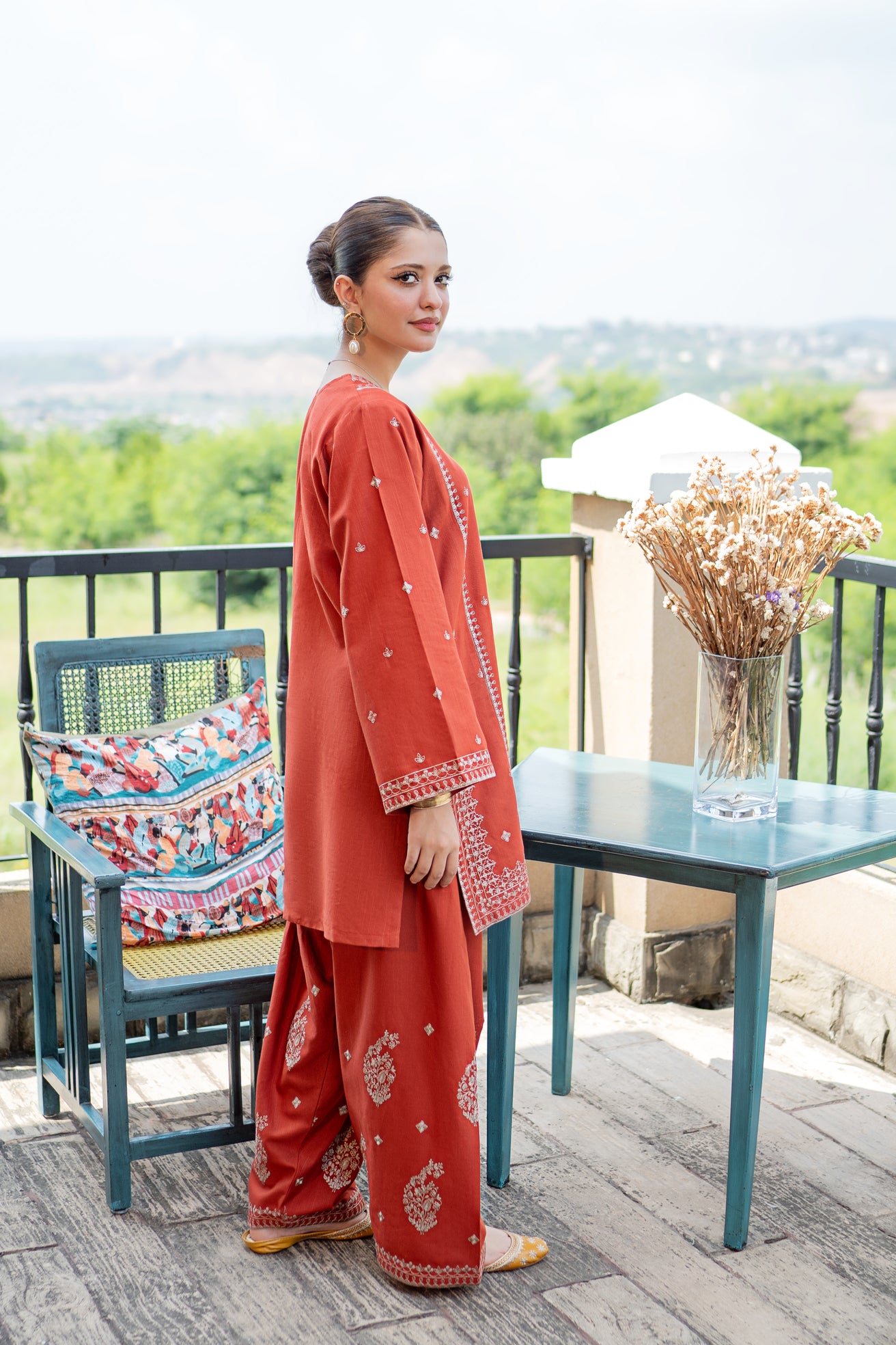 DUR E FISHAN presents a ready-to-wear 2-piece khaddar suit crafted with precision. The short shirt showcases intricate embroidery on the front and sleeves, highlighting traditional artistry. Complemented by a loose embroidered farshi shalwar, this set balances elegance with comfort, ideal for sophisticated, everyday wear.
