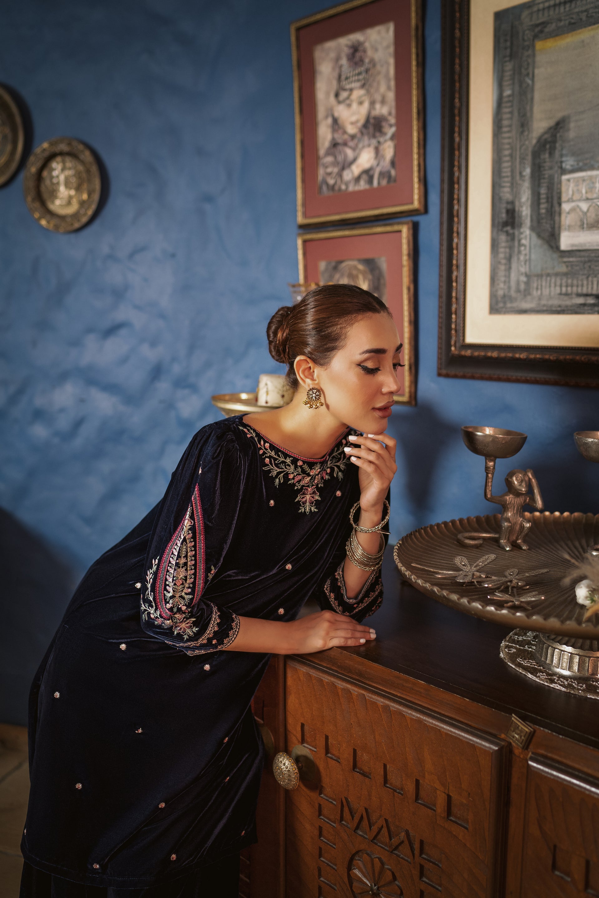 Introducing FAYRUZ, a stunning ready-to-wear 2-piece embroidered velvet suit designed for the modern woman. This exquisite ensemble features a short shirt adorned with intricate embroidery on the front and neckline, complemented by elegantly puffed sleeves with detailed embroidered motifs. Paired with a loose, embroidered farshi shalwar, this piece effortlessly combines traditional craftsmanship with contemporary style. Perfect for celebrations and special occasions, FAYRUZ delivers sophistication and grace in every stitch.
