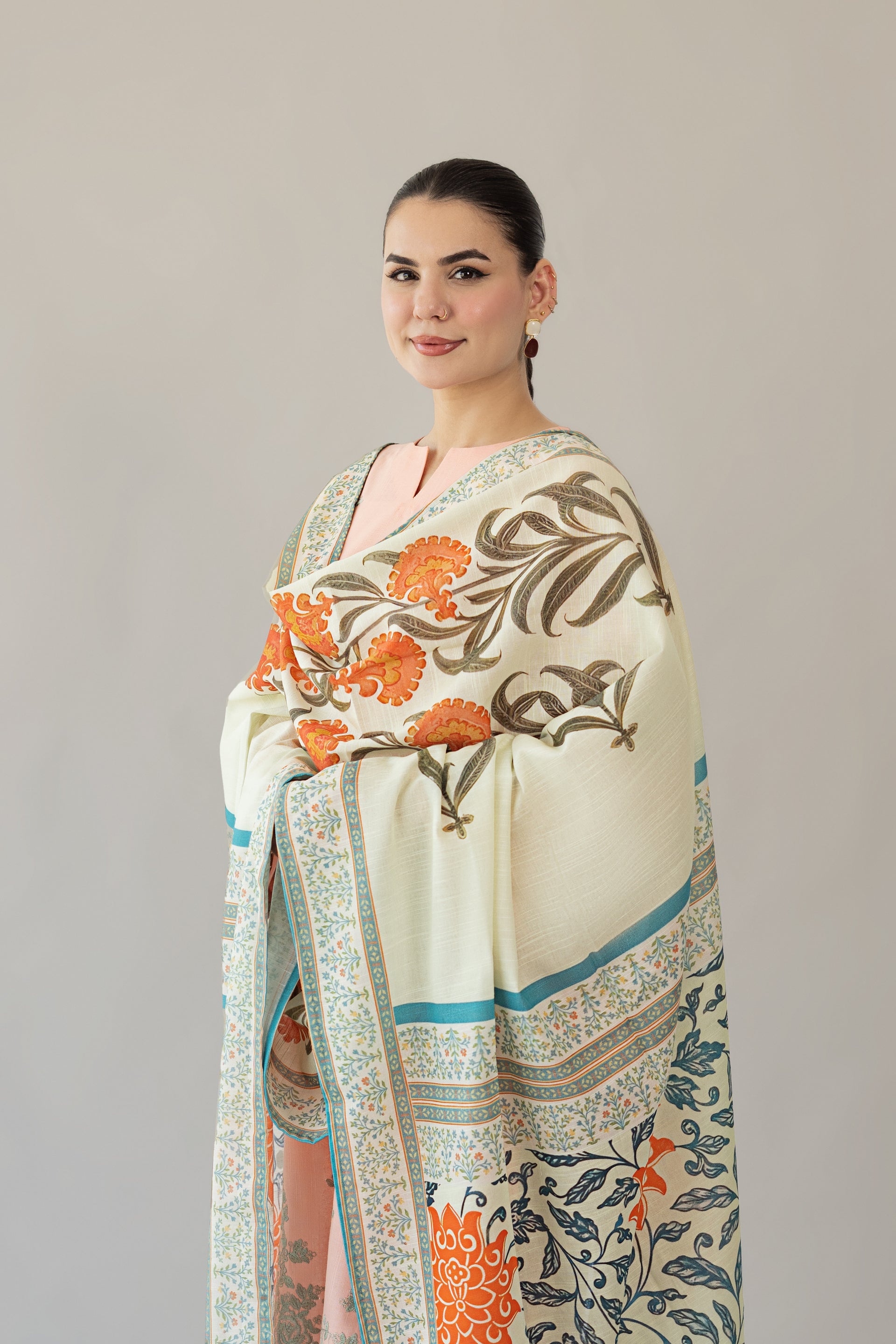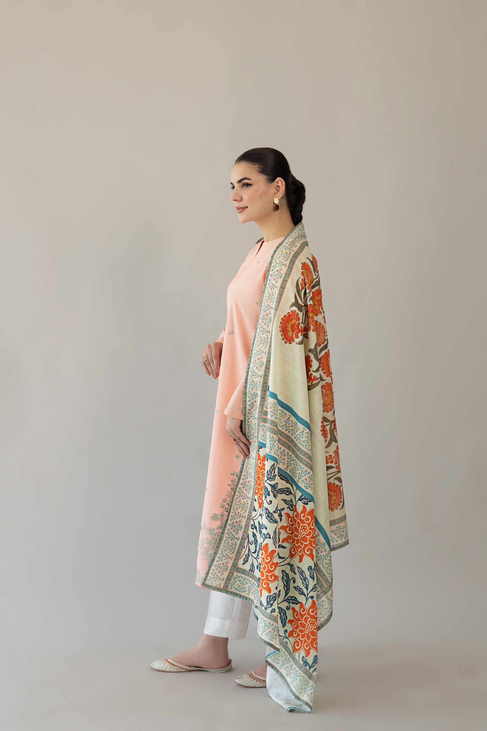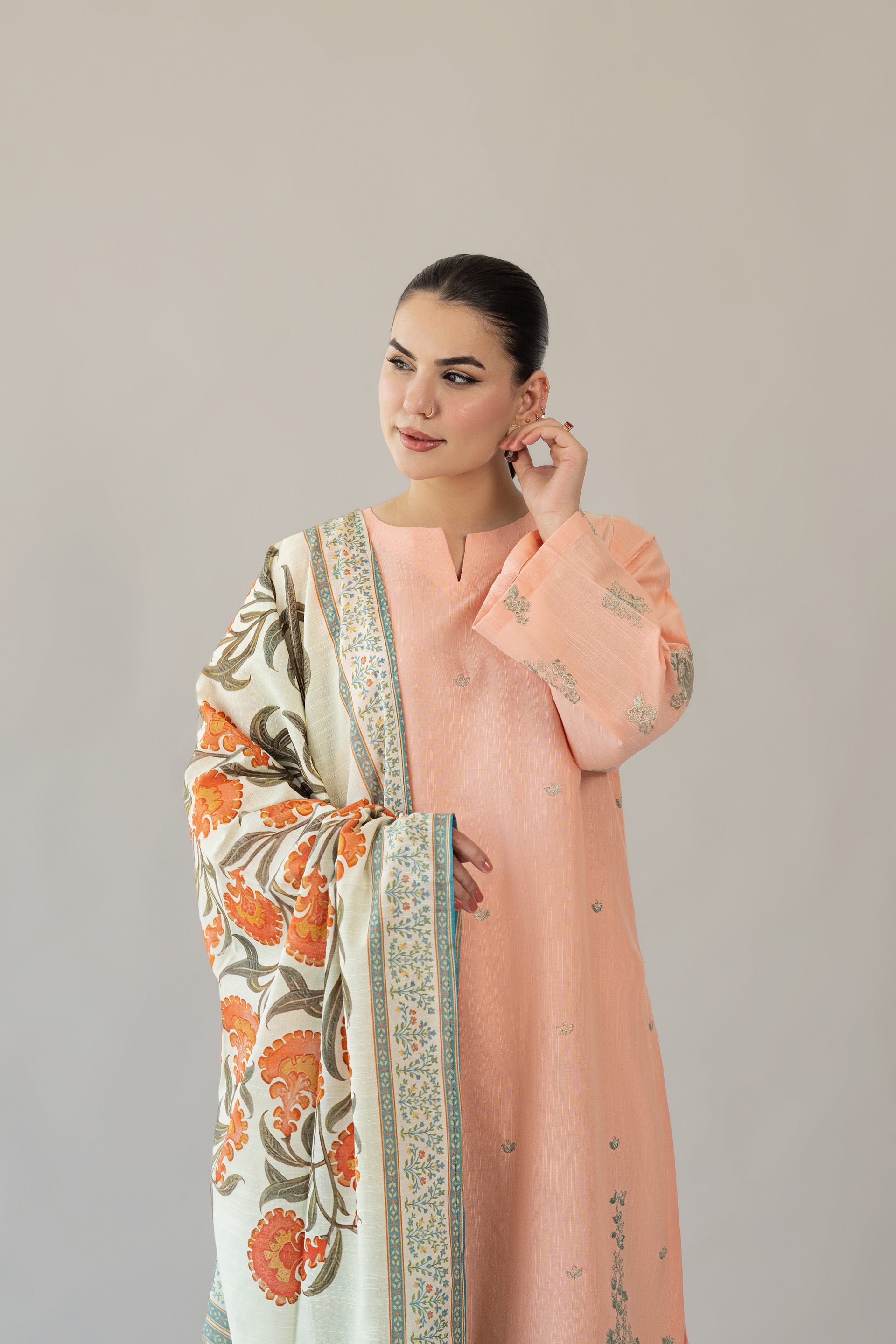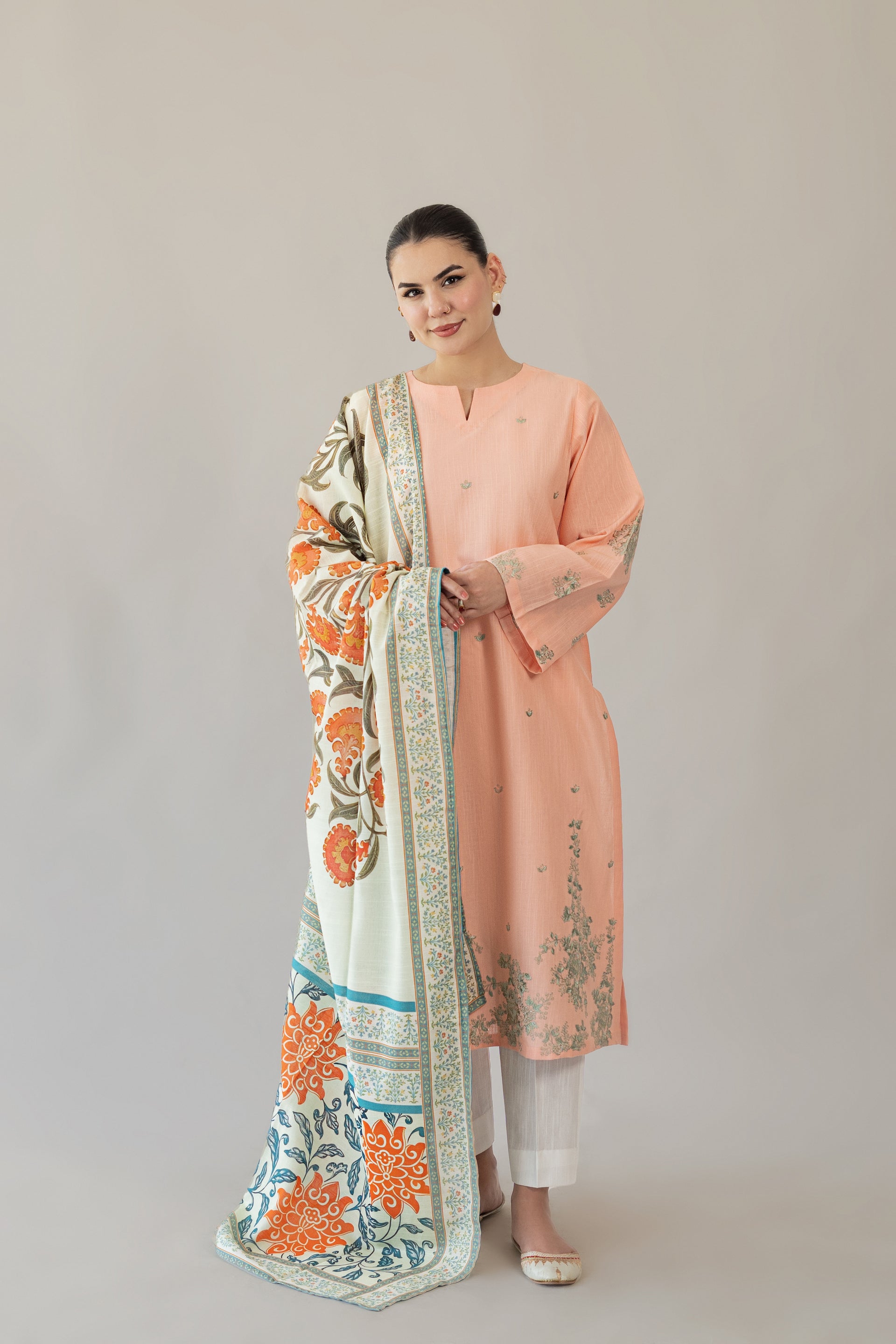 Elevate your wardrobe with this sophisticated 3-piece khaddar suit, designed for effortless elegance. The ensemble features a meticulously embroidered long shirt with detailed threadwork on the front and sleeves, paired with straight-cut contrasting trousers for a refined silhouette. Complete the look with the coordinating printed khaddar shawl. Crafted from premium khaddar fabric.