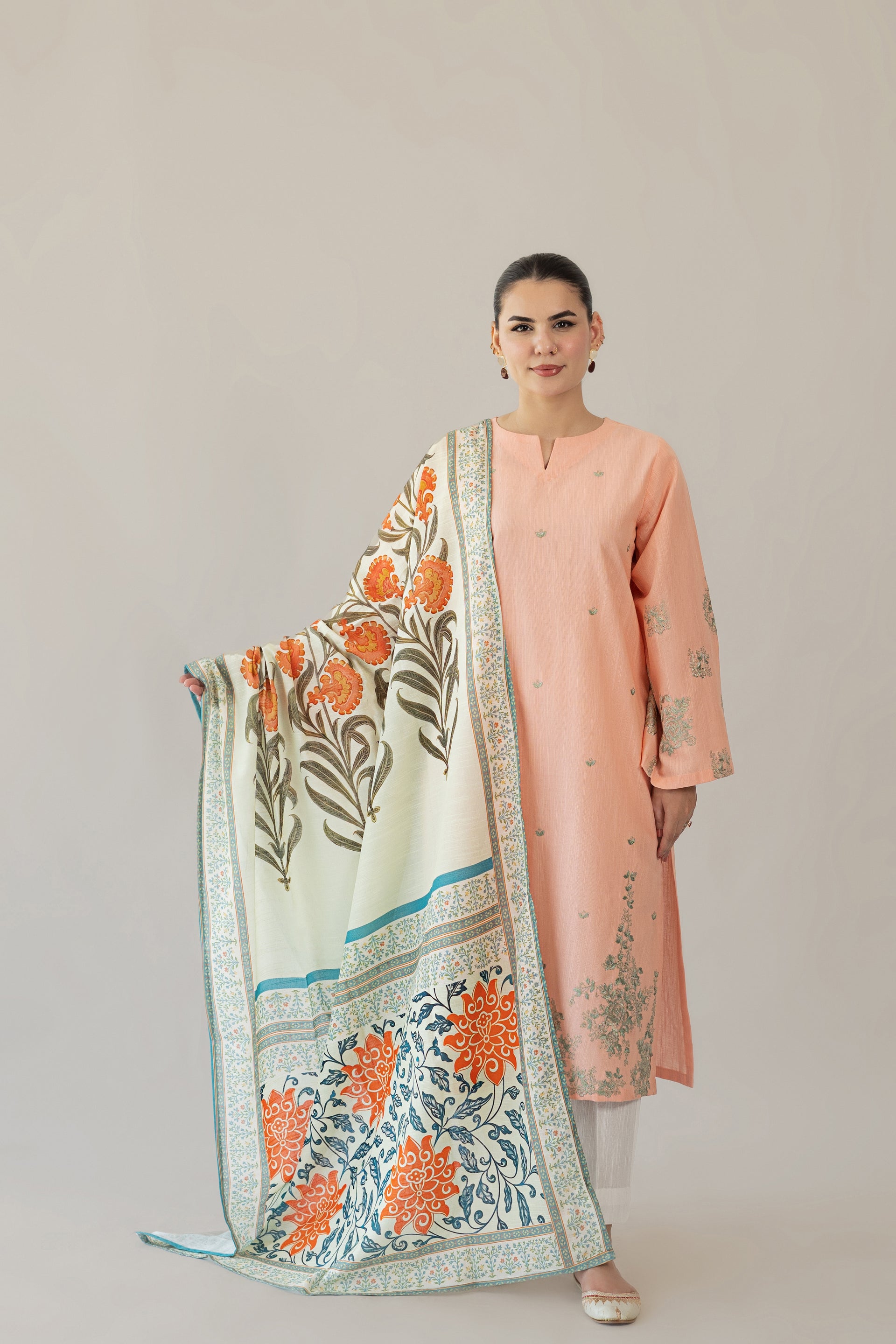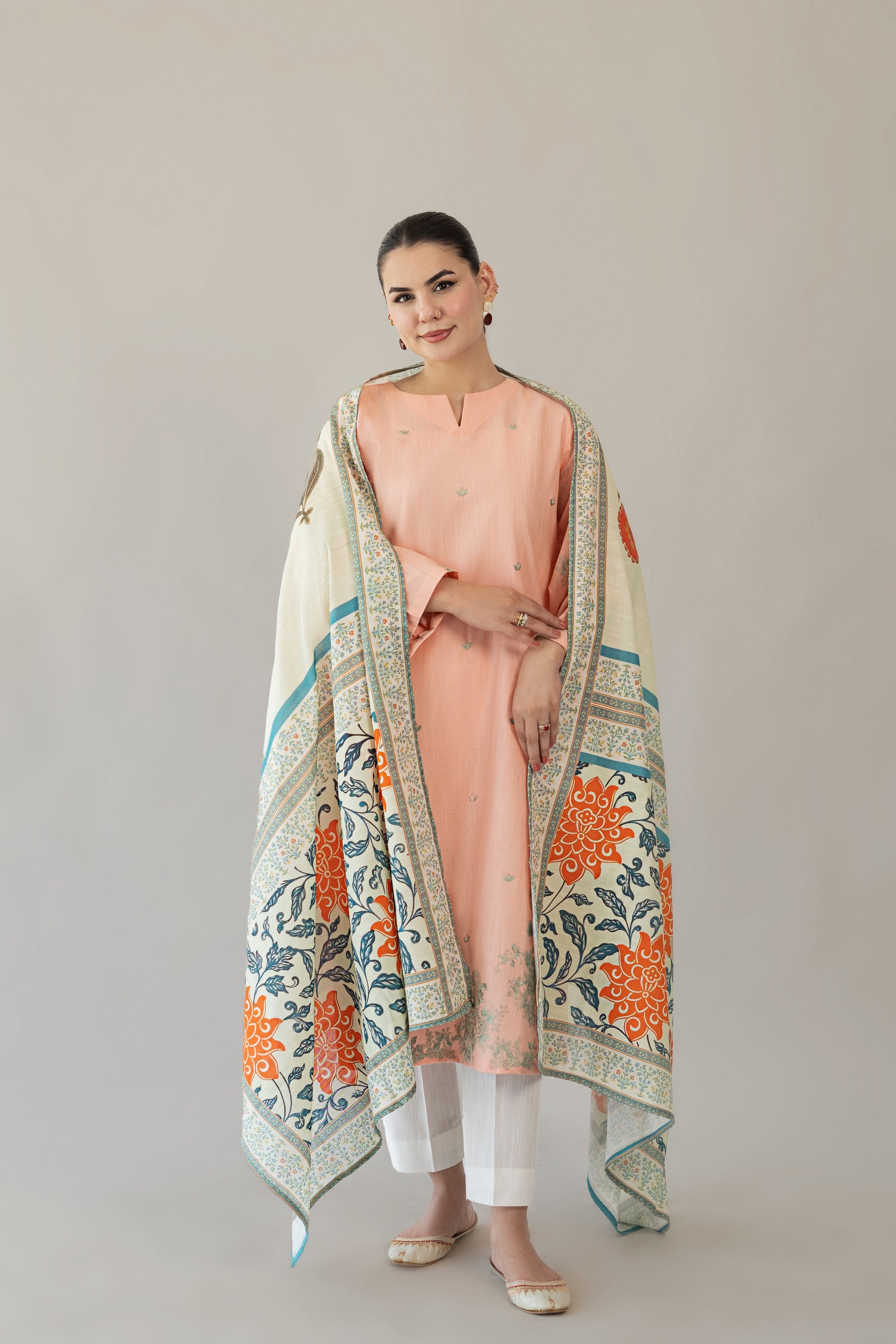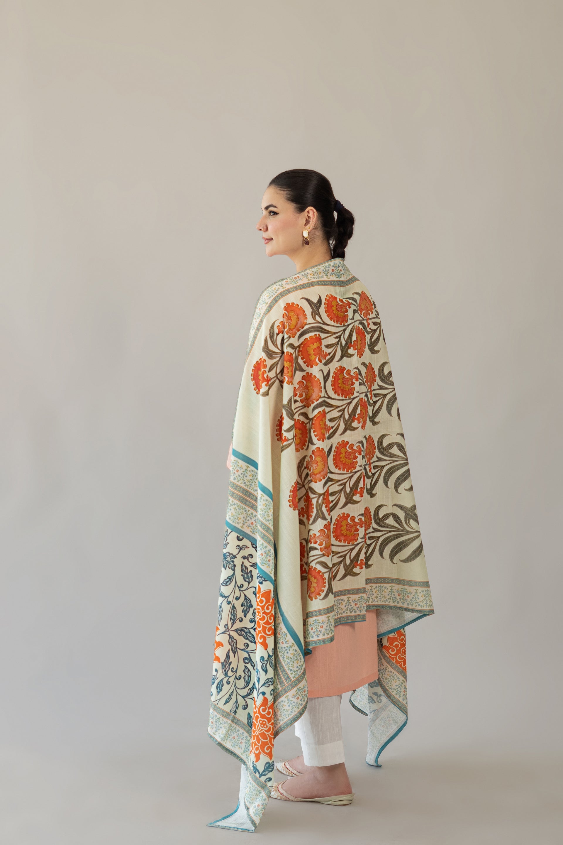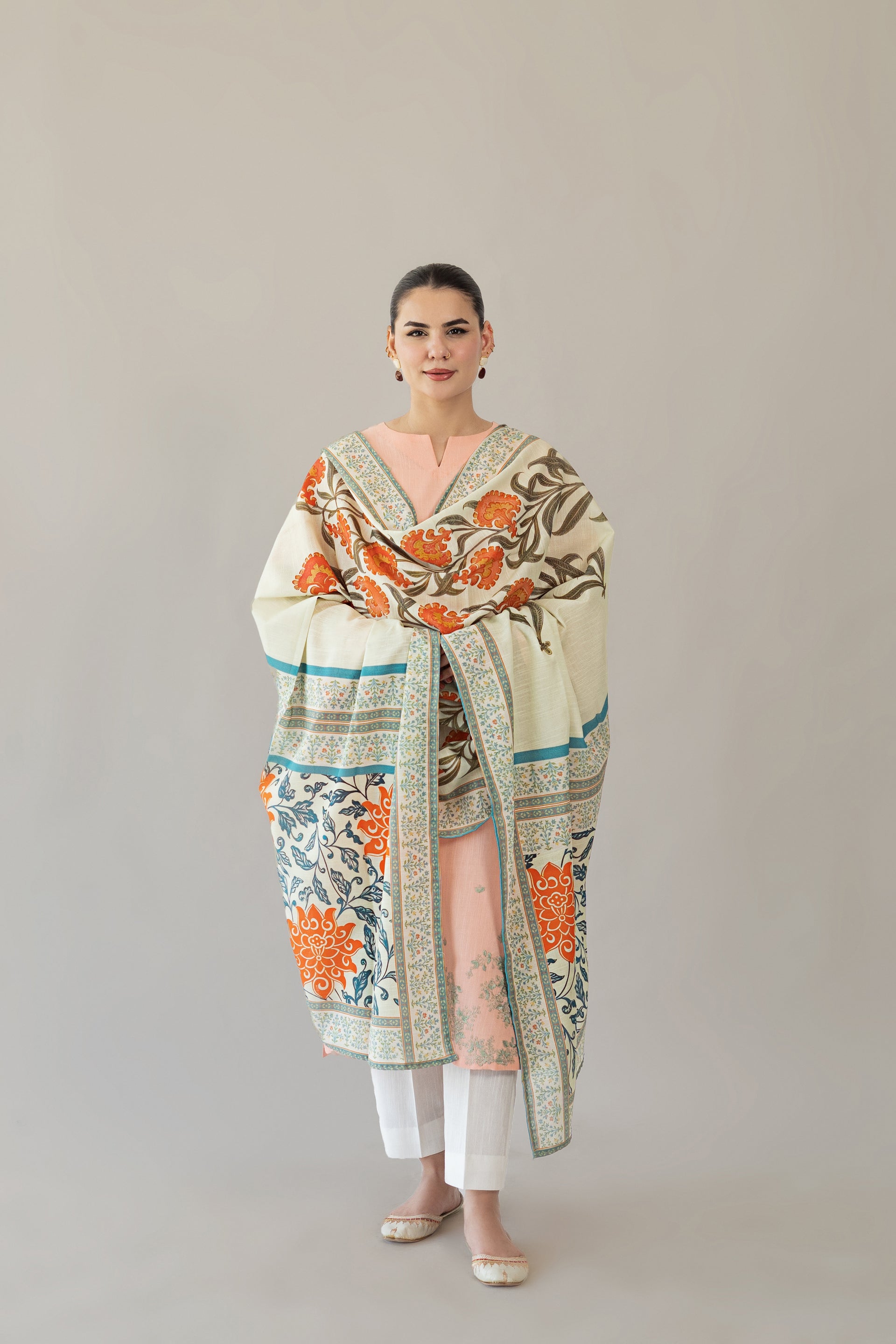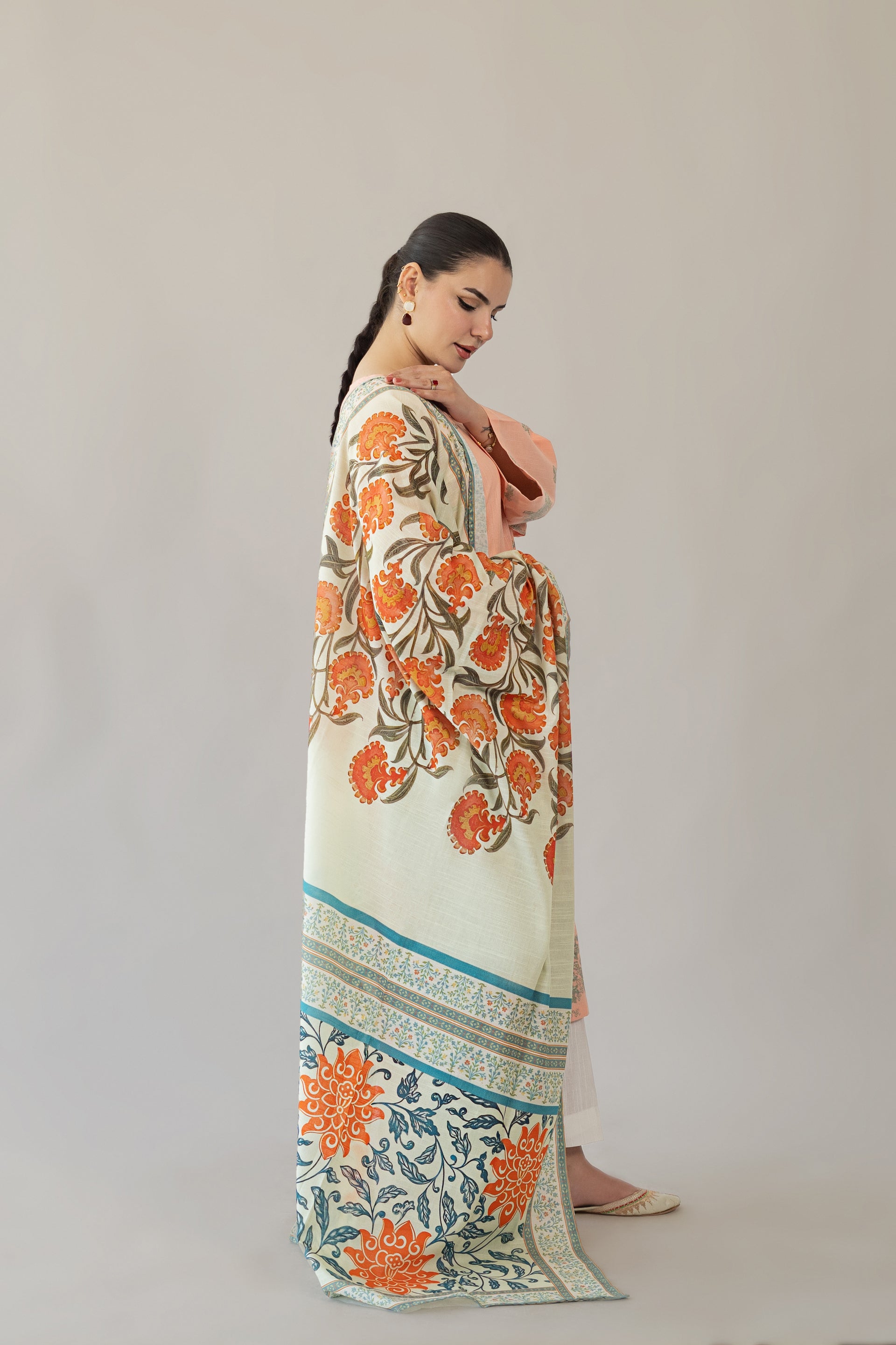 Elevate your wardrobe with this sophisticated 3-piece khaddar suit, designed for effortless elegance. The ensemble features a meticulously embroidered long shirt with detailed threadwork on the front and sleeves, paired with straight-cut contrasting trousers for a refined silhouette. Complete the look with the coordinating printed khaddar shawl. Crafted from premium khaddar fabric.