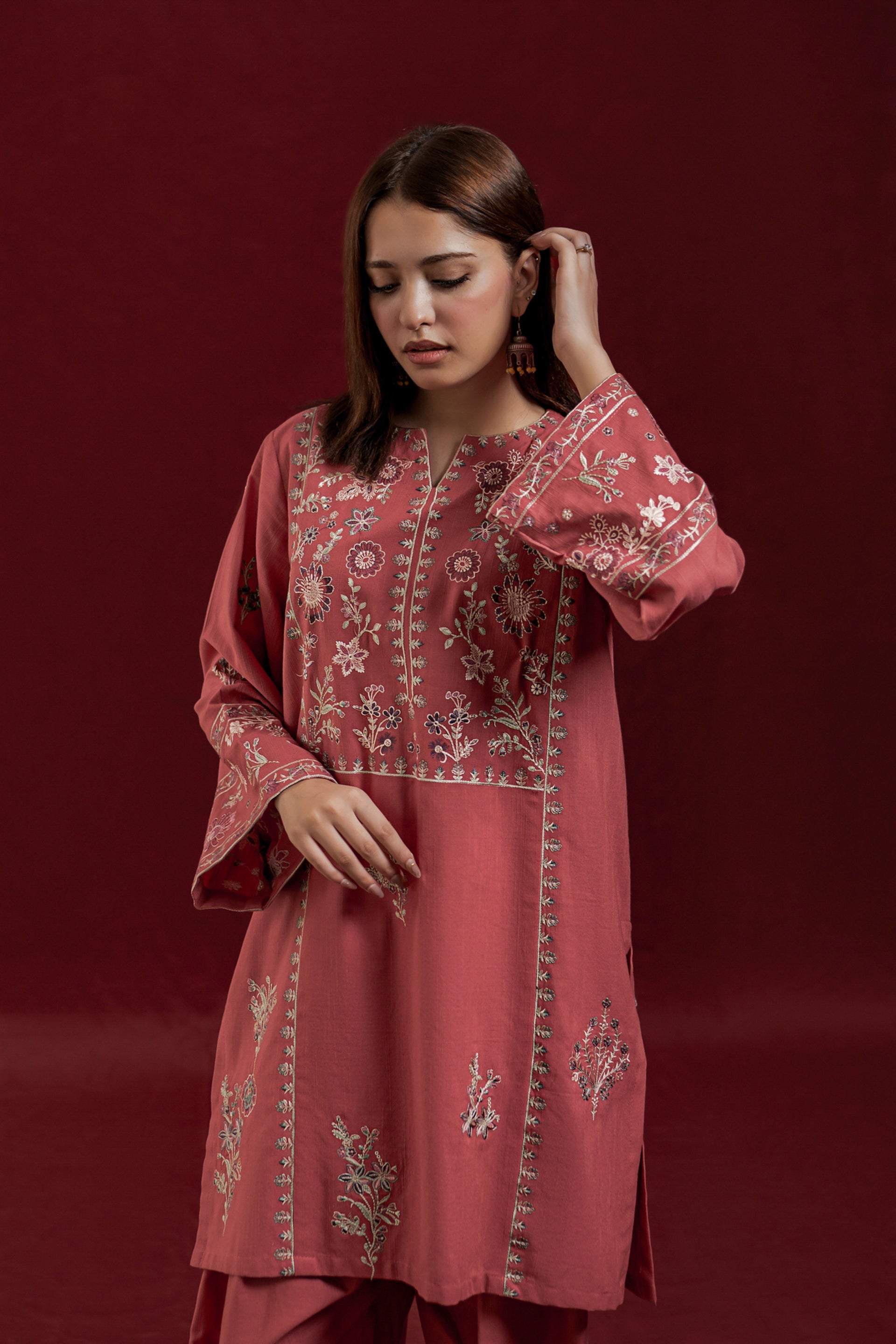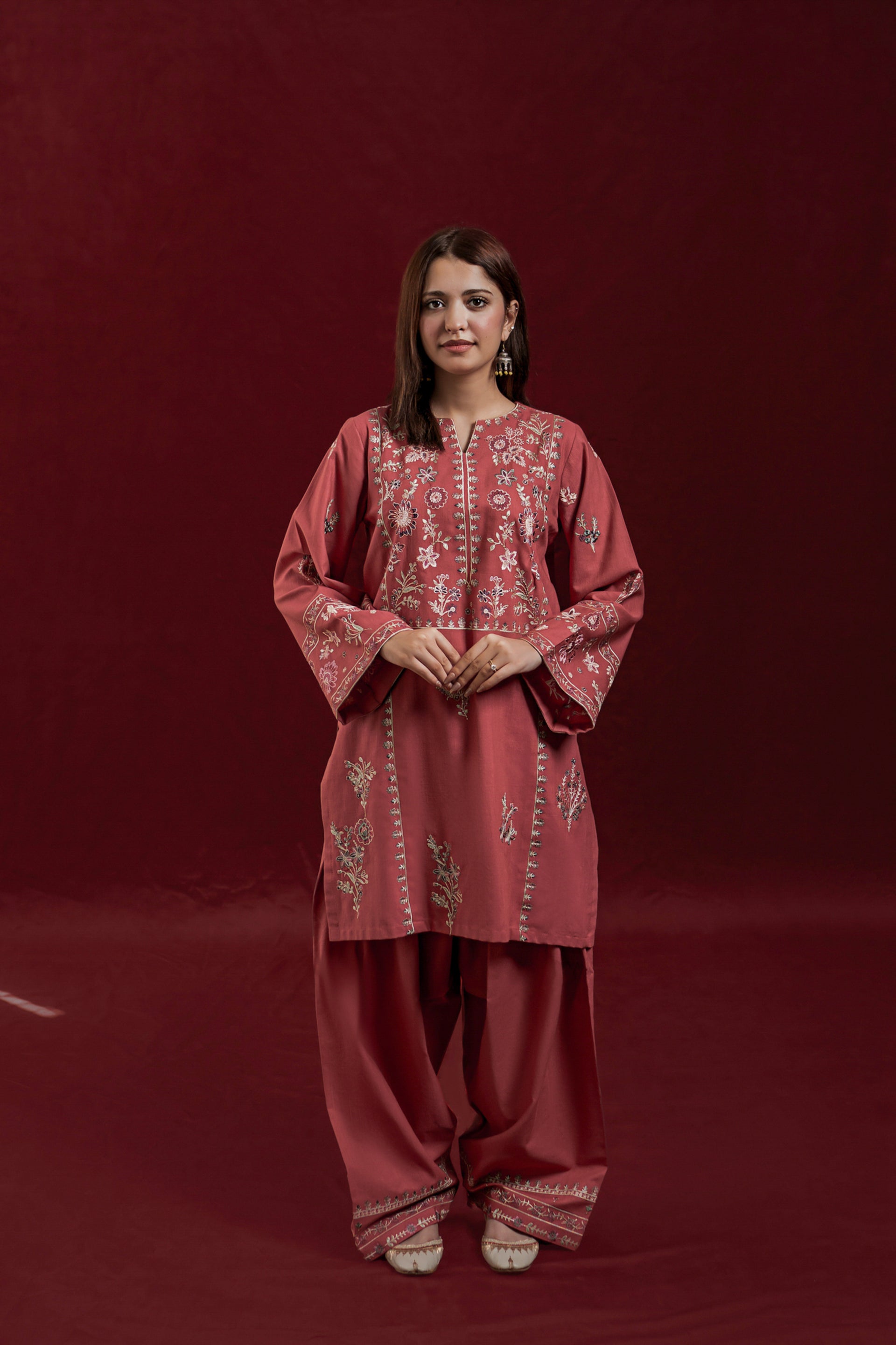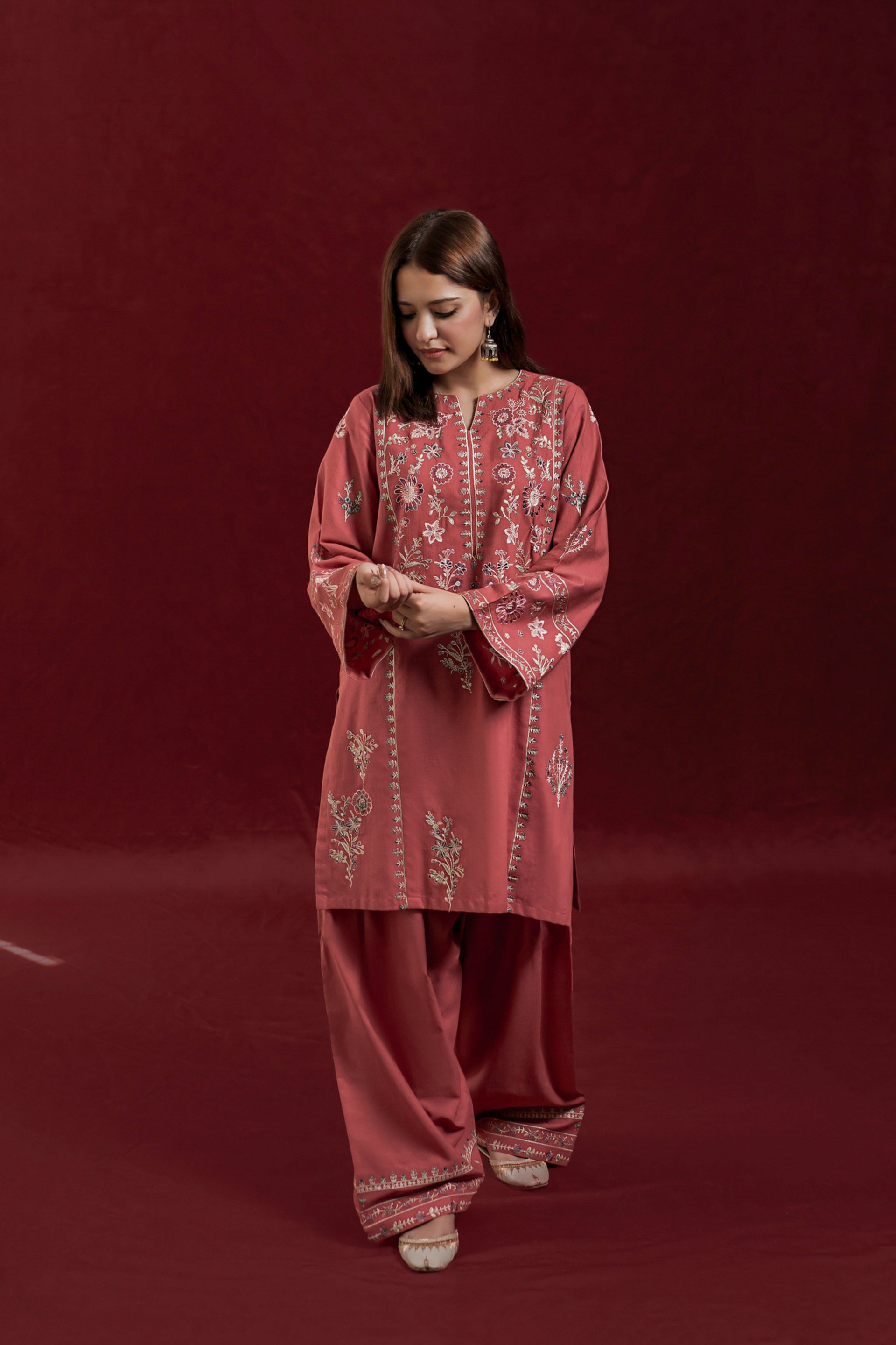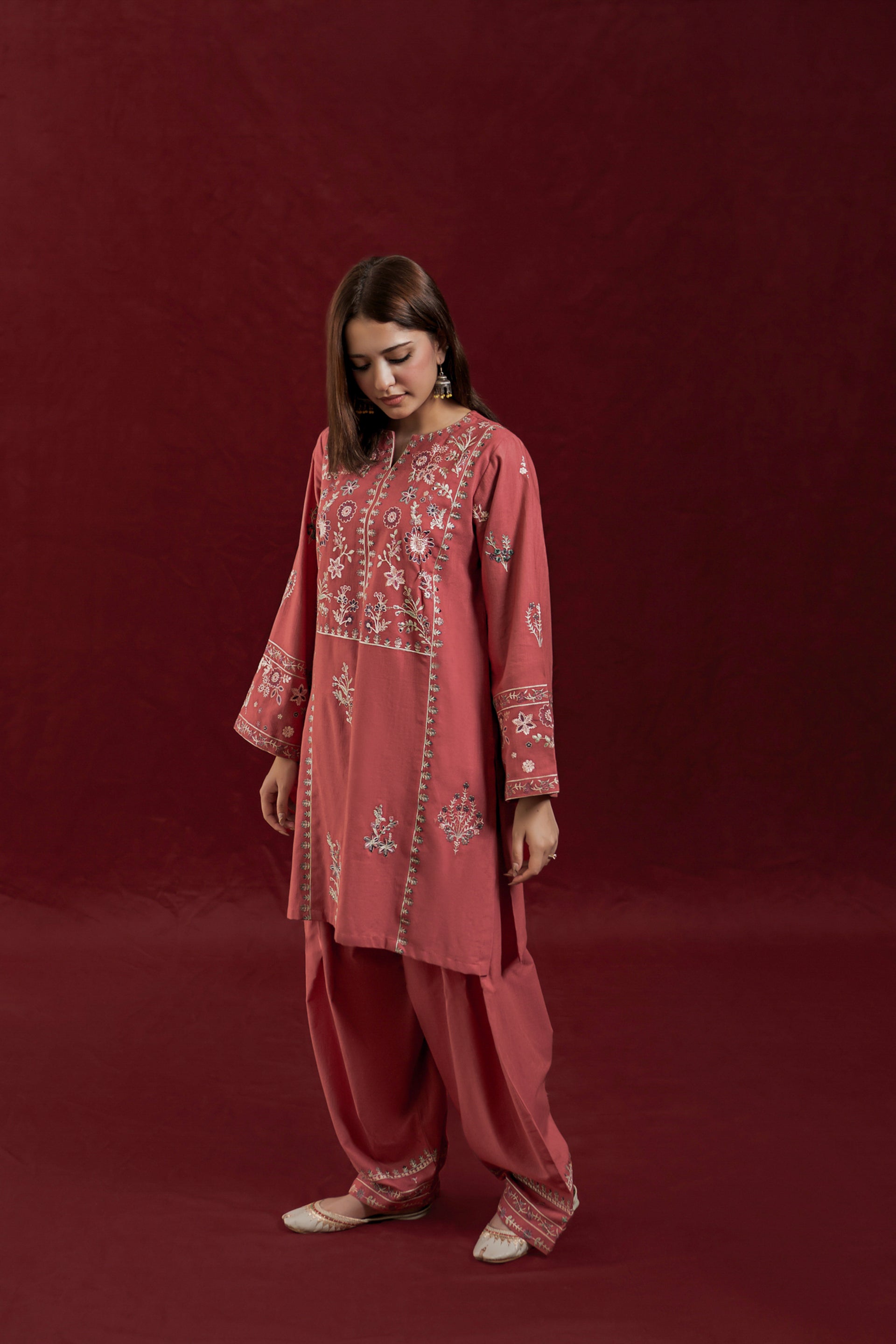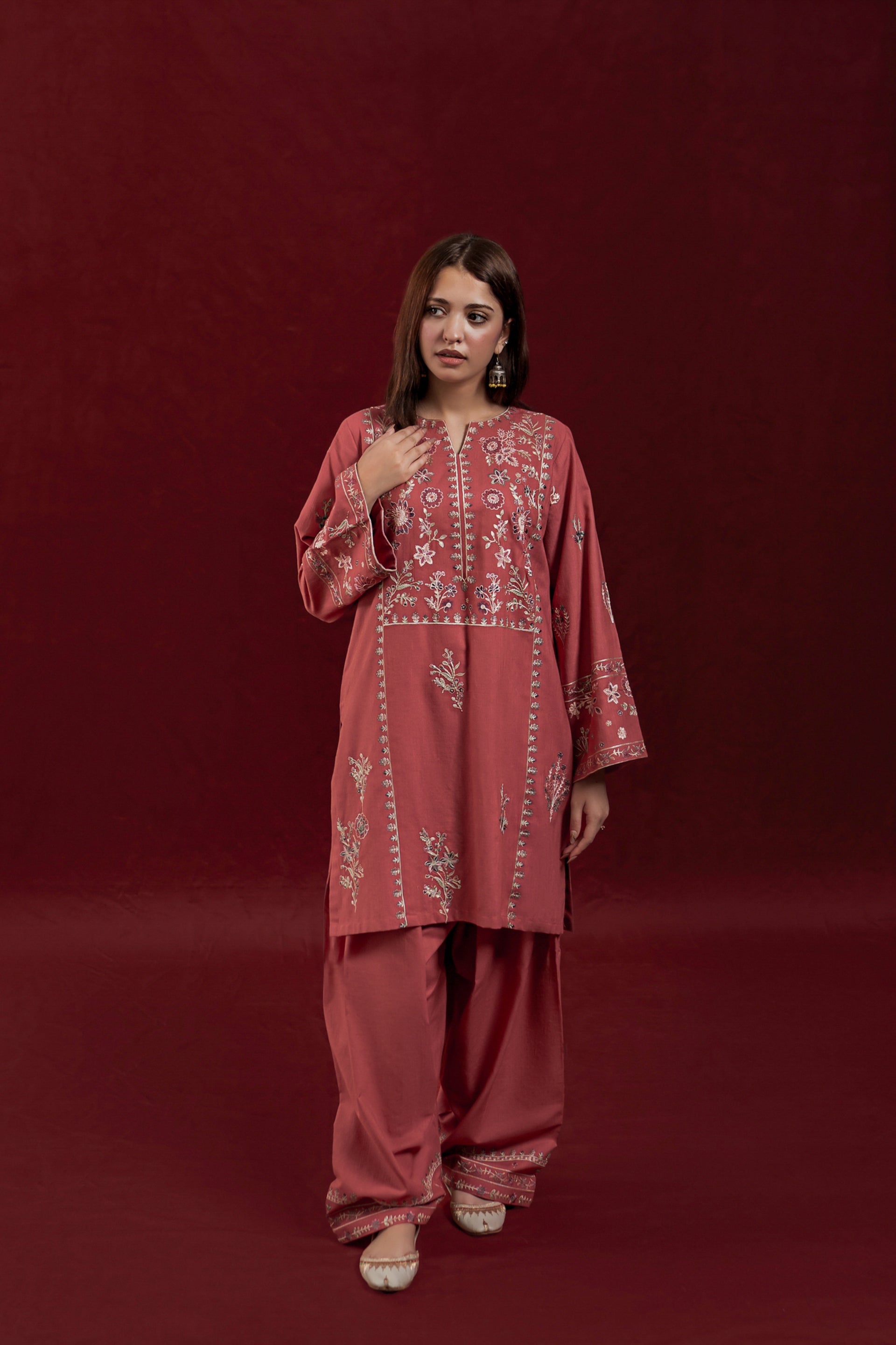 The GLIMMER ready-to-wear 2-piece Khaddar suit combines comfort with delicate craftsmanship. Featuring a short shirt adorned with exquisite floral embroidery along the neckline and side panels, it highlights loose long sleeves embroidered with elegant patterns. This set is complemented by an embroidered Farshi shalwar, adding a graceful and traditional touch to the ensemble. Ideal for those seeking a refined yet comfortable outfit with authentic detailing.