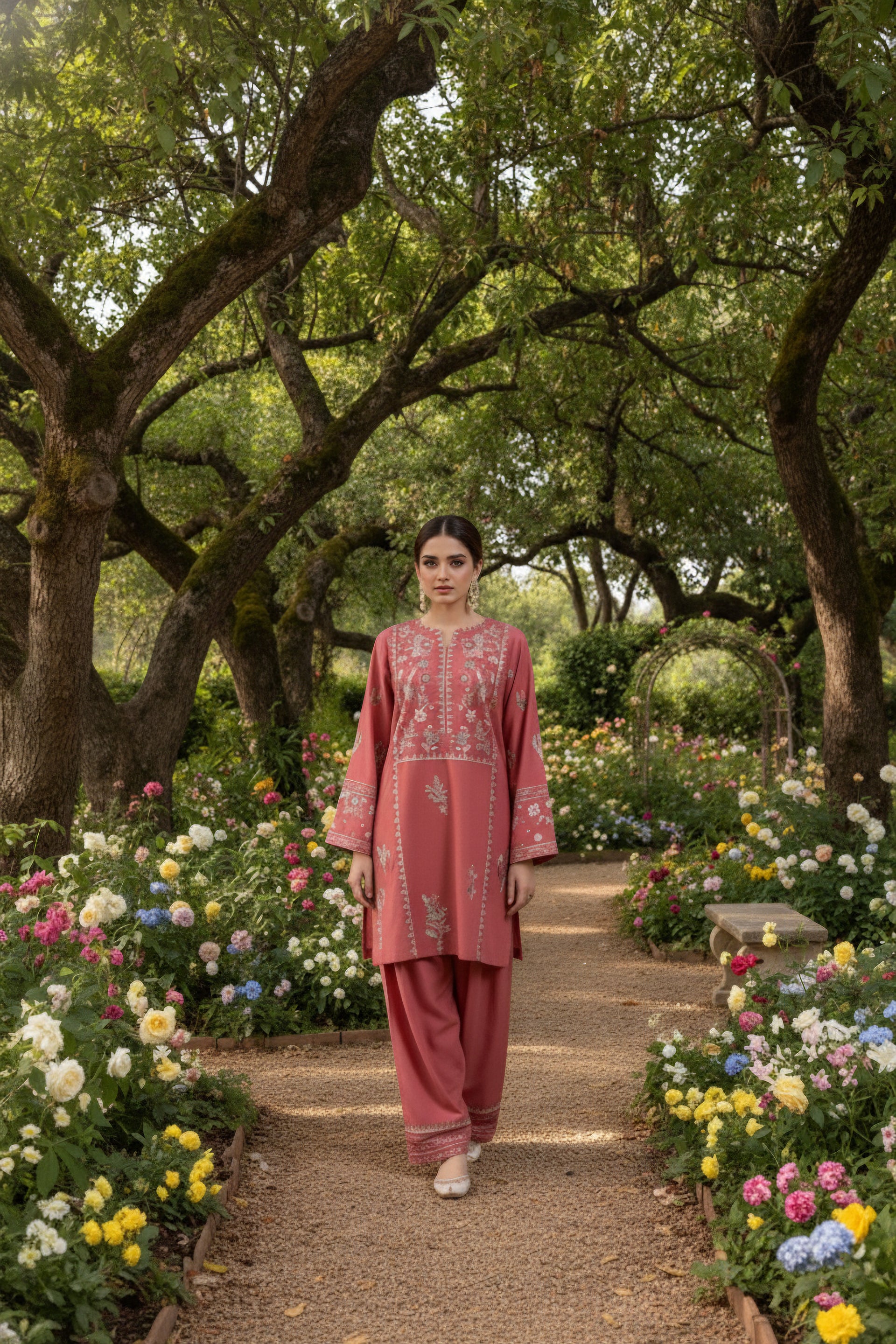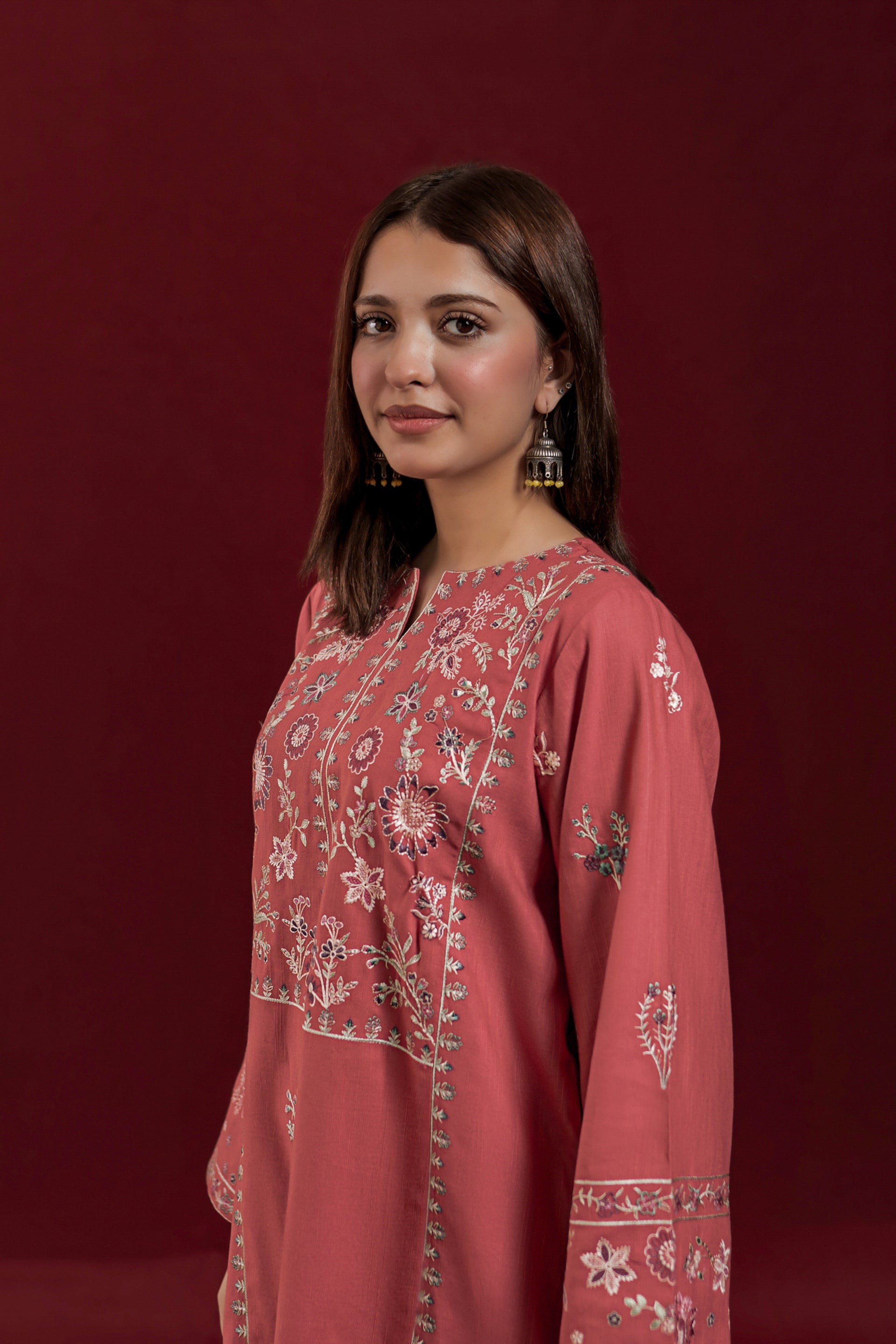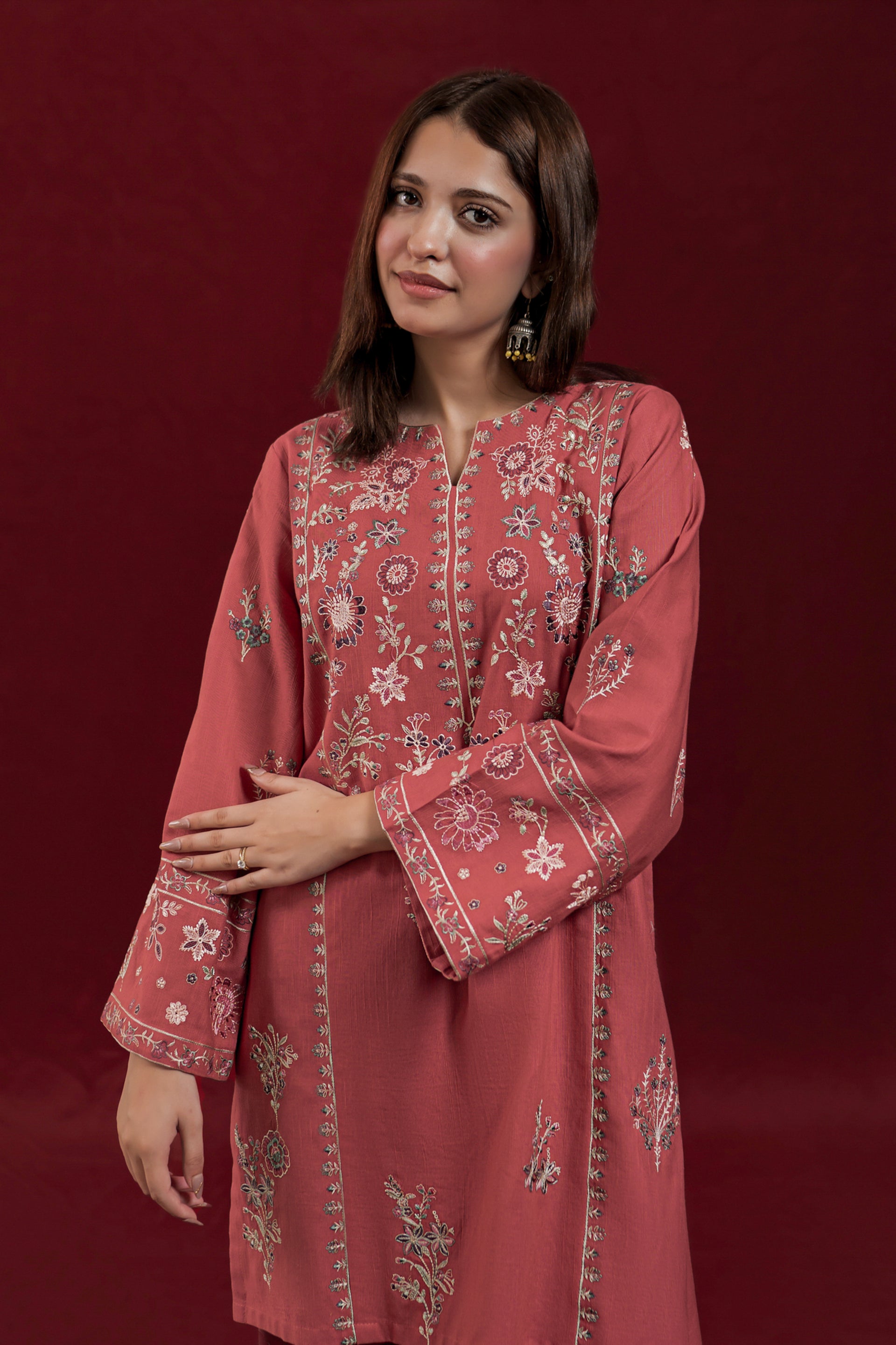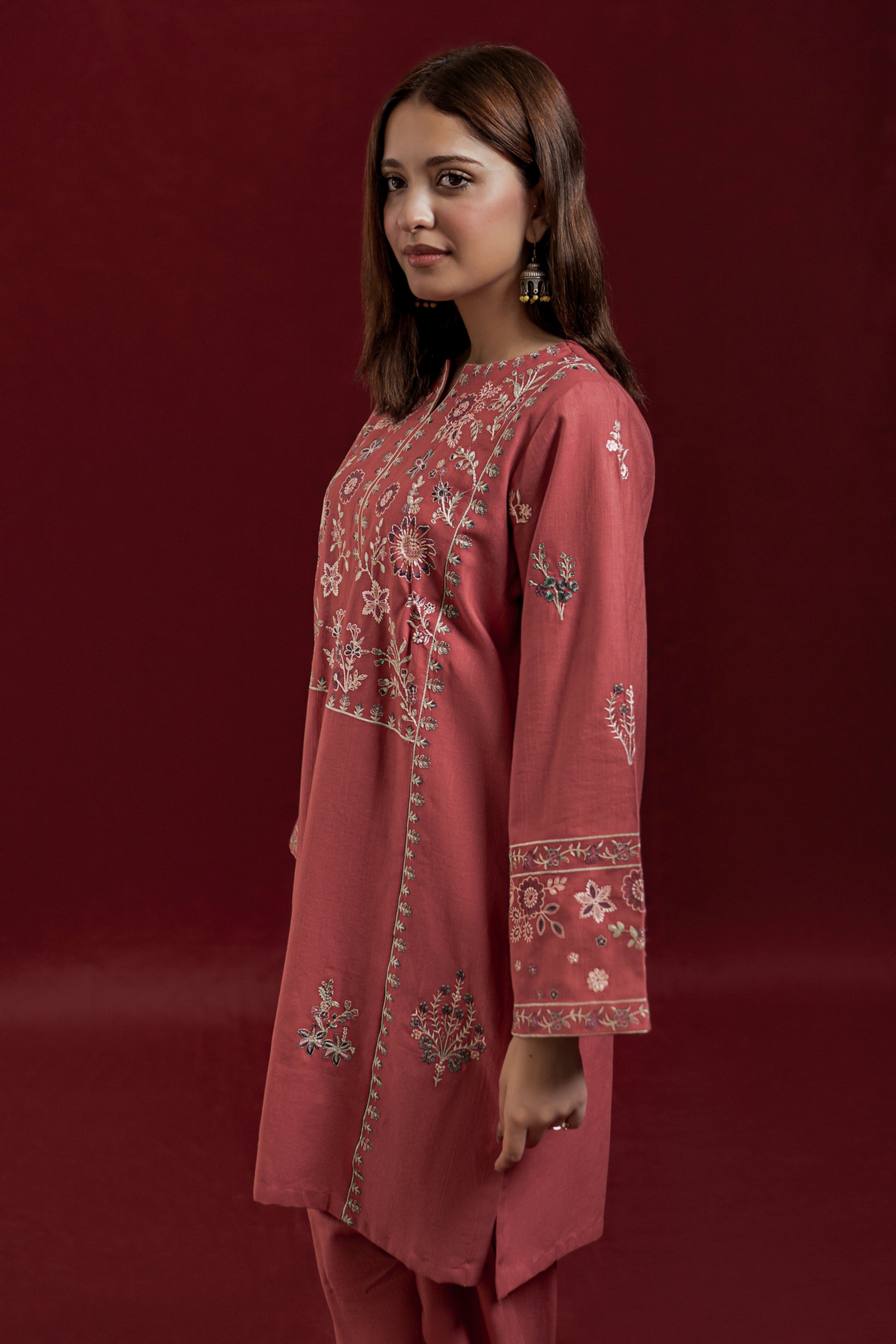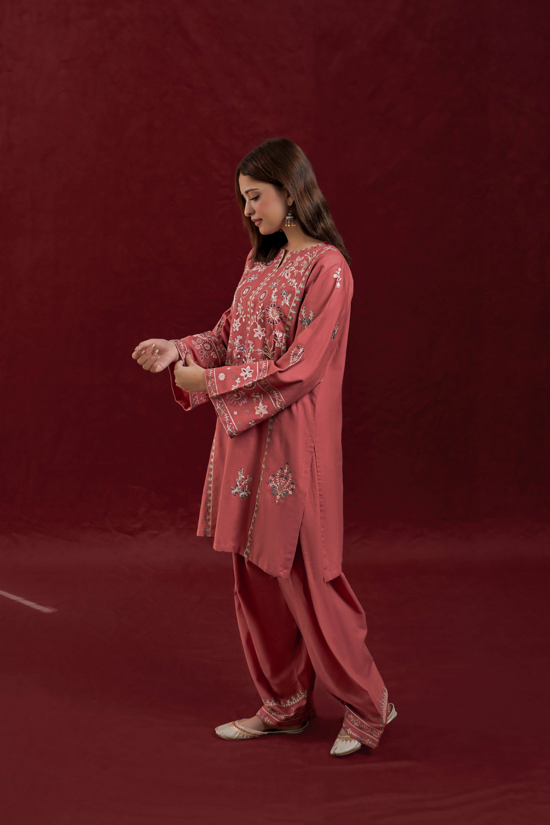 The GLIMMER ready-to-wear 2-piece Khaddar suit combines comfort with delicate craftsmanship. Featuring a short shirt adorned with exquisite floral embroidery along the neckline and side panels, it highlights loose long sleeves embroidered with elegant patterns. This set is complemented by an embroidered Farshi shalwar, adding a graceful and traditional touch to the ensemble. Ideal for those seeking a refined yet comfortable outfit with authentic detailing.