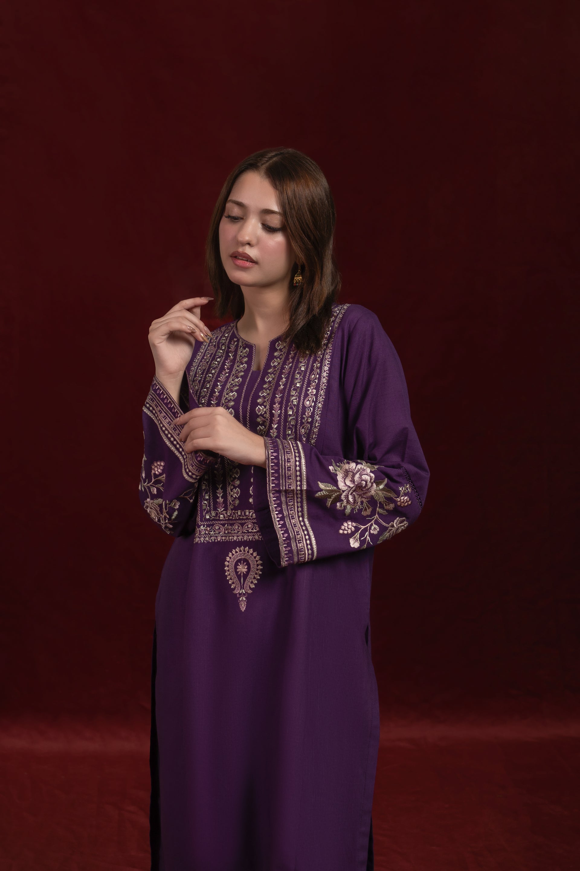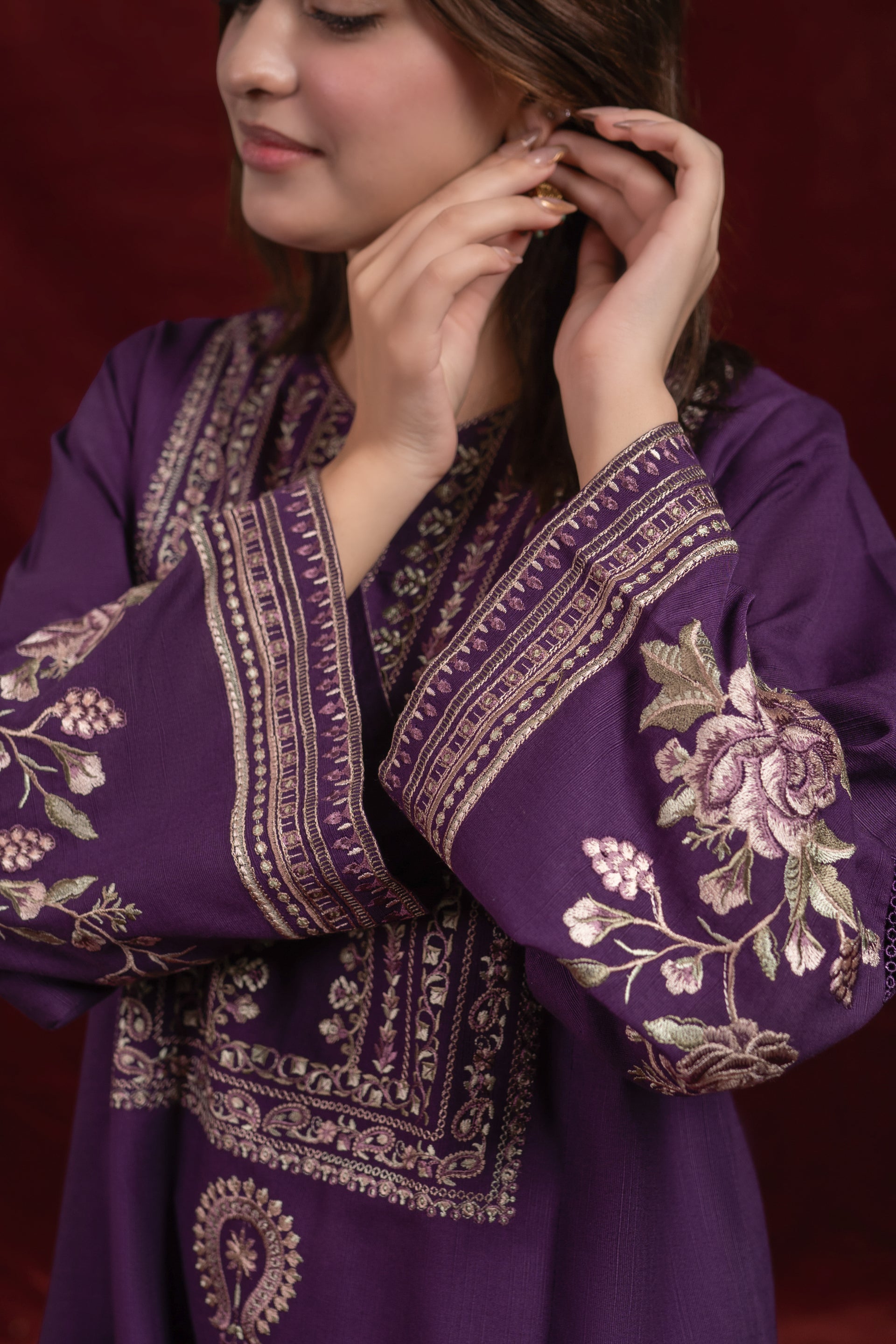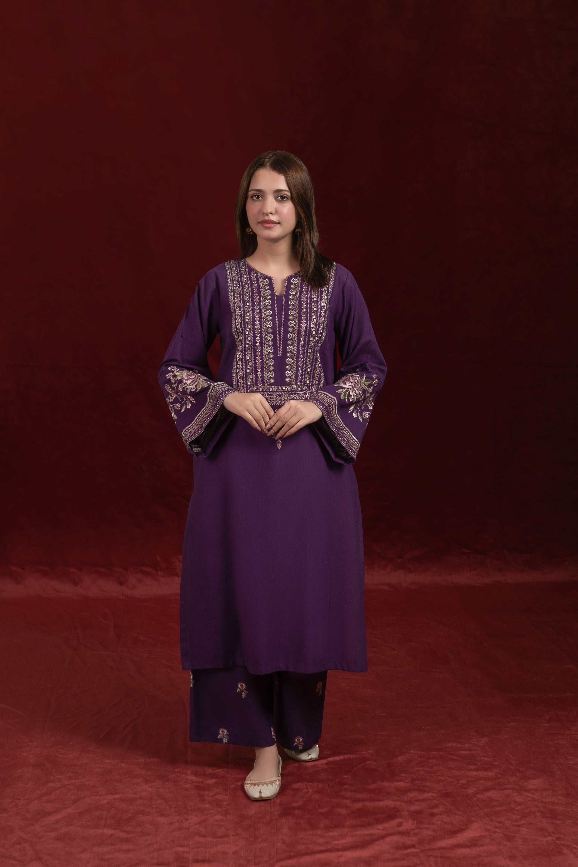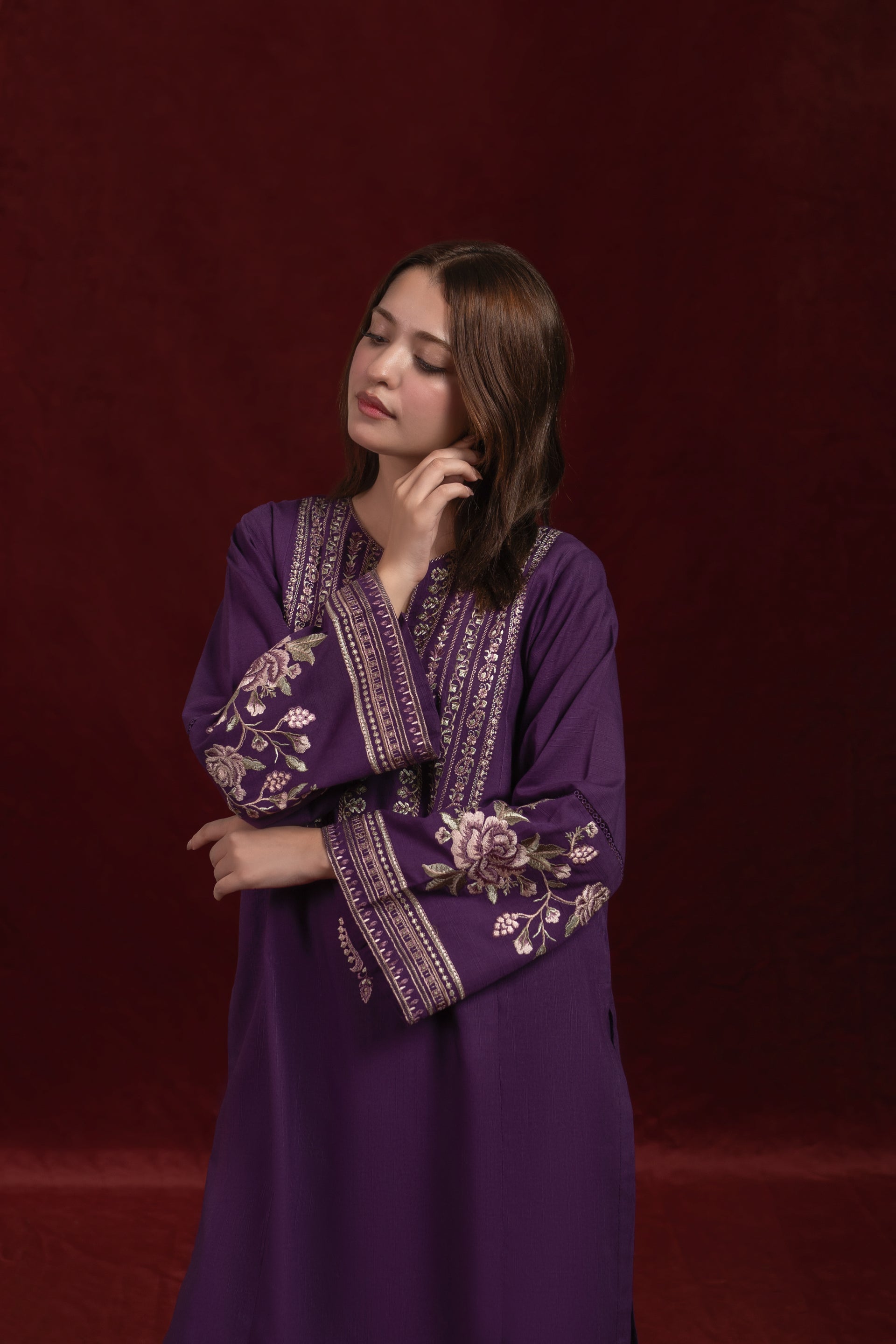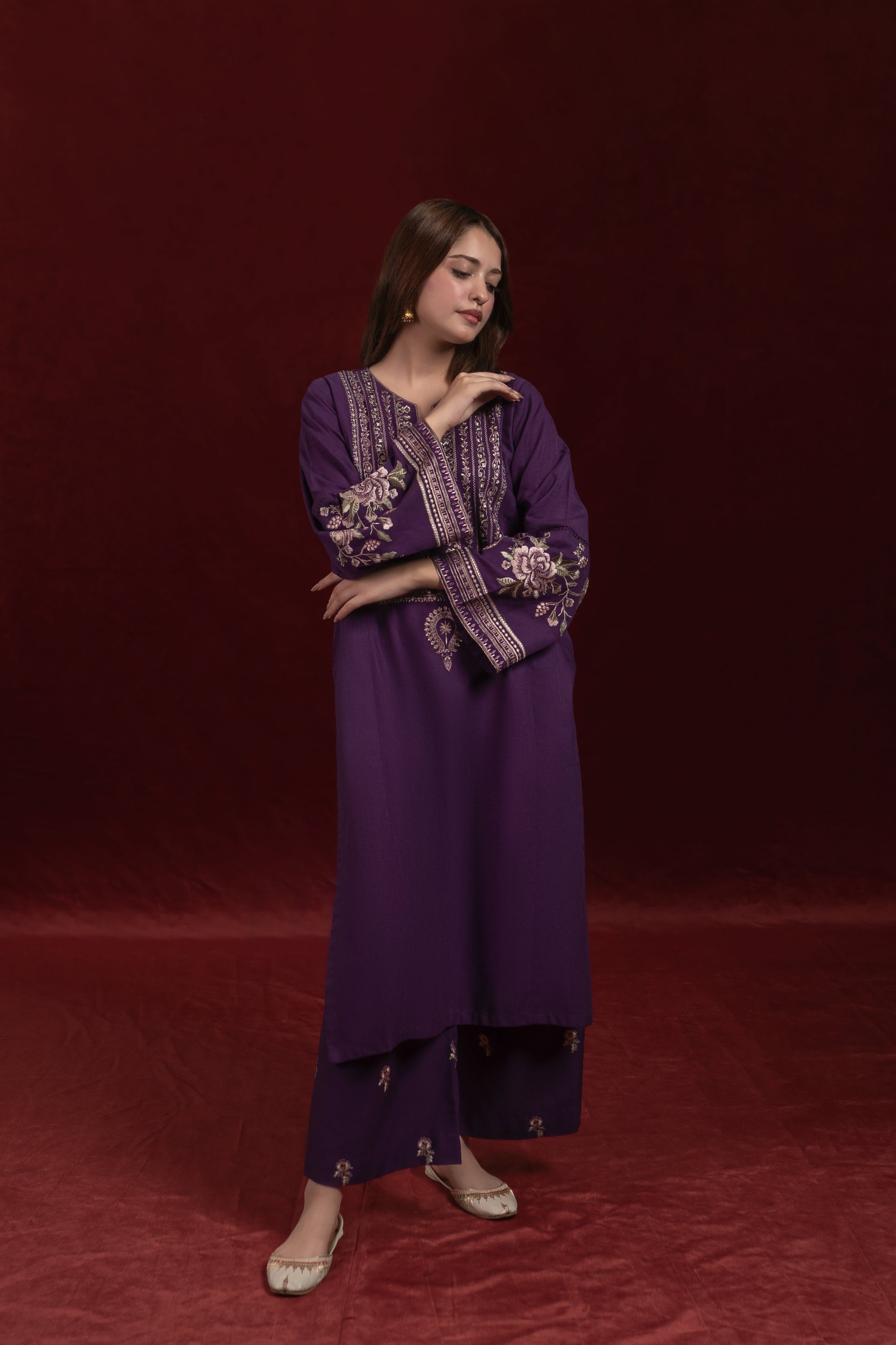 This ready-to-wear 2-piece Khaddar suit combines comfort with elegance. The long shirt features intricate embroidery along the neckline, enhanced by a delicate floral motif on the sleeves, showcasing expert craftsmanship. Paired with loose embroidered trousers, this ensemble offers both style and ease, perfect for sophisticated yet comfortable daily wear.