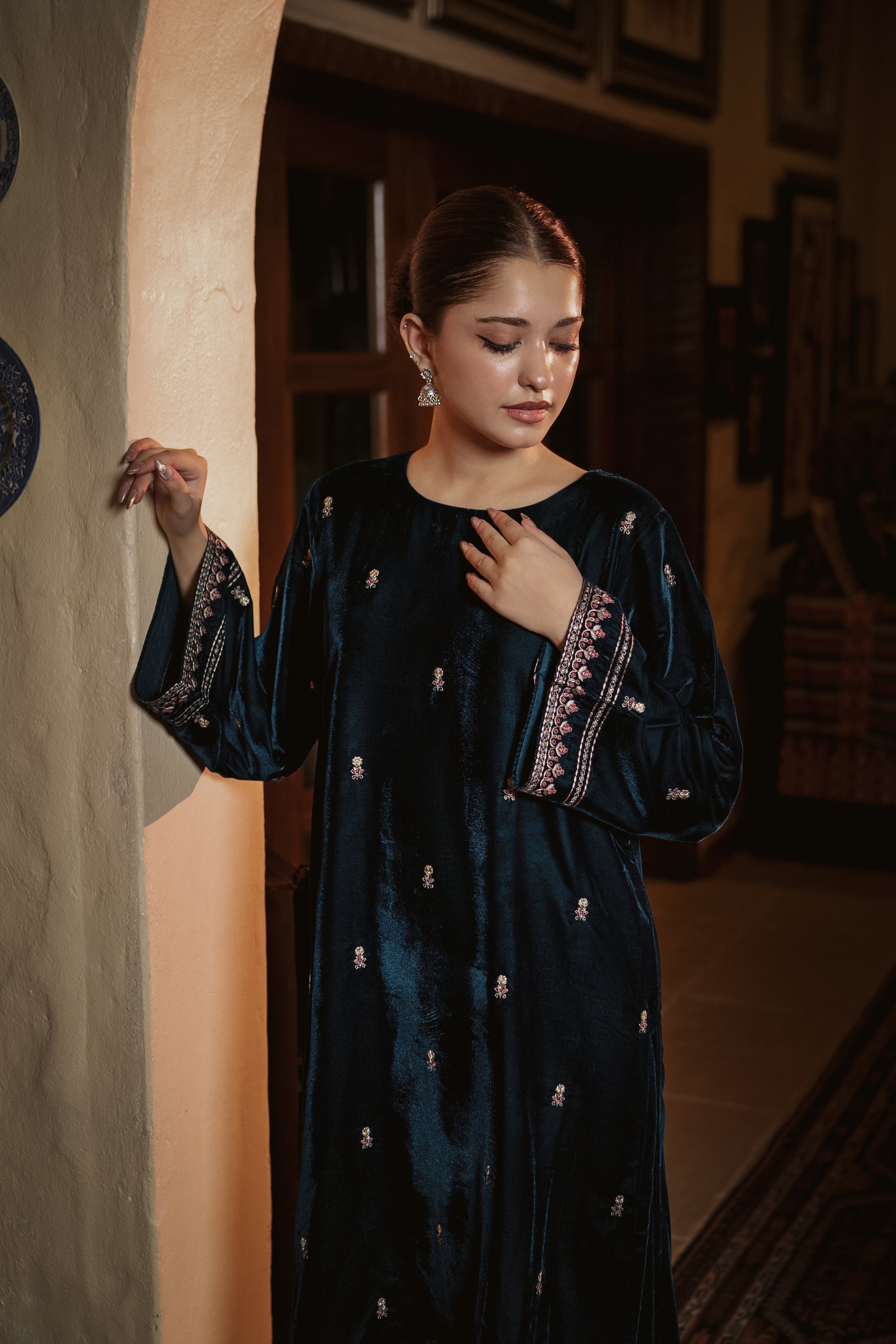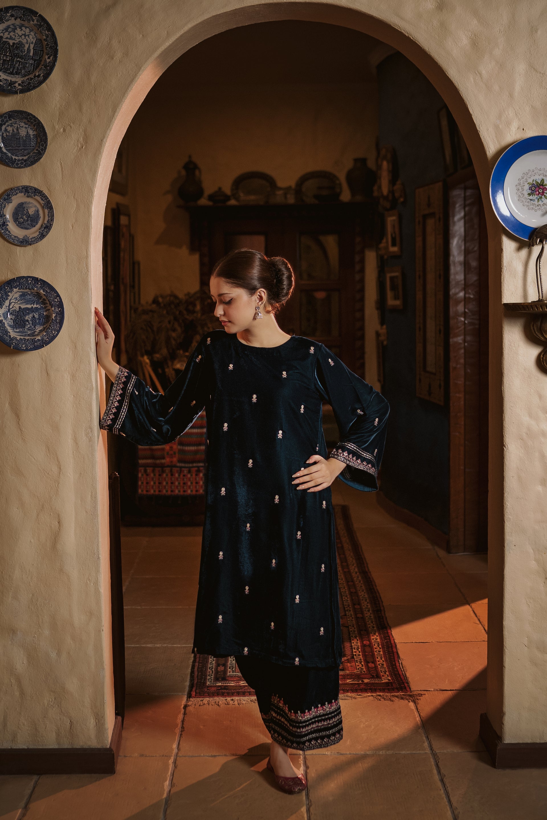 The IZZAH ready-to-wear 2-piece velvet suit features a long shirt adorned with intricate embroidery motifs on the front and beautifully embroidered loose sleeves. Paired with loose embroidered trousers, this ensemble offers a harmonious blend of detailed artistry and comfortable fit, ideal for sophisticated occasions.
