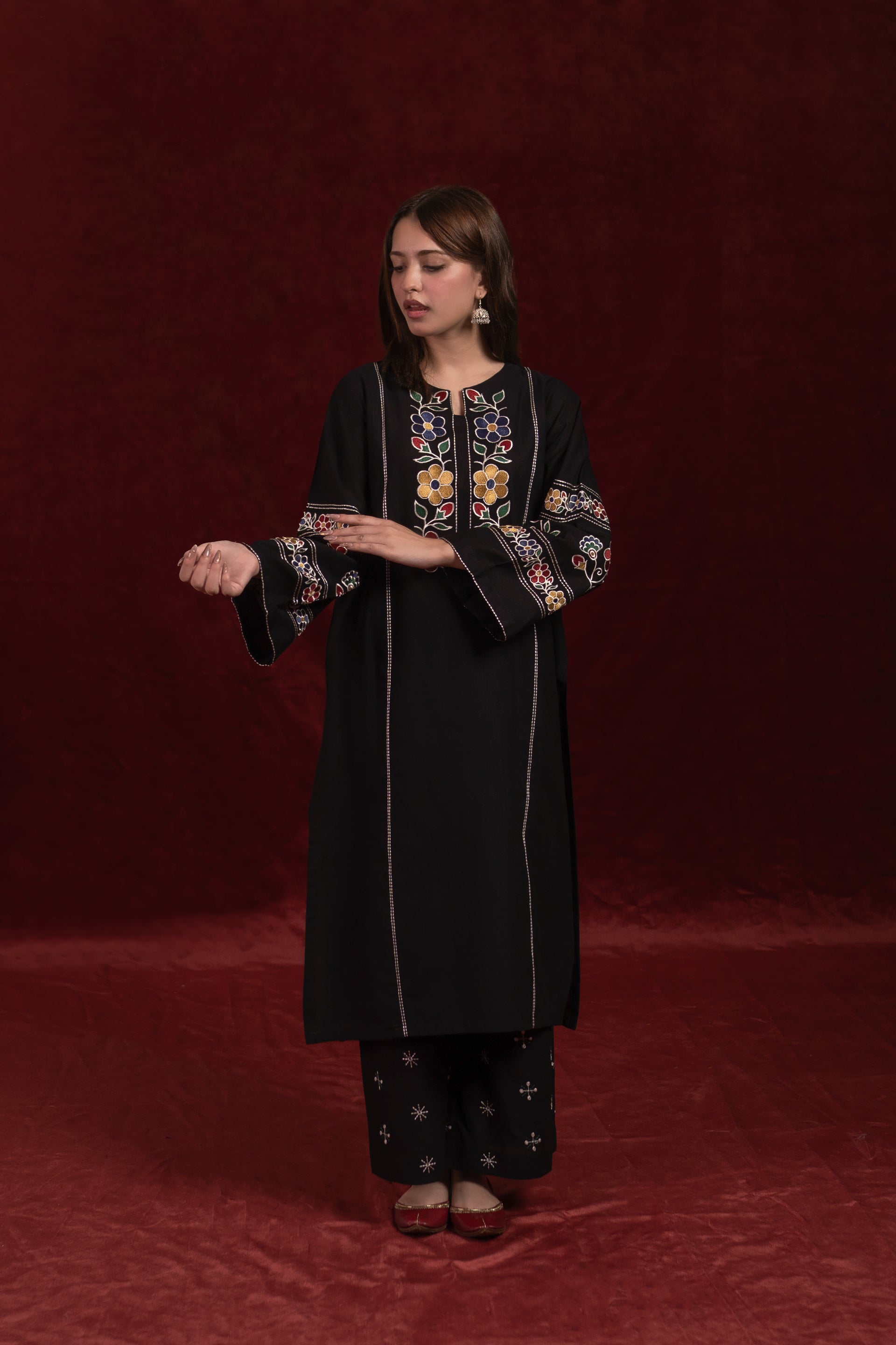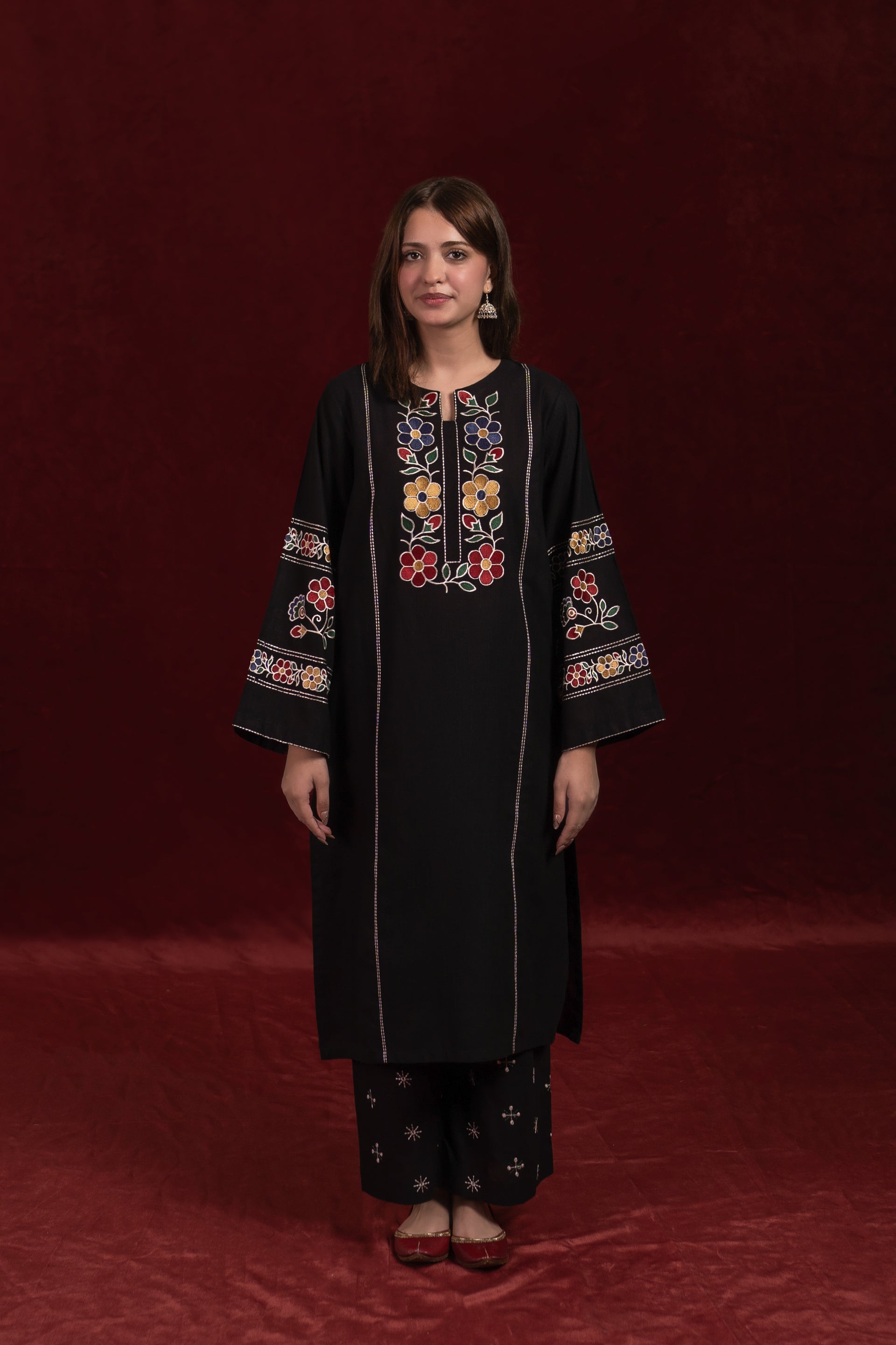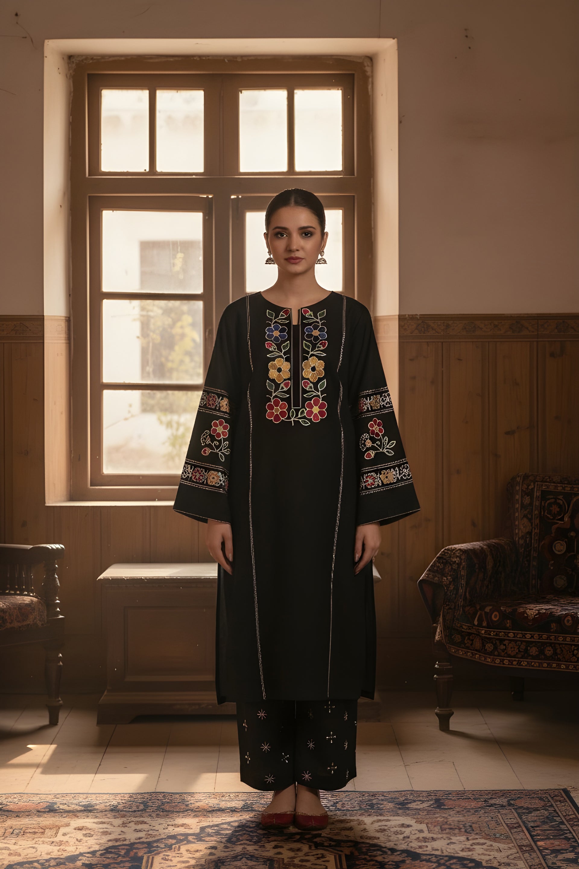 The LEORA 2-piece embroidered khaddar suit features a long shirt adorned with bold embroidery motifs on the neckline and sleeves, exuding refined craftsmanship. Paired with loose embroidered trousers, this ensemble offers both comfort and elegance, ideal for stylish, seasonally appropriate wear. The rich khaddar fabric ensures warmth without compromising on sophistication.