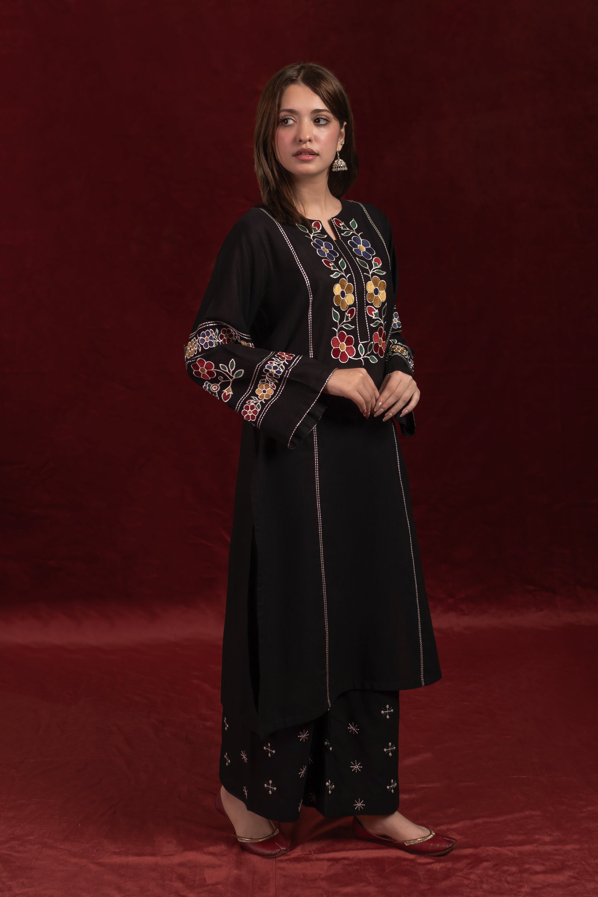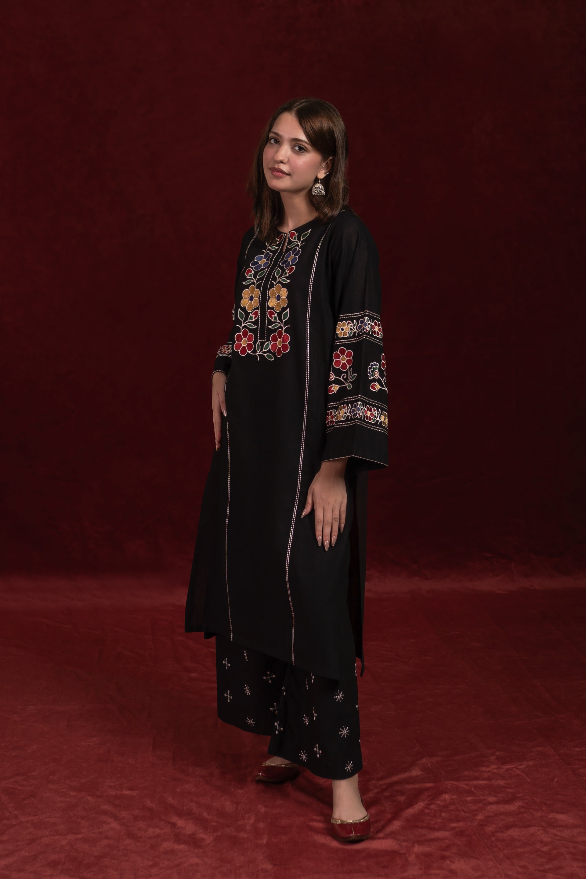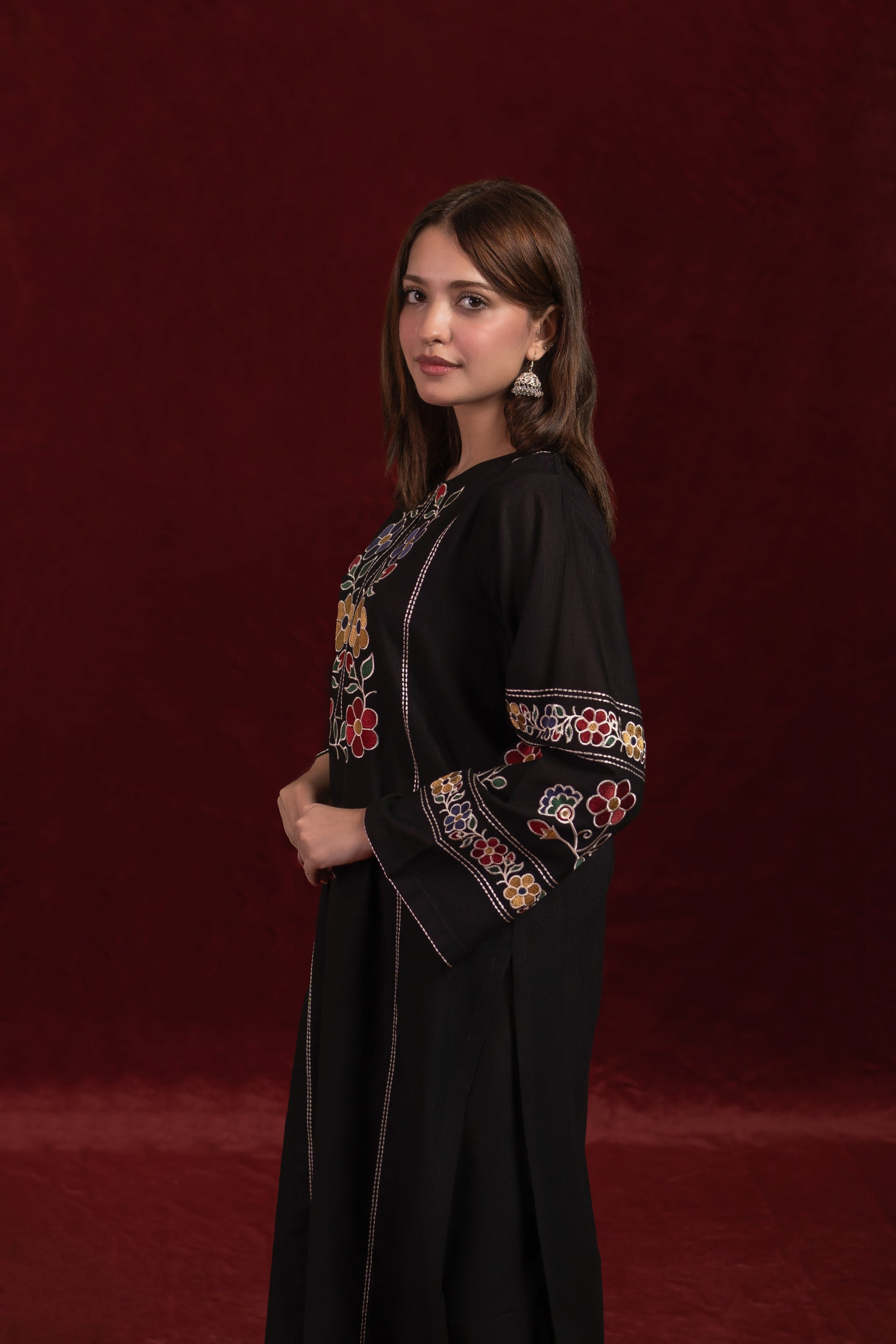 The LEORA 2-piece embroidered khaddar suit features a long shirt adorned with bold embroidery motifs on the neckline and sleeves, exuding refined craftsmanship. Paired with loose embroidered trousers, this ensemble offers both comfort and elegance, ideal for stylish, seasonally appropriate wear. The rich khaddar fabric ensures warmth without compromising on sophistication.