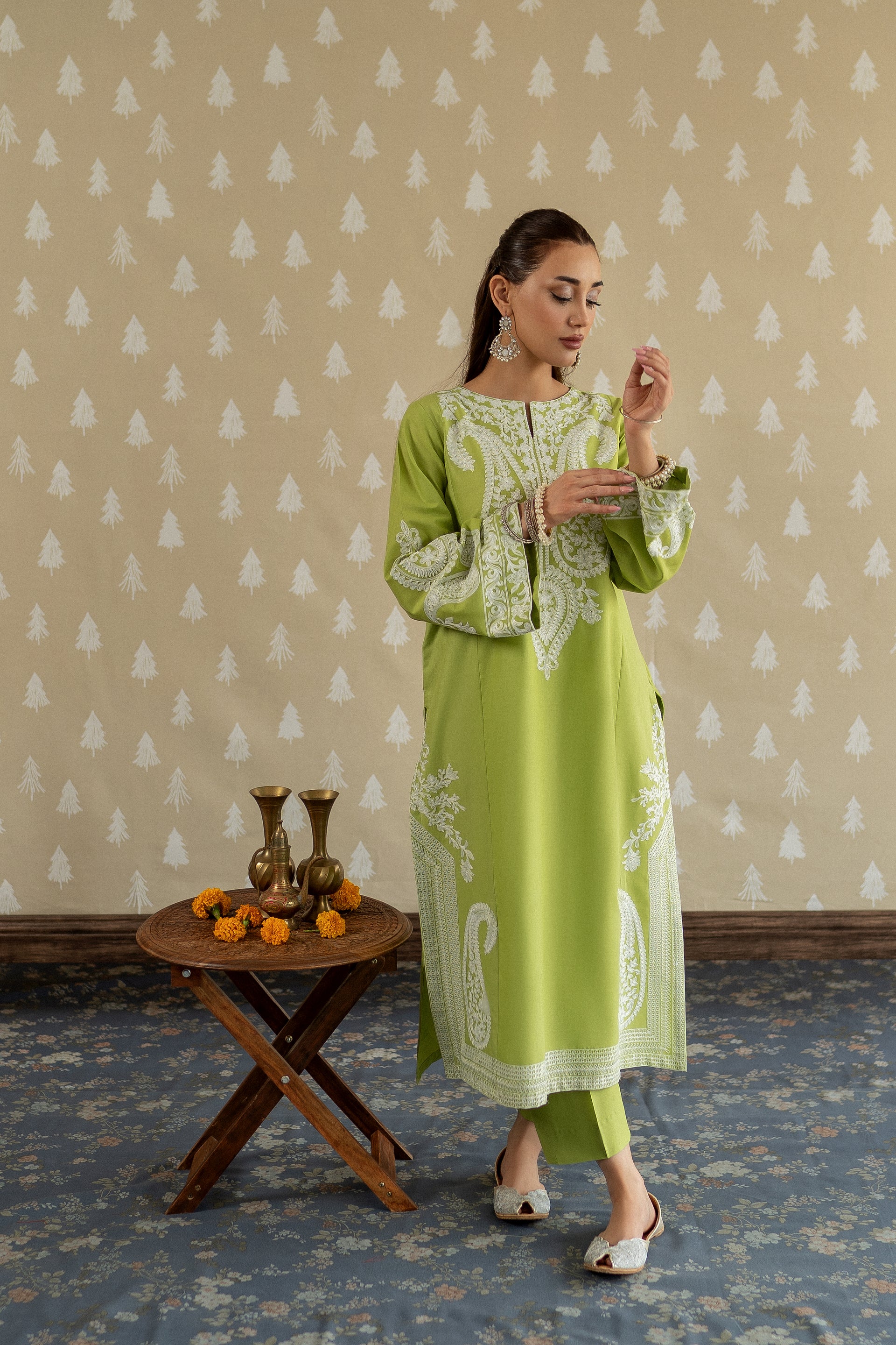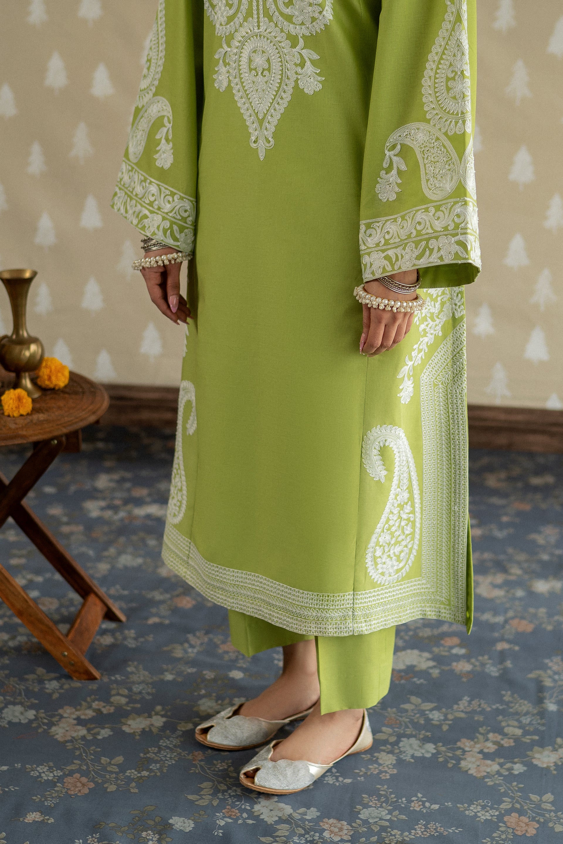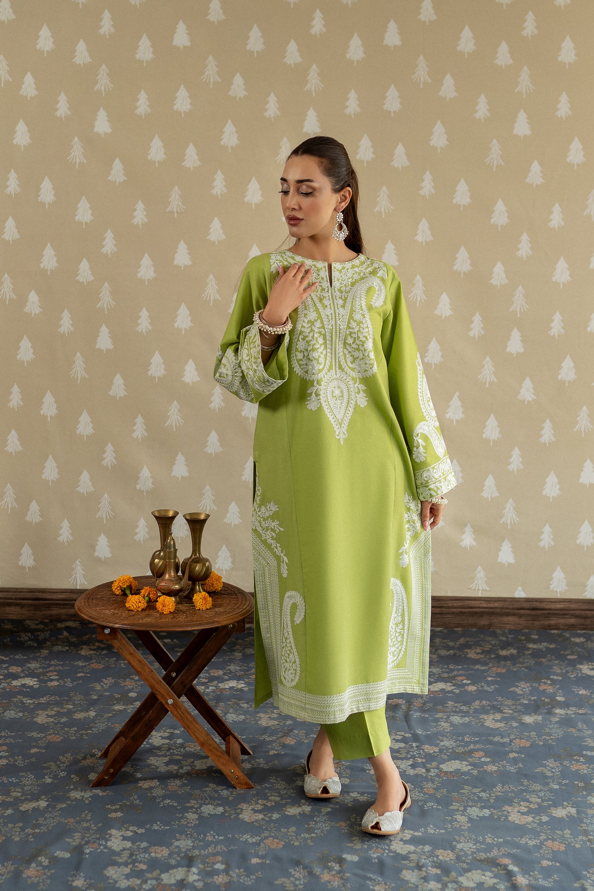 Introducing MAPLE, a sophisticated ready-to-wear 2-piece lawn suit designed for the modern woman. This ensemble features a gracefully tailored long shirt adorned with intricate aari embroidery work along the neckline and hemline, complemented by bold embroidered motifs on the loose sleeves for added dimension. Paired with perfectly fitted straight trousers, this piece effortlessly transitions from casual gatherings to semi-formal occasions.