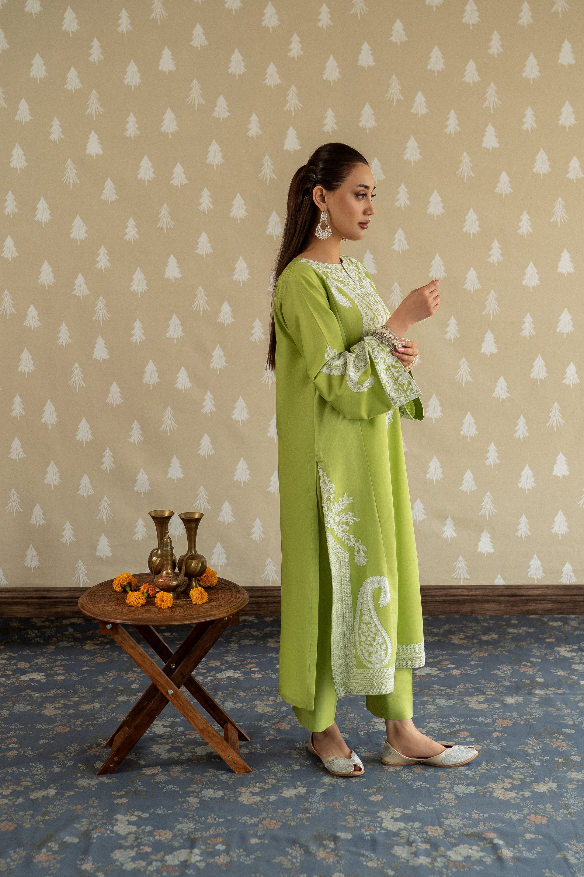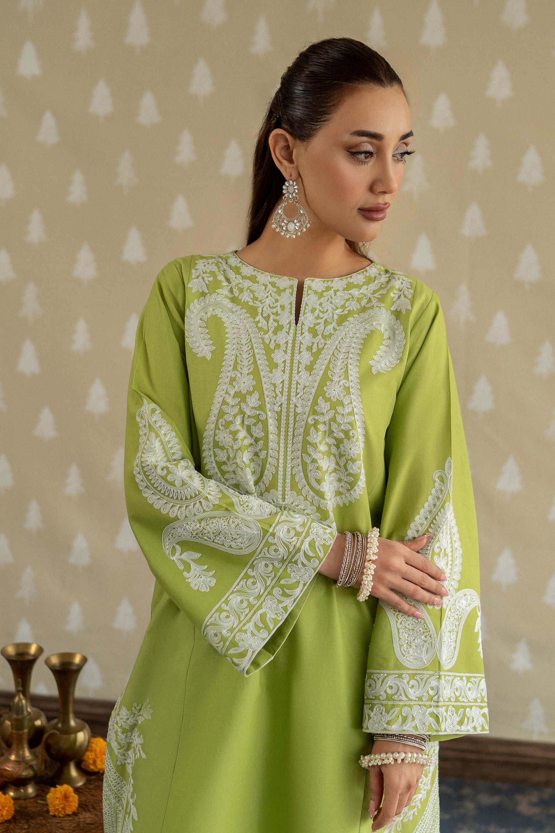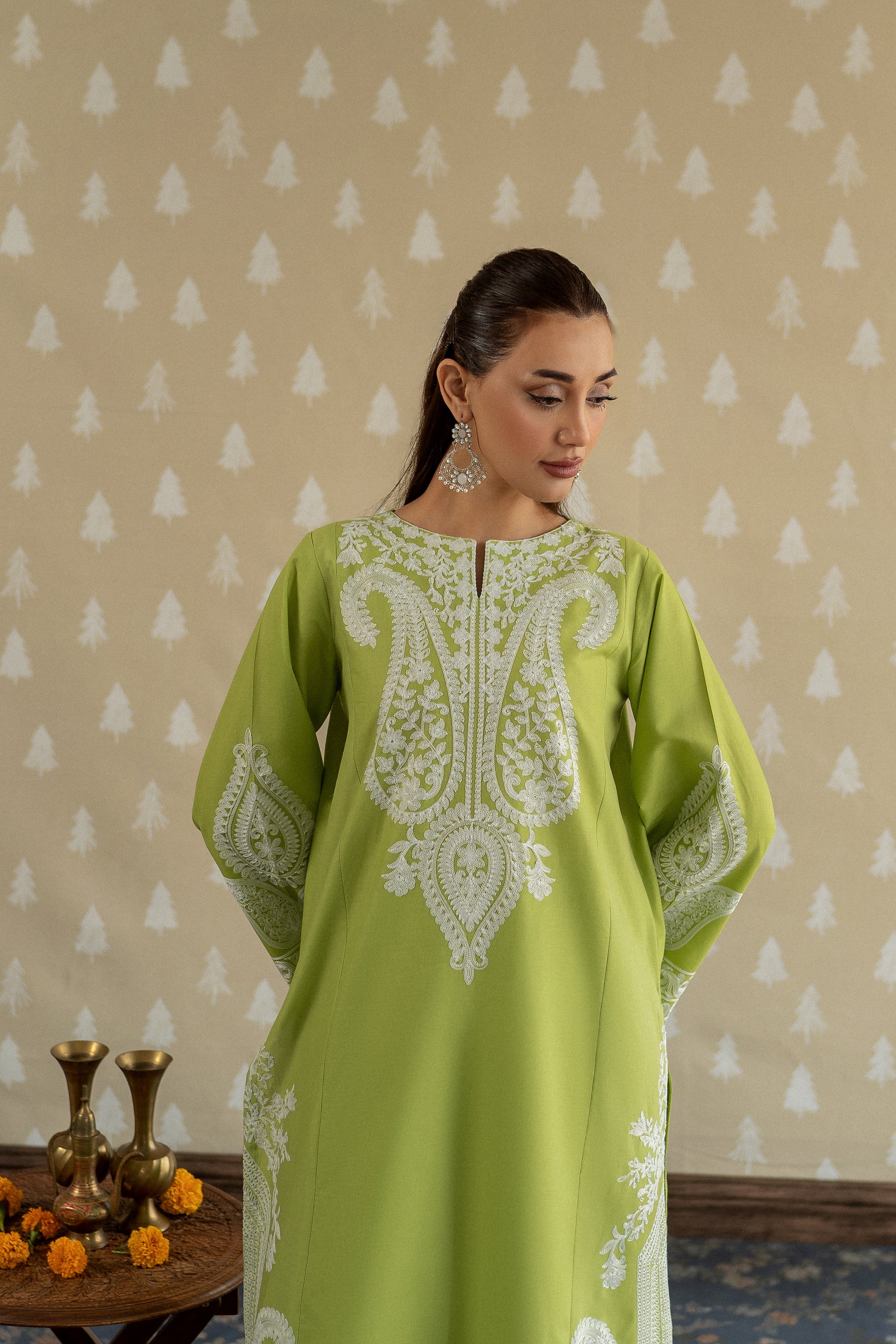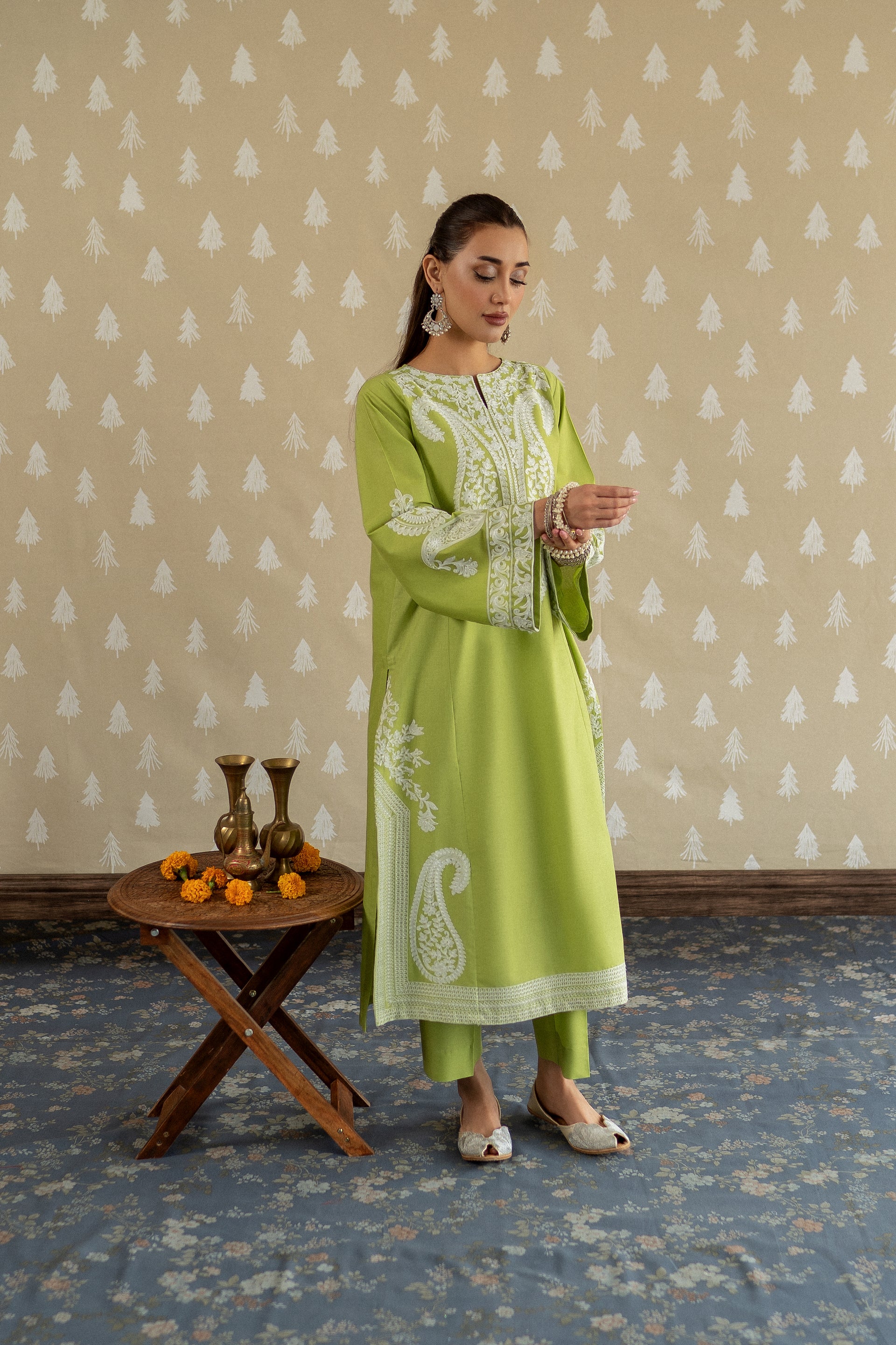 Introducing MAPLE, a sophisticated ready-to-wear 2-piece lawn suit designed for the modern woman. This ensemble features a gracefully tailored long shirt adorned with intricate aari embroidery work along the neckline and hemline, complemented by bold embroidered motifs on the loose sleeves for added dimension. Paired with perfectly fitted straight trousers, this piece effortlessly transitions from casual gatherings to semi-formal occasions.