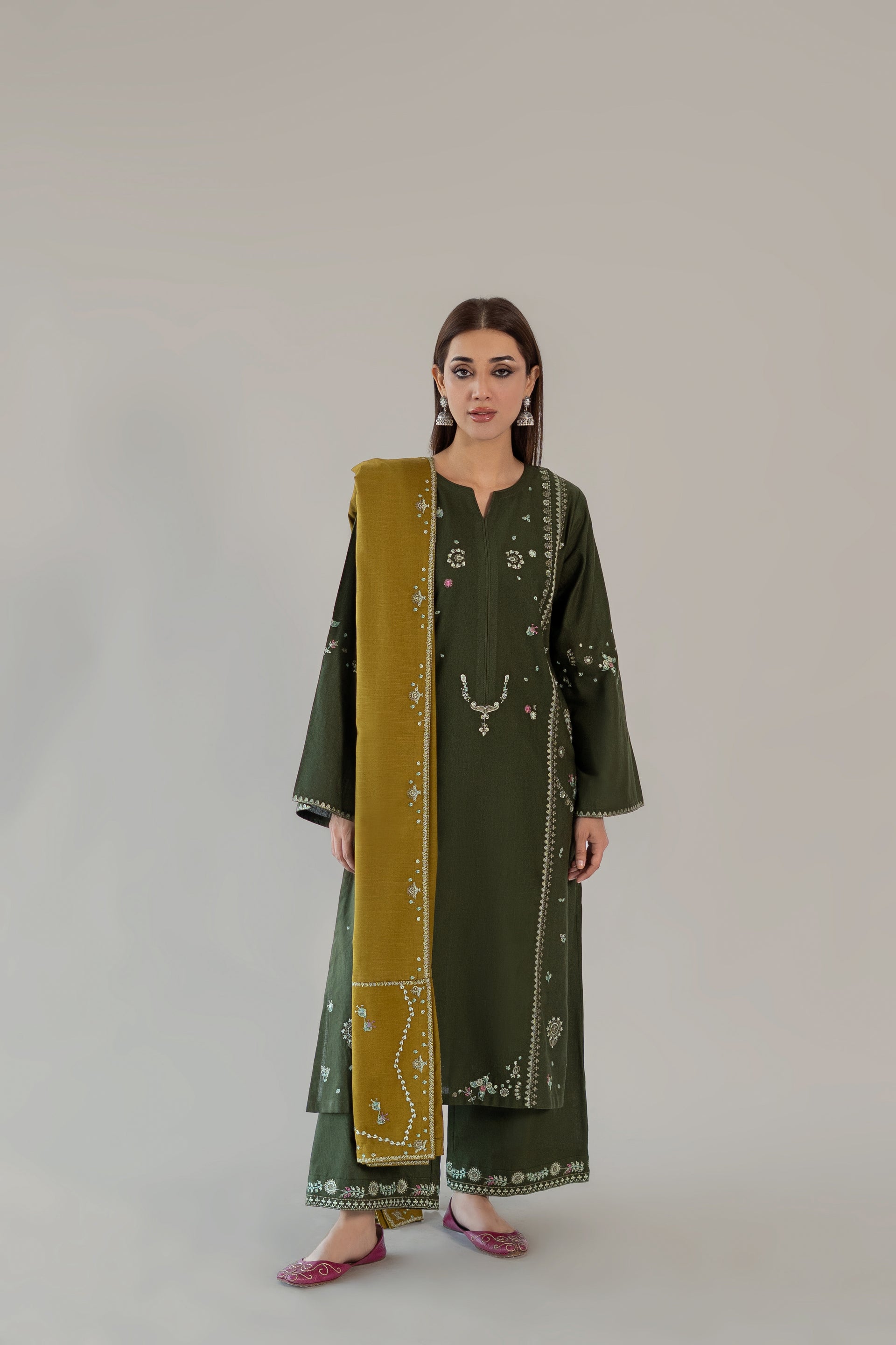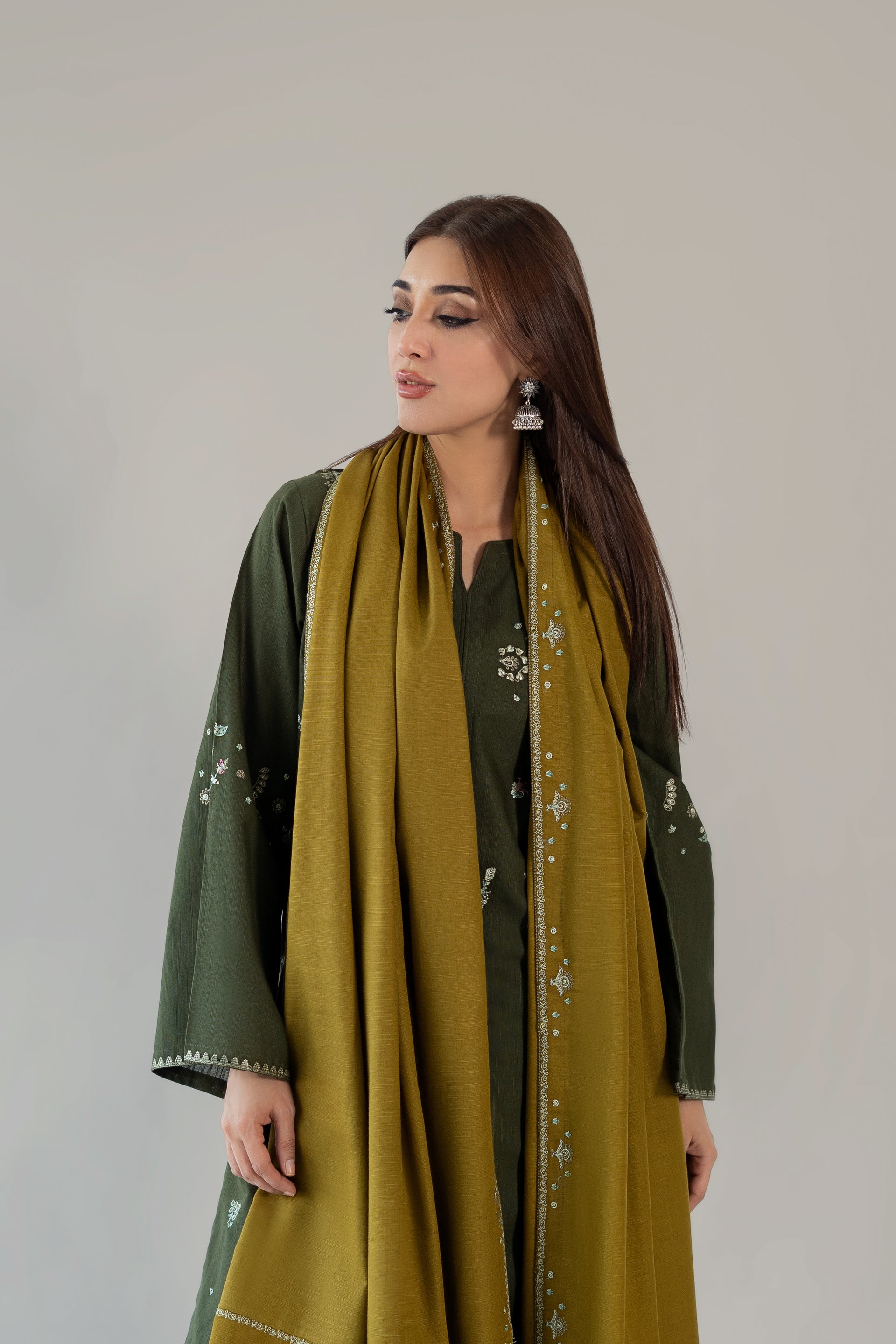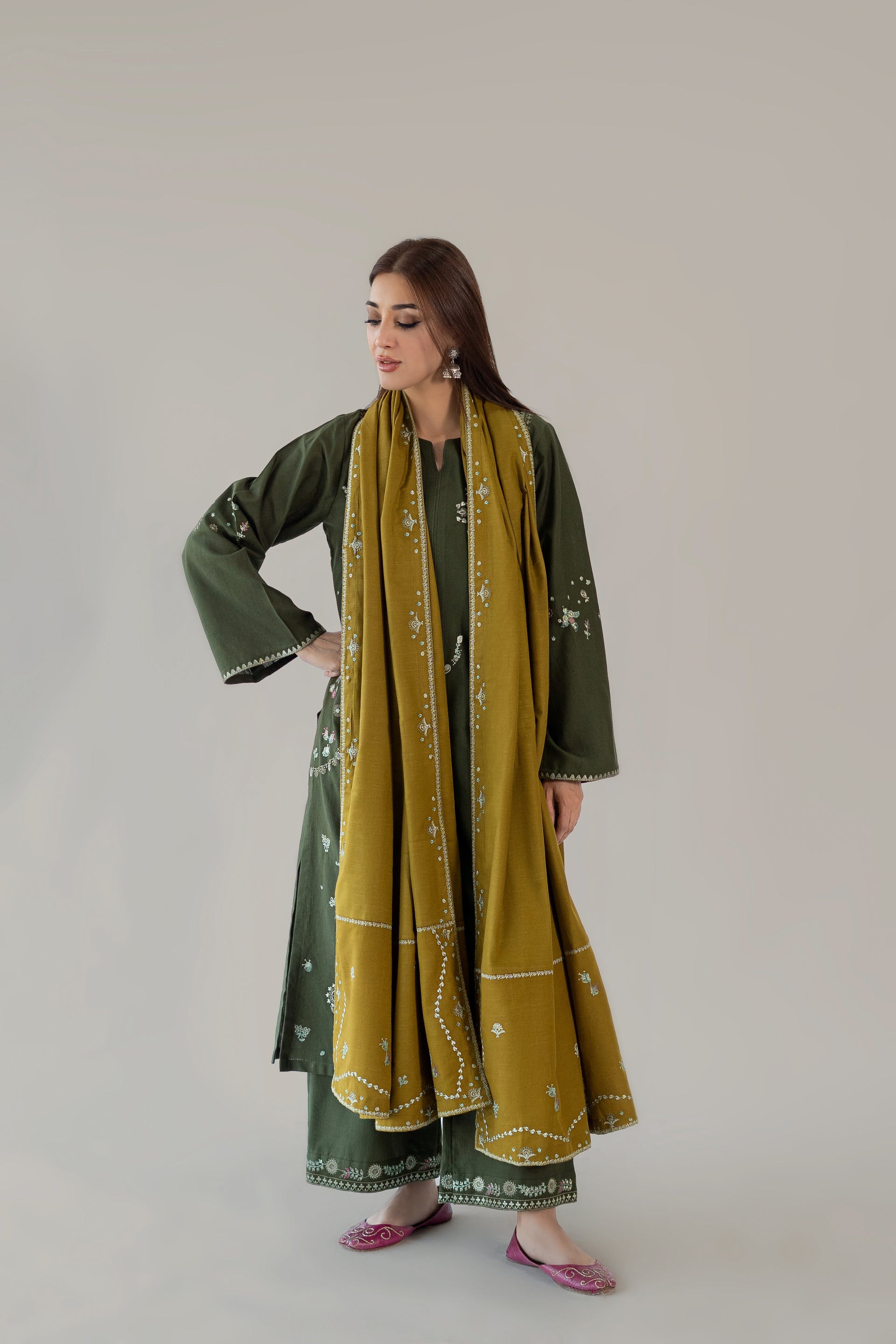 Introducing MARISSA, a sophisticated ready-to-wear 3-piece khaddar suit designed for the modern woman. The ensemble features a gracefully tailored long shirt adorned with intricate embroidery detailing across the front and sleeves, paired with comfortable loose-fit embroidered trousers. A contrasting shawl with matching embroidery completes the look, offering versatility for any occasion. Crafted from premium khaddar fabric, this collection piece combines traditional craftsmanship with contemporary styling for effortless elegance.