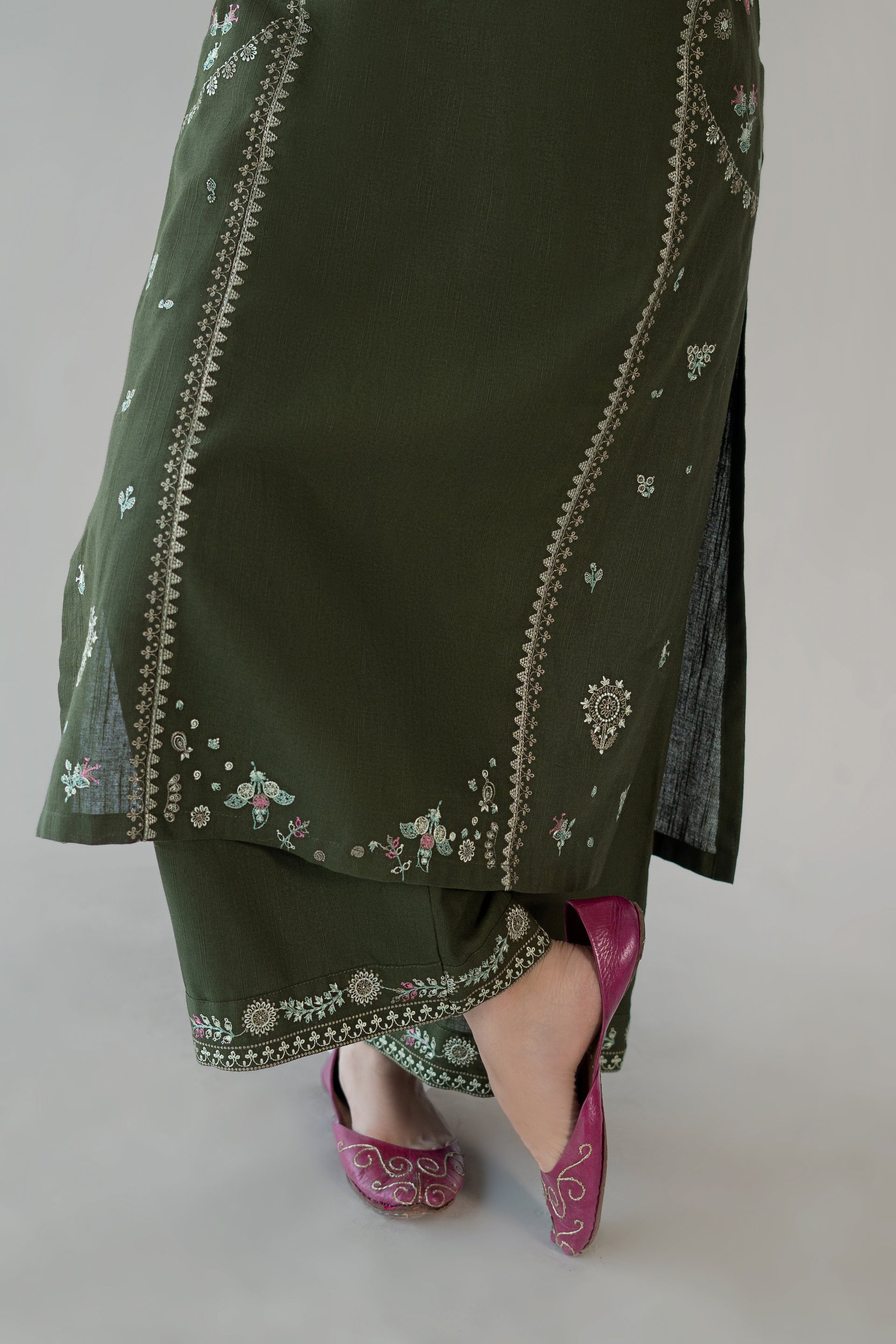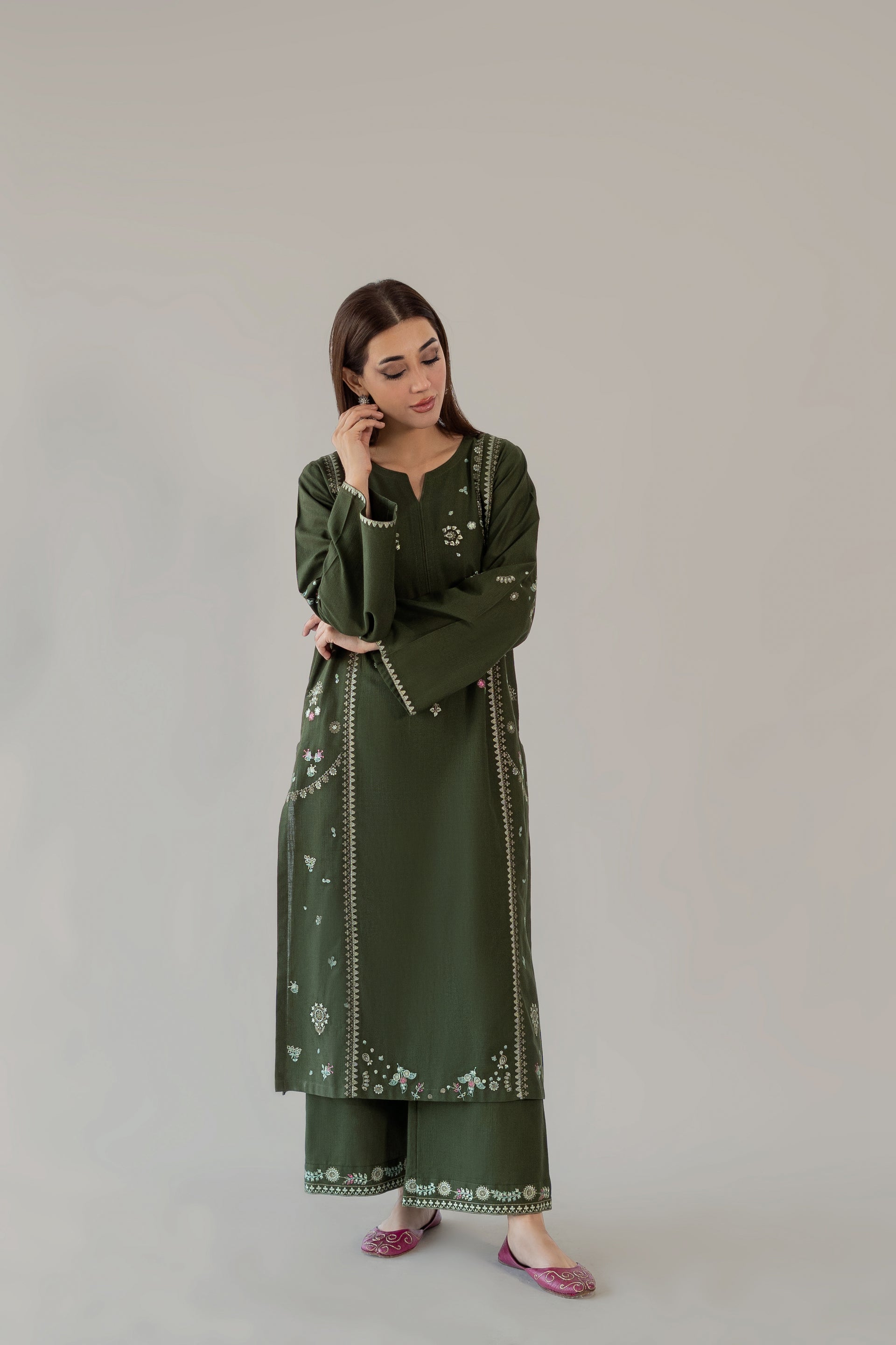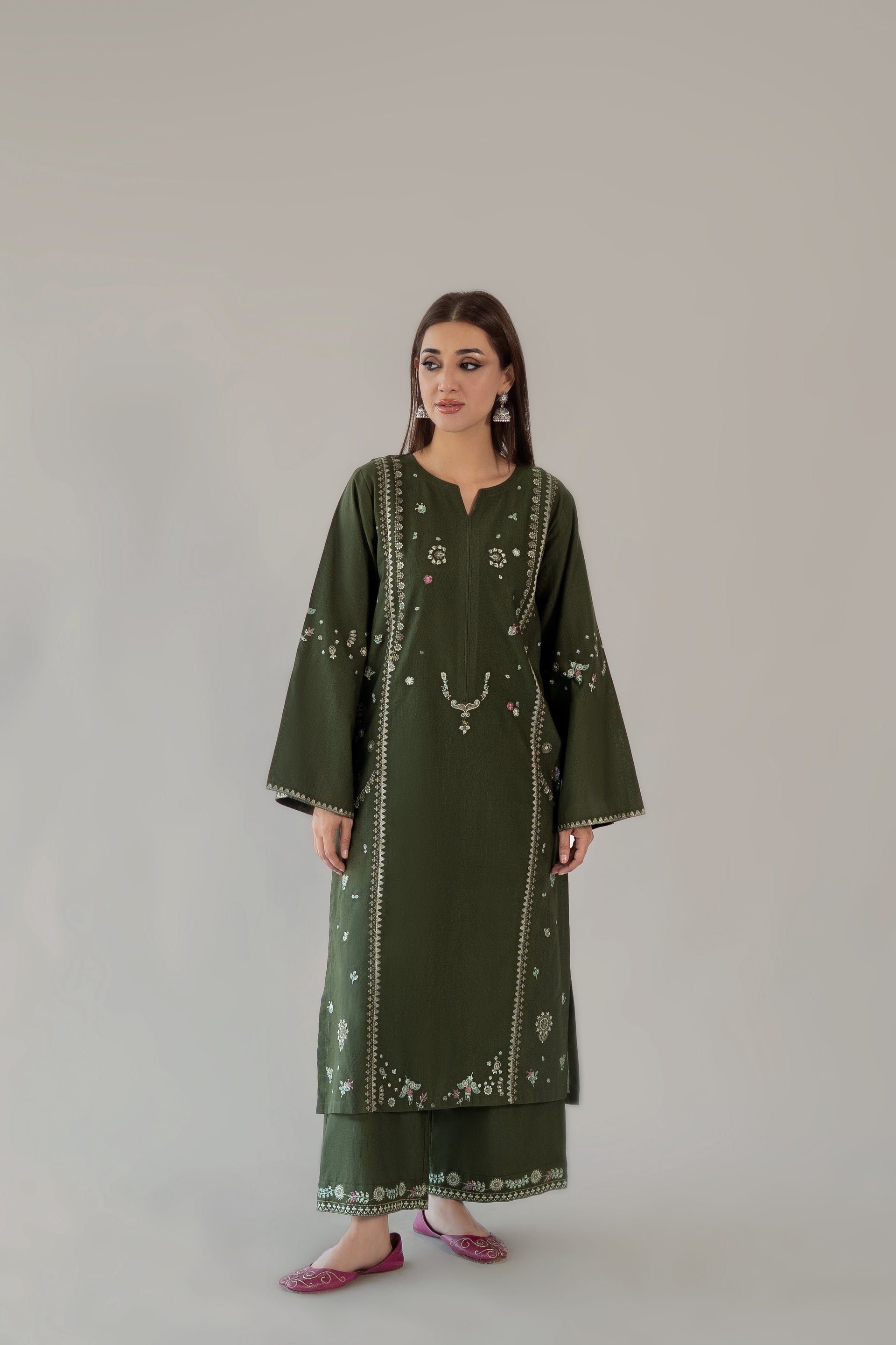 Introducing MARISSA, a sophisticated ready-to-wear 3-piece khaddar suit designed for the modern woman. The ensemble features a gracefully tailored long shirt adorned with intricate embroidery detailing across the front and sleeves, paired with comfortable loose-fit embroidered trousers. A contrasting shawl with matching embroidery completes the look, offering versatility for any occasion. Crafted from premium khaddar fabric, this collection piece combines traditional craftsmanship with contemporary styling for effortless elegance.
