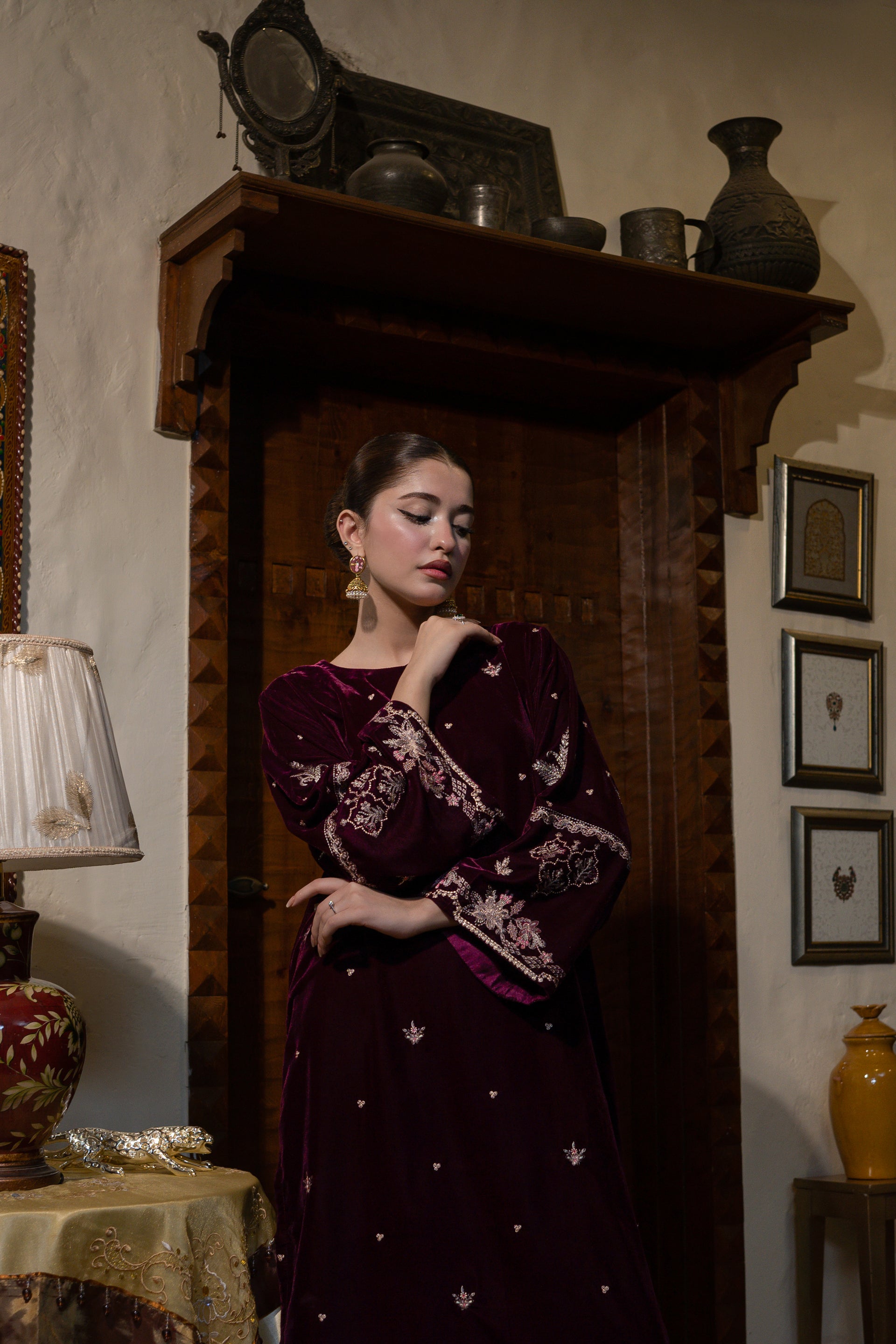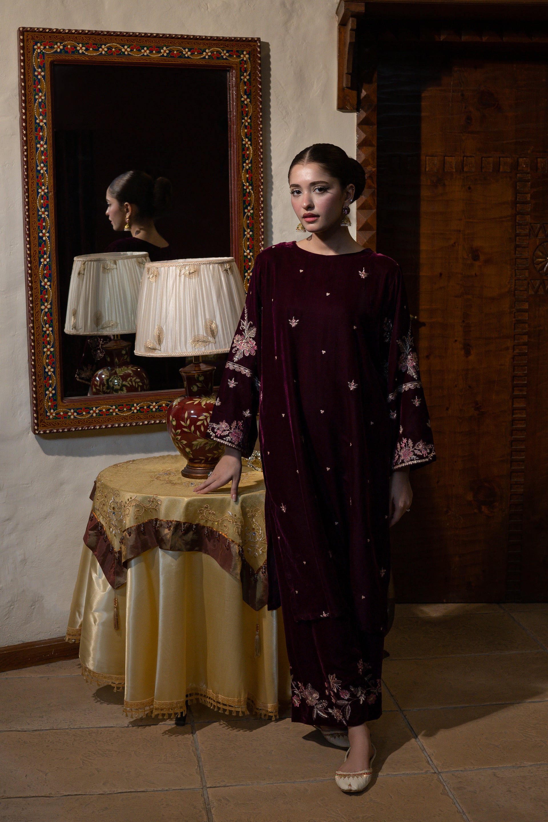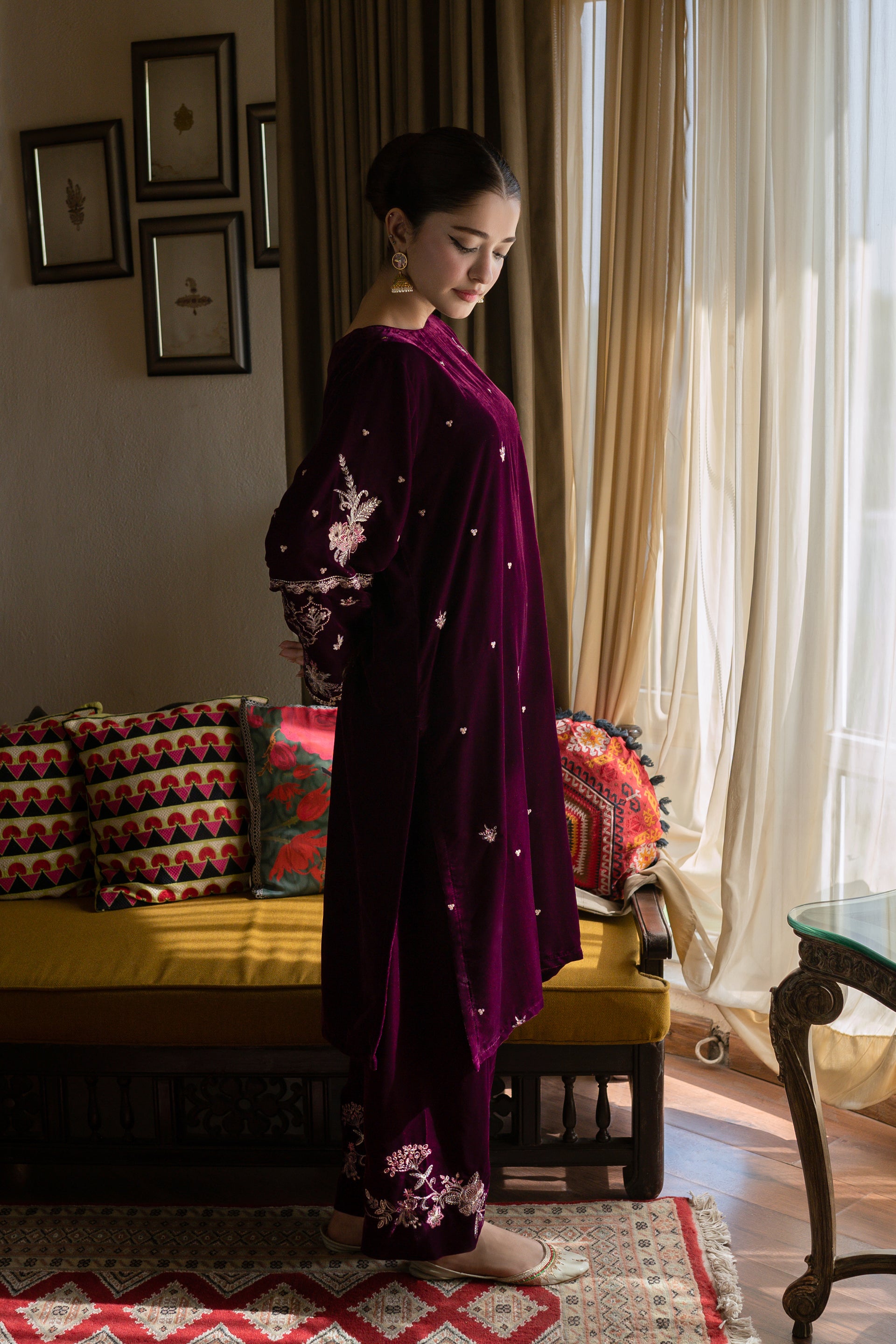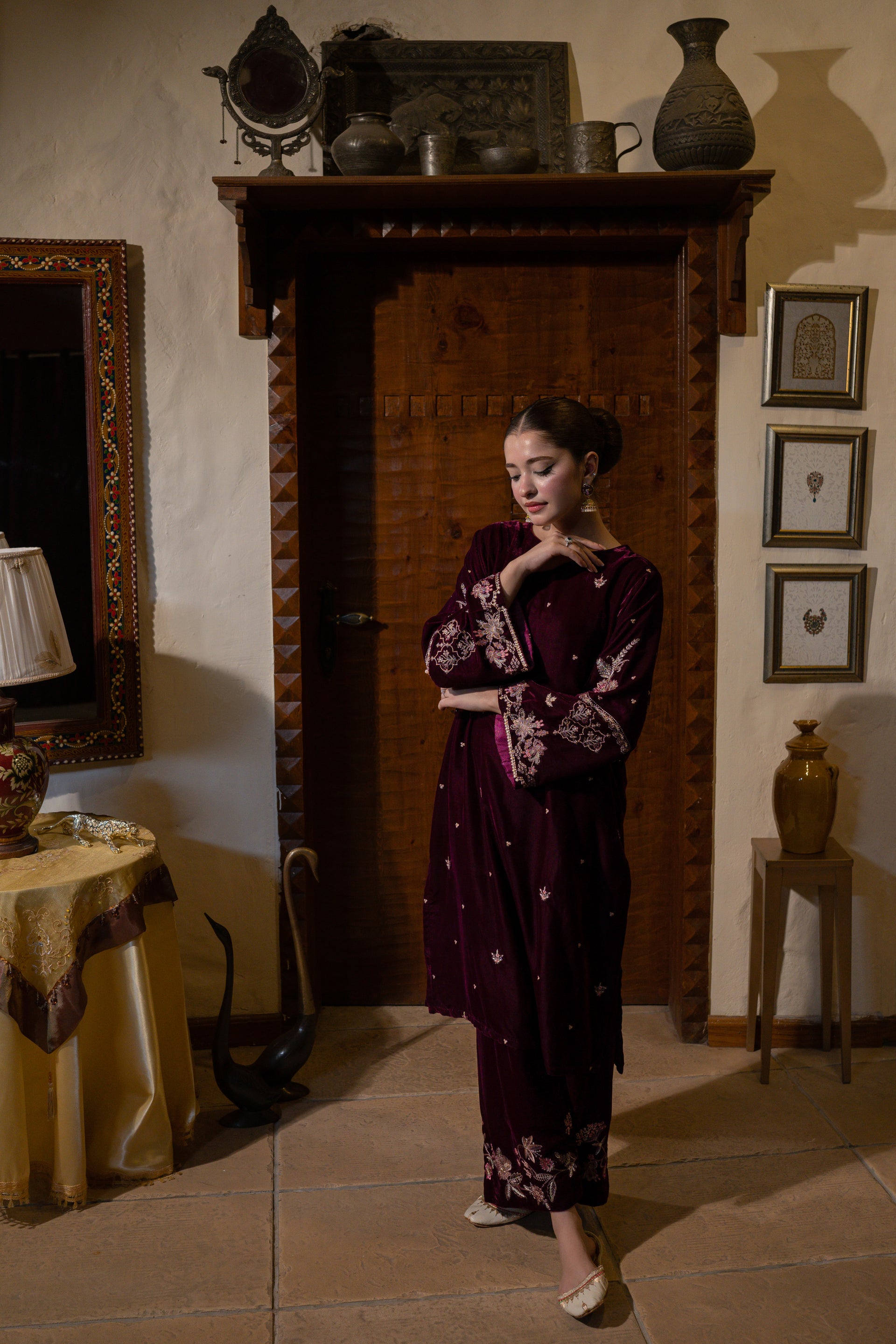 This 2-piece embroidered velvet suit offers timeless sophistication for formal occasions. The long shirt features intricate embroidery motifs on the front, complemented by detailed embroidered patterns on the loose sleeves. Paired with matching loose embroidered trousers, the ensemble is crafted from premium velvet fabric. The coordinated design demonstrates expert tailoring and refined craftsmanship, making it an excellent choice for those seeking polished, elegant attire.