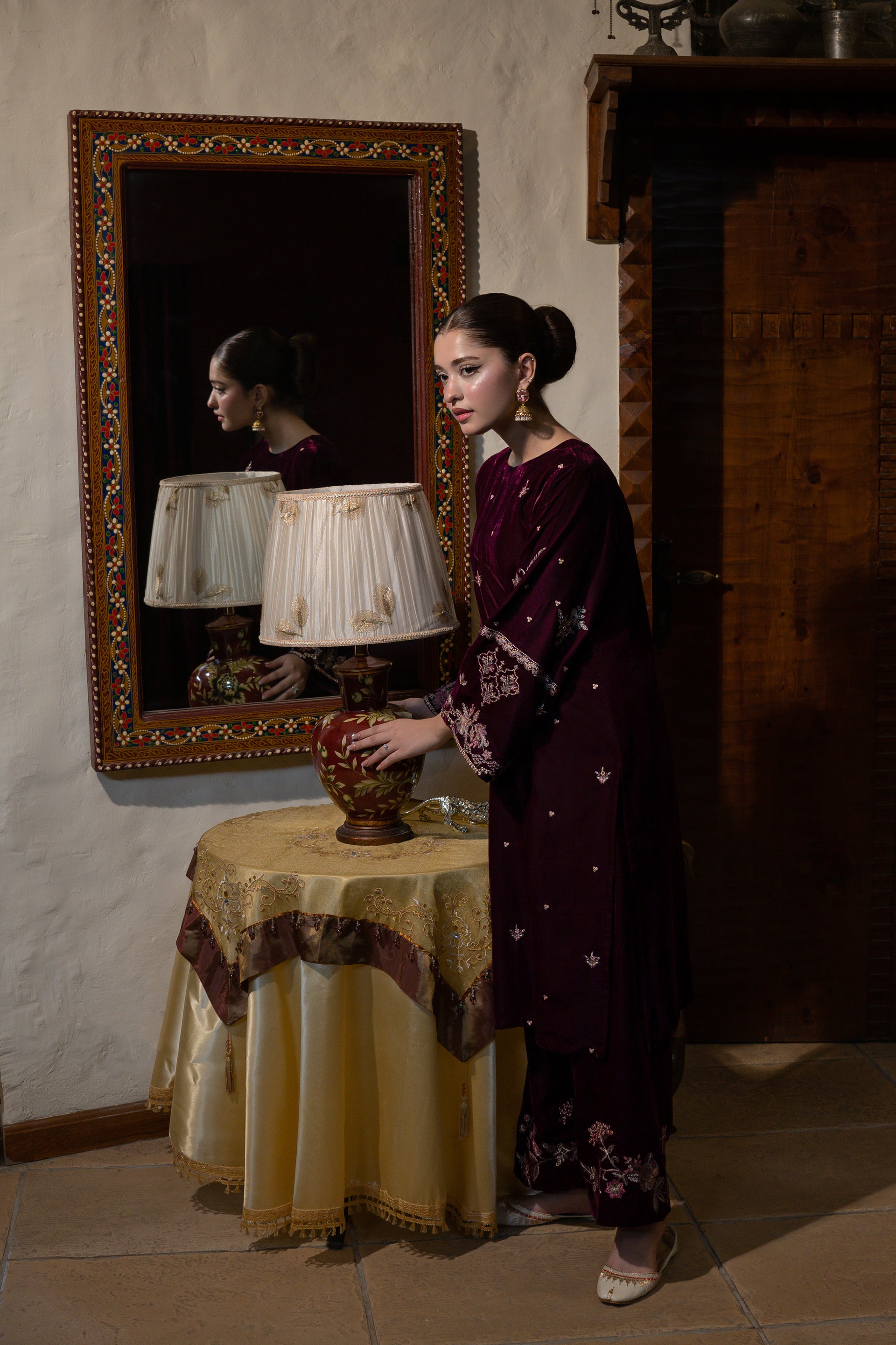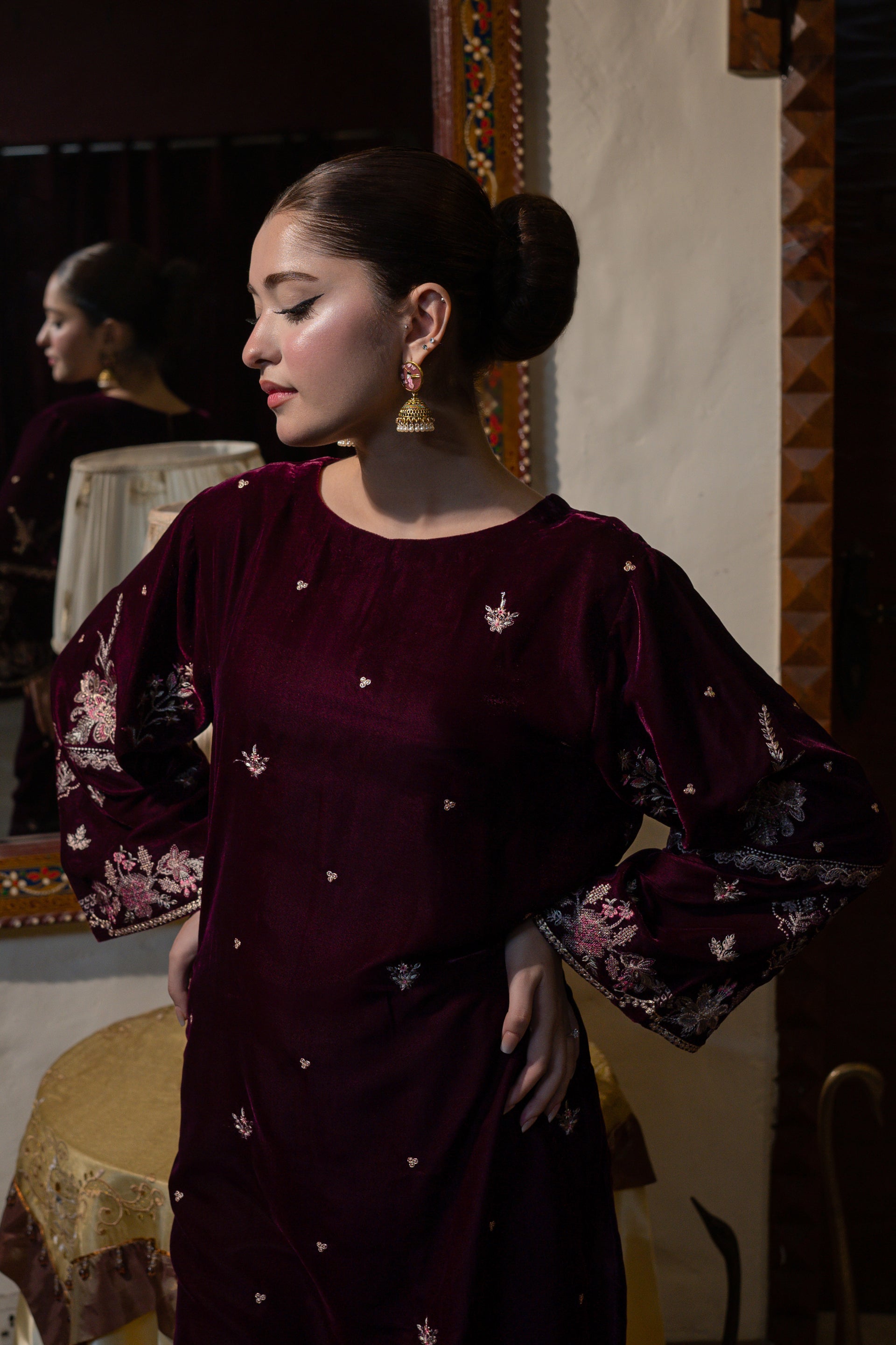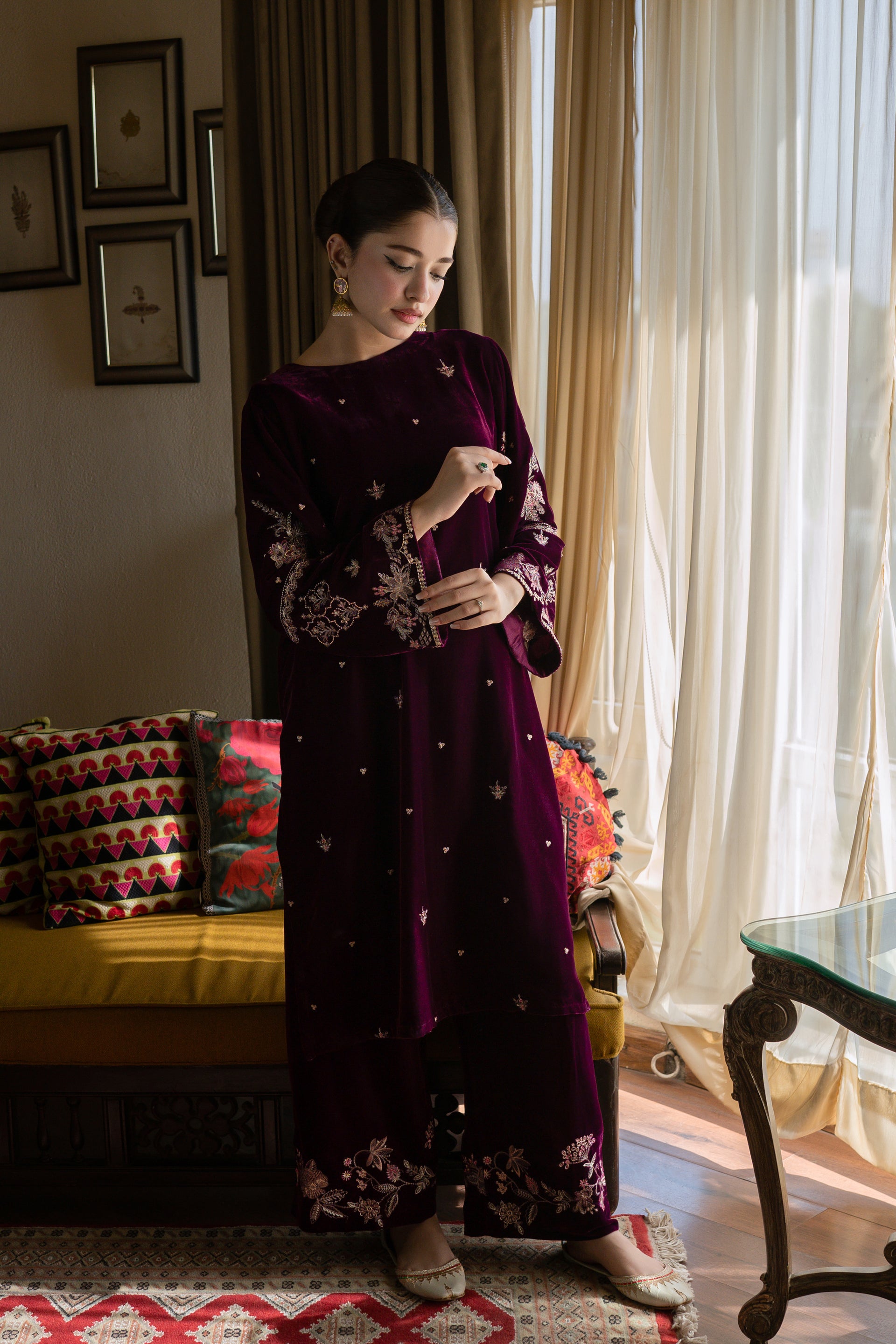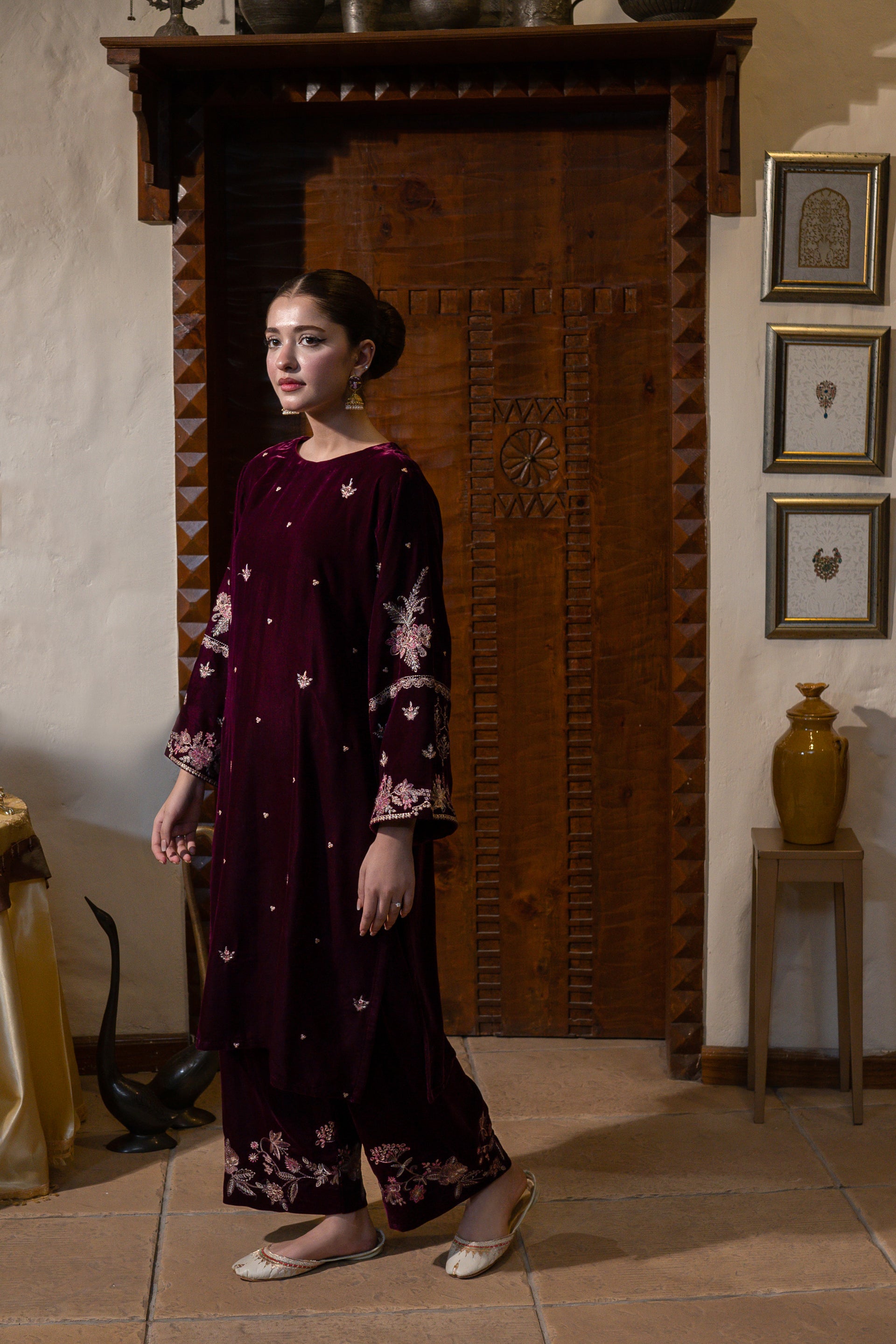 This 2-piece embroidered velvet suit offers timeless sophistication for formal occasions. The long shirt features intricate embroidery motifs on the front, complemented by detailed embroidered patterns on the loose sleeves. Paired with matching loose embroidered trousers, the ensemble is crafted from premium velvet fabric. The coordinated design demonstrates expert tailoring and refined craftsmanship, making it an excellent choice for those seeking polished, elegant attire.