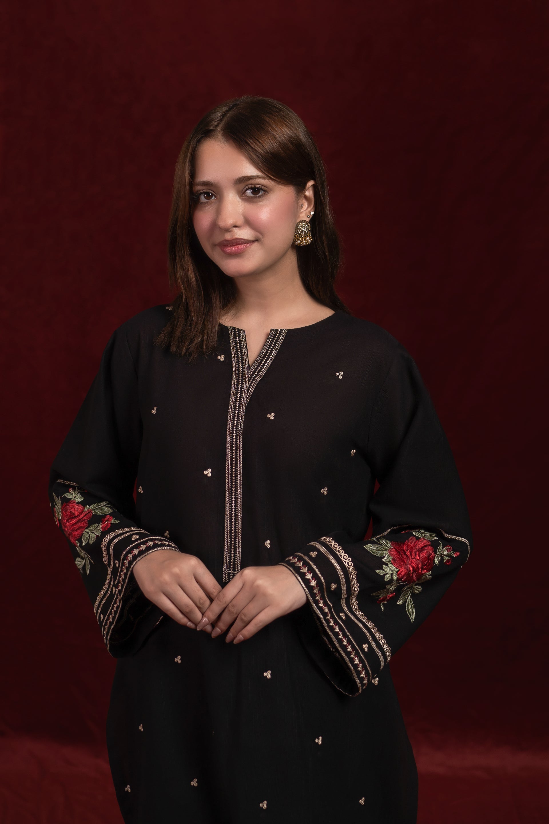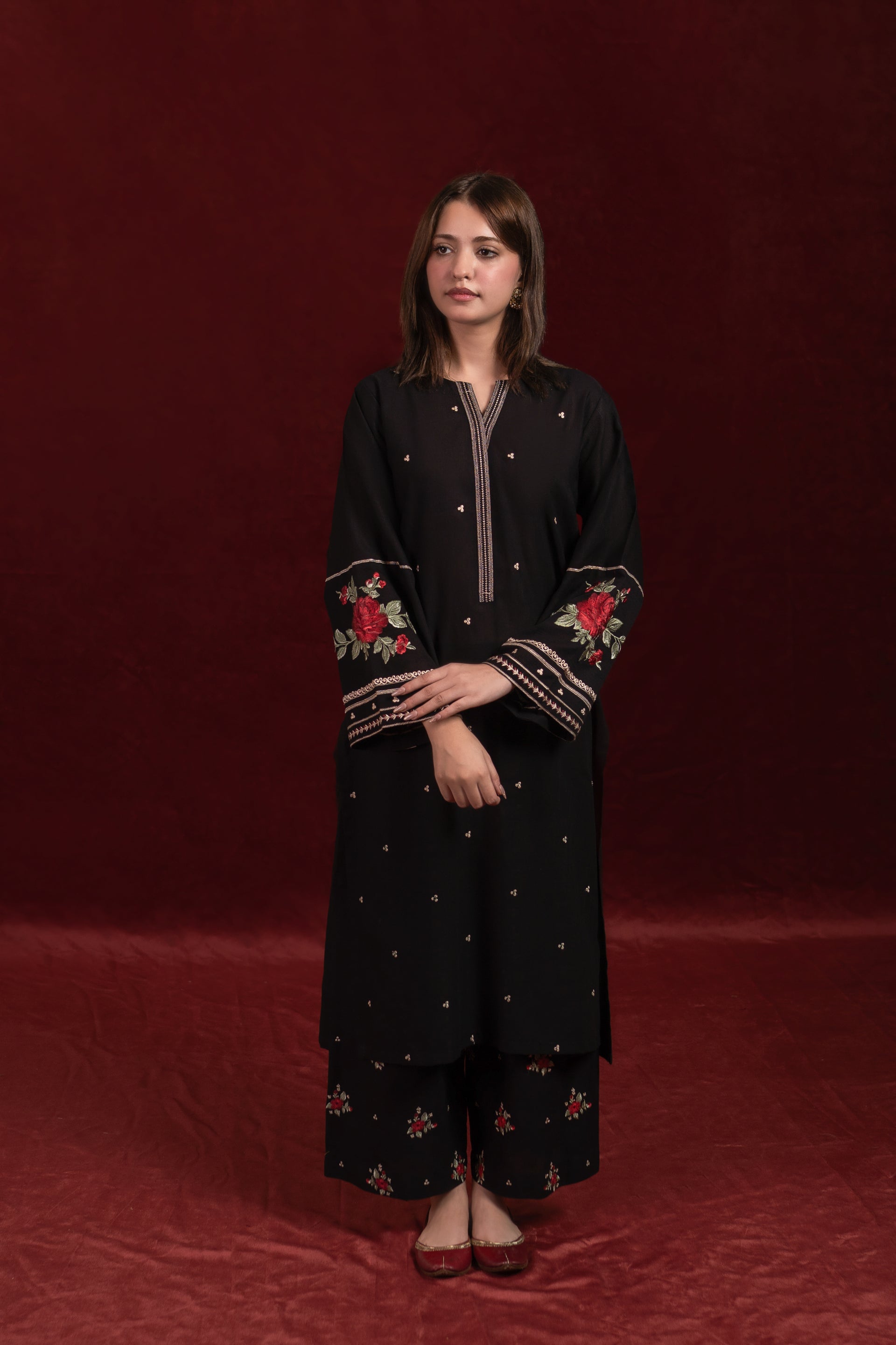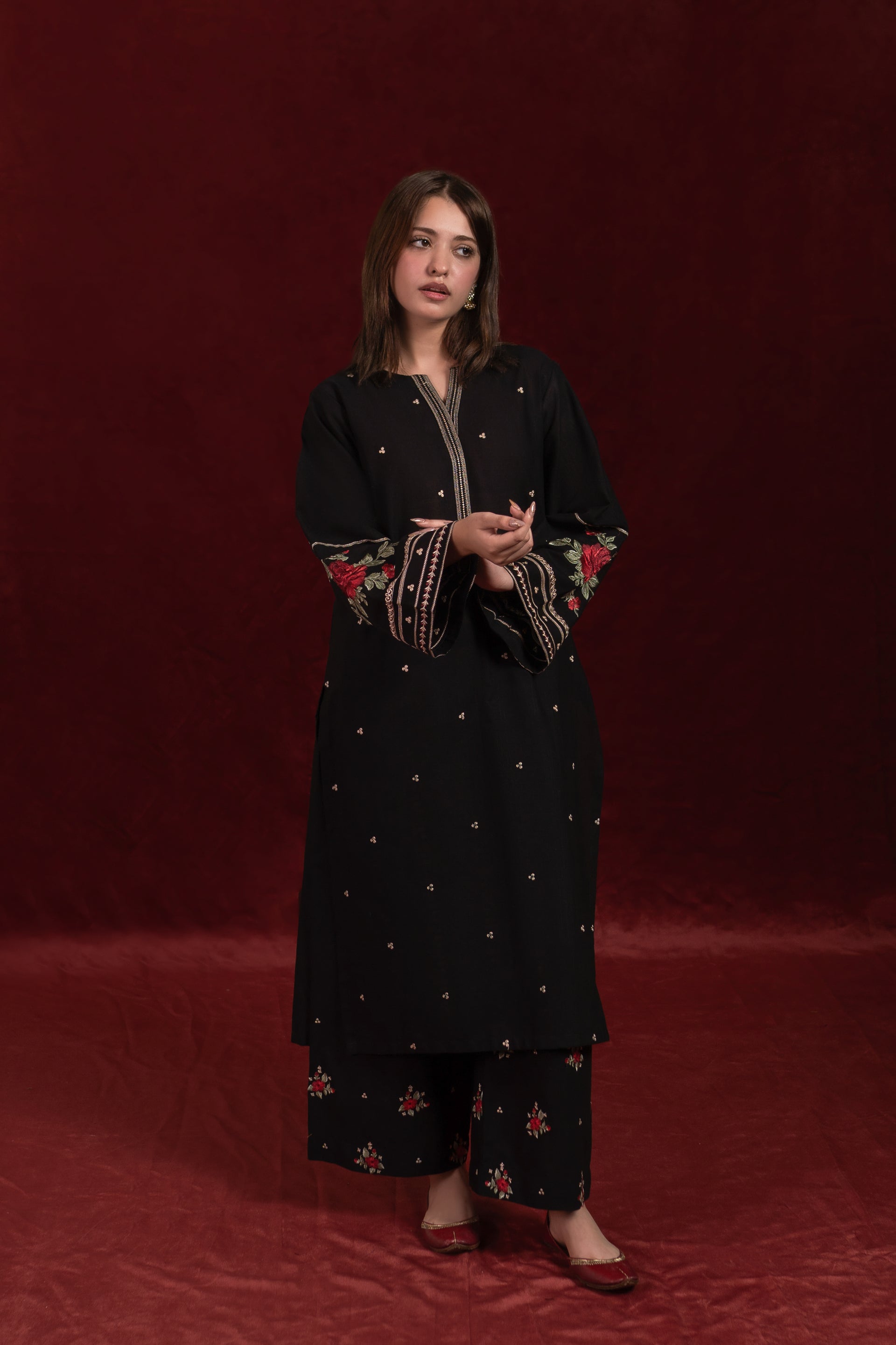Experience elegance with the ready-to-wear MEERAKI 2PC embroidered Khaddar set. Featuring a long shirt adorned with a delicate spray of intricate embroidery motifs on the front and stunning floral embroidery on the sleeves, this ensemble perfectly balances tradition and style. Paired with loose embroidered trousers, it offers both comfort and sophistication, making it suitable for formal and semi-formal occasions. Crafted for those who appreciate fine detailing and timeless design.