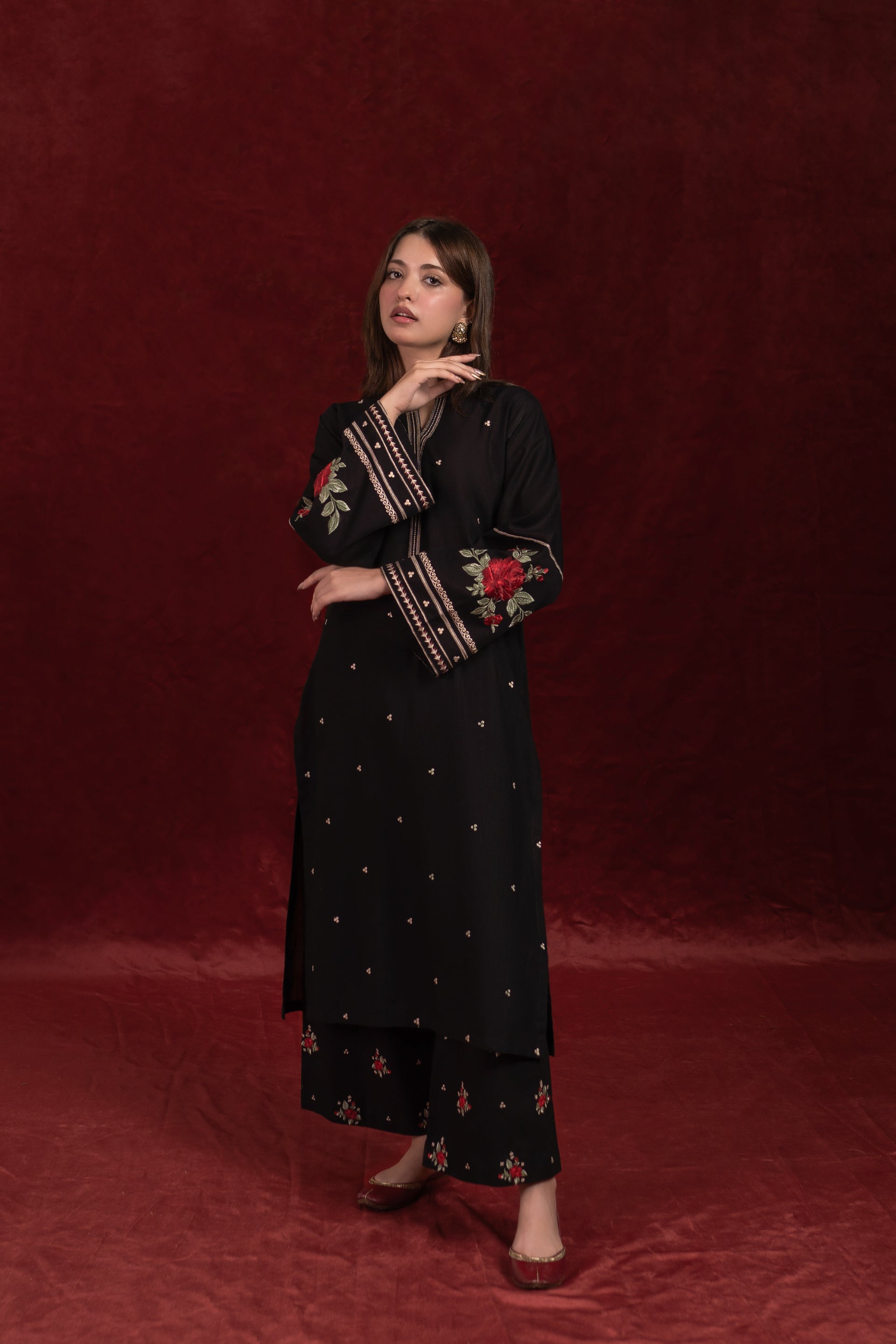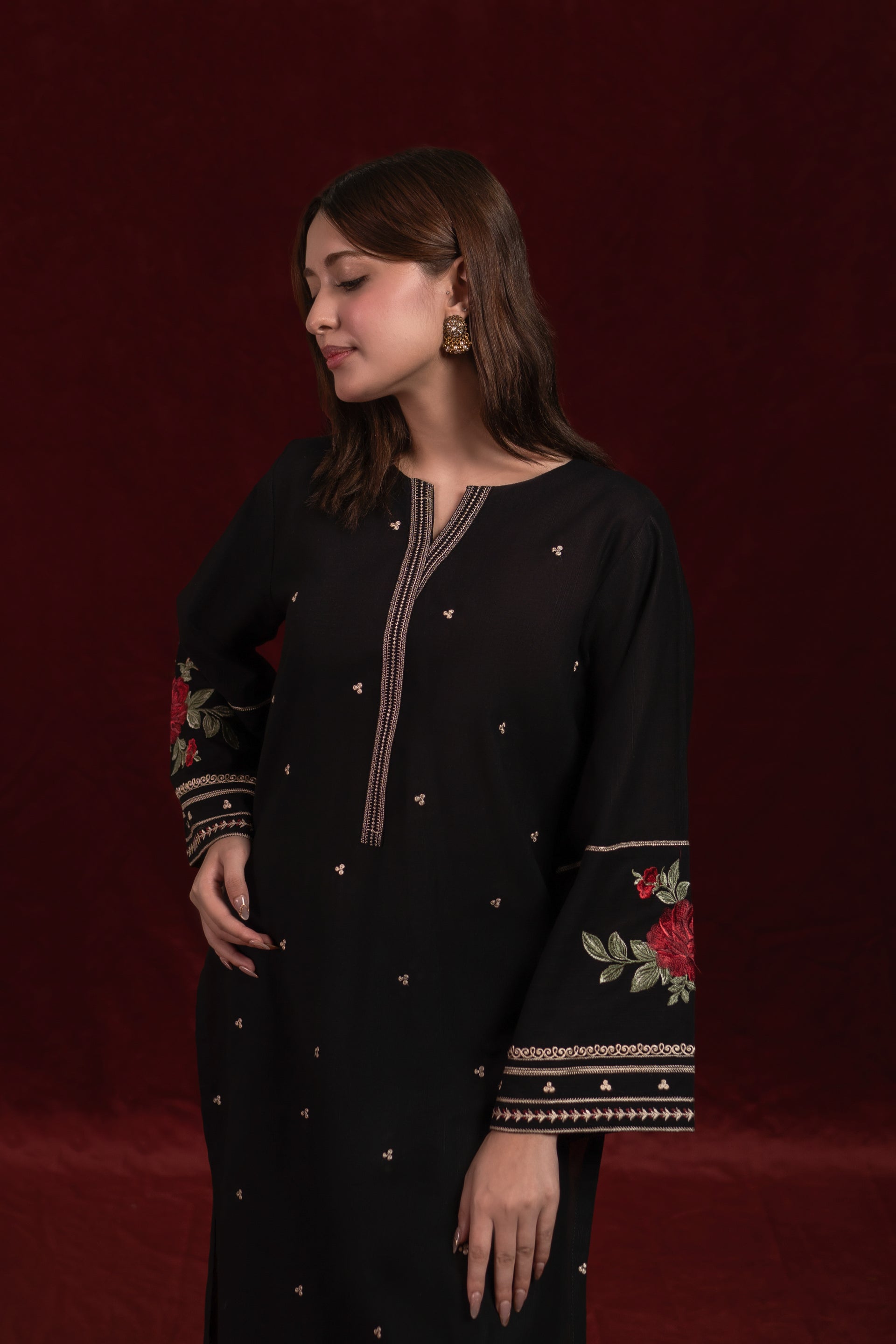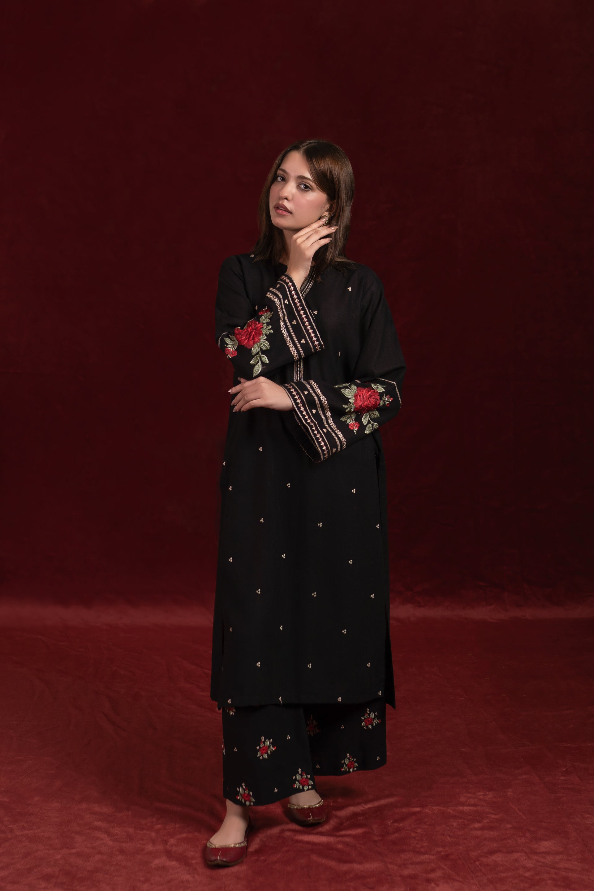 Experience elegance with the ready-to-wear MEERAKI 2PC embroidered Khaddar set. Featuring a long shirt adorned with a delicate spray of intricate embroidery motifs on the front and stunning floral embroidery on the sleeves, this ensemble perfectly balances tradition and style. Paired with loose embroidered trousers, it offers both comfort and sophistication, making it suitable for formal and semi-formal occasions. Crafted for those who appreciate fine detailing and timeless design.
