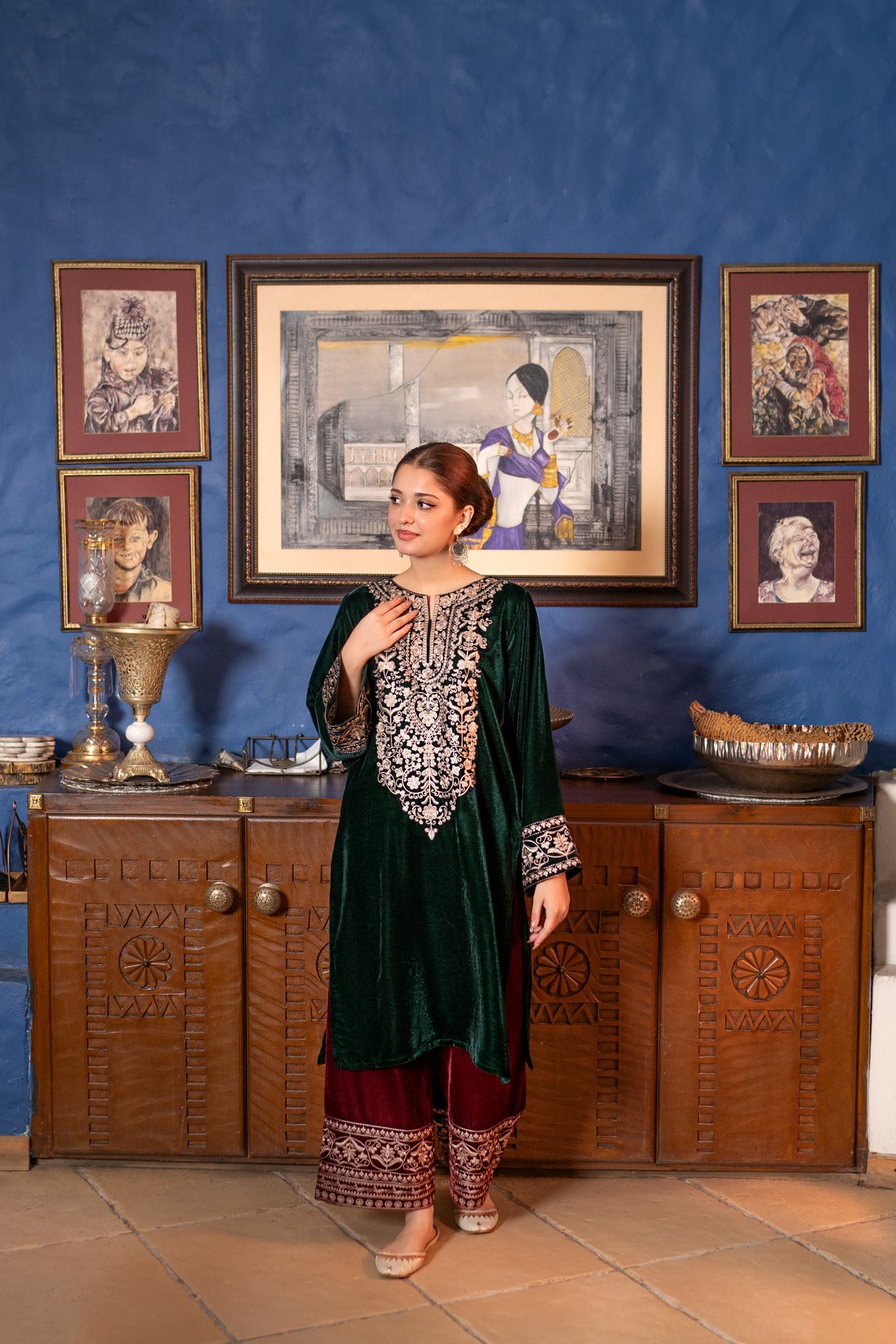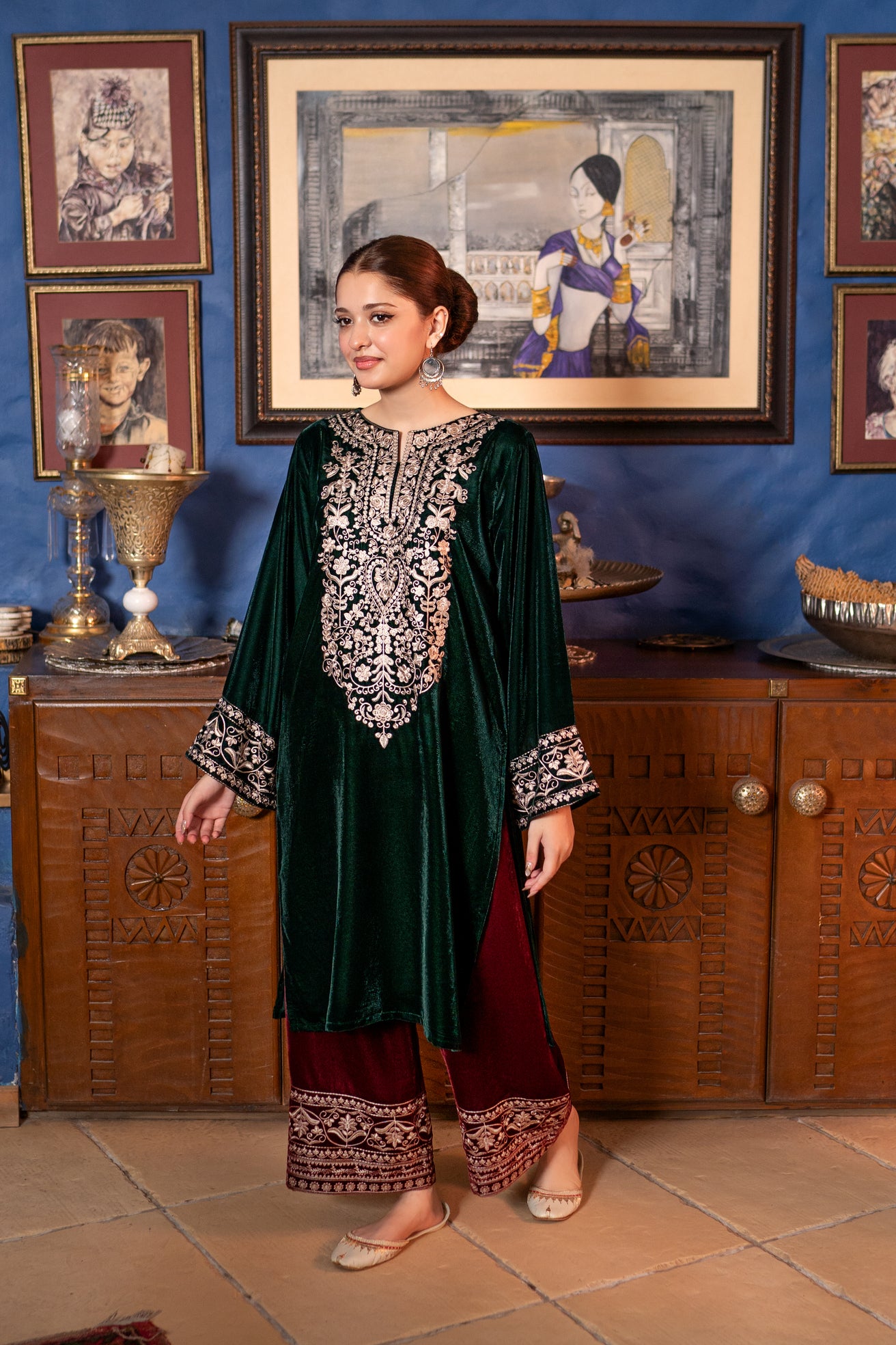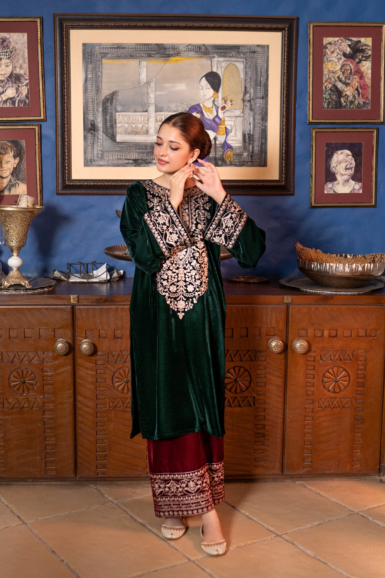 Experience elegance with the MEHFIL ready-to-wear 2-piece velvet suit, featuring a long shirt adorned with intricate embroidery on the neckline and sleeves. This sophisticated ensemble pairs seamlessly with loose, embroidered trousers in a contrasting color, offering both comfort and style ideal for formal occasions.