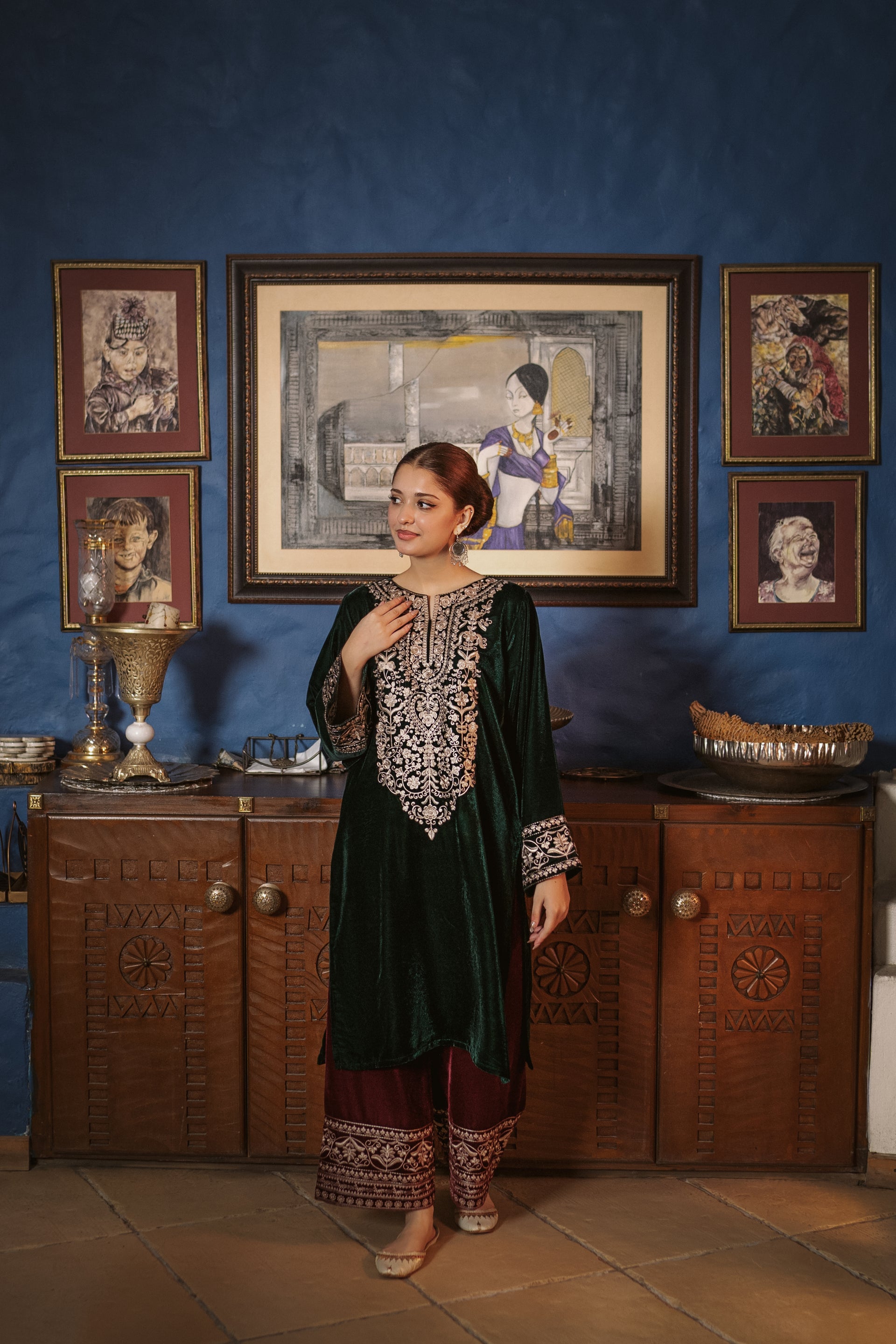 Experience elegance with the MEHFIL ready-to-wear 2-piece velvet suit, featuring a long shirt adorned with intricate embroidery on the neckline and sleeves. This sophisticated ensemble pairs seamlessly with loose, embroidered trousers in a contrasting color, offering both comfort and style ideal for formal occasions.