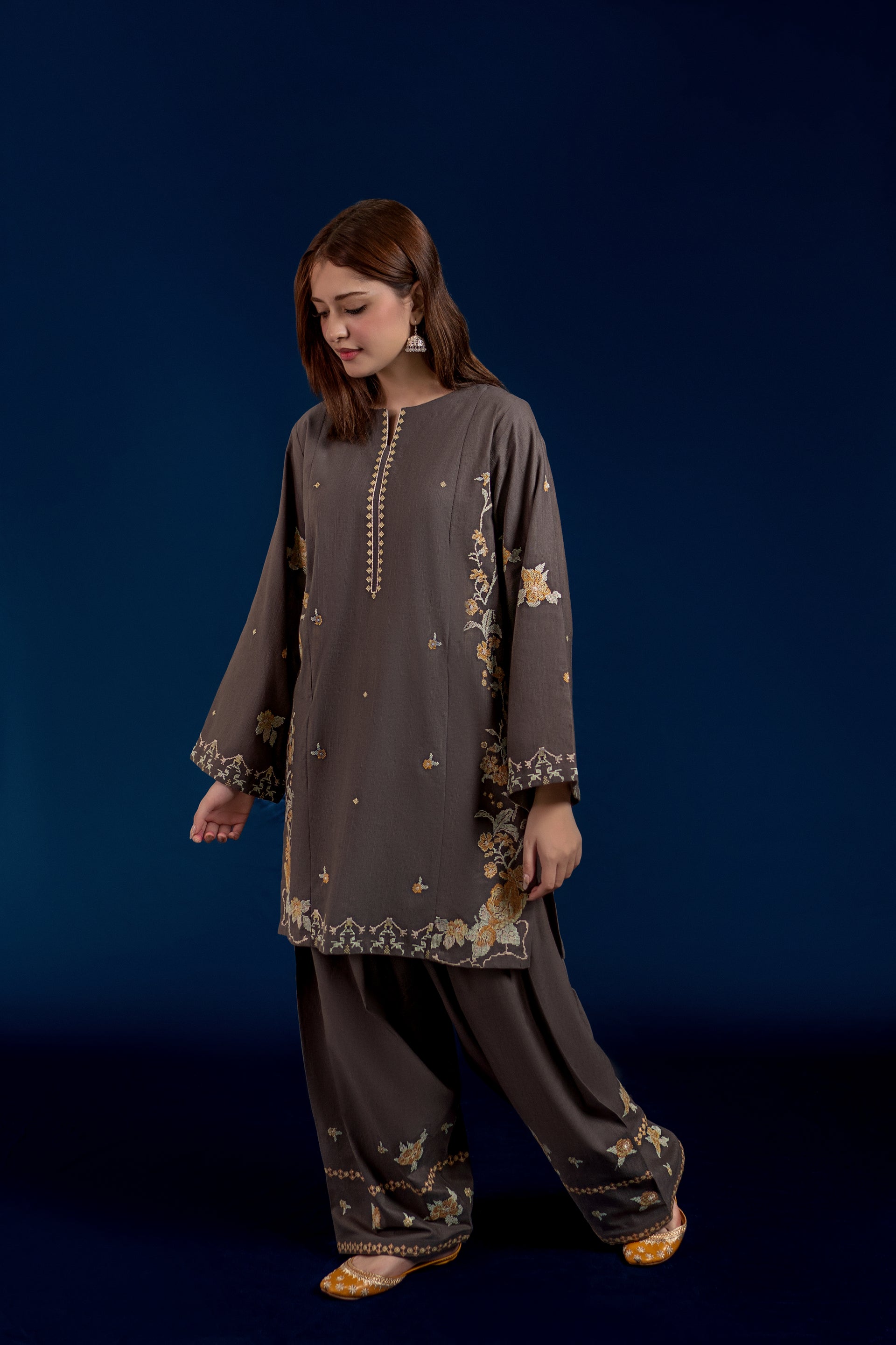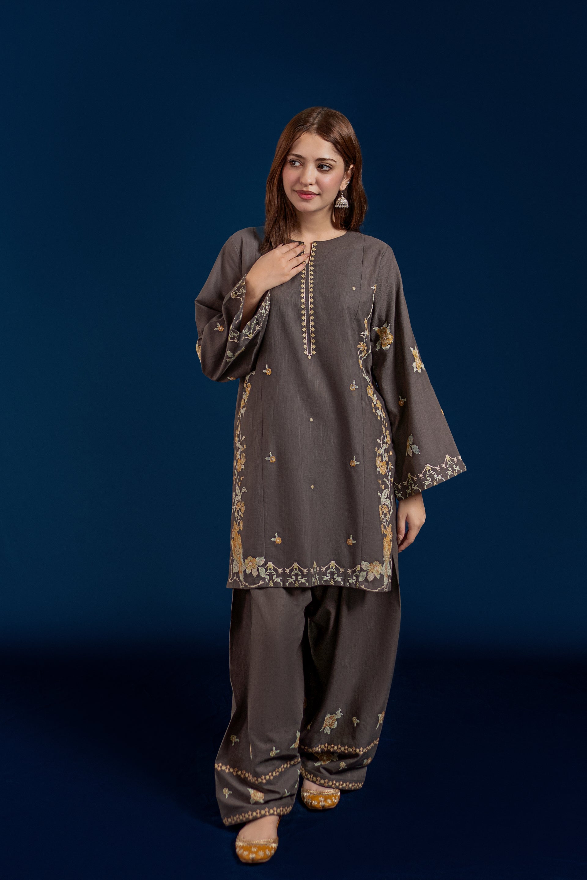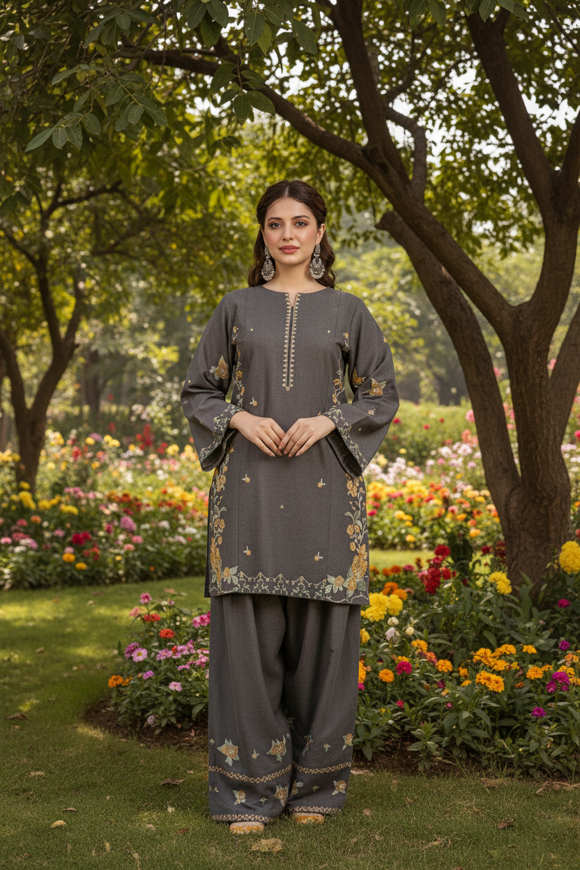 Experience traditional elegance with the MELVIN ready-to-wear 2-piece Khaddar suit. This set features a short shirt adorned with intricate cross stitch embroidery on the front and sleeves, delivering refined craftsmanship. Complemented by an embroidered Farshi shalwar, the ensemble offers a perfect blend of comfort and sophistication ideal for cooler seasons. Crafted from premium Khaddar fabric, it ensures warmth while maintaining breathability, making it a stylish and practical choice.