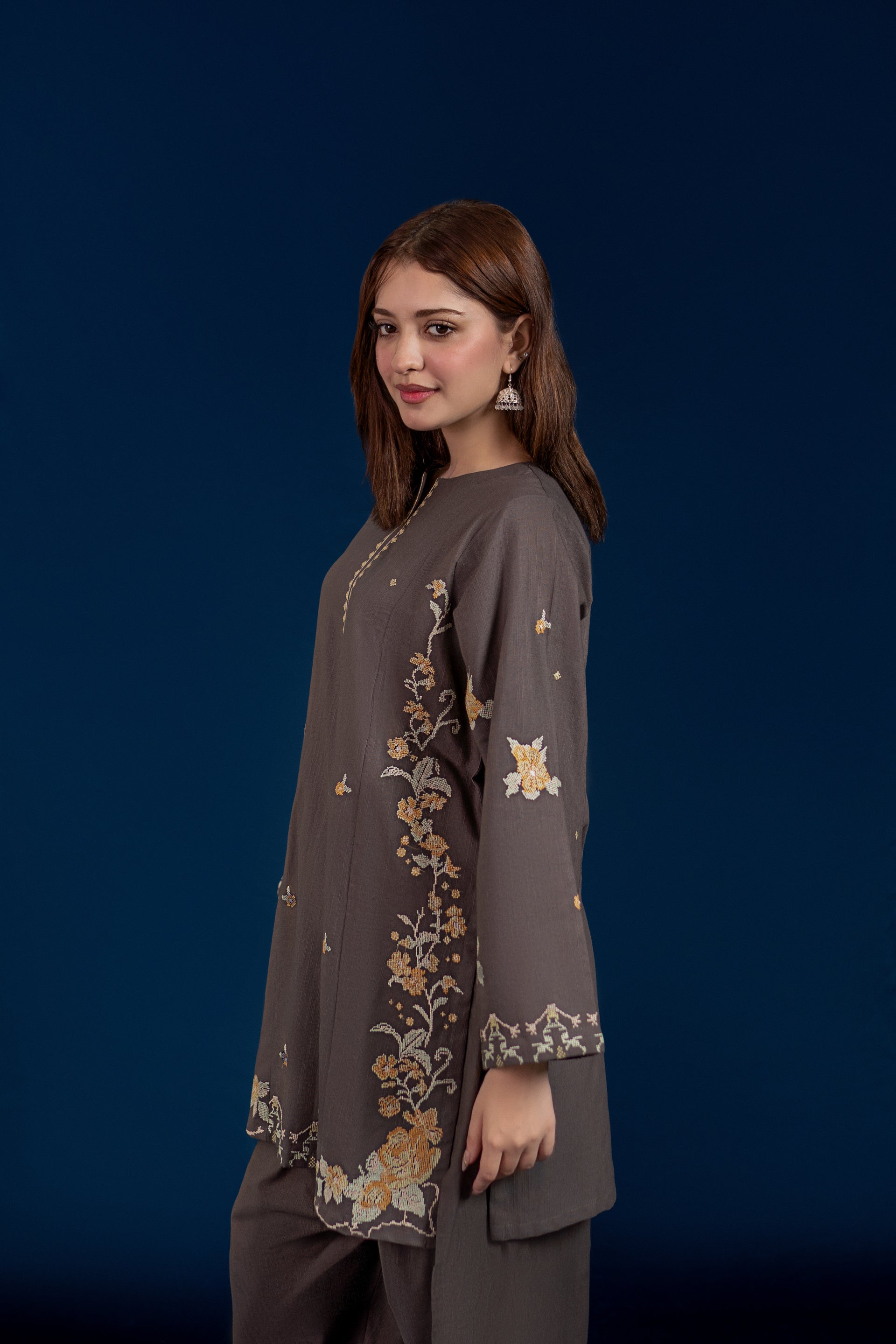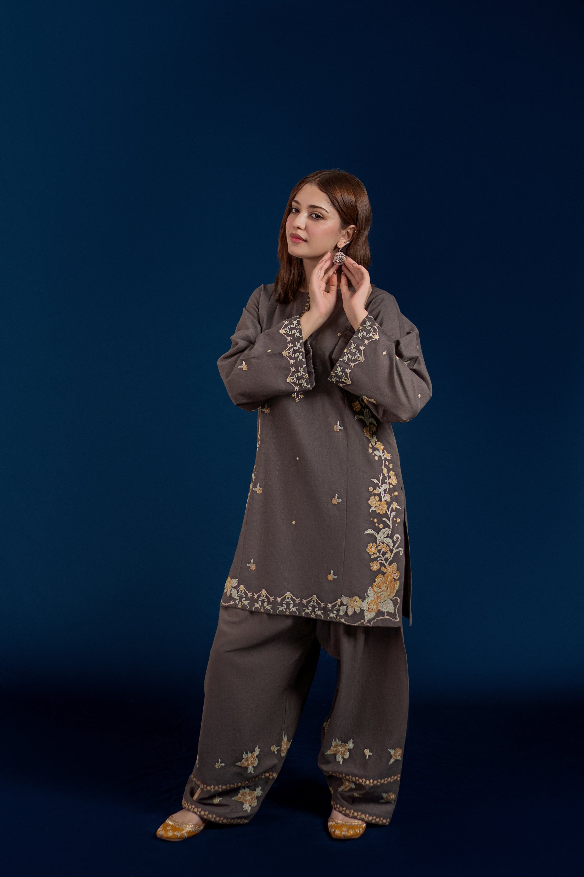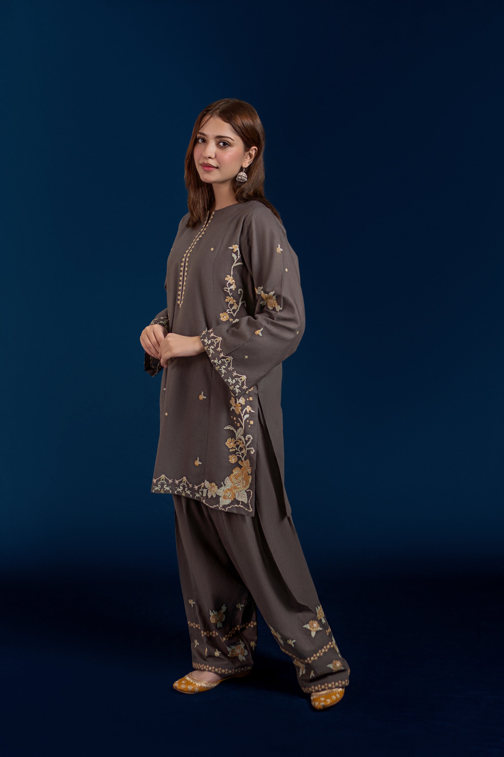 Experience traditional elegance with the MELVIN ready-to-wear 2-piece Khaddar suit. This set features a short shirt adorned with intricate cross stitch embroidery on the front and sleeves, delivering refined craftsmanship. Complemented by an embroidered Farshi shalwar, the ensemble offers a perfect blend of comfort and sophistication ideal for cooler seasons. Crafted from premium Khaddar fabric, it ensures warmth while maintaining breathability, making it a stylish and practical choice.