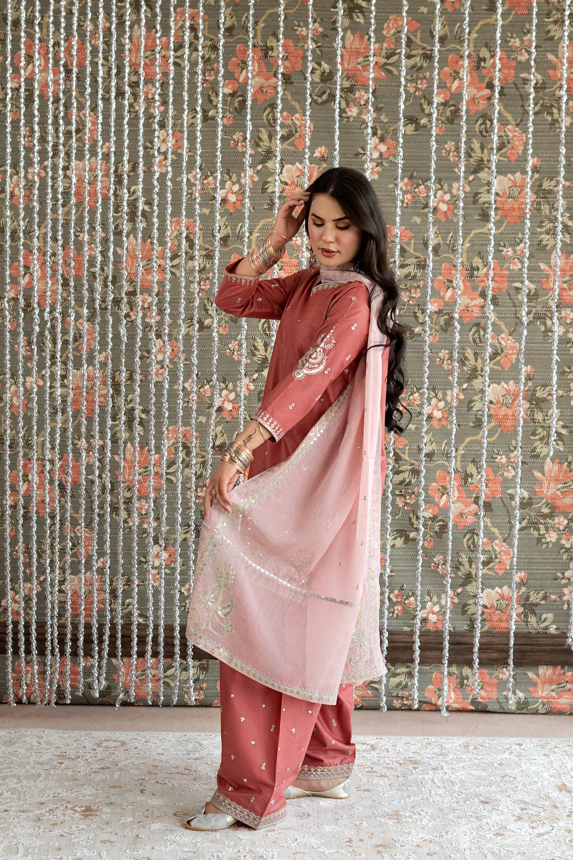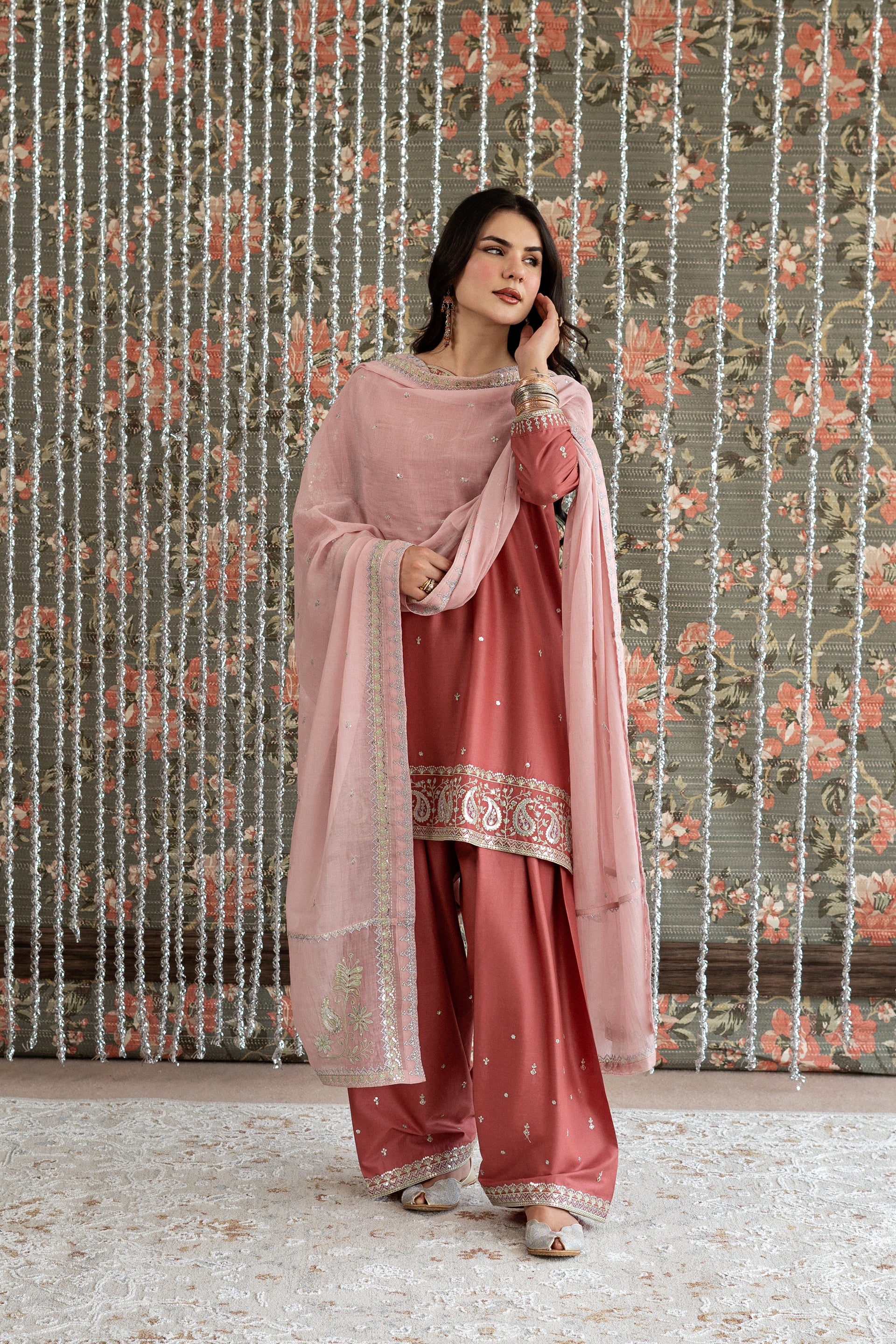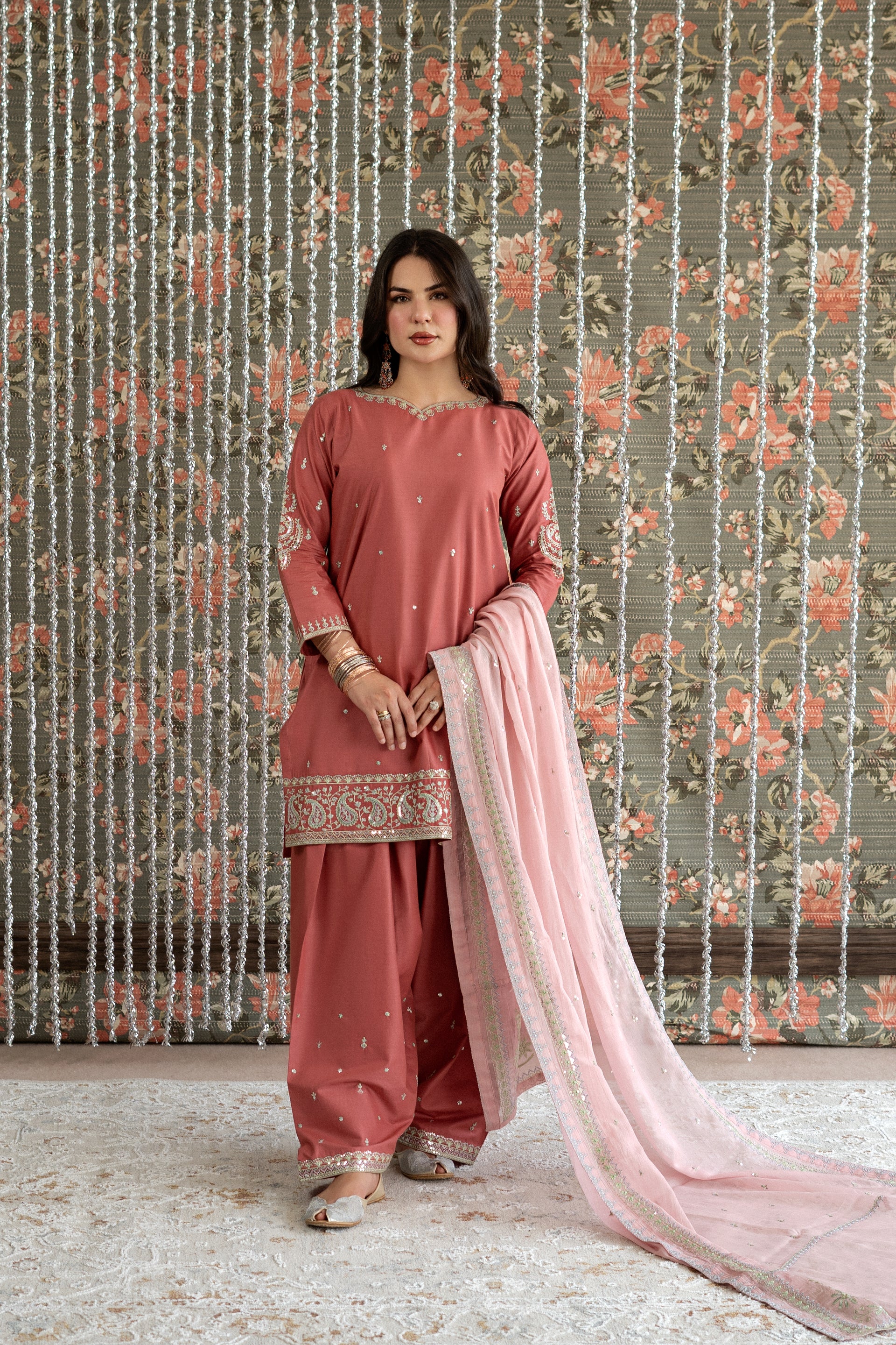 Elevate your festive wardrobe with this elegant three-piece ensemble. The short lawn shirt features intricate embroidery adorning the daman, front, and sleeves, complemented by delicate sequin detailing for added sophistication. The coordinating embroidered farshi shalwar in lawn fabric offers comfort and grace, while the monark dupatta showcases matching embroidery work throughout.