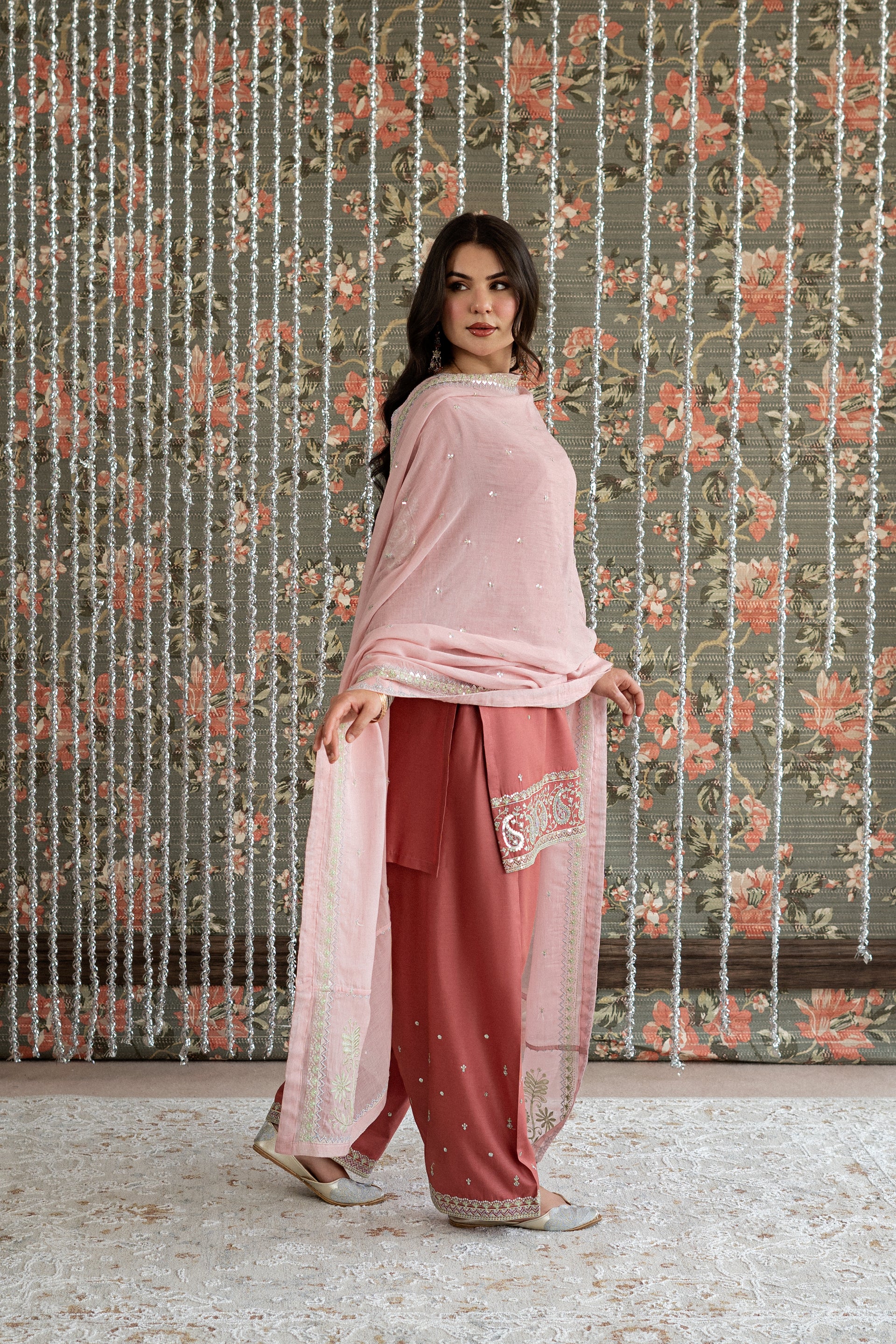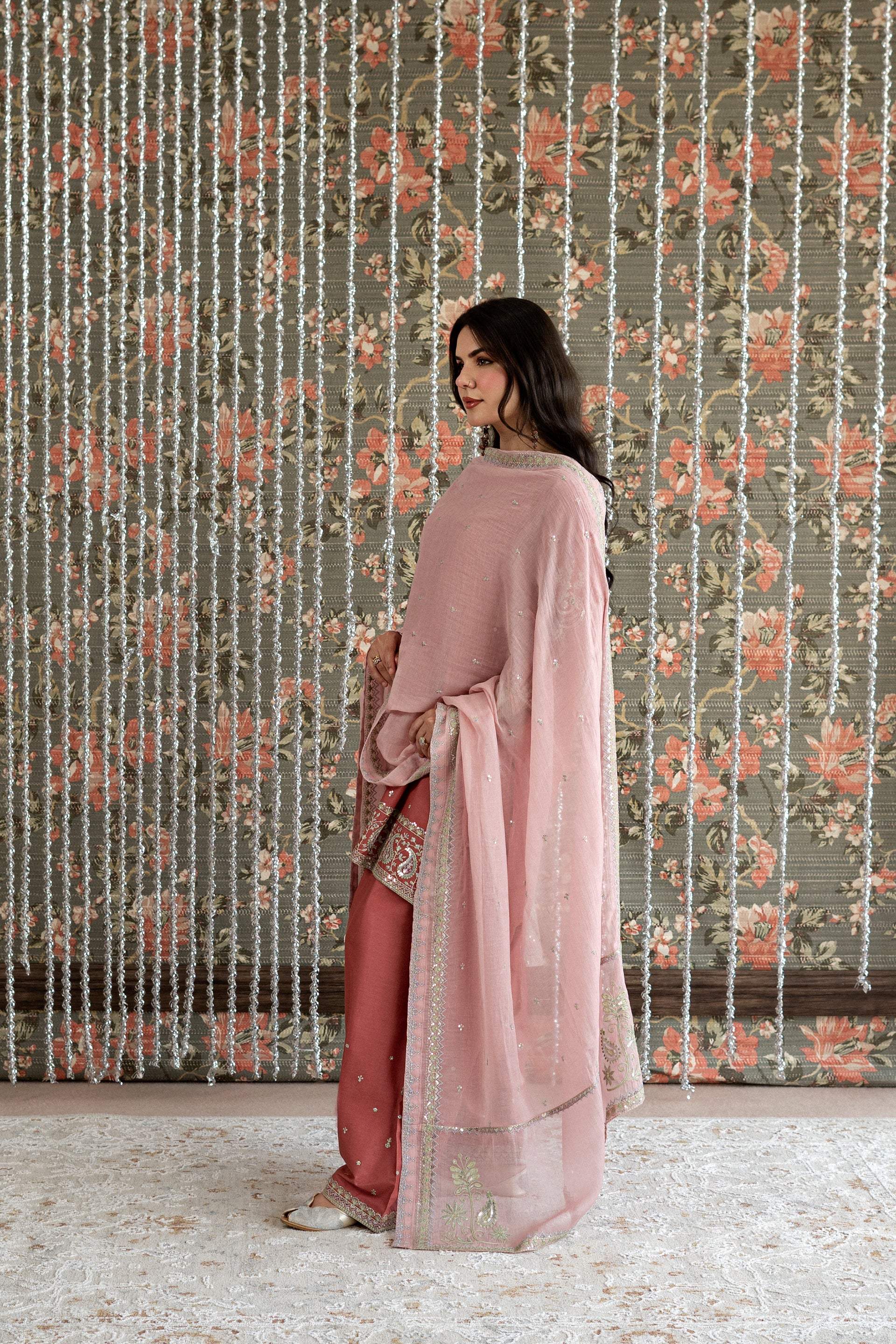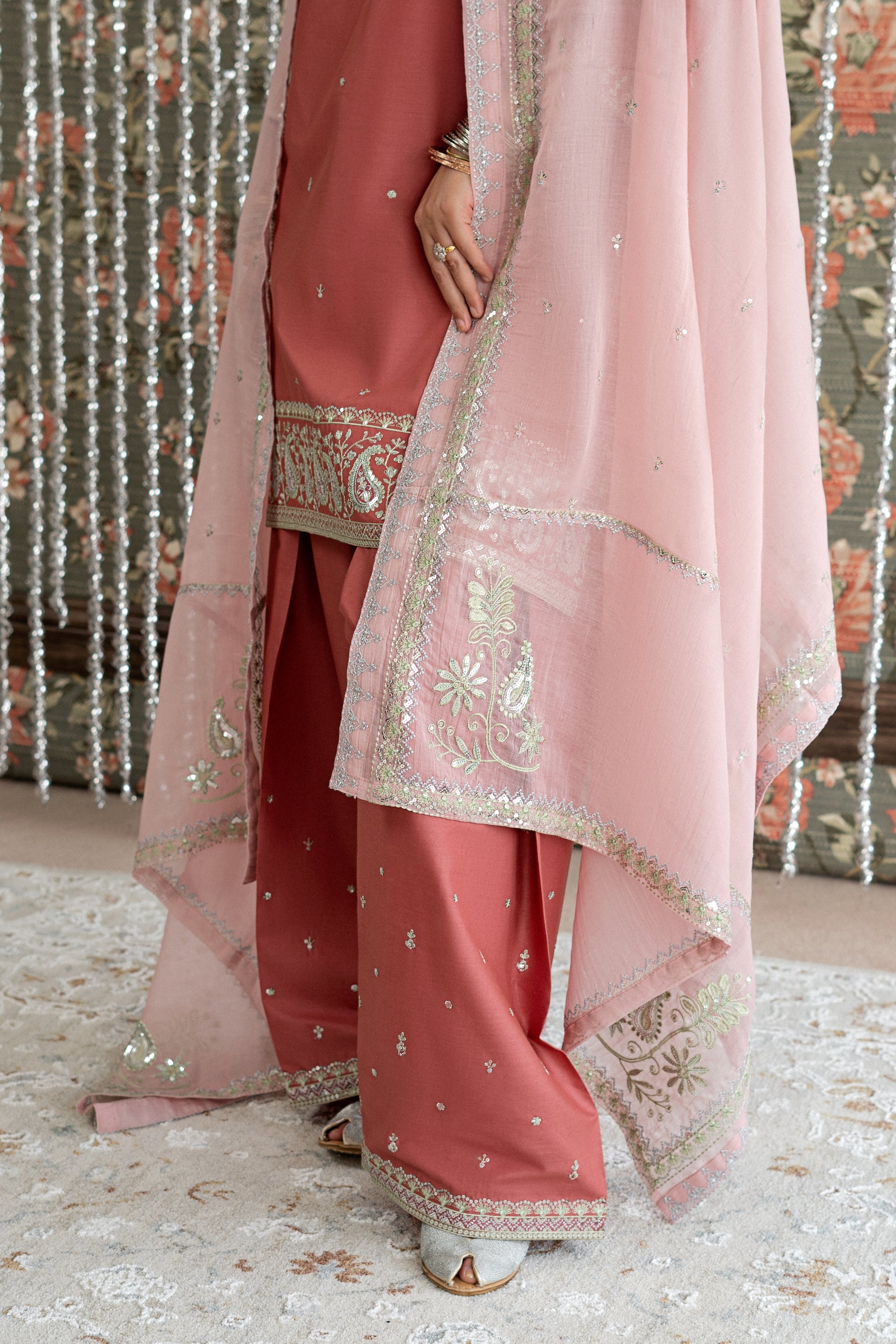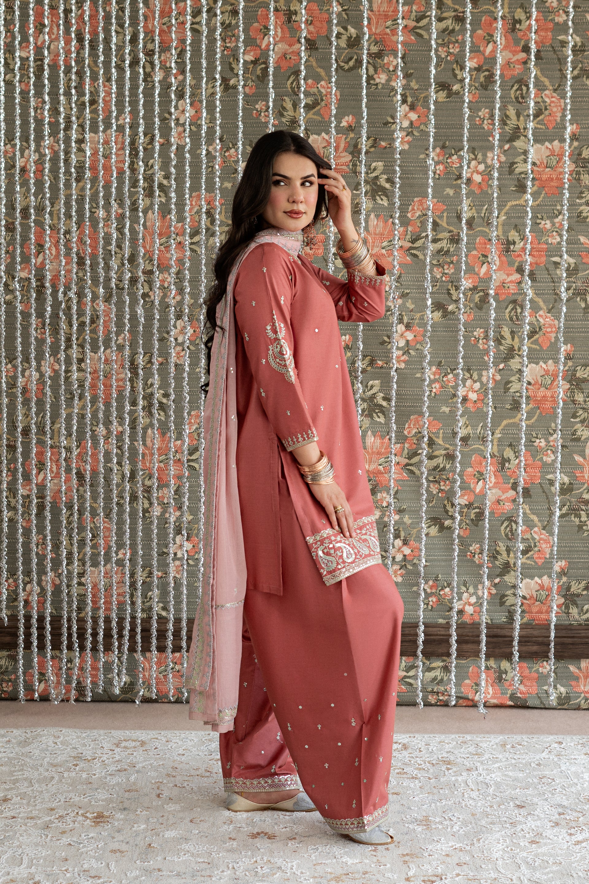 Elevate your festive wardrobe with this elegant three-piece ensemble. The short lawn shirt features intricate embroidery adorning the daman, front, and sleeves, complemented by delicate sequin detailing for added sophistication. The coordinating embroidered farshi shalwar in lawn fabric offers comfort and grace, while the monark dupatta showcases matching embroidery work throughout.