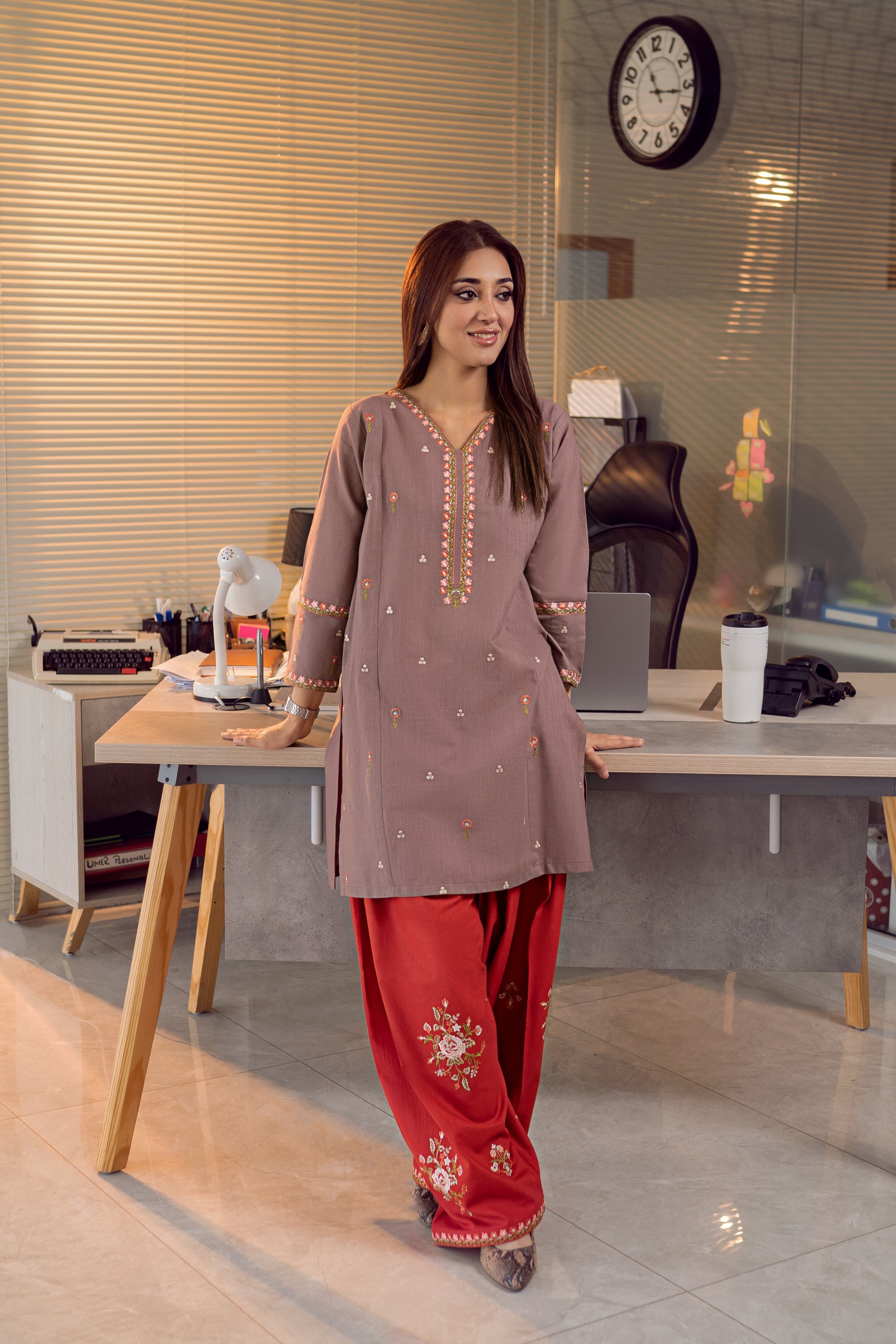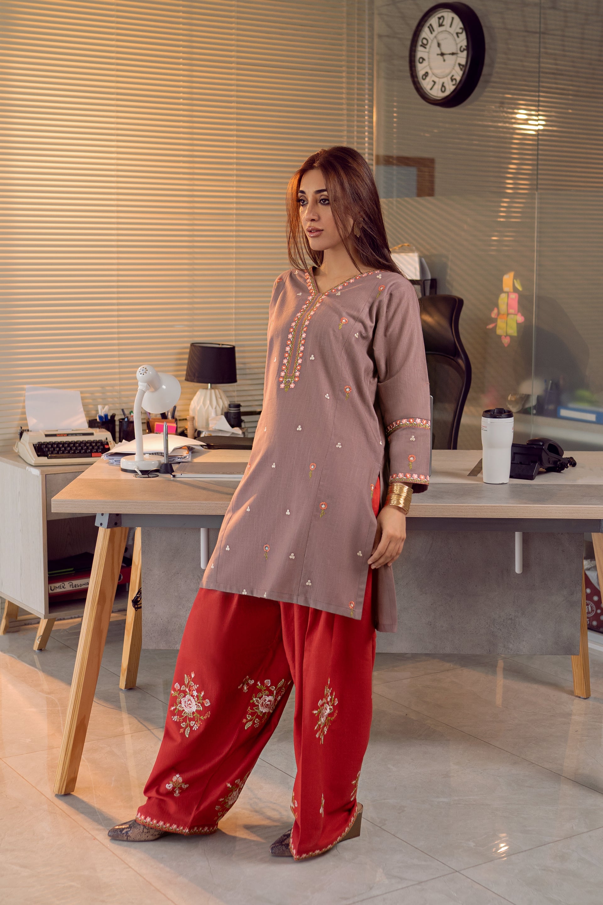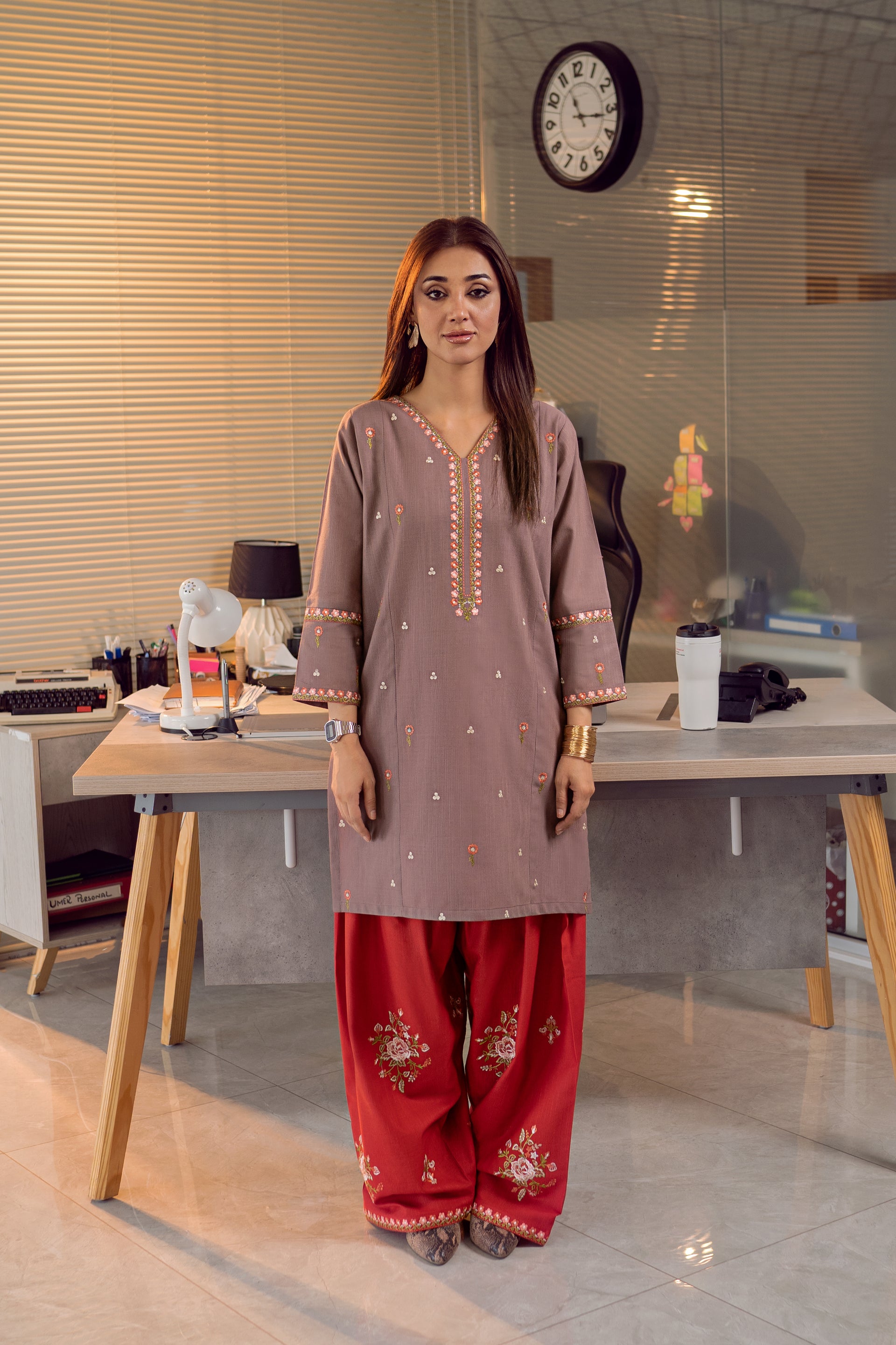 Introducing PARAS, a sophisticated ready-to-wear 2-piece khaddar suit designed for effortless elegance. The ensemble features a tailored short shirt adorned with intricate embroidery across the front and sleeves, paired with a flowing embroidered farshi shalwar for a graceful silhouette. Crafted from premium khaddar fabric, this collection piece combines traditional craftsmanship with contemporary styling—perfect for casual gatherings and everyday wear.
