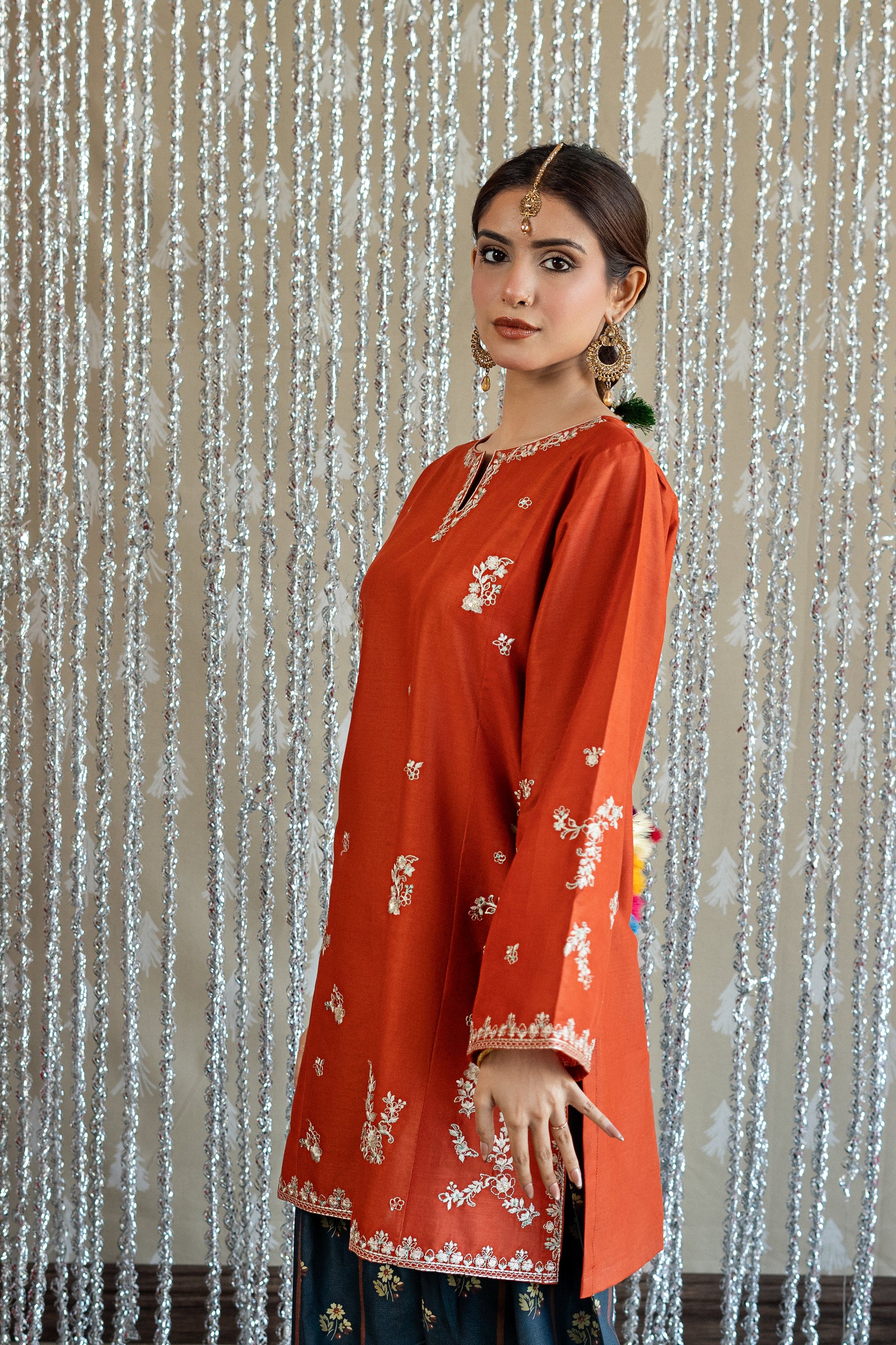 Elevate your everyday wardrobe with TABYA, a sophisticated 2-piece lawn suit designed for effortless elegance. The short shirt features intricate embroidery detailing along the neckline, front , and sleeves, adding refined craftsmanship to a solid color base. Paired with a loose, printed farshi shalwar, this ready-to-wear ensemble offers comfort without compromising on style. Perfect for gatherings and warm-weather occasions.