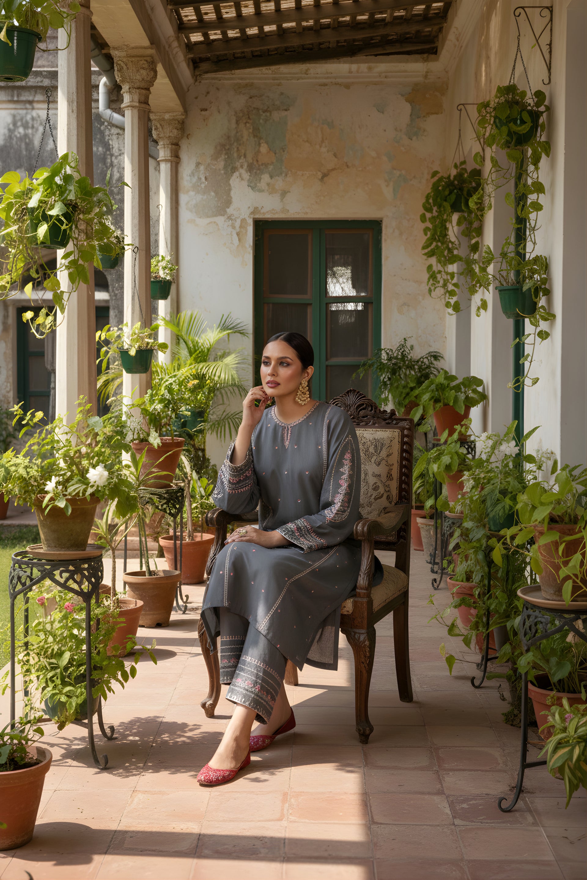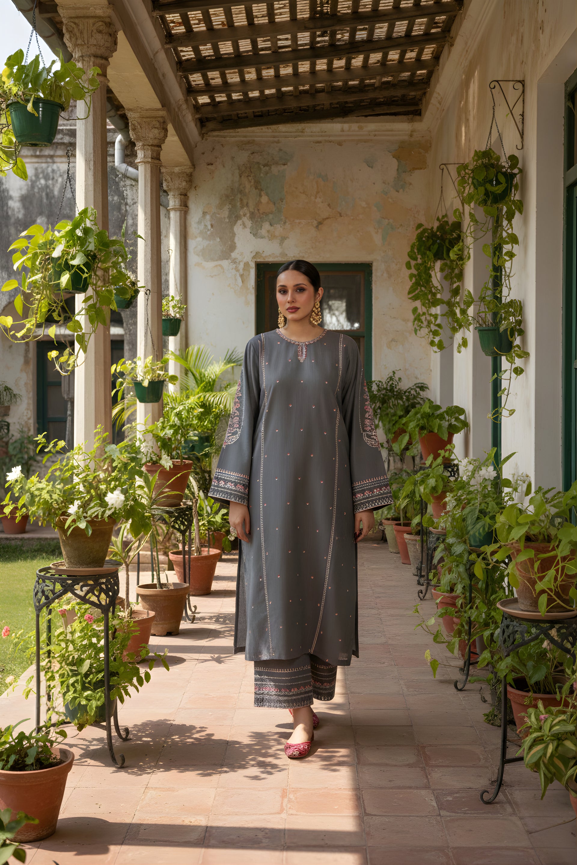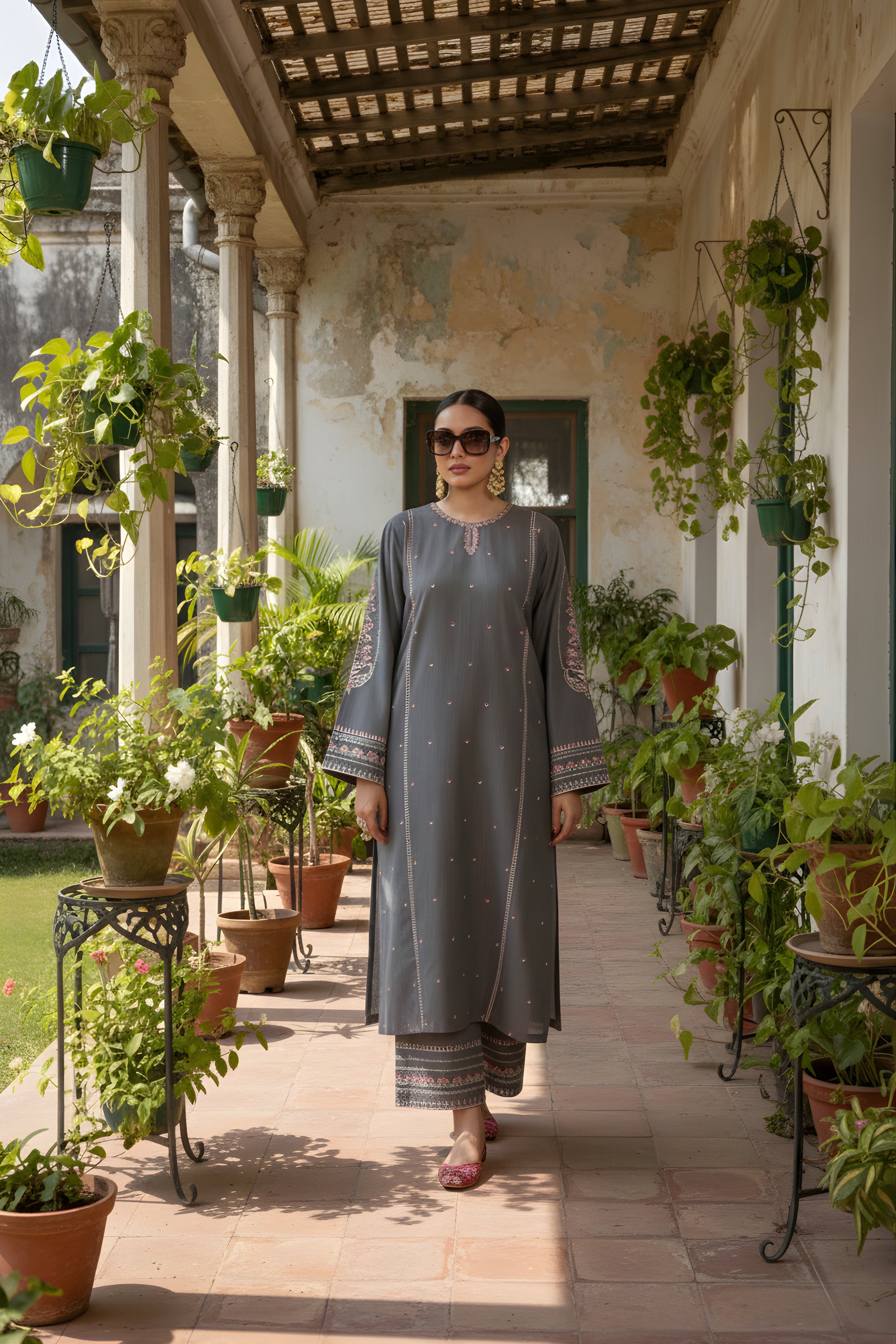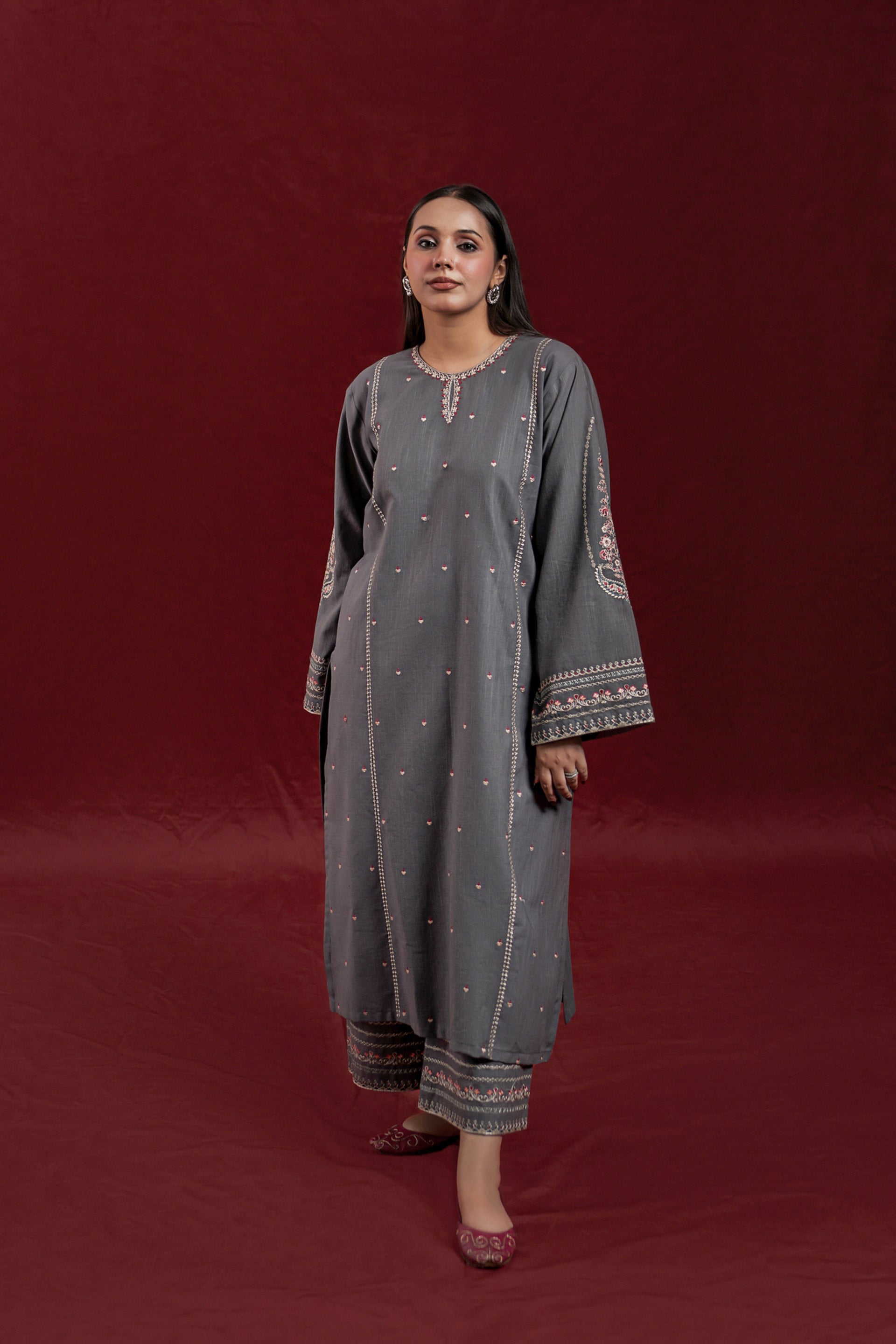 Introducing TAJJAL, a sophisticated ready-to-wear 2-piece khaddar suit designed for the modern woman. This ensemble features an elegant long shirt adorned with intricate embroidery motifs across the front and loose sleeves, paired with matching embroidered trousers. Crafted from premium khaddar fabric, this suit combines traditional craftsmanship with contemporary silhouettes, making it perfect for casual gatherings and everyday elegance.