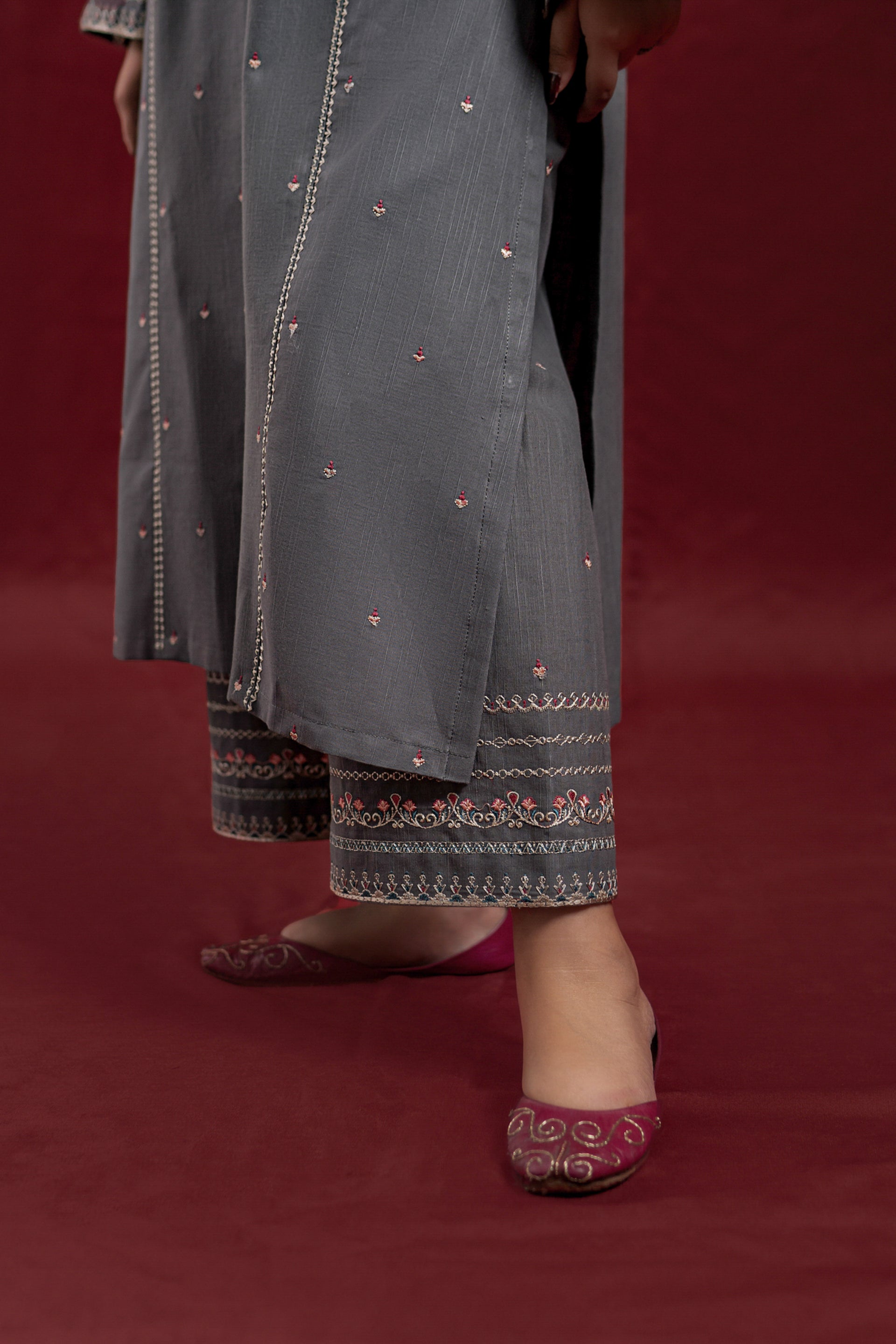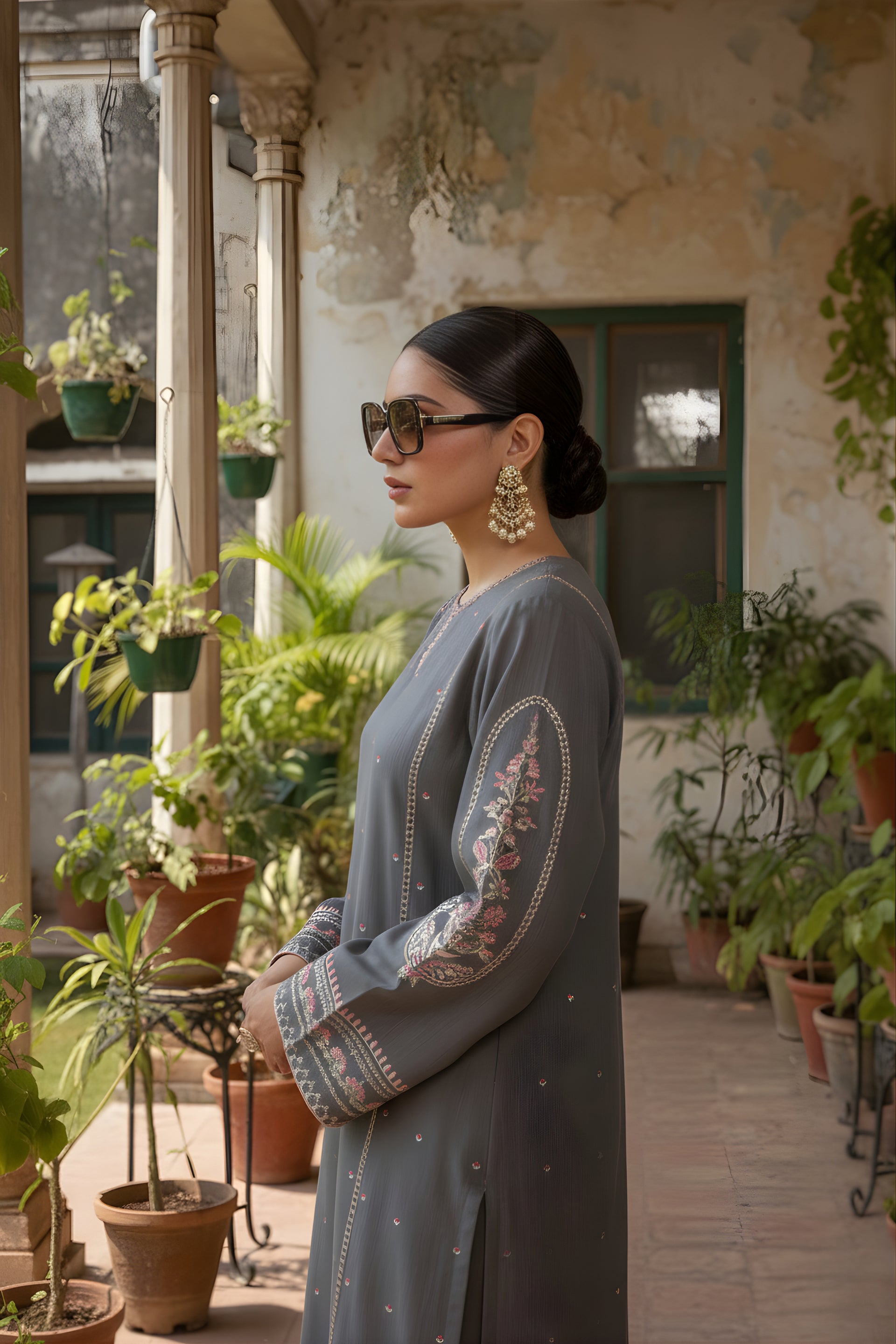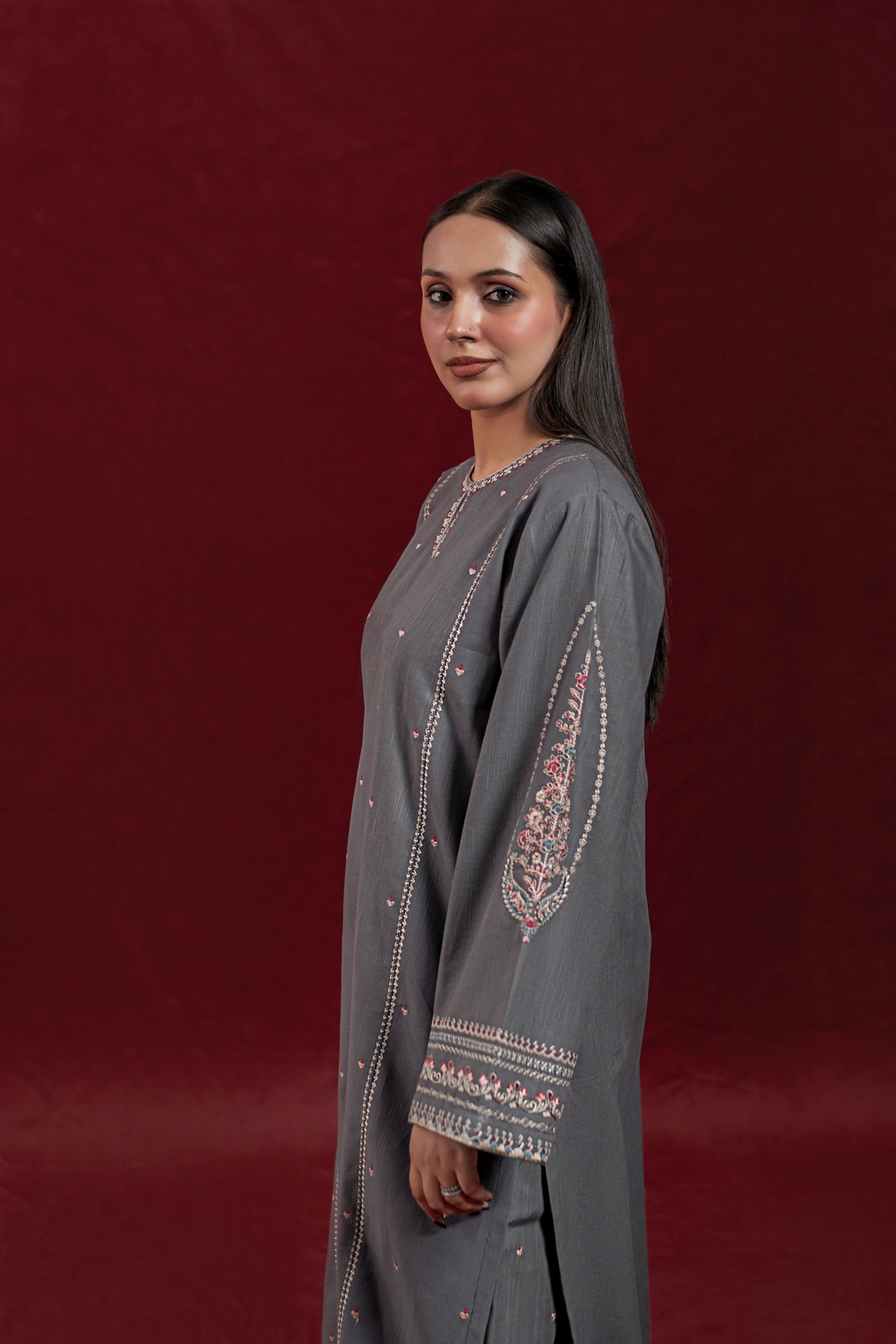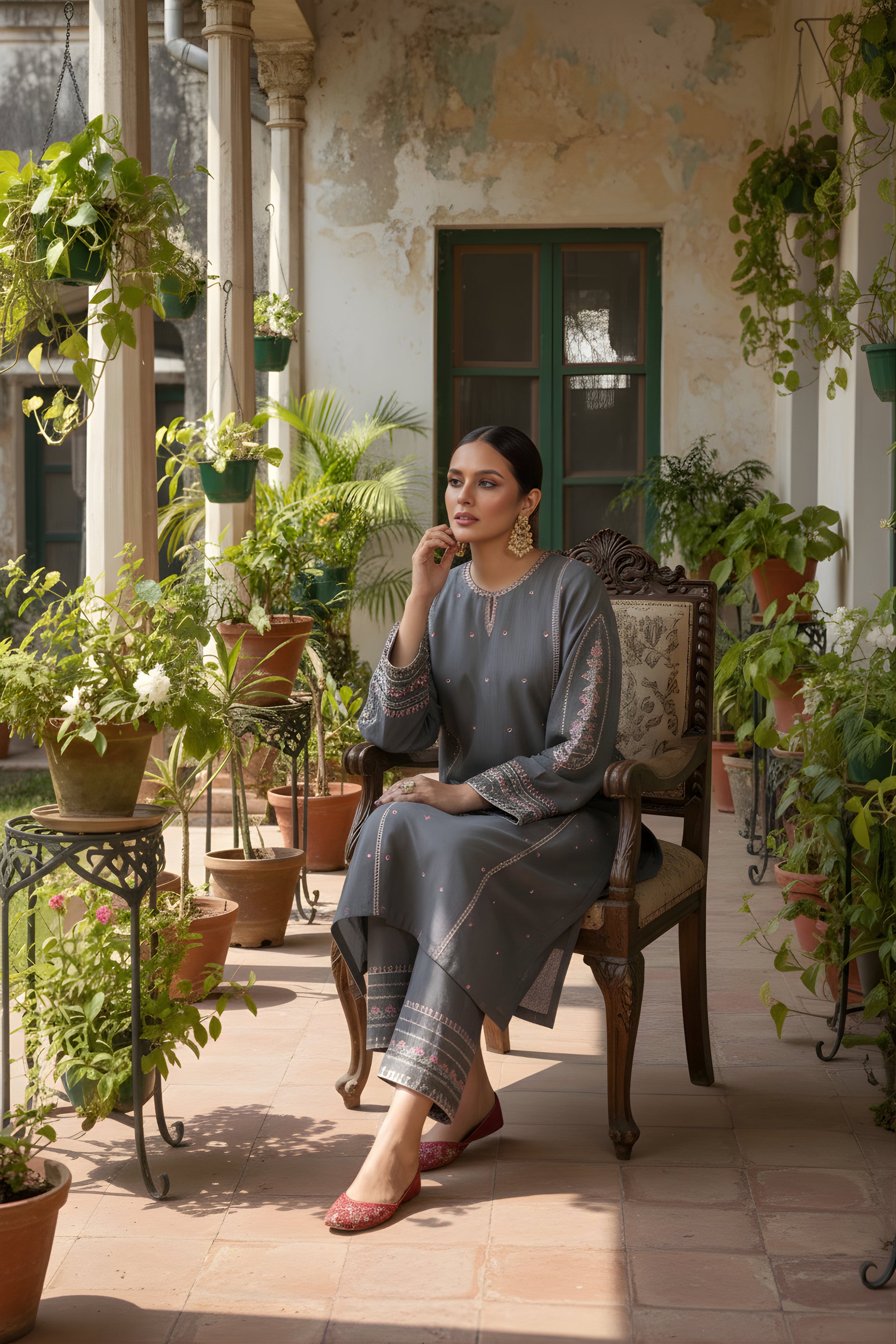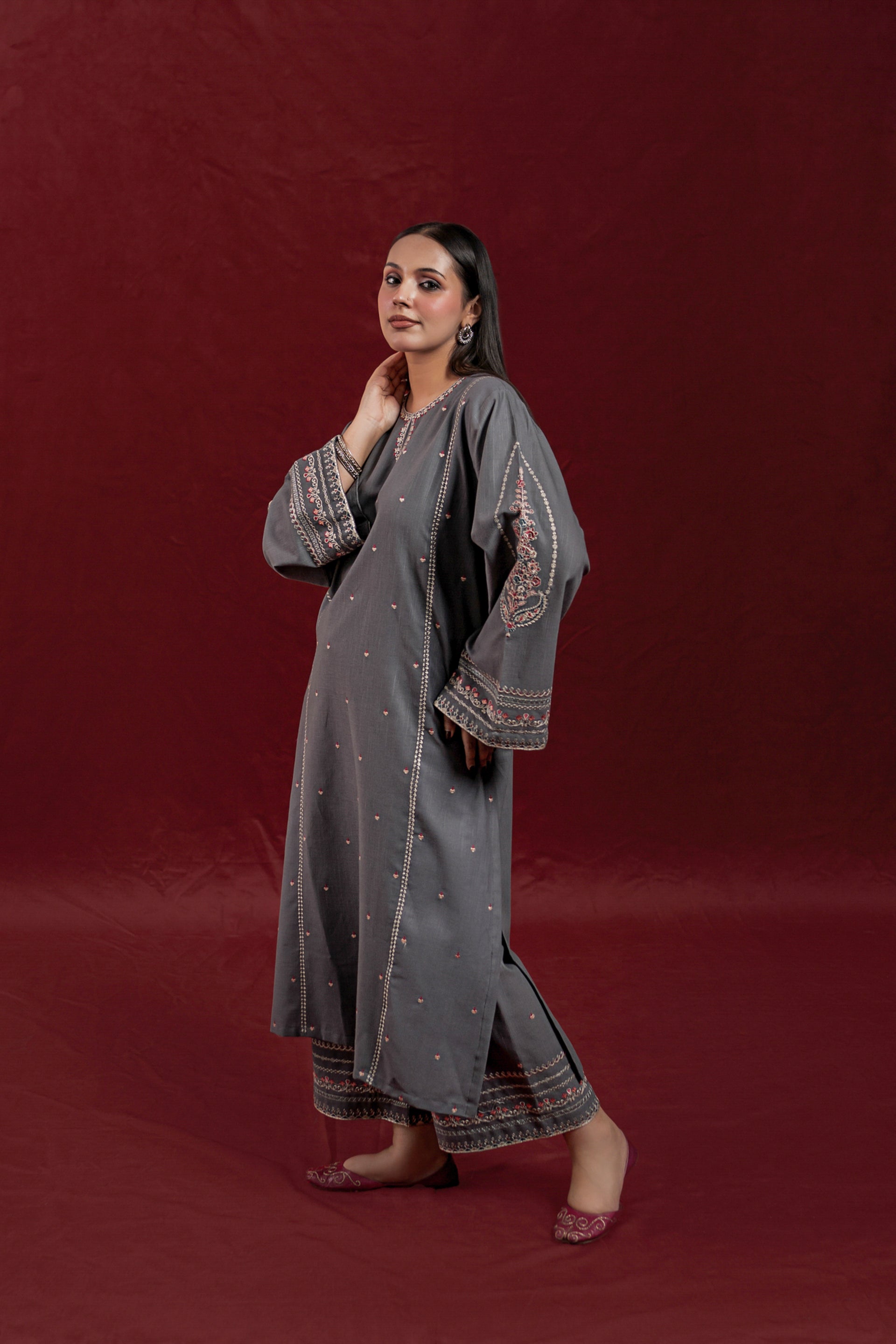 Introducing TAJJAL, a sophisticated ready-to-wear 2-piece khaddar suit designed for the modern woman. This ensemble features an elegant long shirt adorned with intricate embroidery motifs across the front and loose sleeves, paired with matching embroidered trousers. Crafted from premium khaddar fabric, this suit combines traditional craftsmanship with contemporary silhouettes, making it perfect for casual gatherings and everyday elegance.