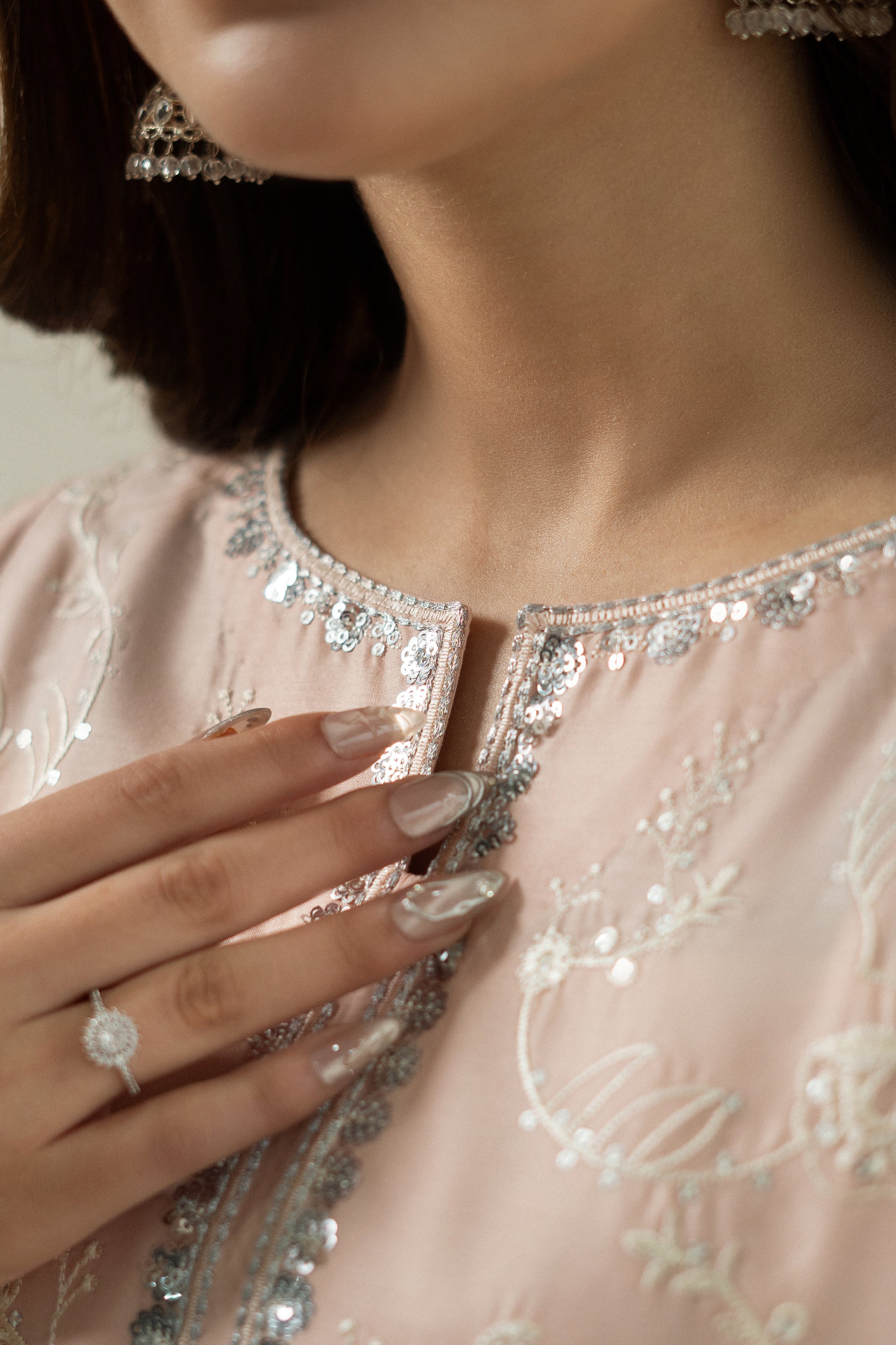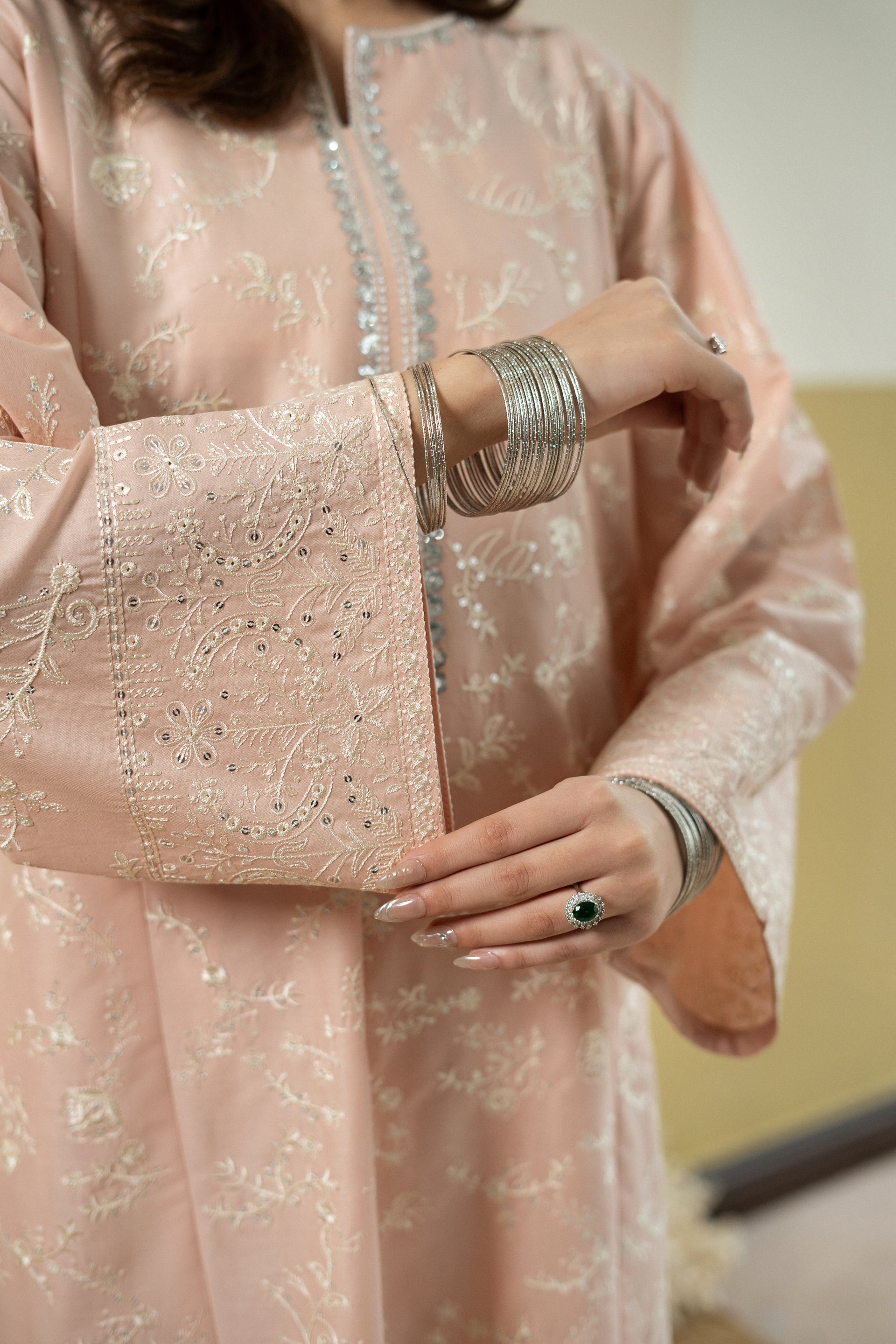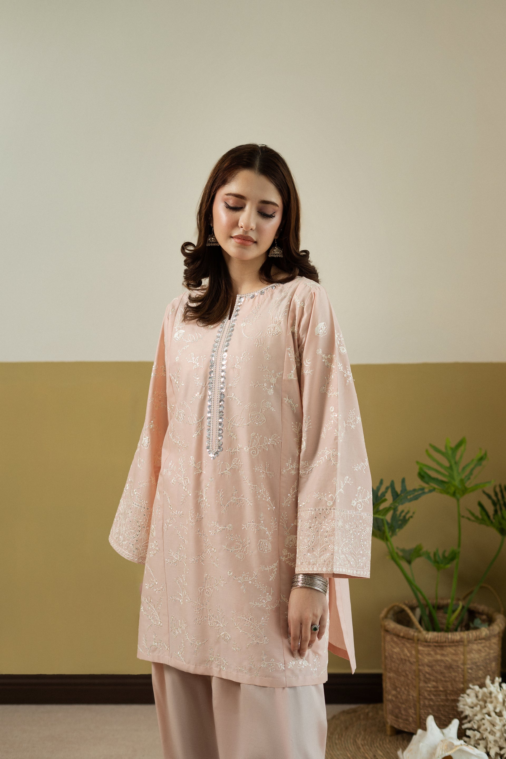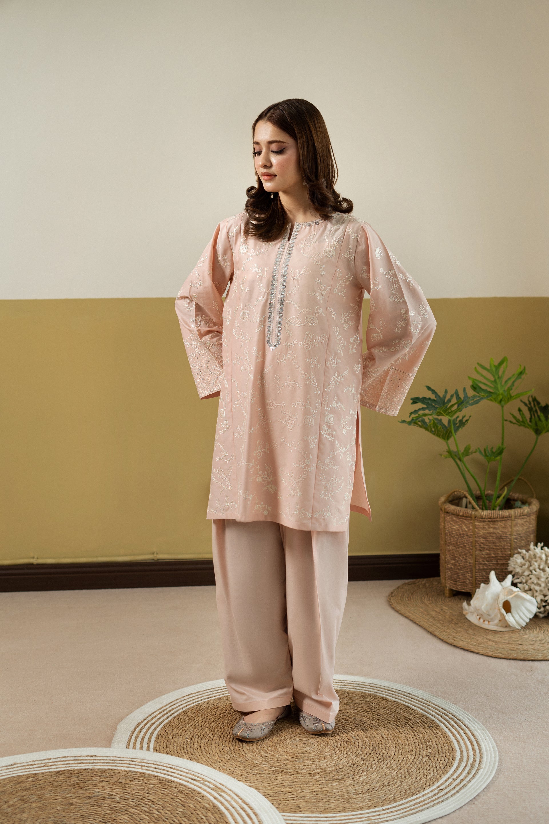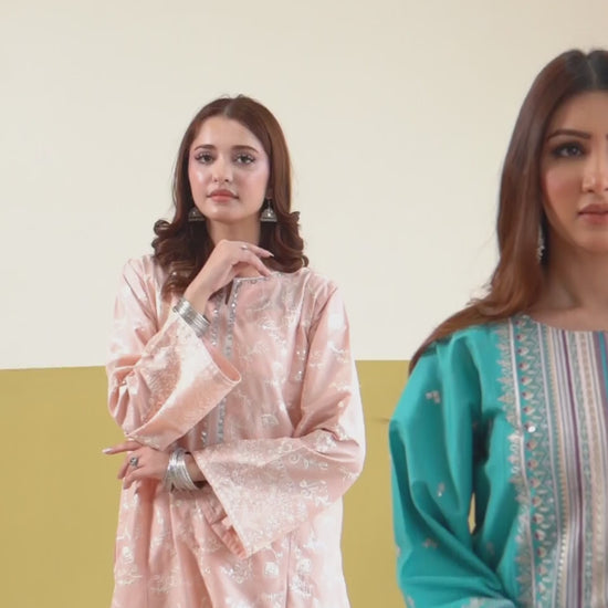 ZARAT is a sophisticated ready-to-wear 2-piece lawn suit designed for summer elegance. The shirt features intricate thread and sequin embroidery work on the front and sleeves, adding refined detail without overwhelming the design. Paired with a comfortable loose farshi shalwar, this ensemble strikes the perfect balance between style and ease.