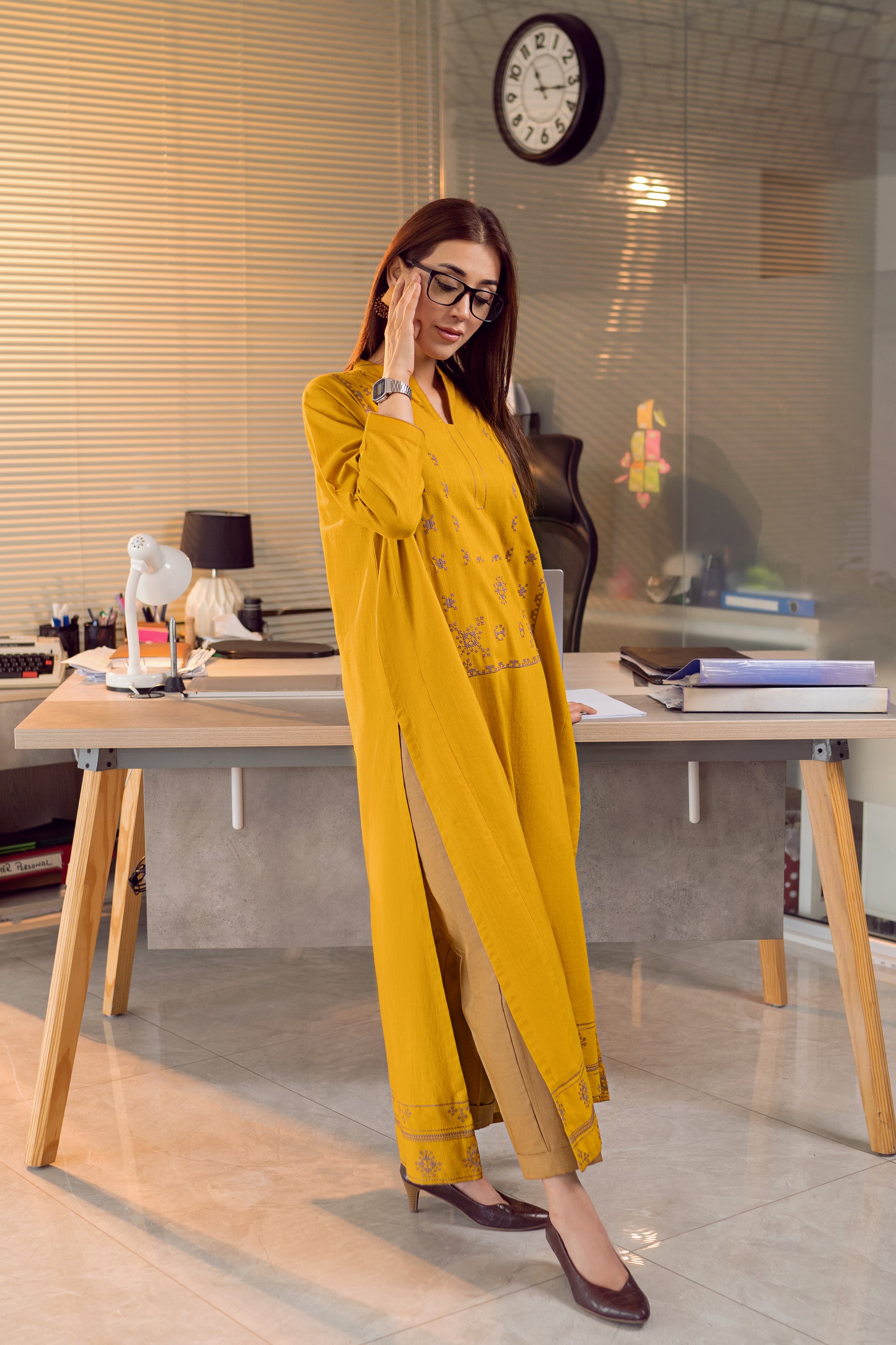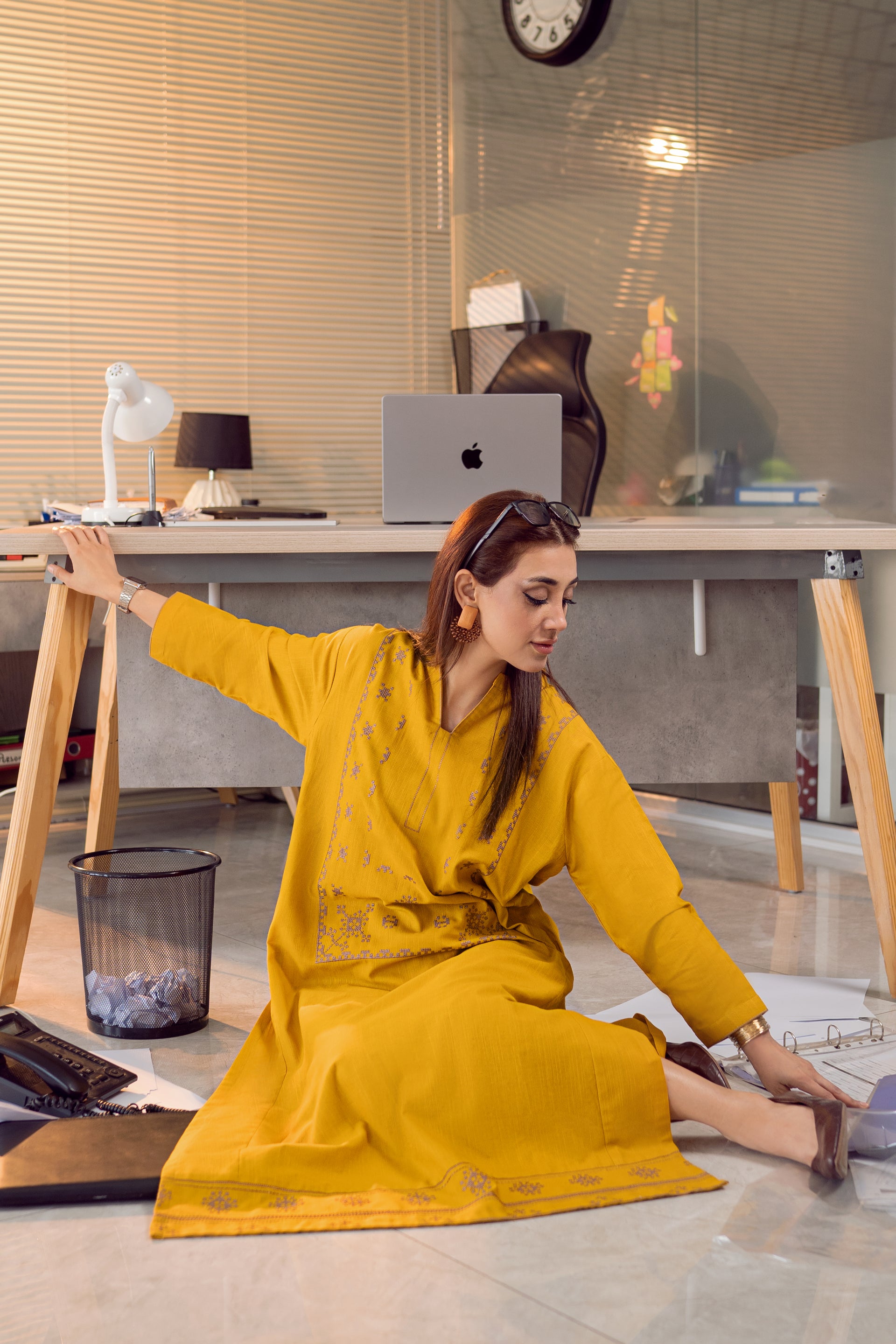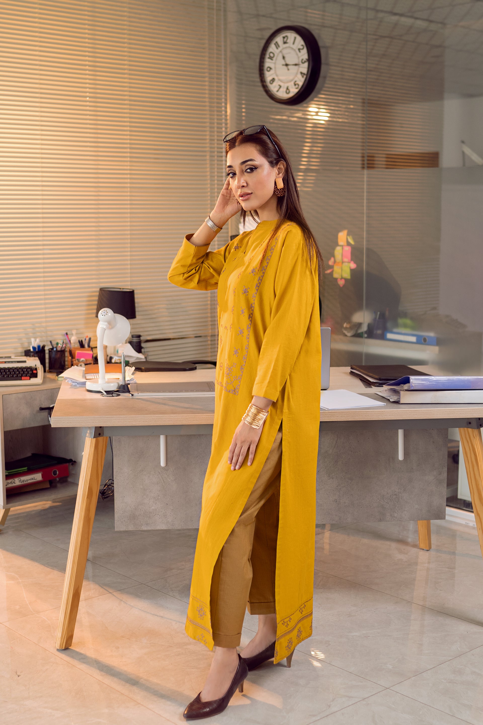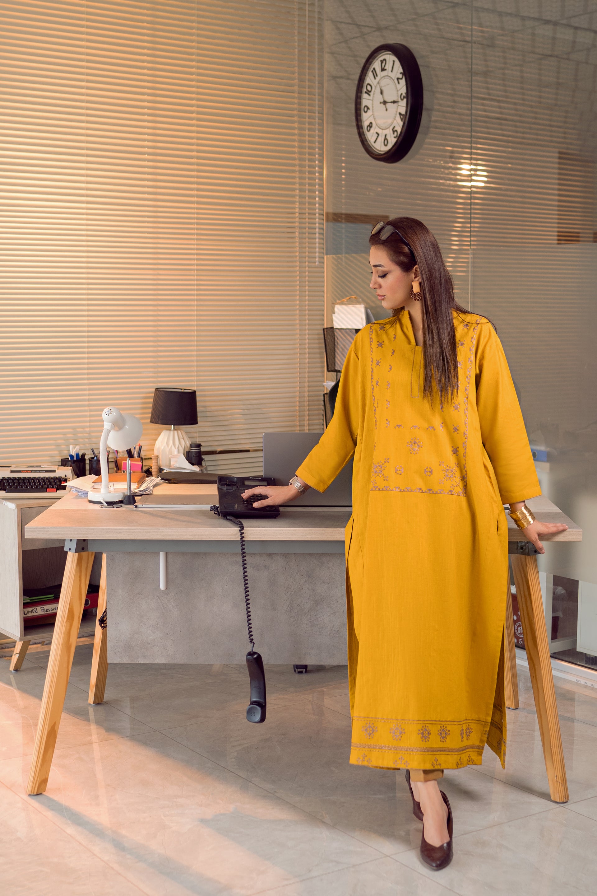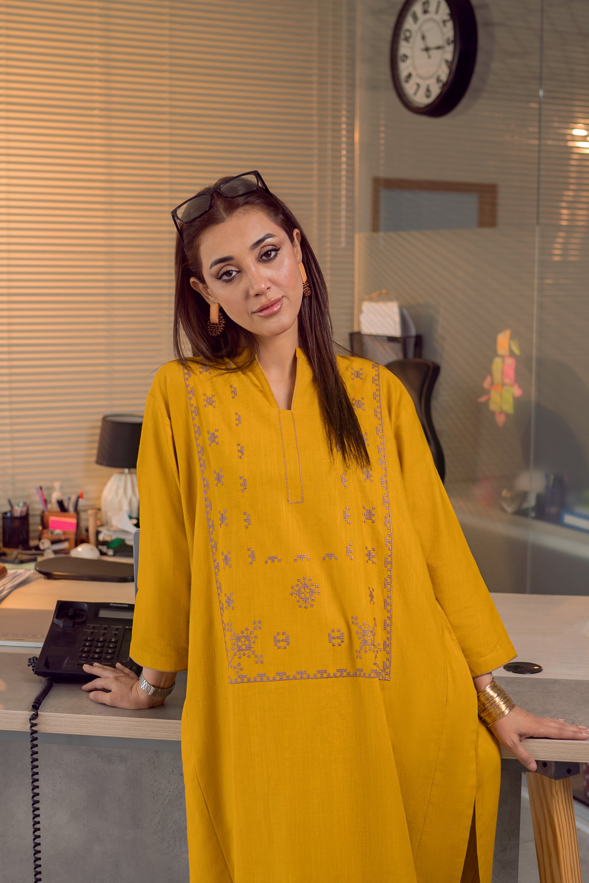 Elevate your wardrobe with this sophisticated 2-piece khaddar suit, designed for those seeking a sharp, contemporary Eastern aesthetic. The ensemble features a gracefully tailored long shirt adorned with delicate embroidery detailing on the front, paired with perfectly fitted straight pants.